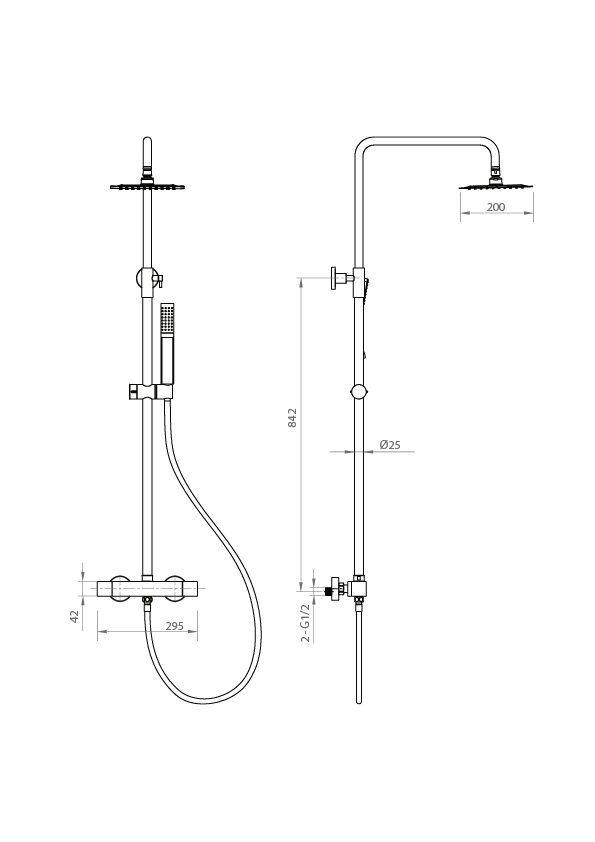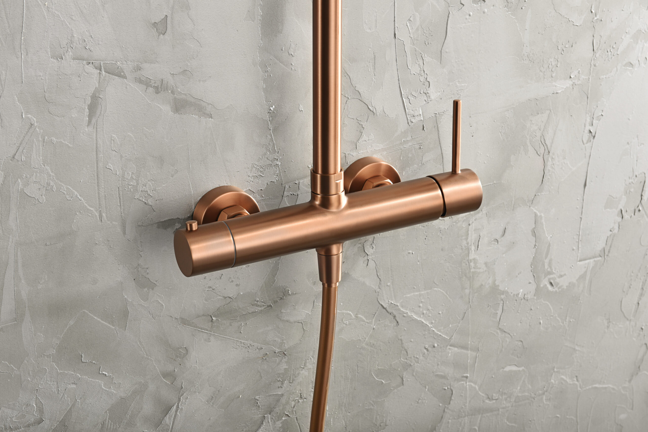 Barre de douche extensible ronde en acier inoxydable S.304. Finition or rose bross. Pommeau de douche extra-plat en acier inoxydable S.304, rsistant au calcaire, ¯ 20 cm. Support de pommeau de douche rglable en hauteur. Pommeau de douche rond une position.Robinet mitigeur en laiton avec distributeur intgr.Dbit moyenÊ: 12 l/min.Flexible PVC de 1,5 m.Cartouche cramique mitigeur, ¯ 35 mm.