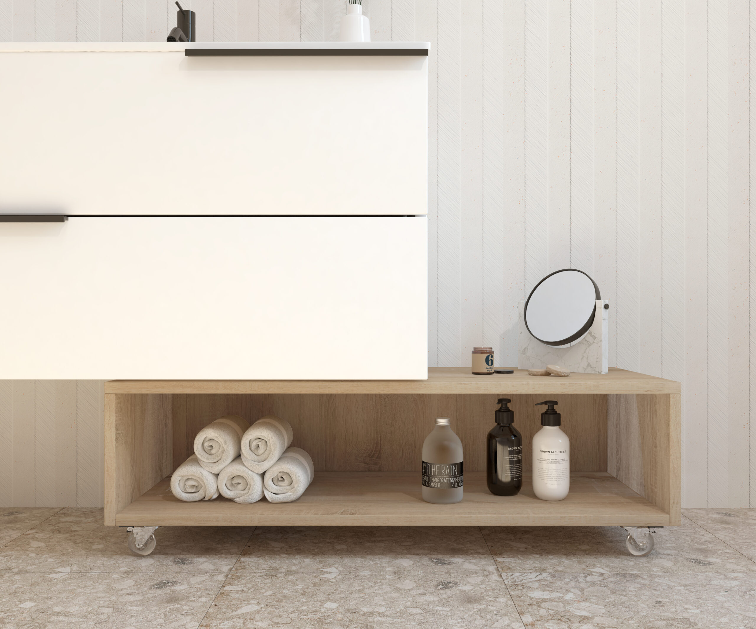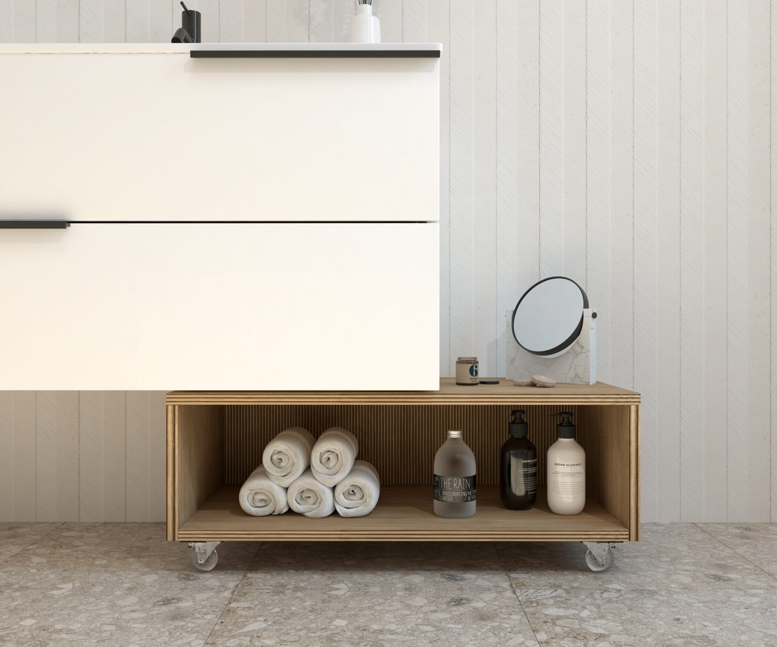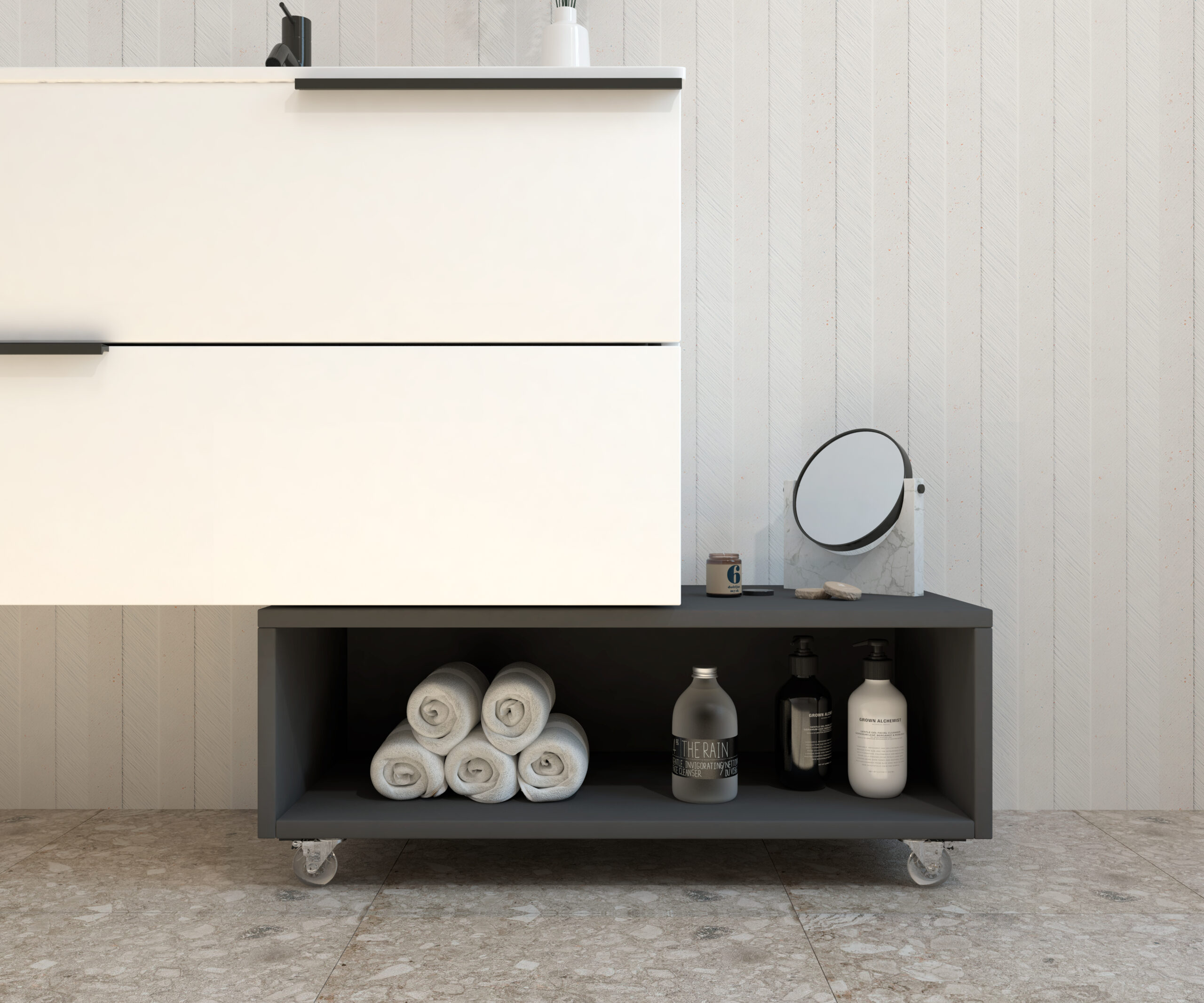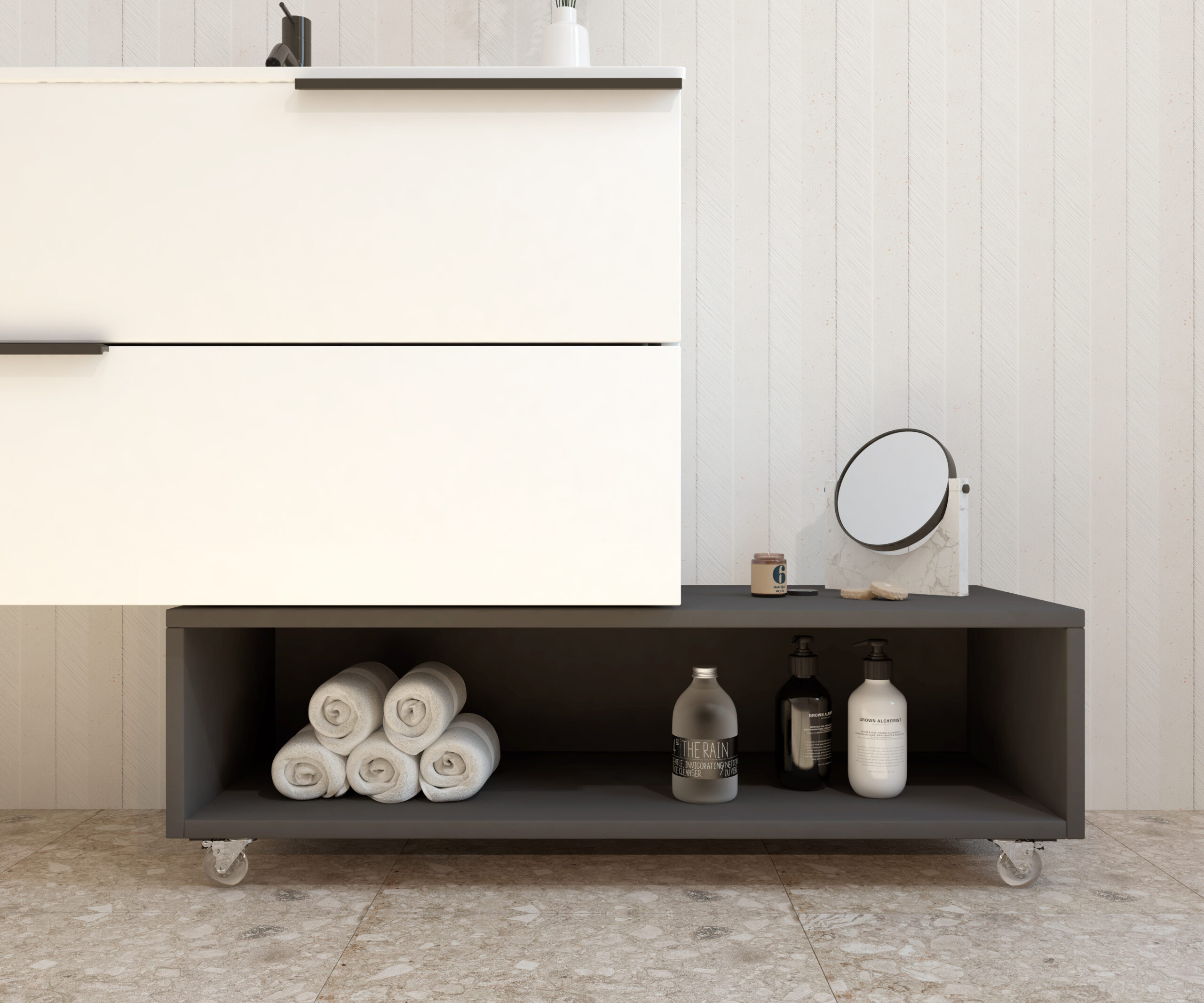Meuble d’appoint à roulettes de la collection GROTTE conçu pour offrir fonctionnalité et style dans n’importe quel espace de la maison. Sa structure compacte et polyvalente en fait une solution parfaite pour optimiser le rangement dans toute la maison.