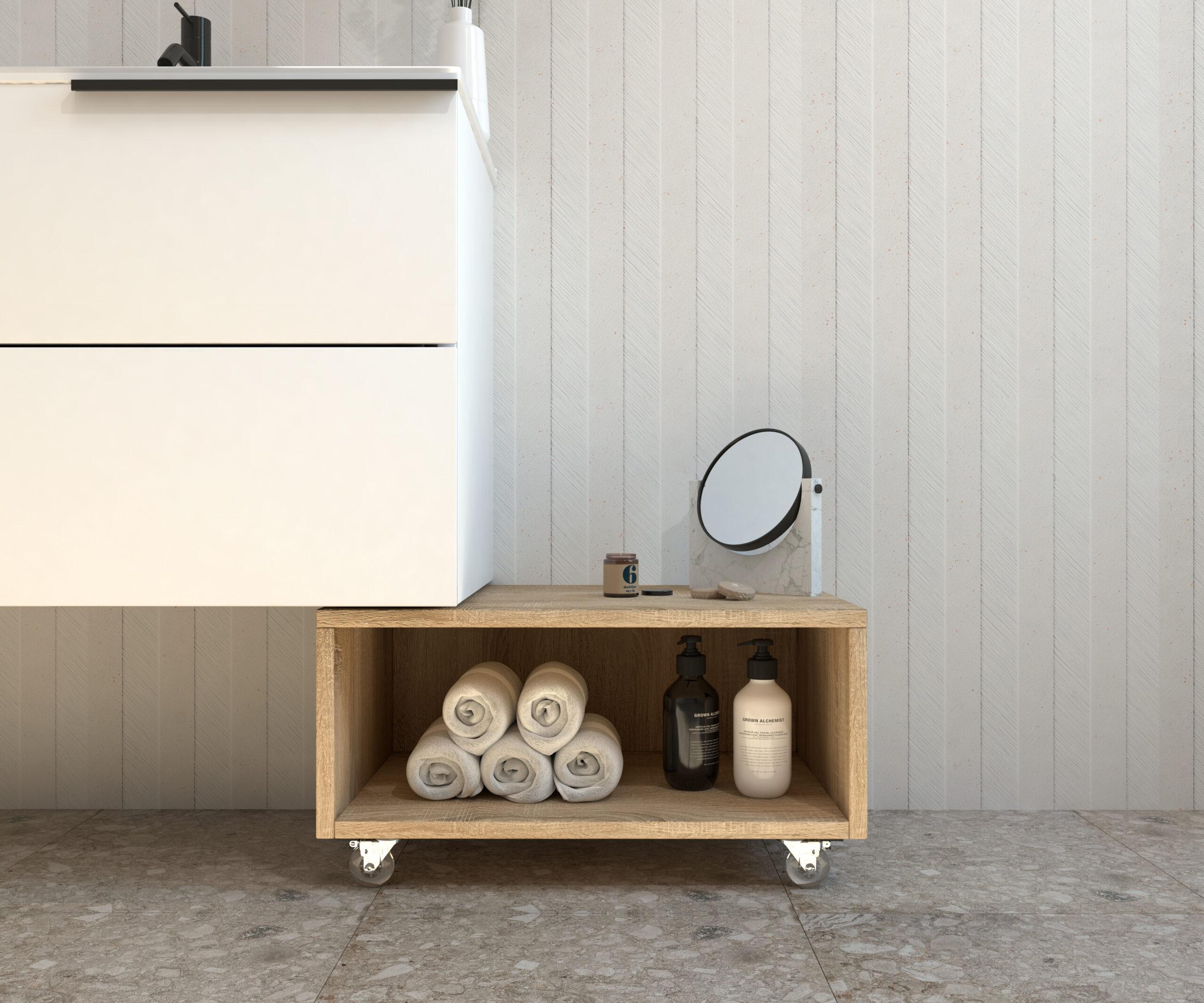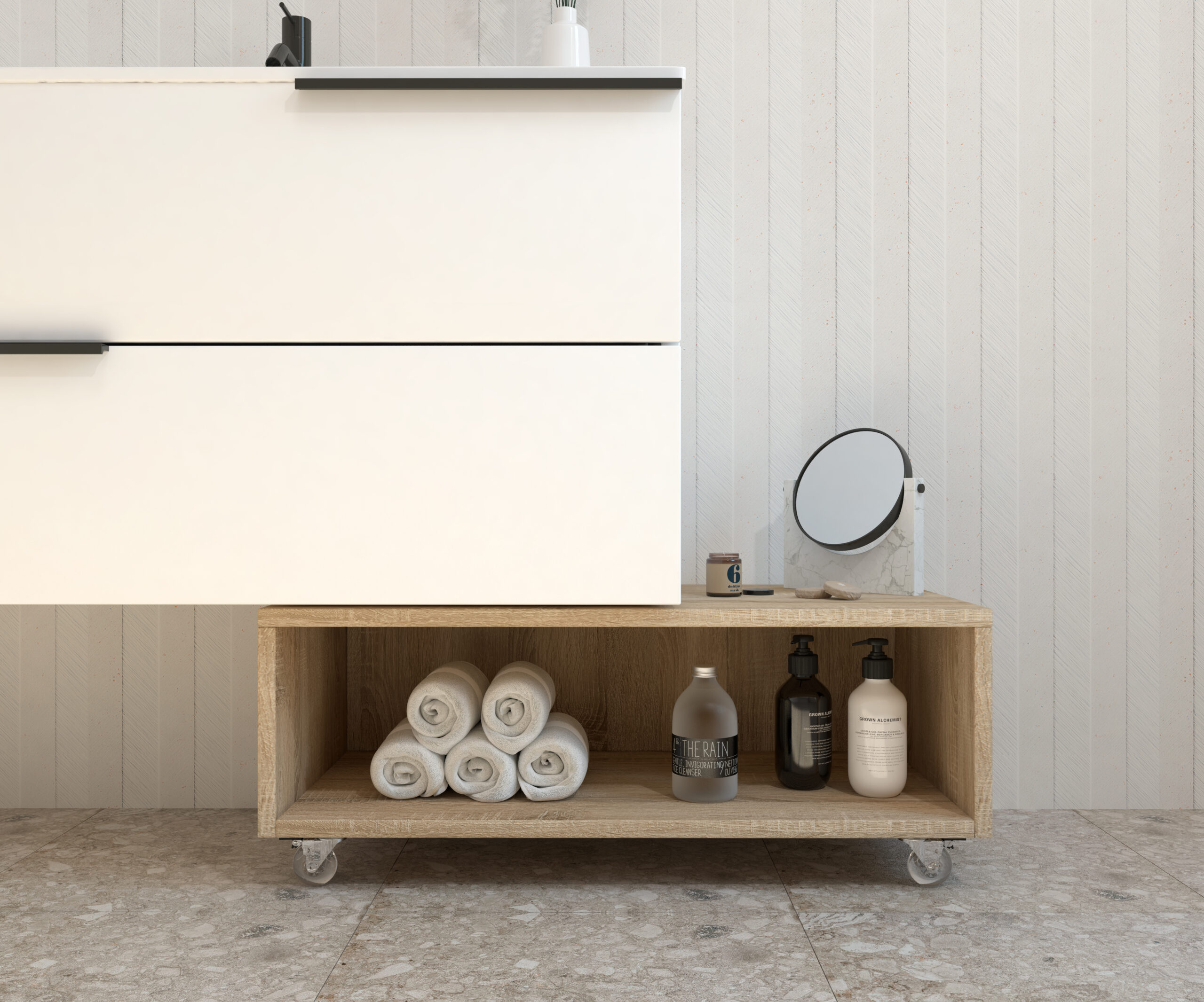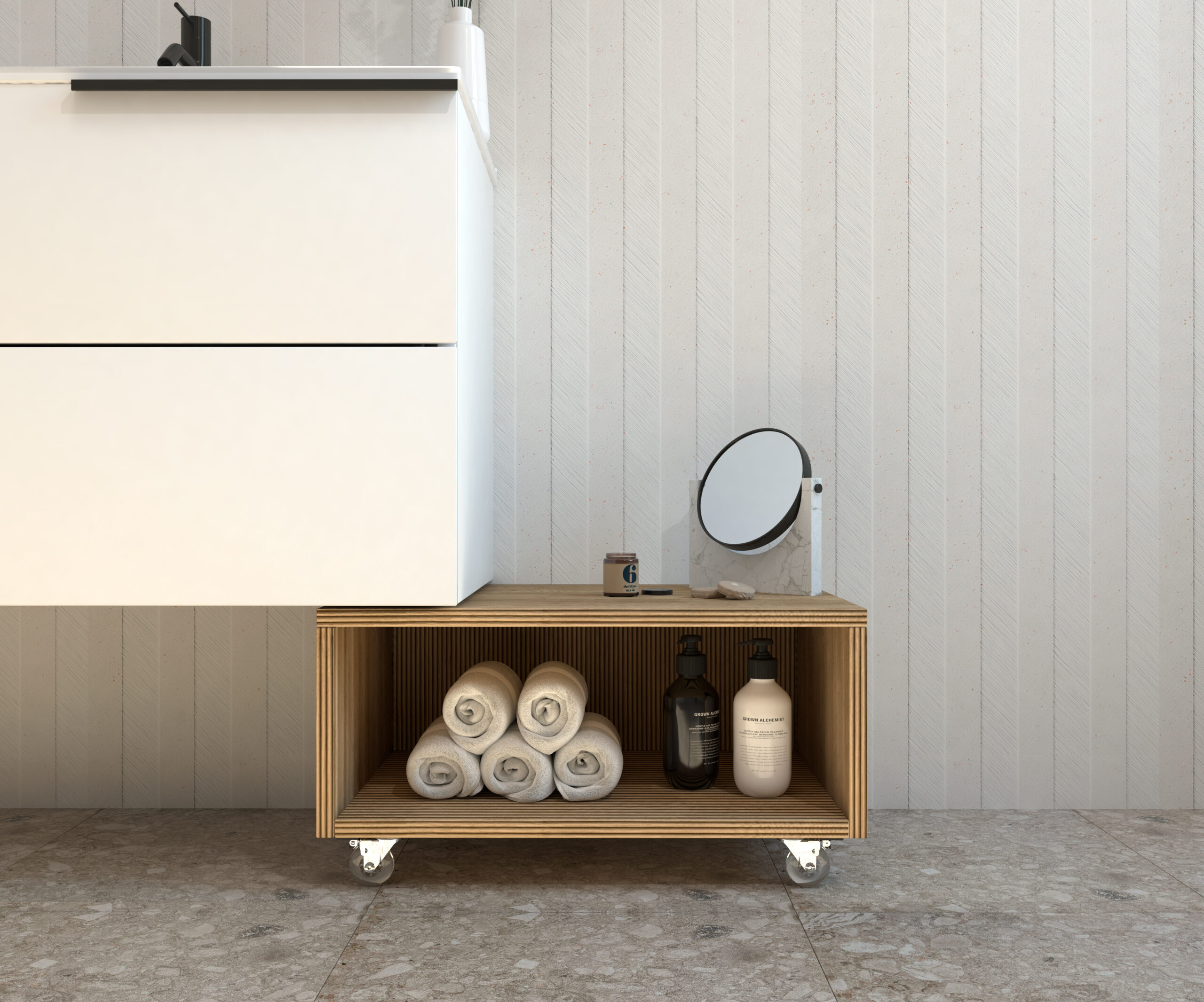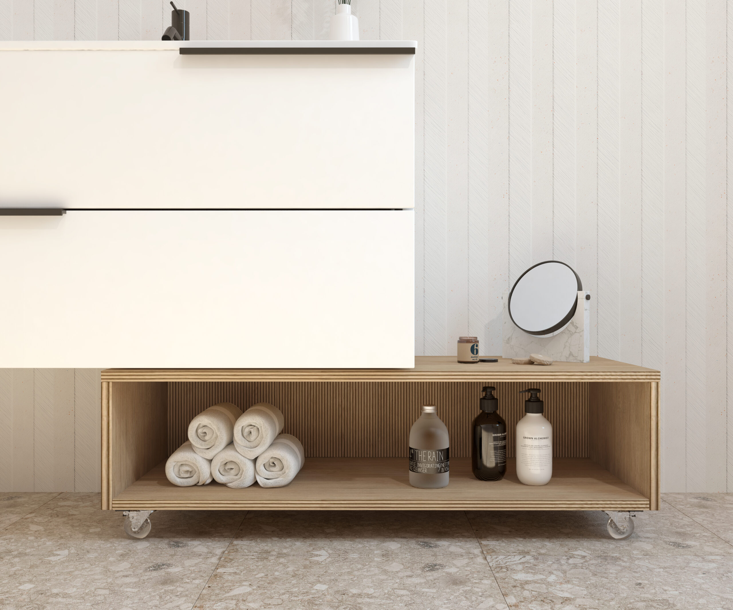 Meuble d’appoint à roulettes de la collection GROTTE conçu pour offrir fonctionnalité et style dans n’importe quel espace de la maison. Sa structure compacte et polyvalente en fait une solution parfaite pour optimiser le rangement dans toute la maison.