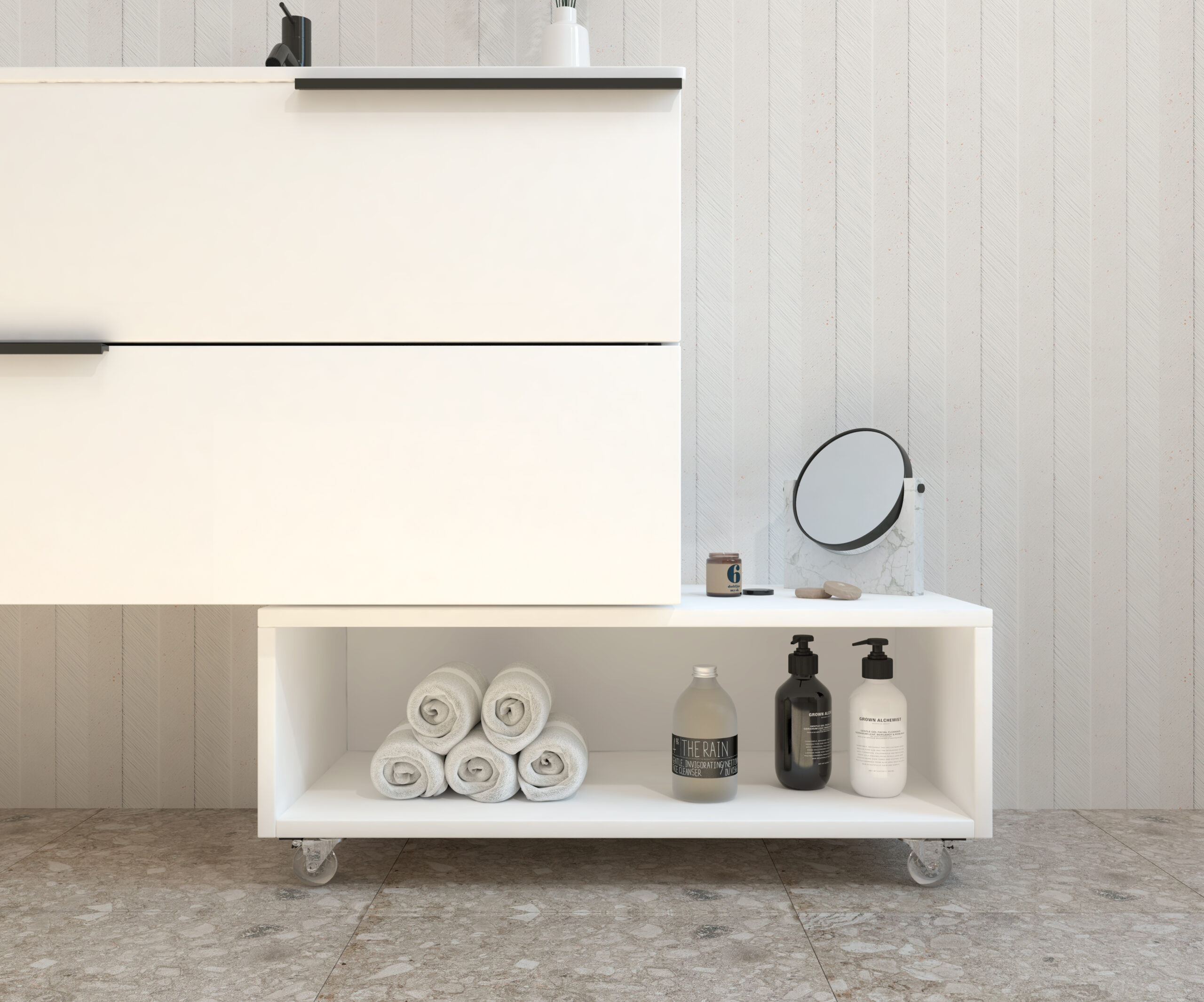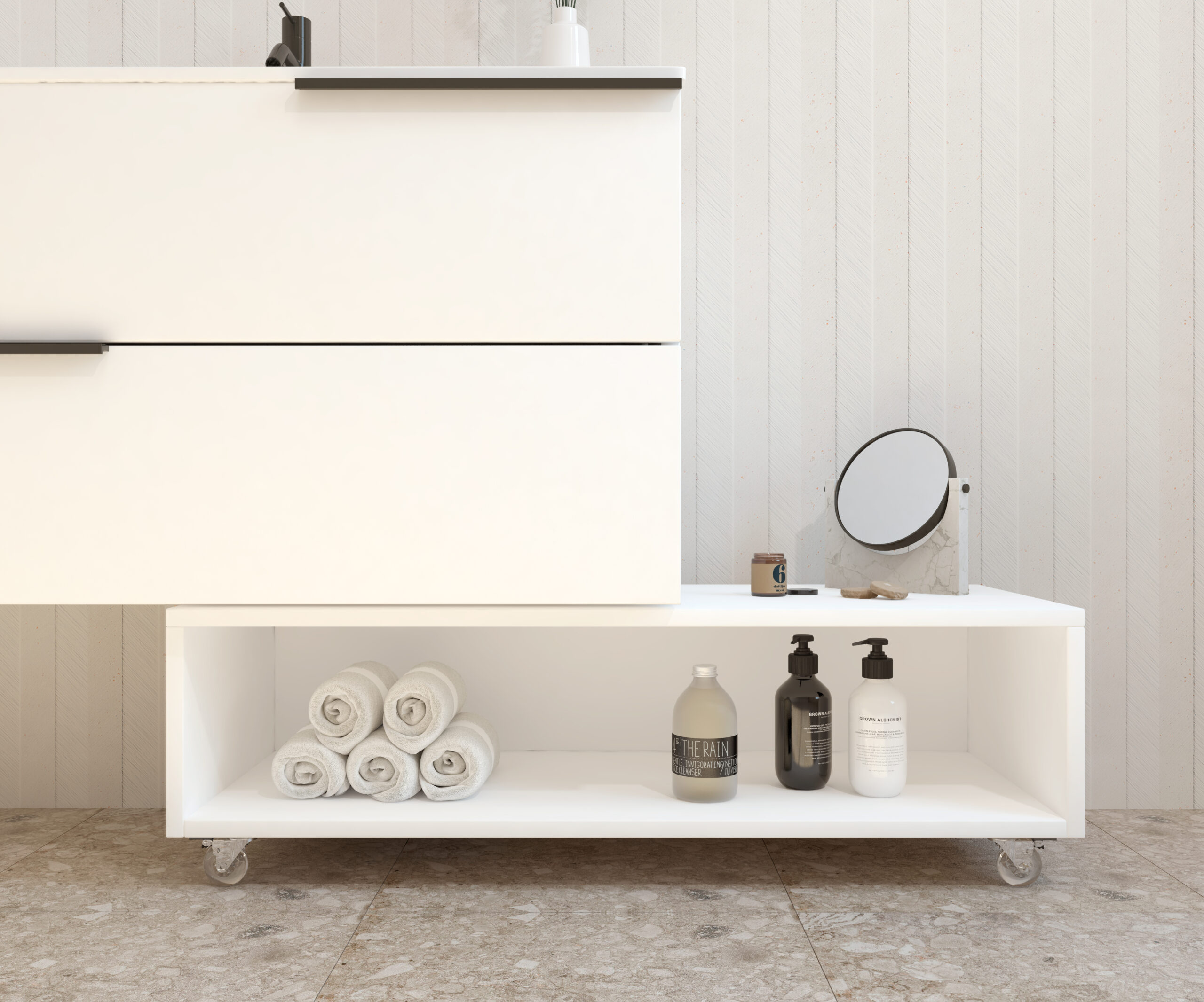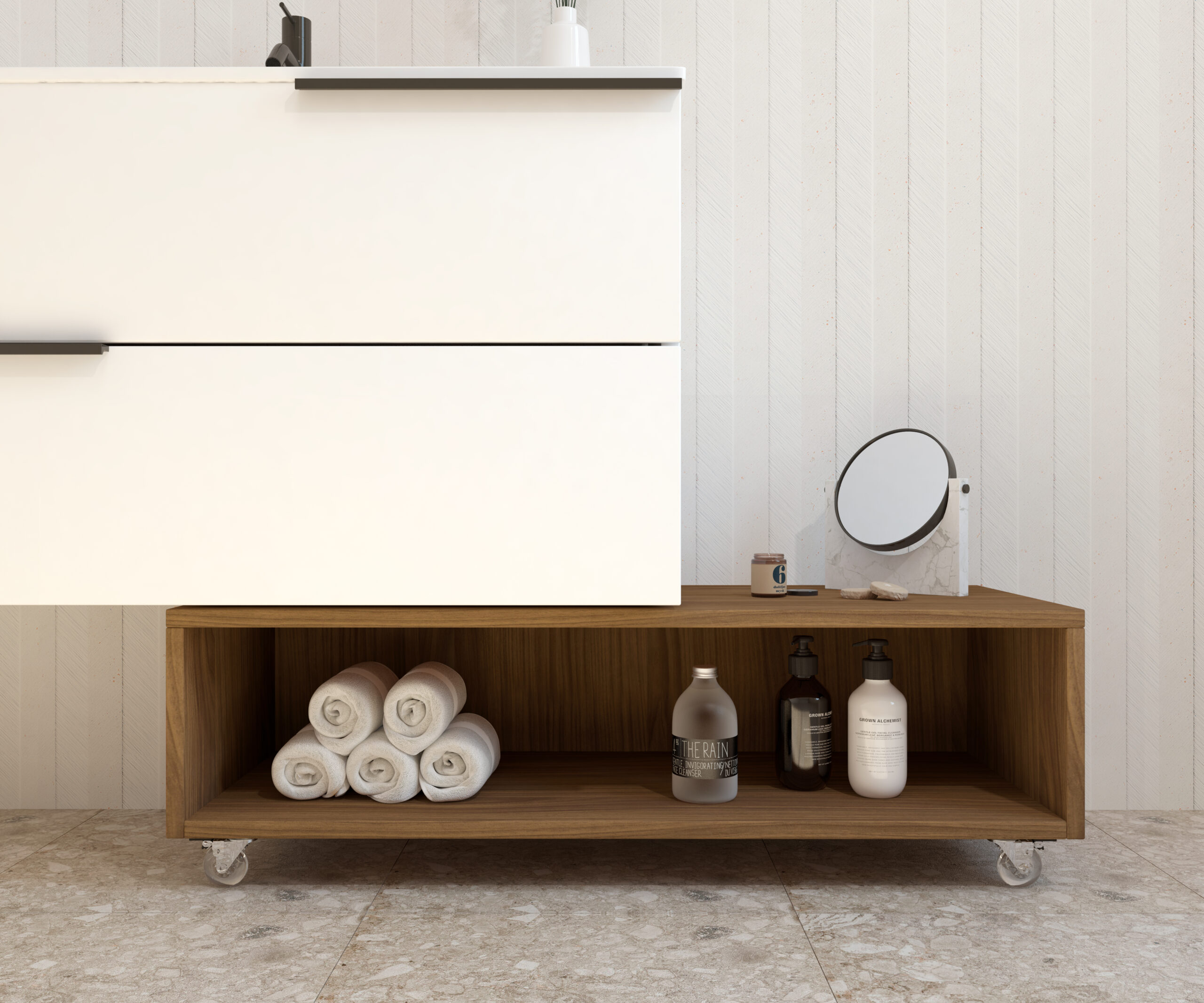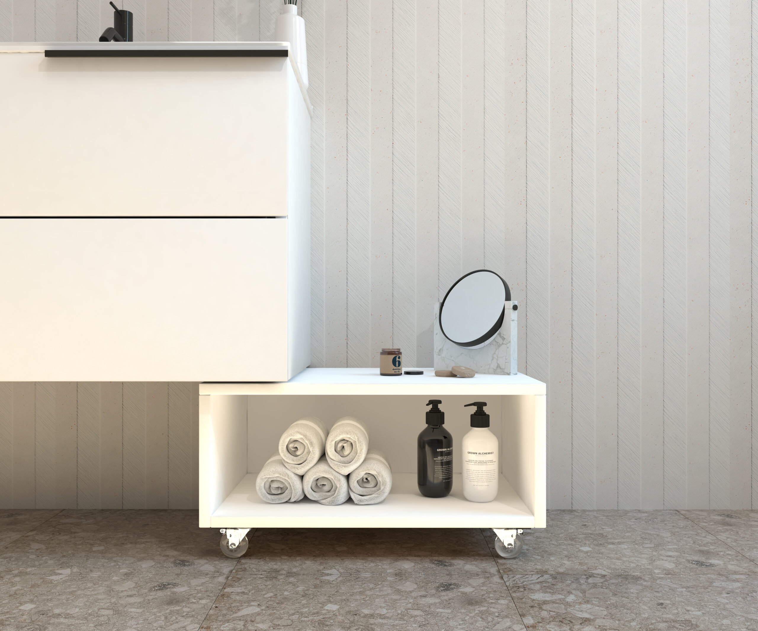 Meuble d’appoint à roulettes de la collection GROTTE conçu pour offrir fonctionnalité et style dans n’importe quel espace de la maison. Sa structure compacte et polyvalente en fait une solution parfaite pour optimiser le rangement dans toute la maison.
