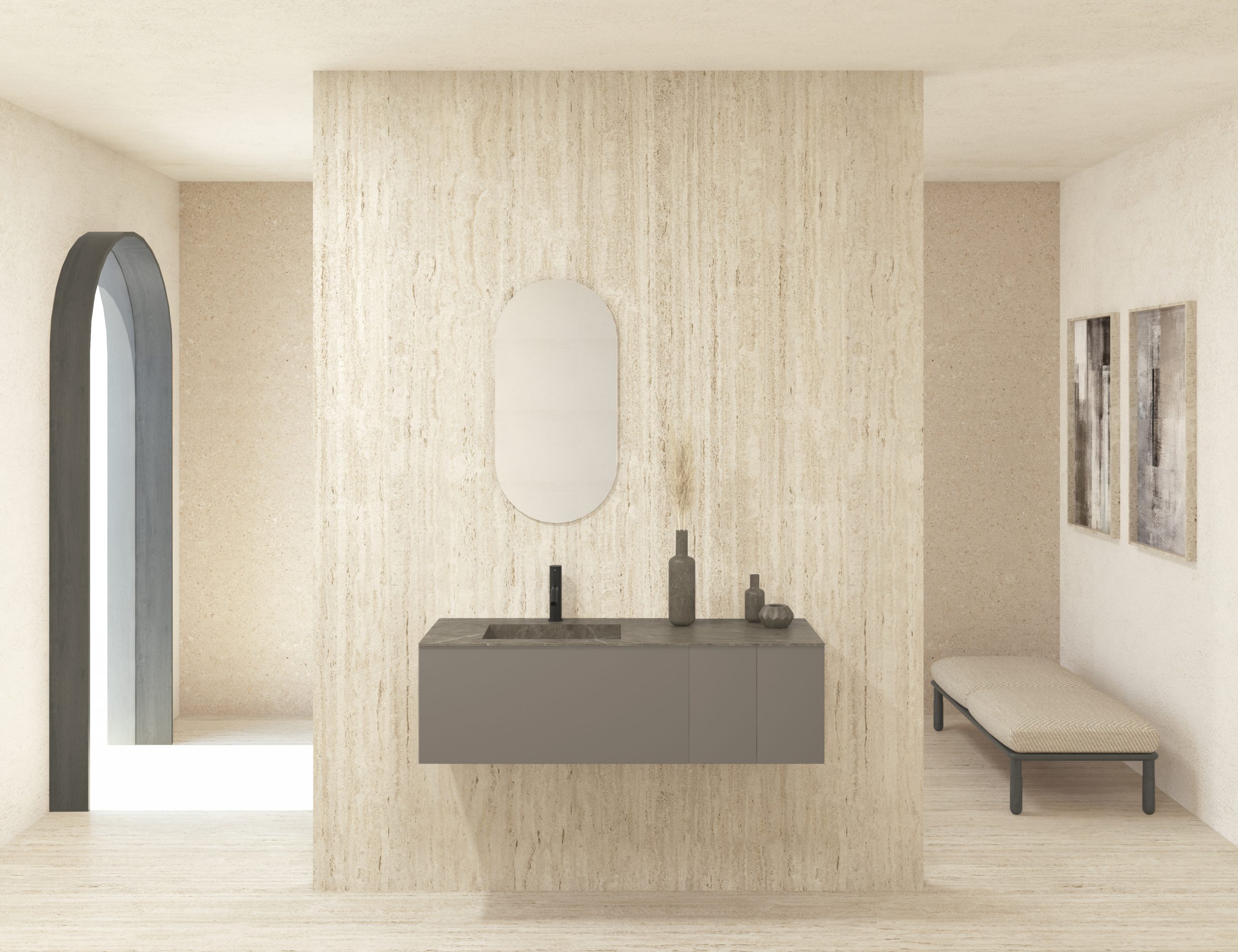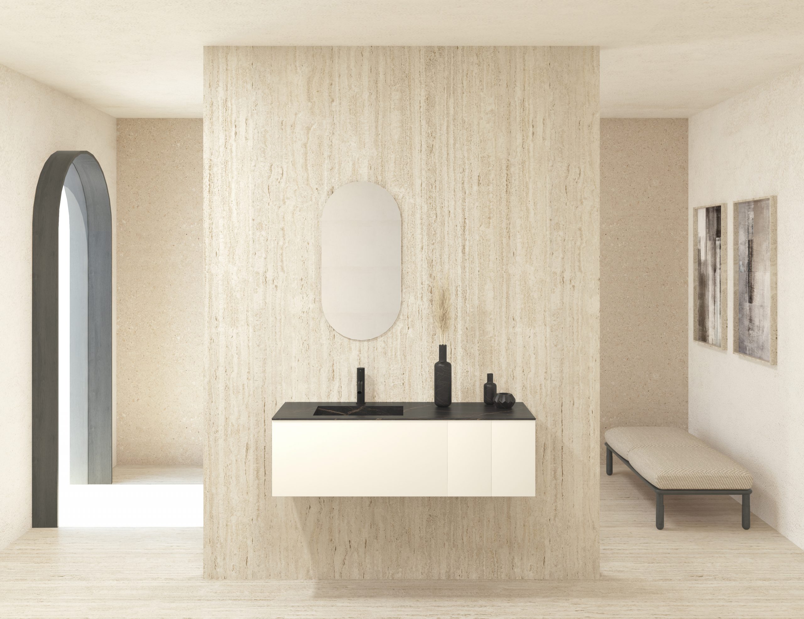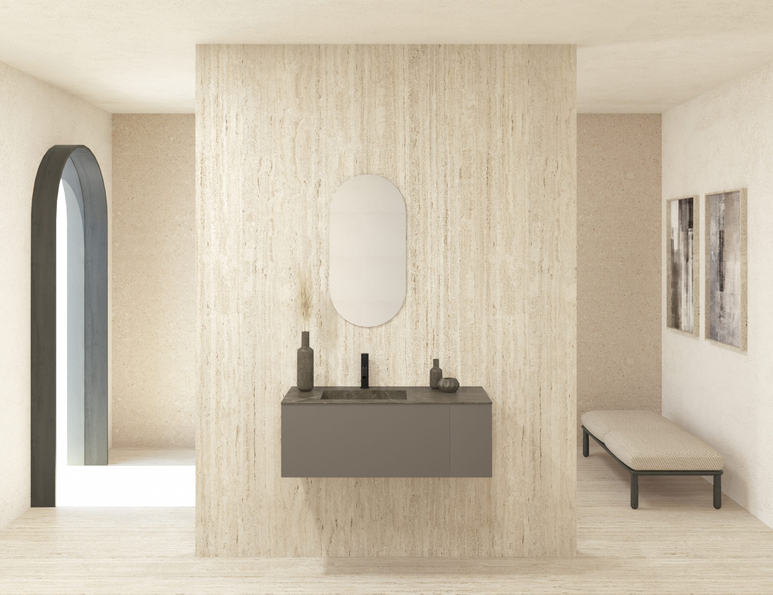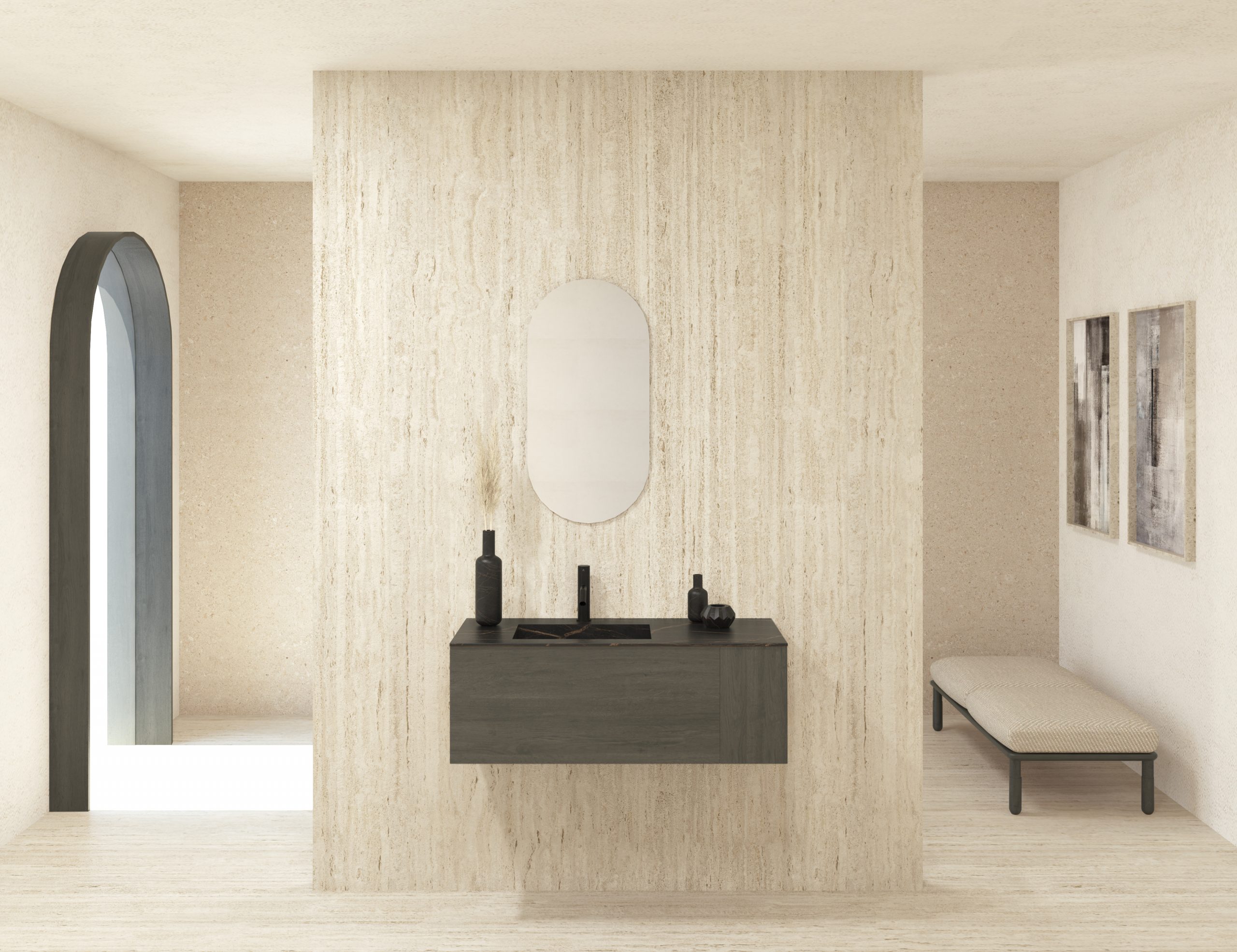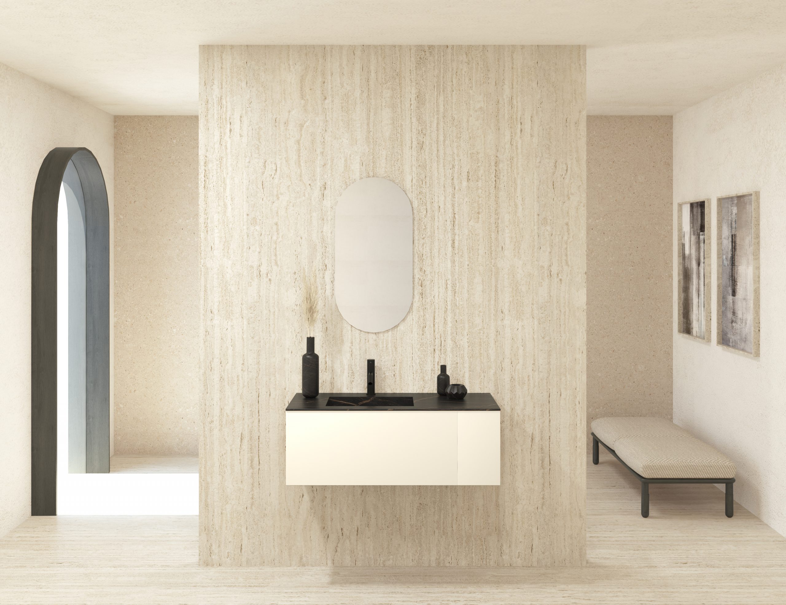 Pack composé d’un meuble sous-vasque, d’une vasque à poser en matériau Dekton de Cosentino et d’un miroir capsule.