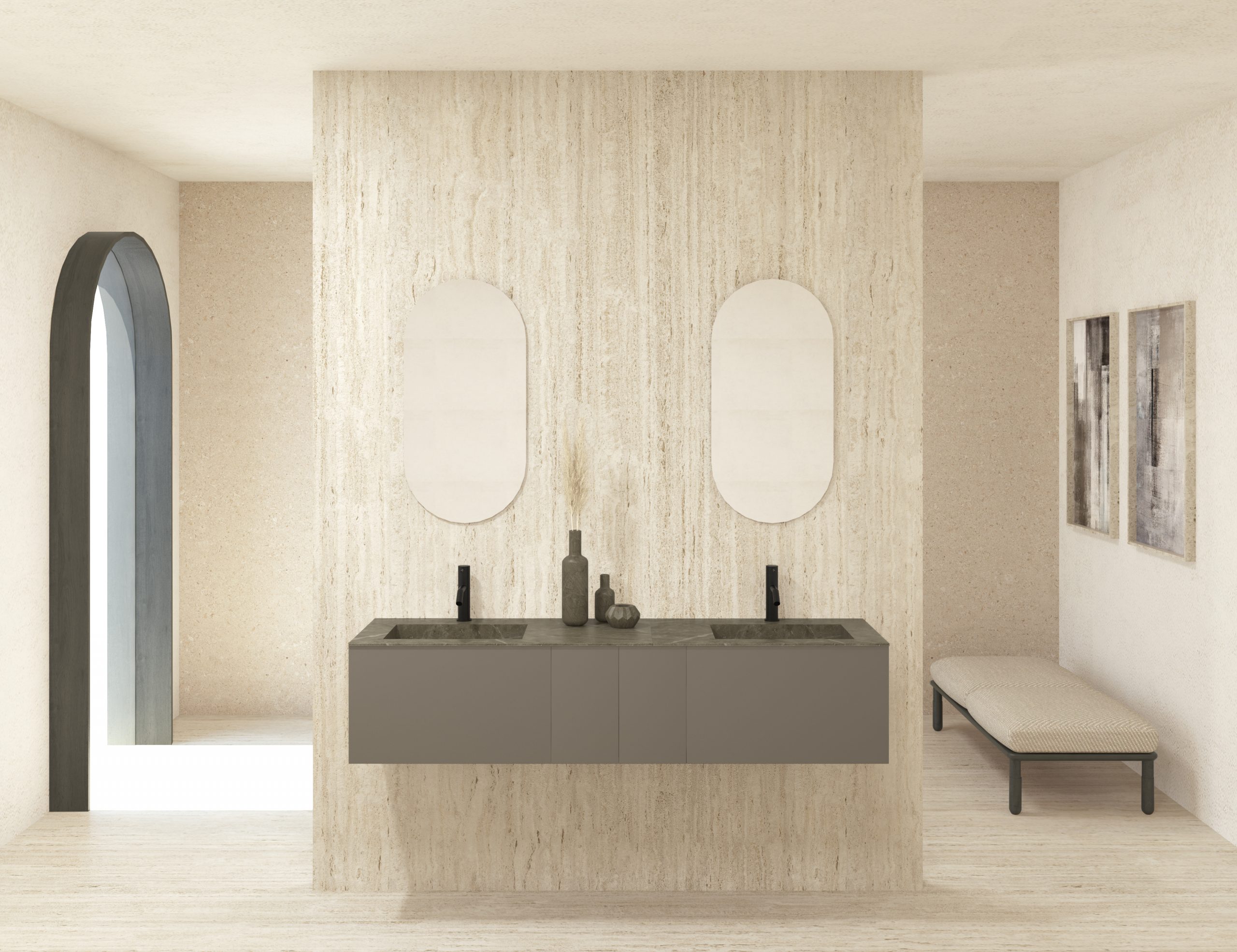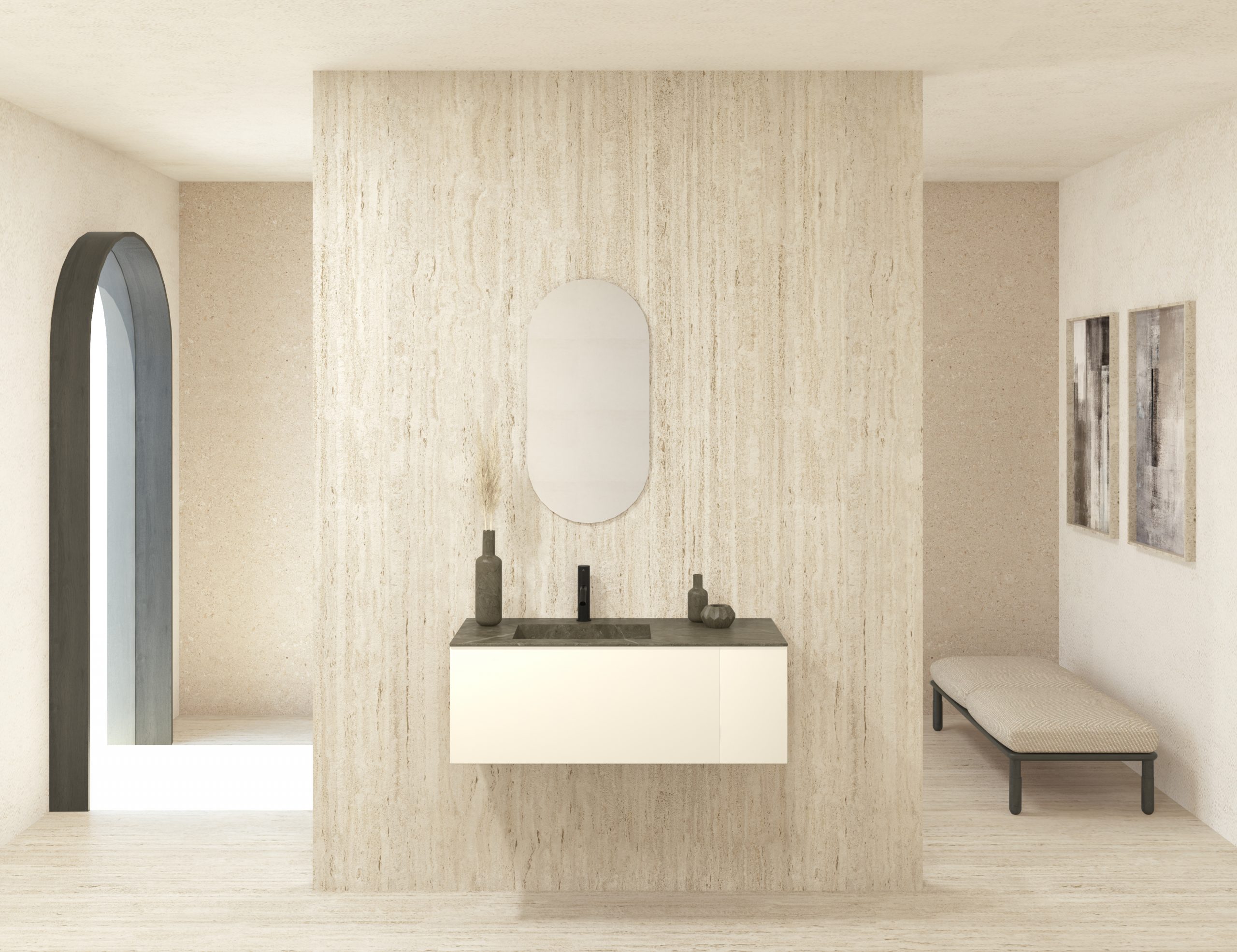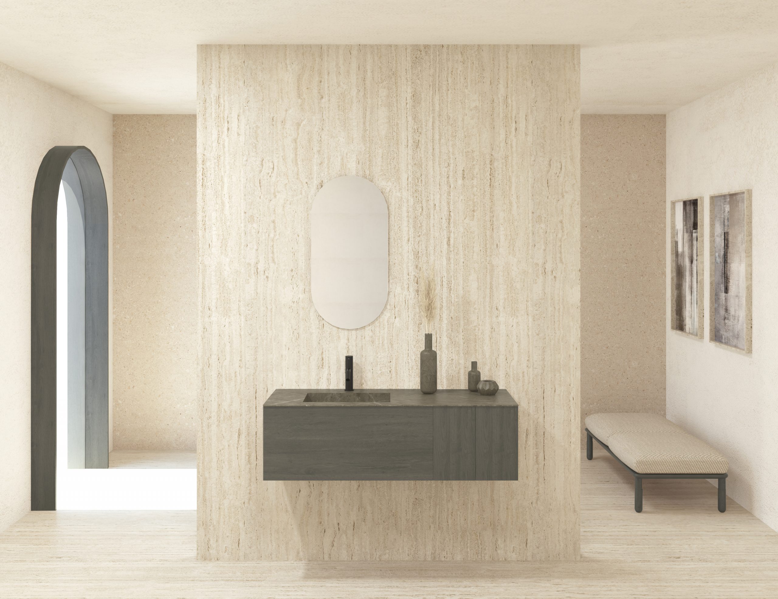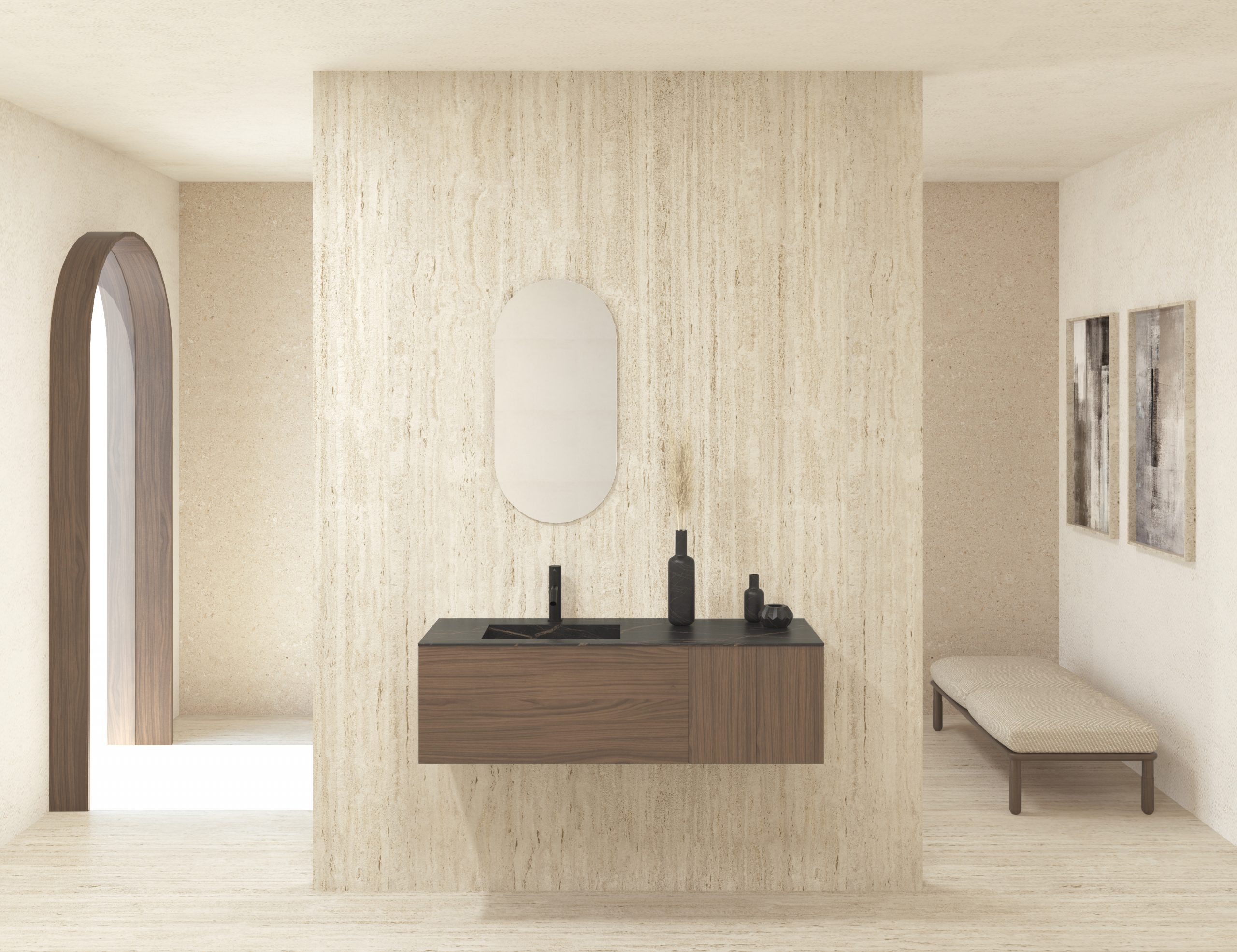 Pack composé d’un meuble sous-vasque, d’une vasque à poser en matériau Dekton de Cosentino et d’un miroir capsule.