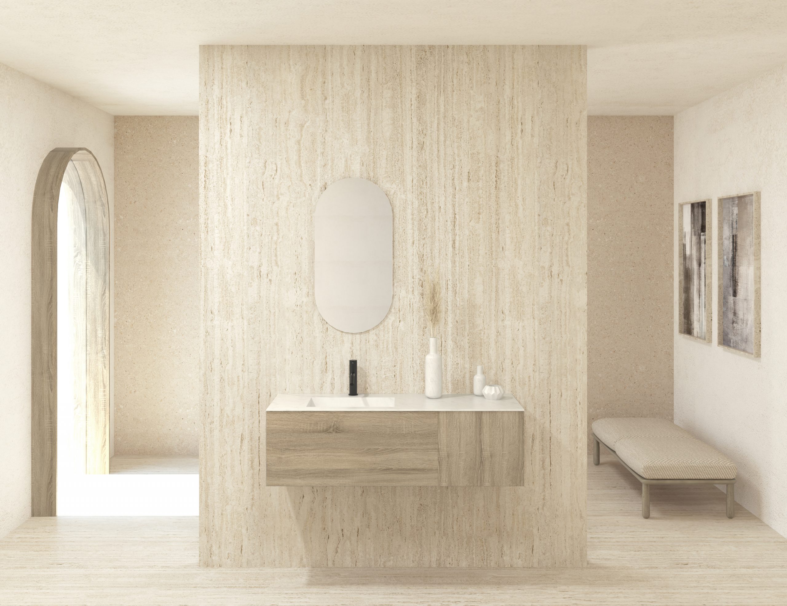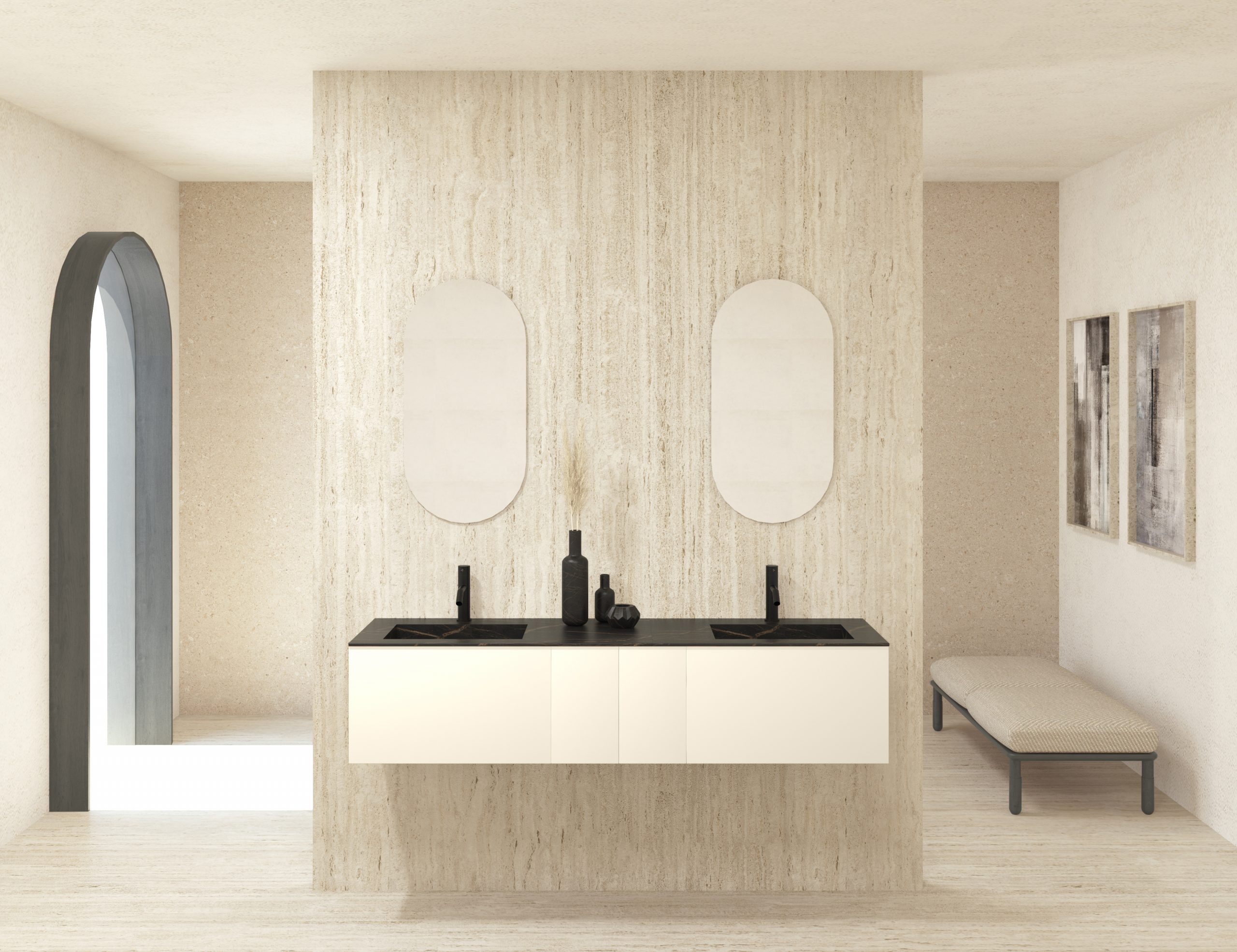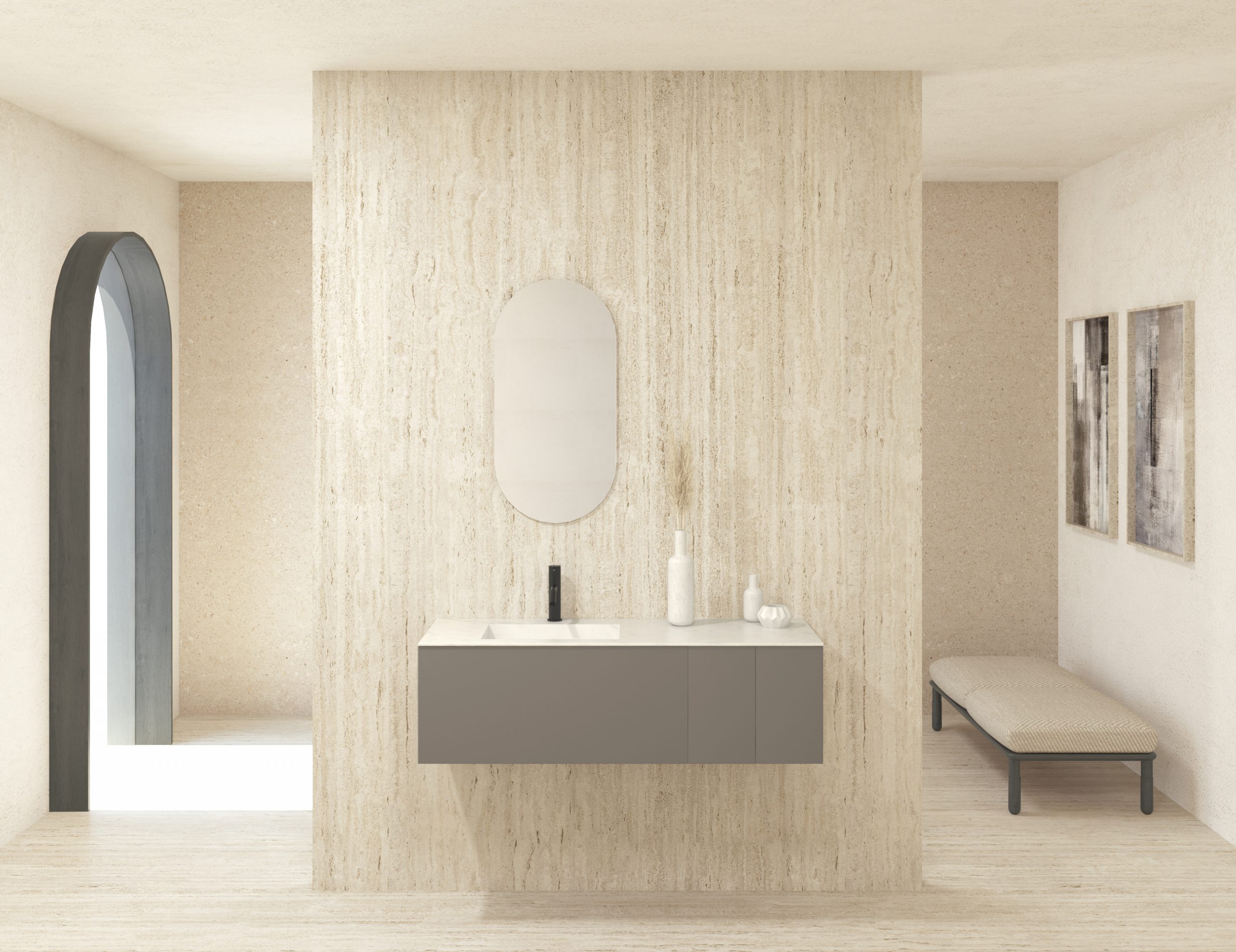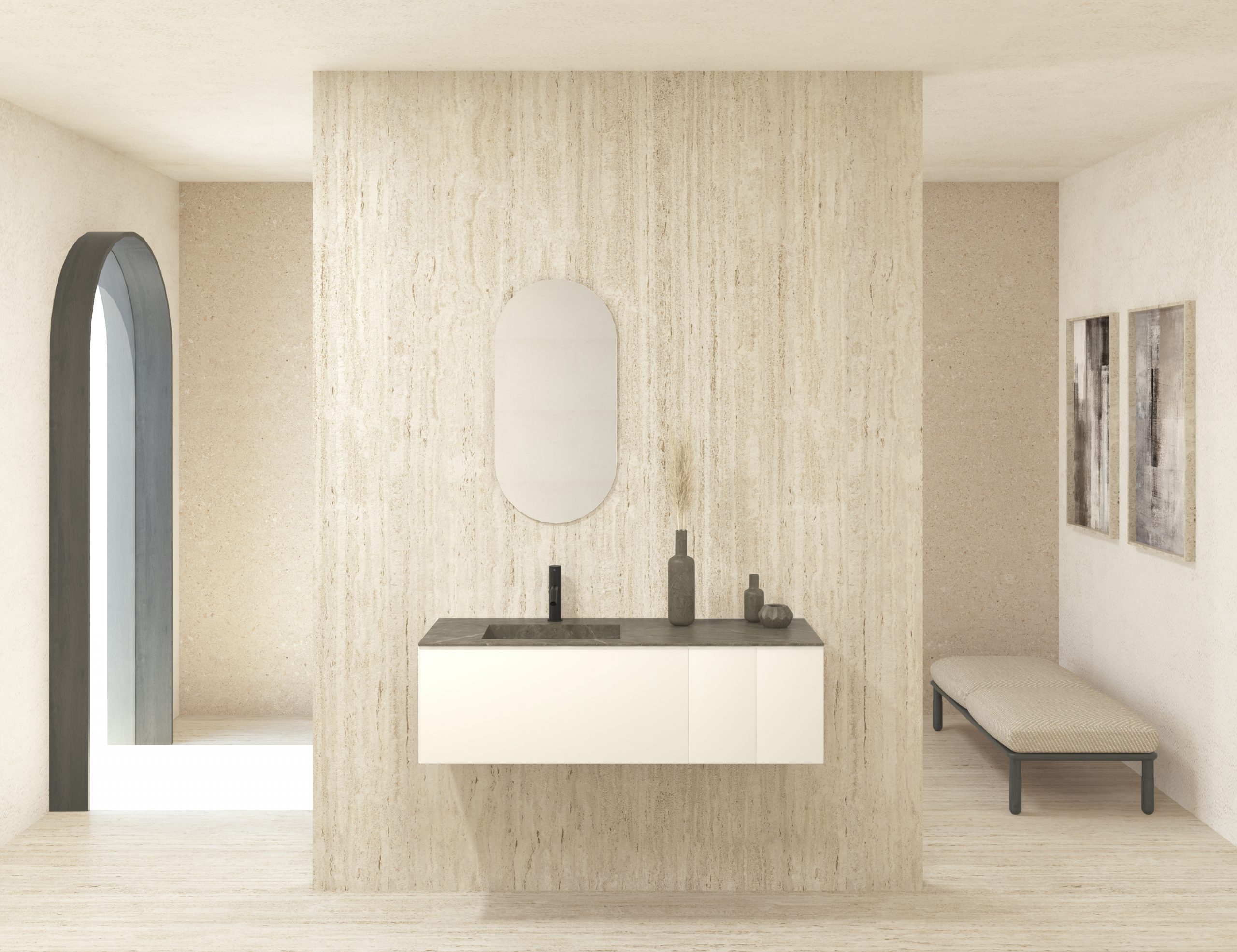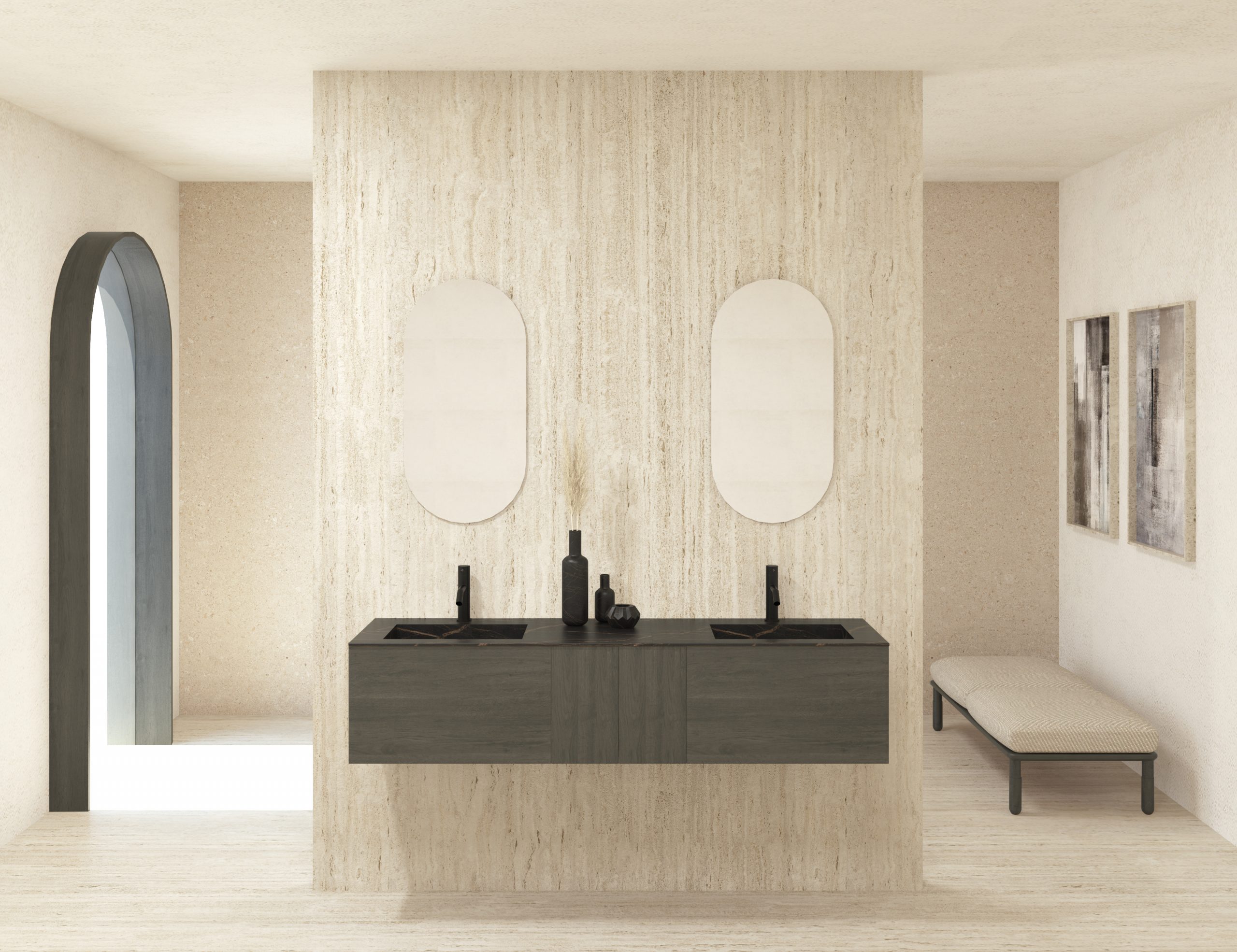 Pack composé d’un meuble sous-vasque, d’une vasque à poser en matériau Dekton de Cosentino et d’un miroir capsule.