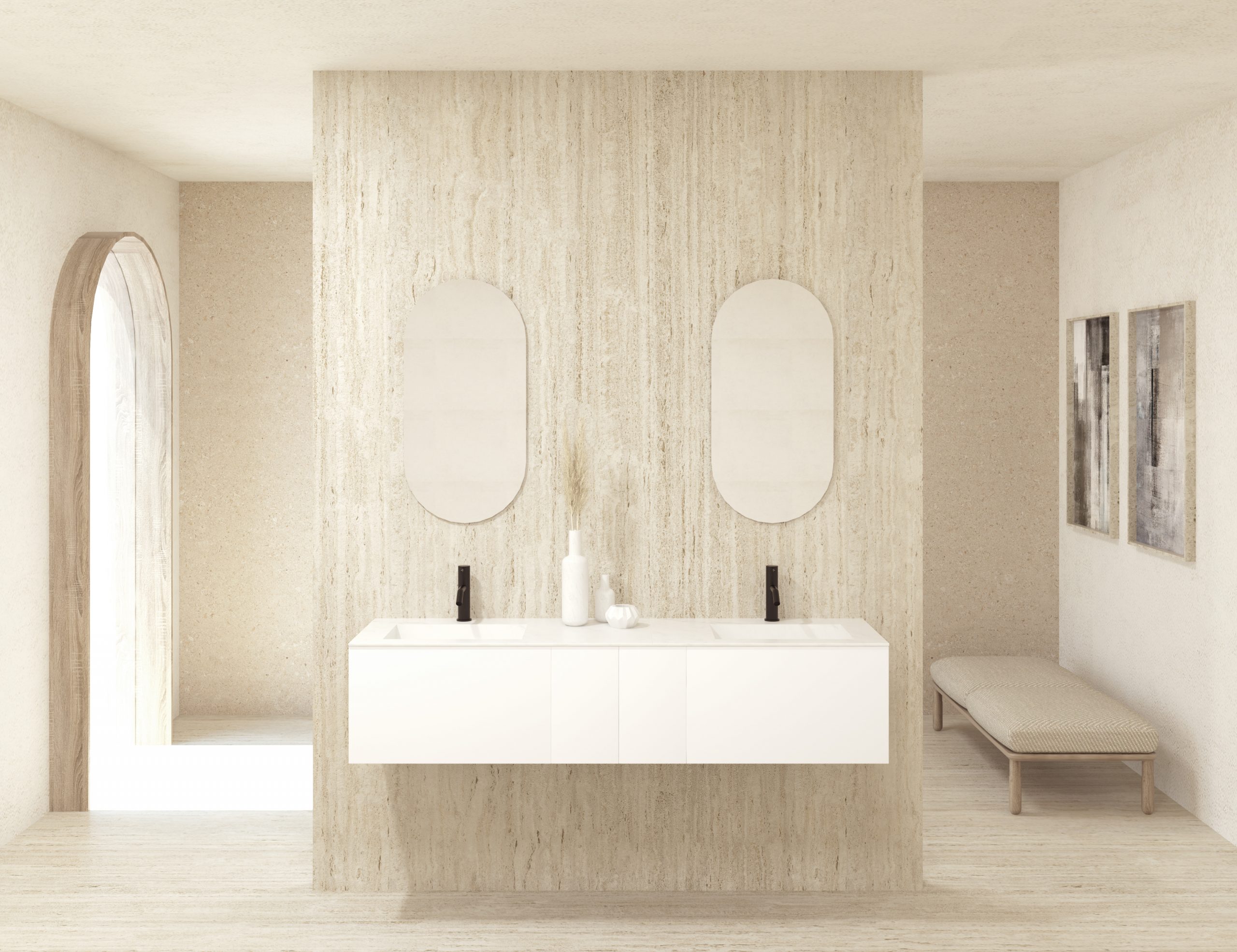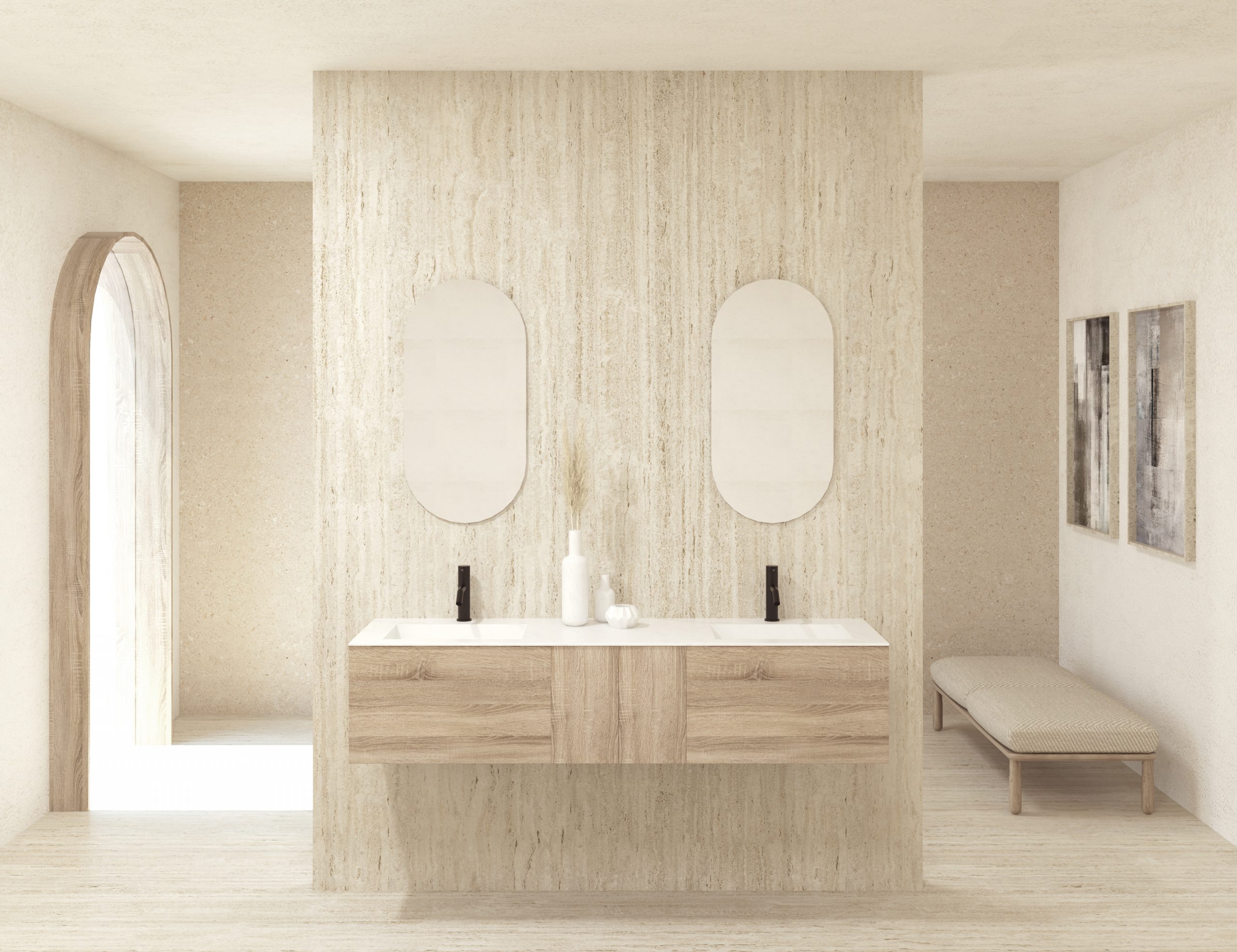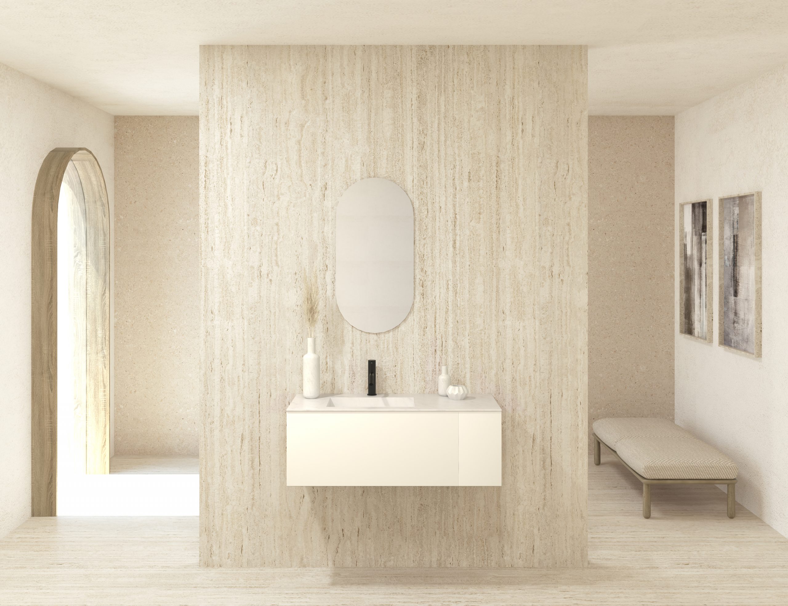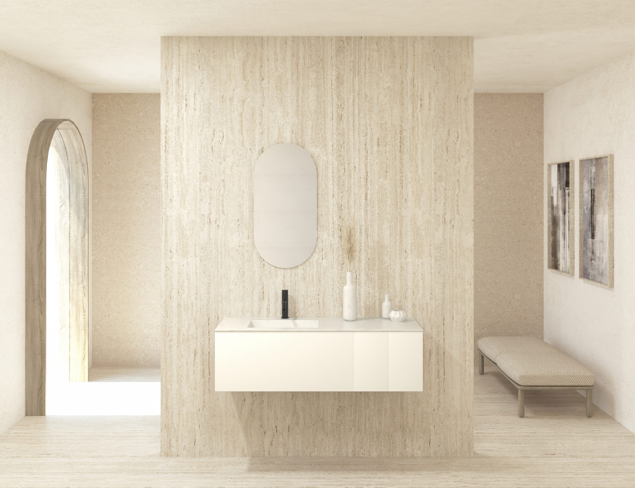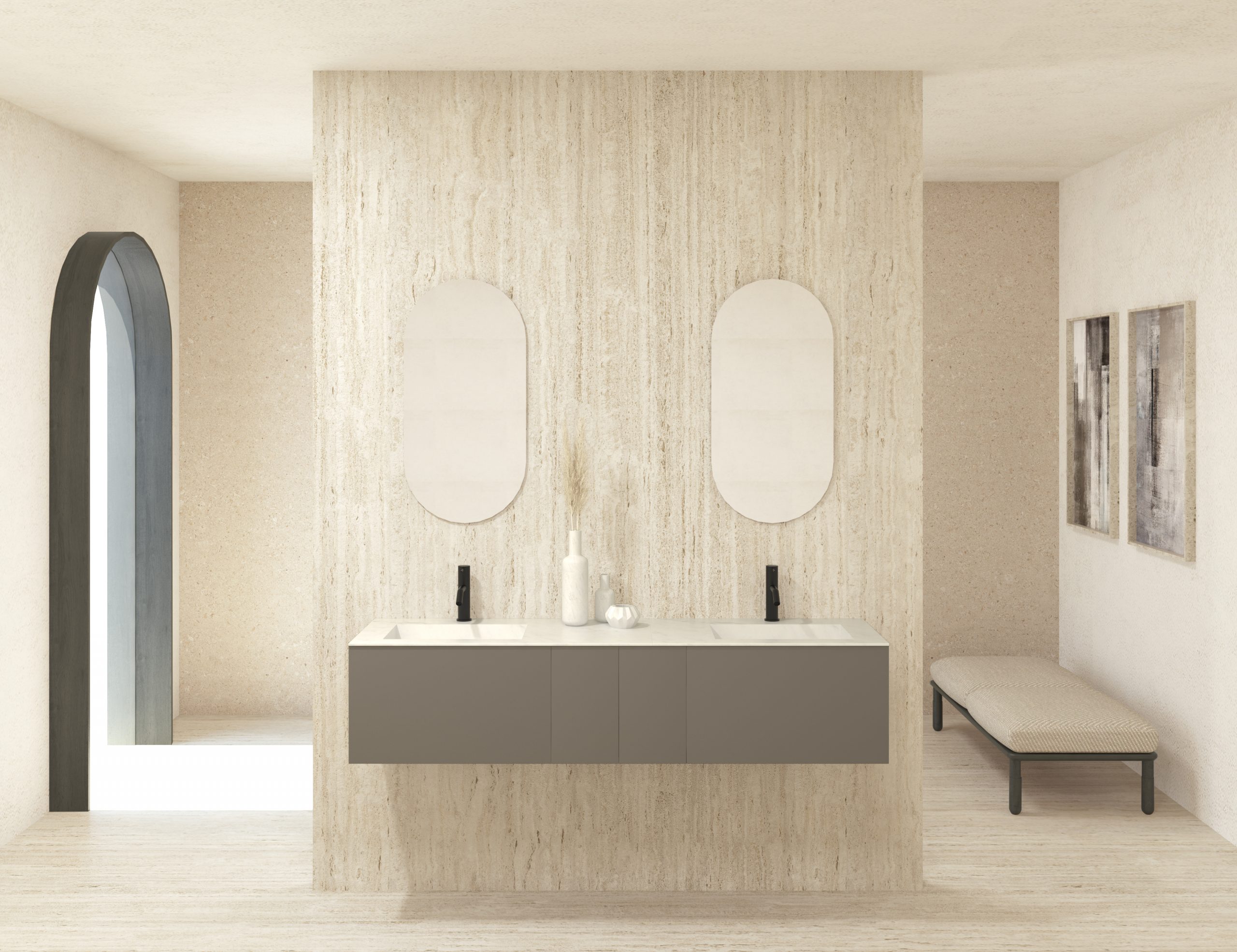 Pack composé d’un meuble sous-vasque, d’une vasque à poser en matériau Dekton de Cosentino et d’un miroir capsule.