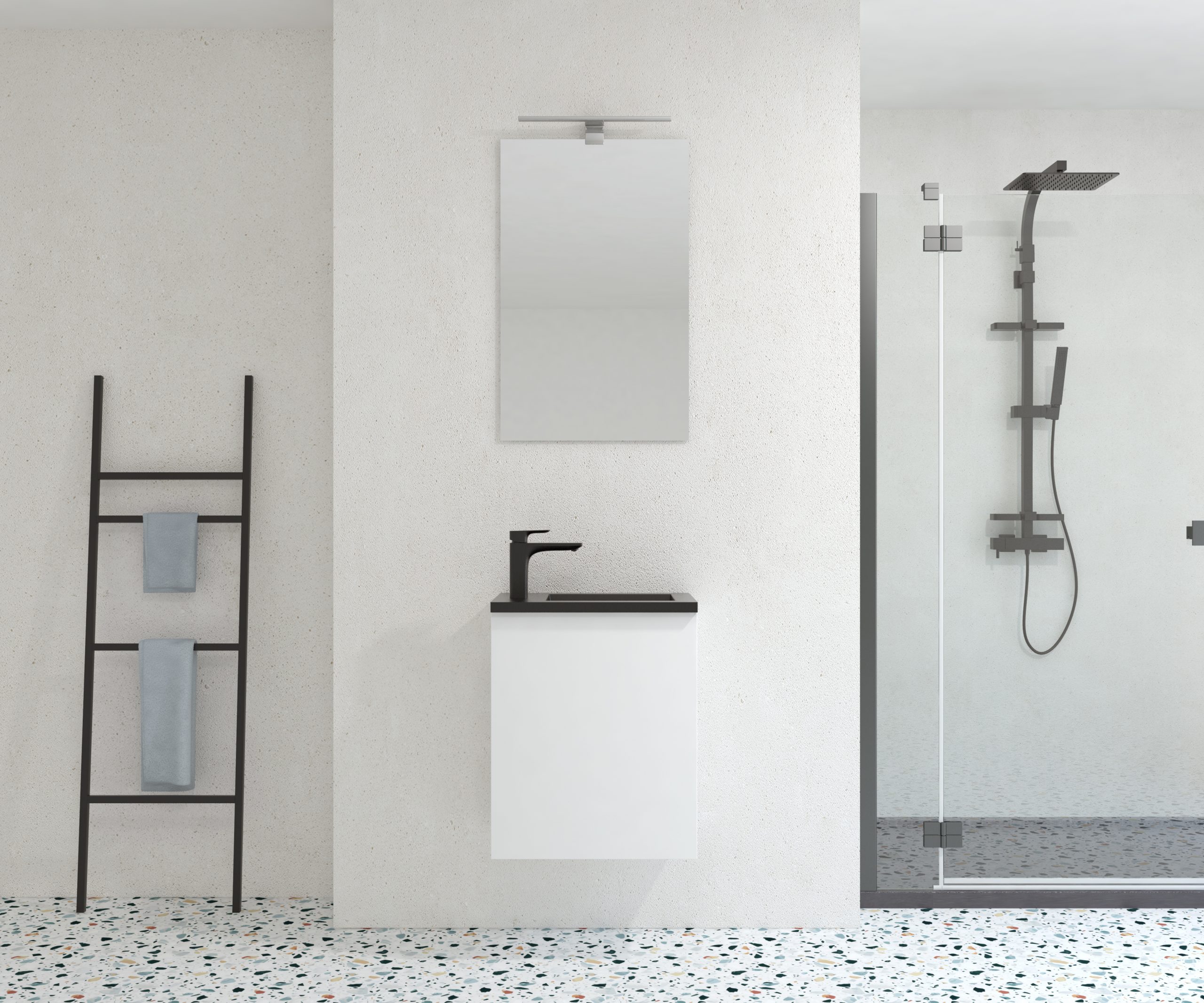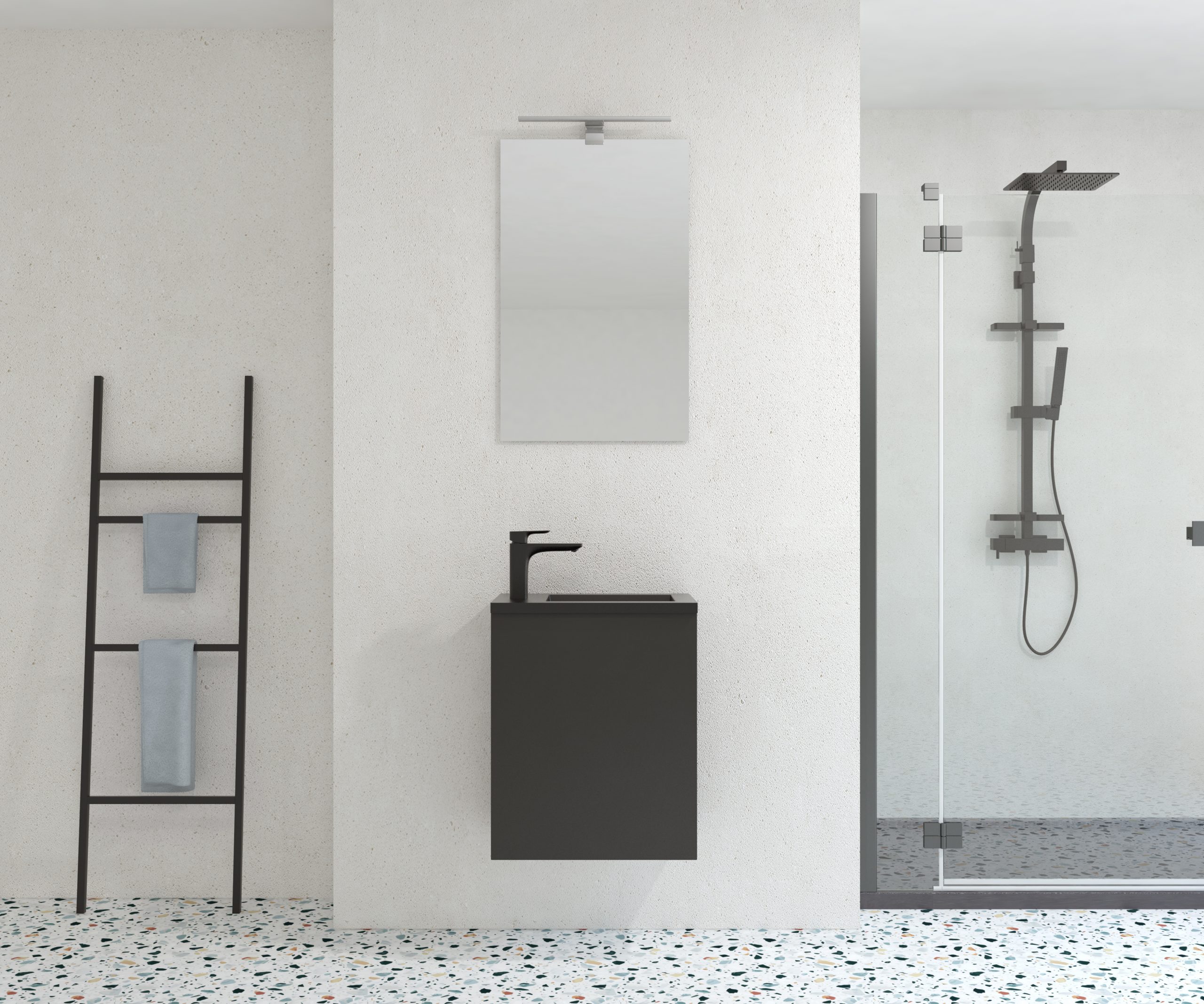 Pack composé d’un meuble suspendu, d’une vasque et d’un miroir LED. Meuble à profondeur réduite pour vasque, composé d’un module suspendu avec porte. Meuble fabriqué en panneau de particules de 19 mm avec revêtement mélaminé. Porte avec vérin amortisseur pour une fermeture douce. Réglage tridimensionnel pour une plus grande précision. Vasque en céramique noire. Miroir inclus. Livré monté, prêt à être fixé au mur. Comprend toute la quincaillerie nécessaire. Fabriqué en Espagne. Robinet et siphon non inclus.