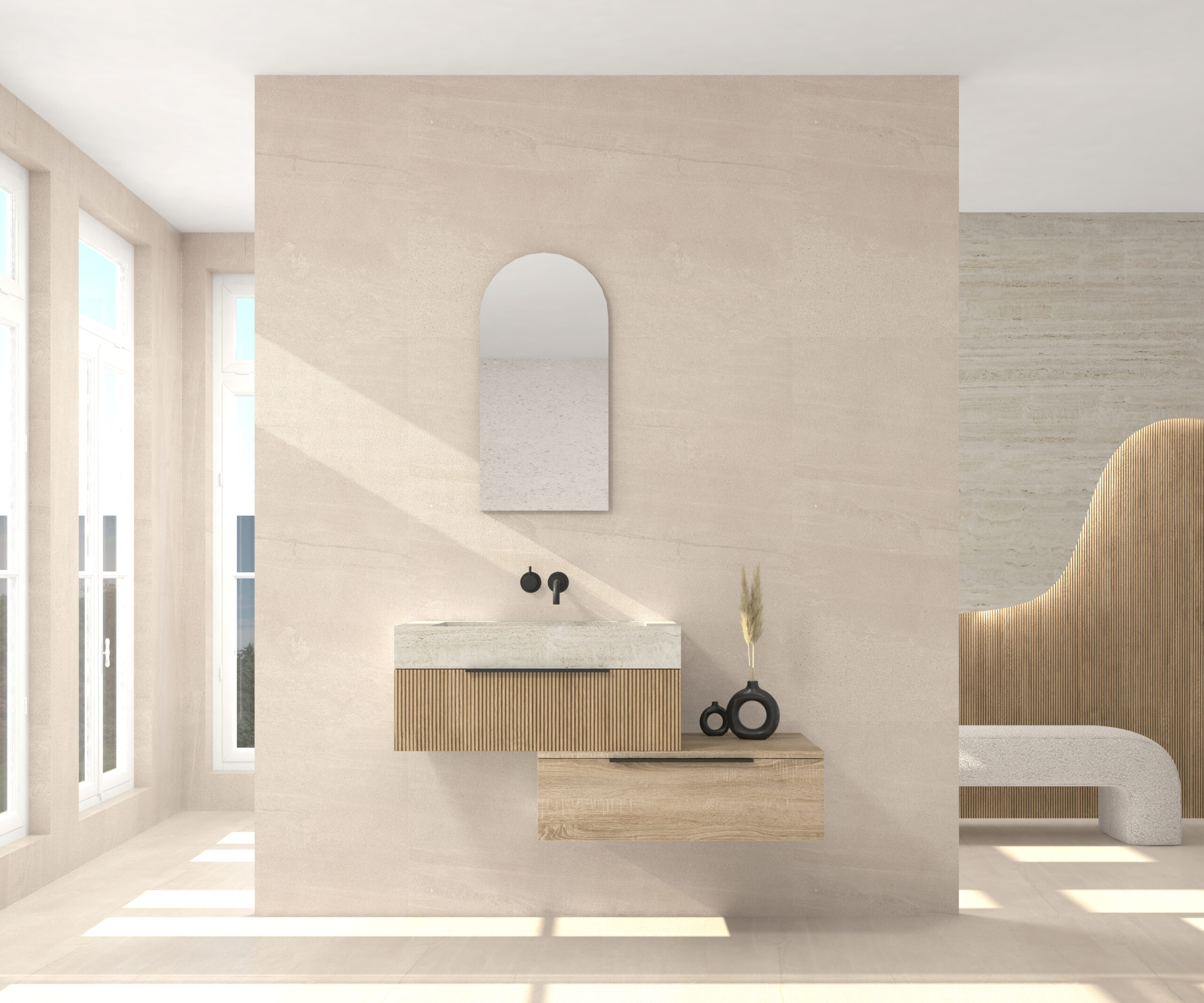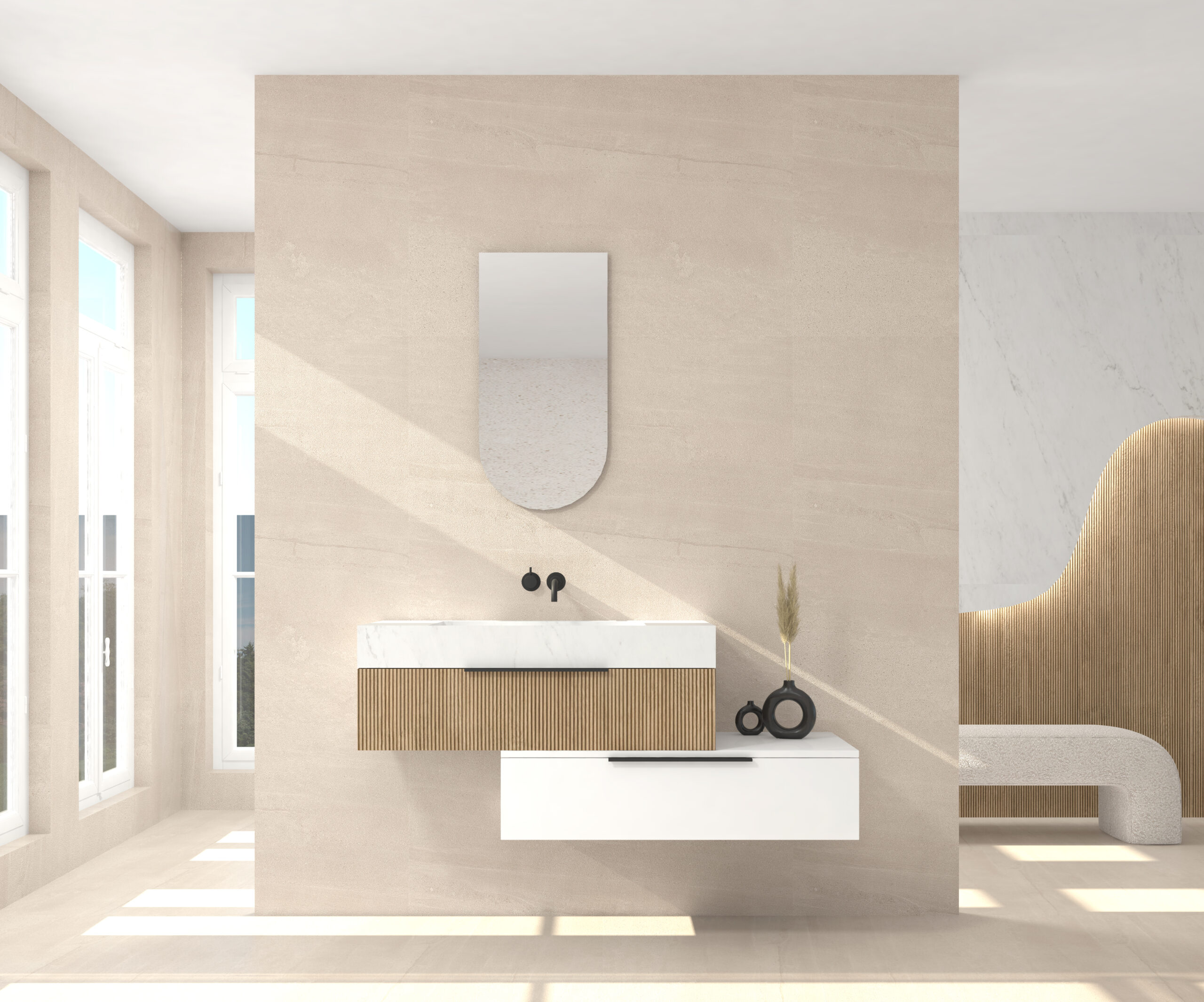 Pack composé d’un lavabo suspendu en matériau Dekton de Cosentino, d’un meuble et d’un miroir design alma.