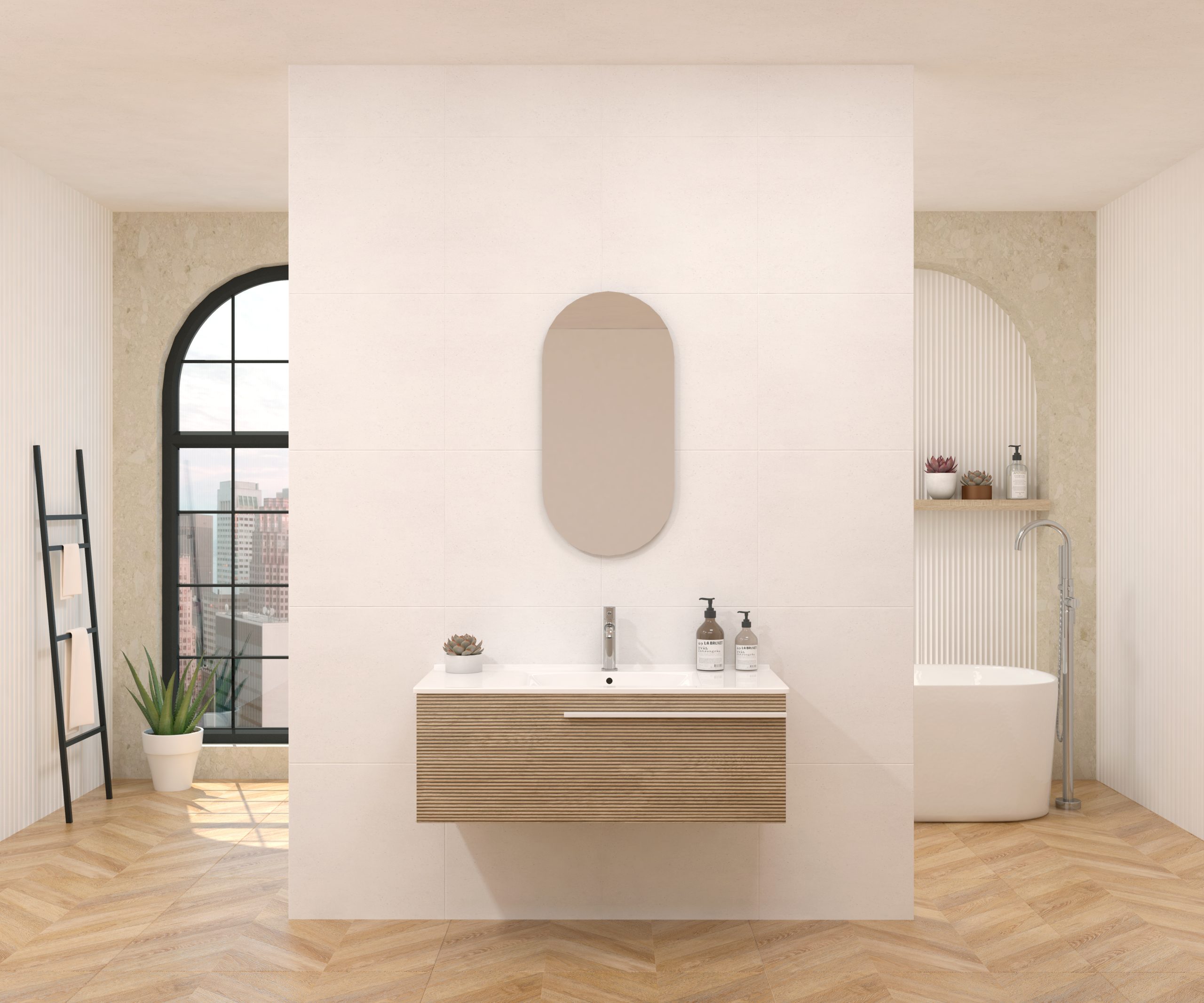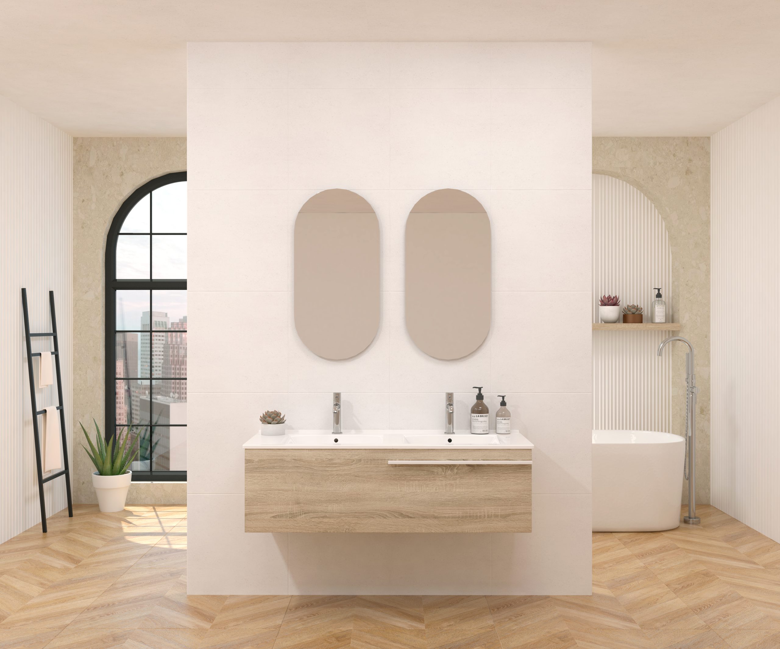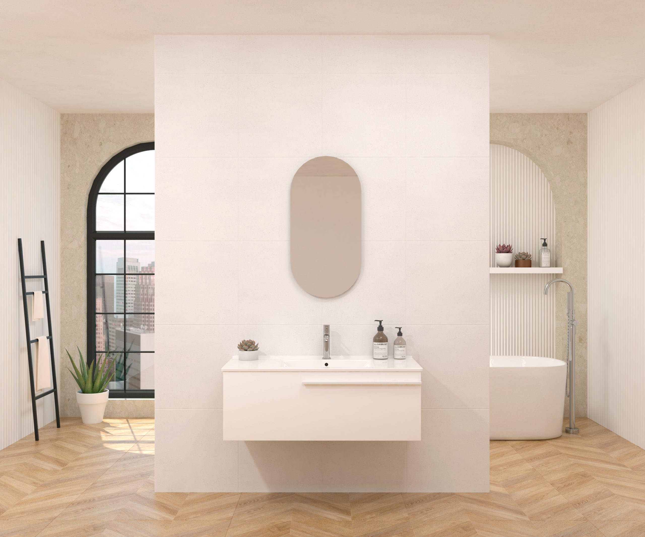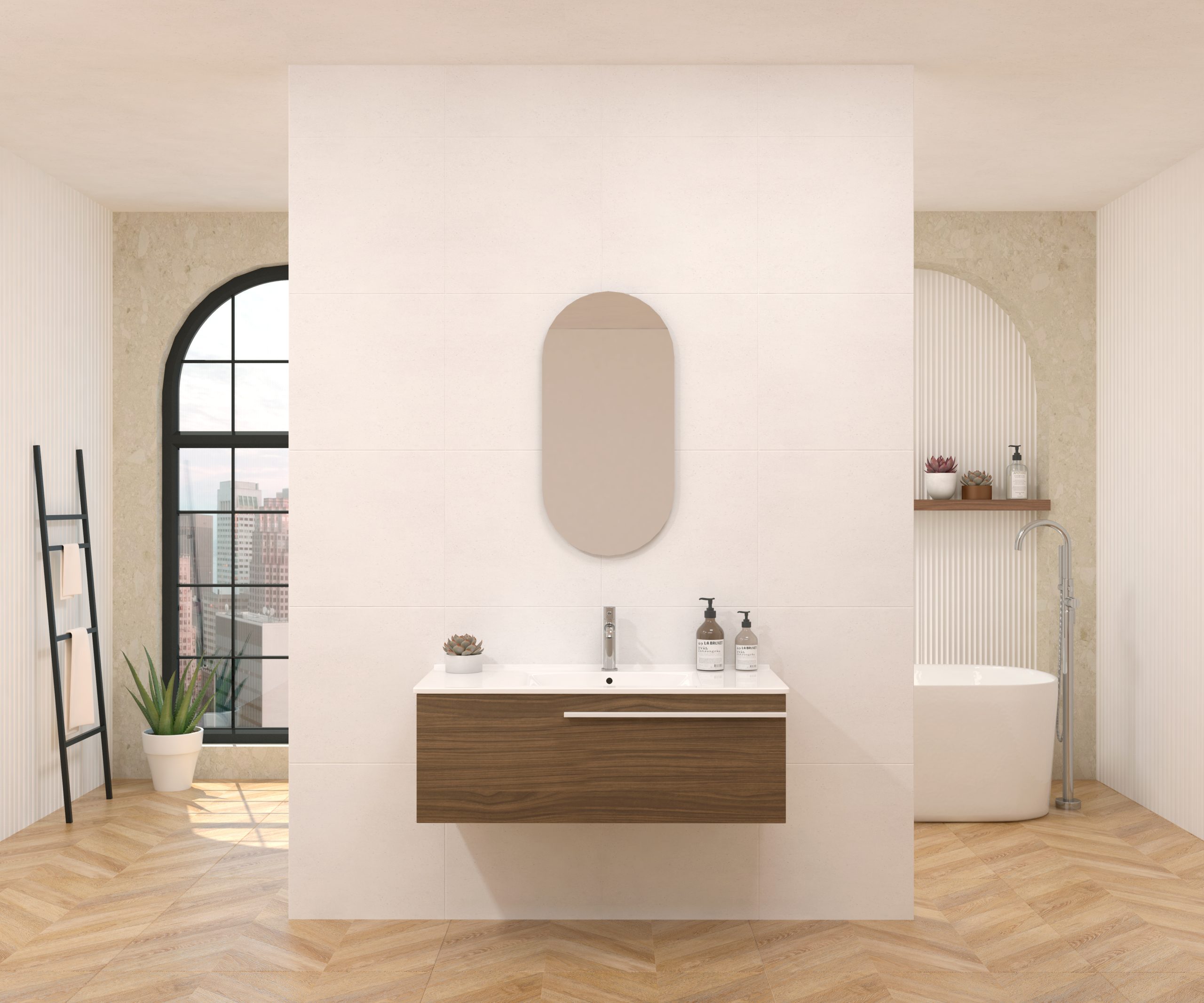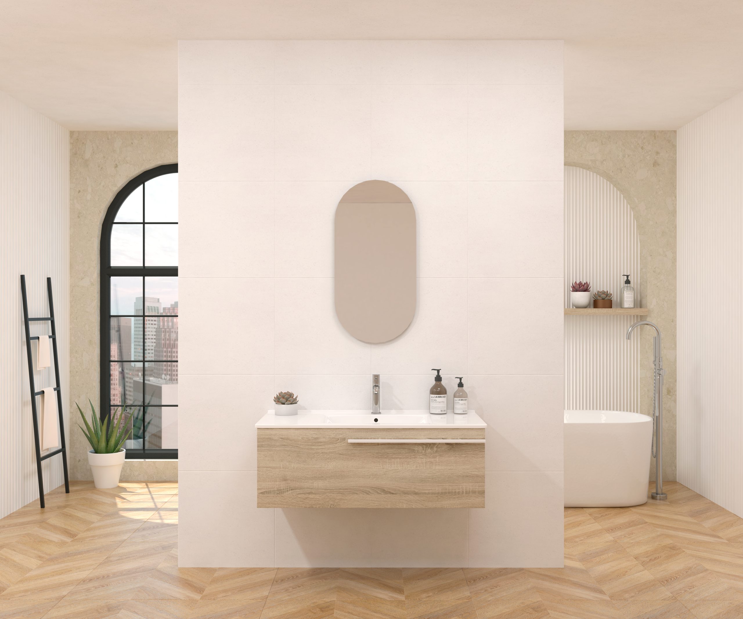 Pack composé d’un meuble sous-vasque suspendu, d’une vasque et d’un miroir design capsule.