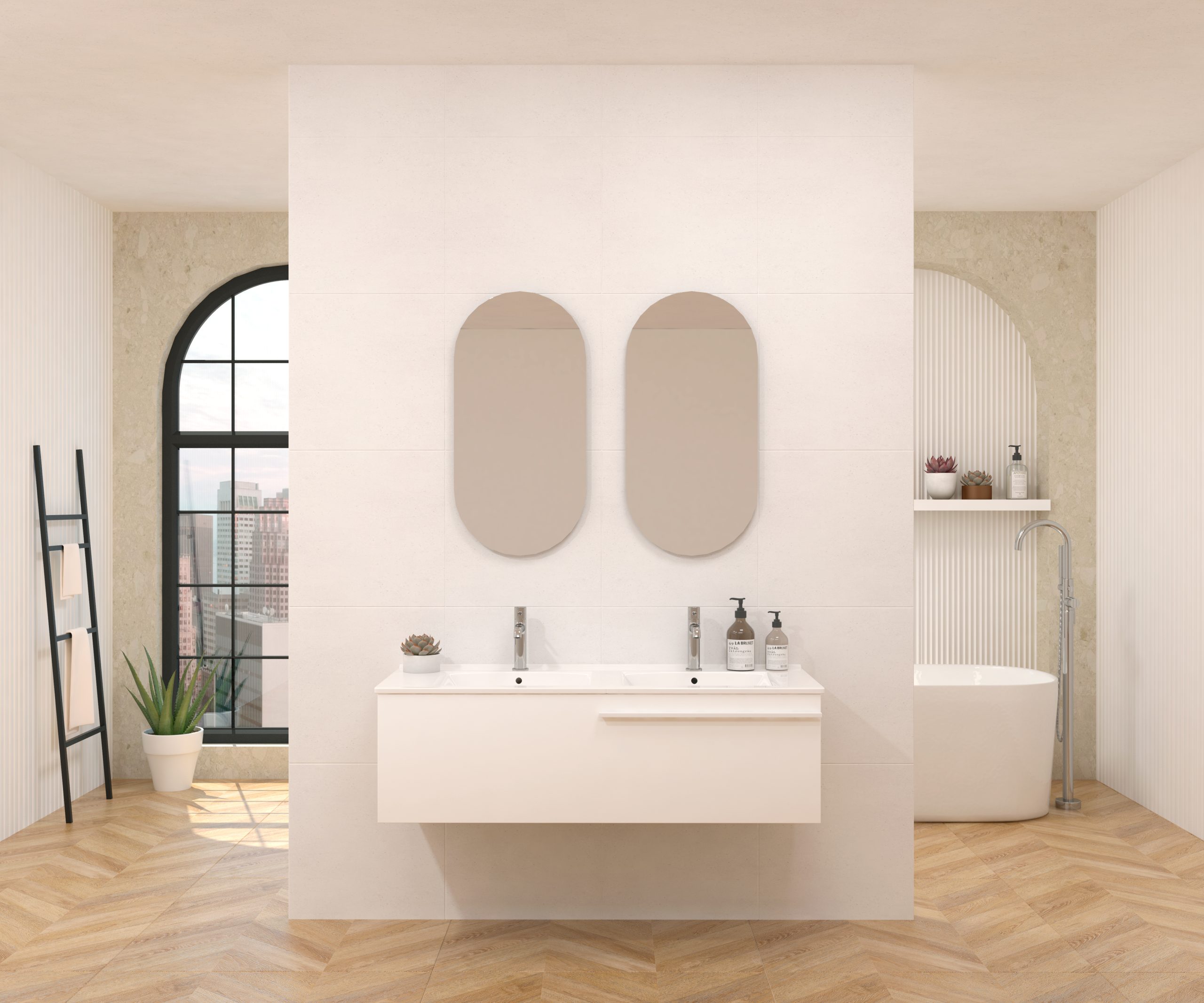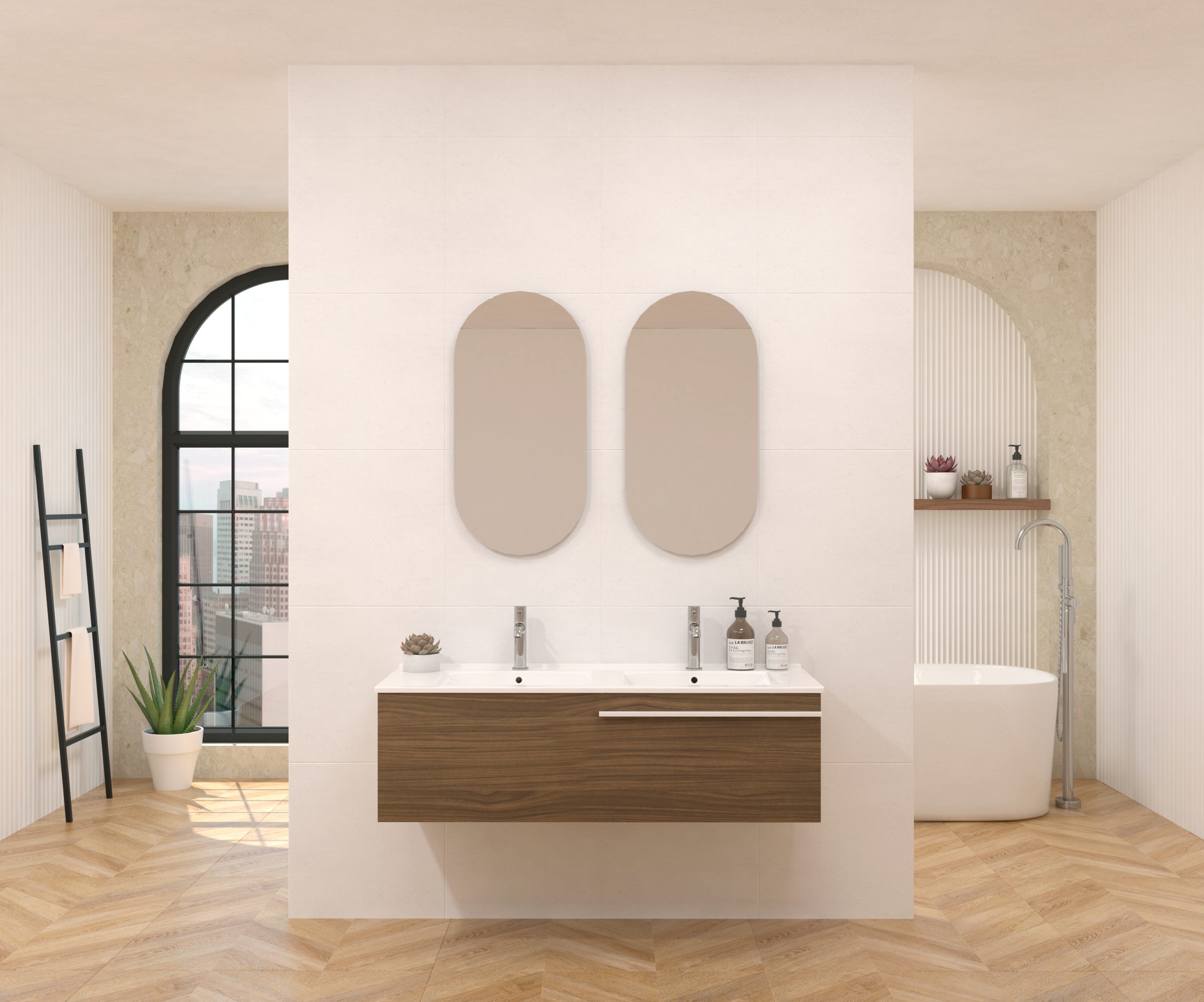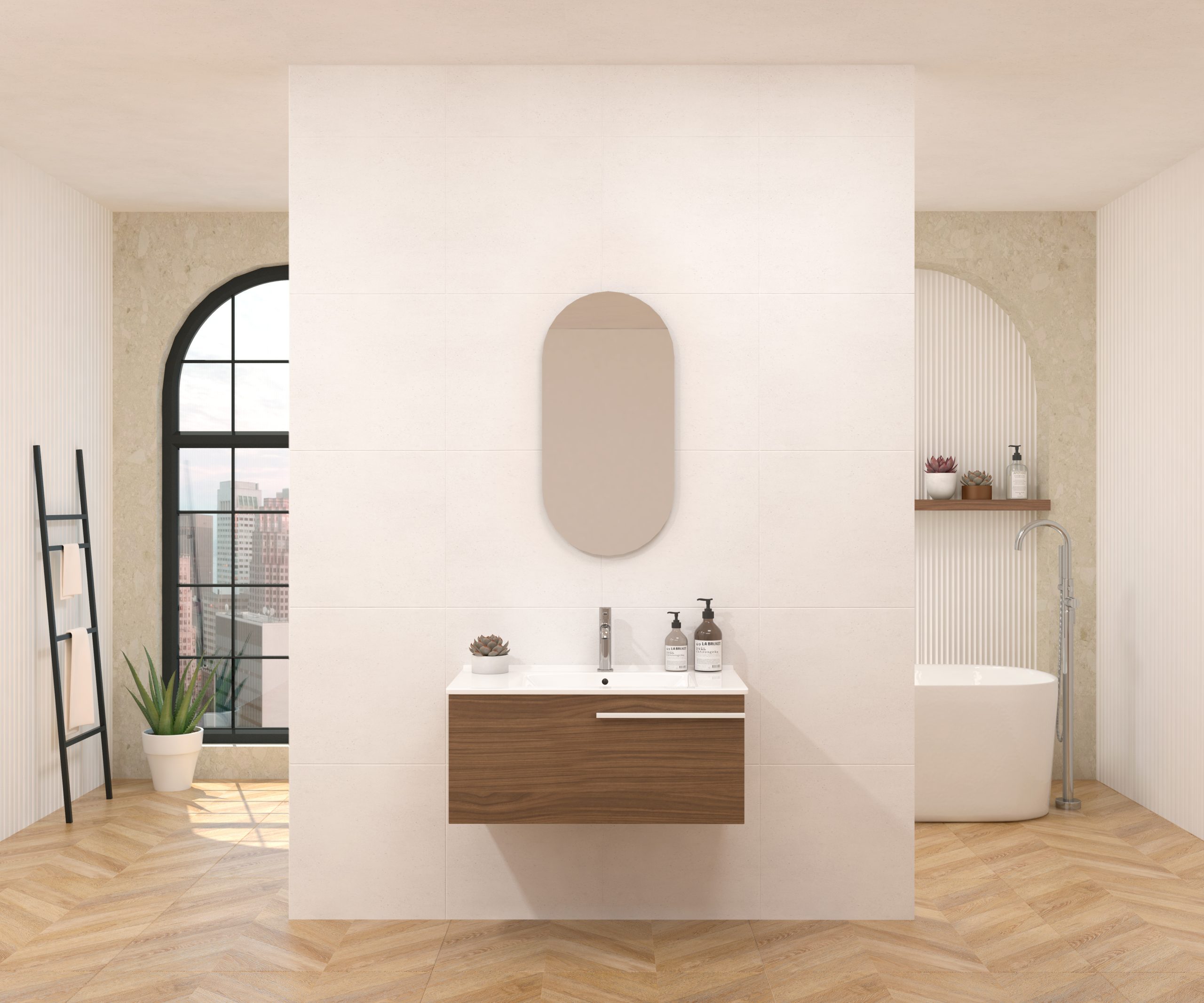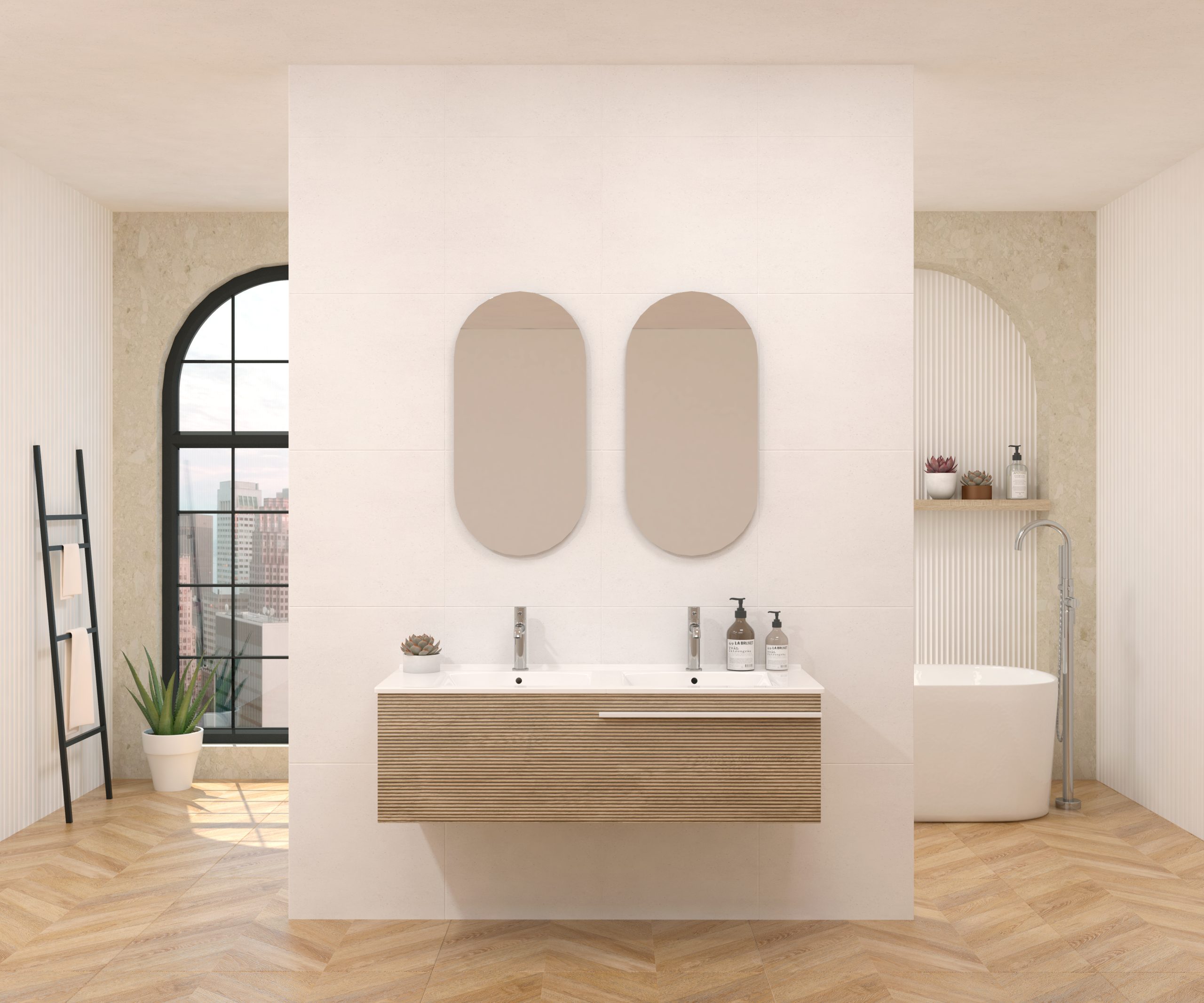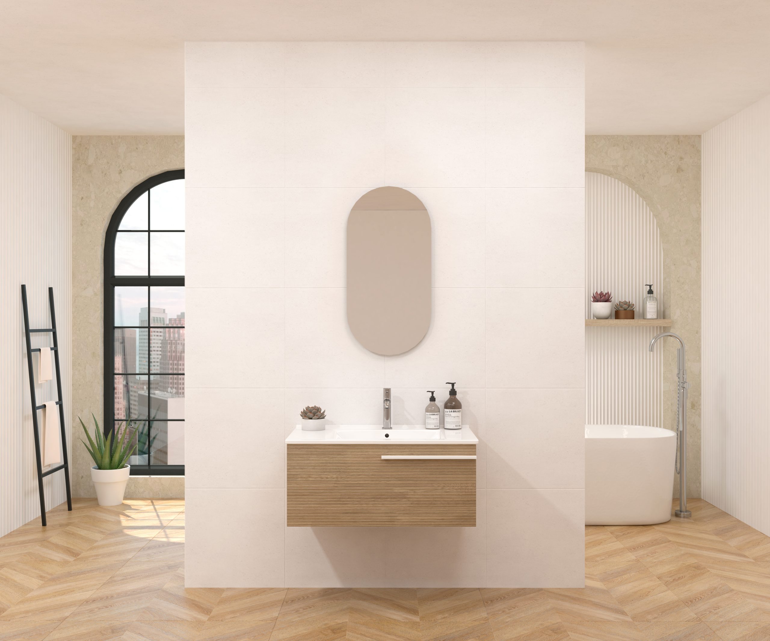 Pack composé d’un meuble sous-vasque suspendu, d’une vasque et d’un miroir design capsule.