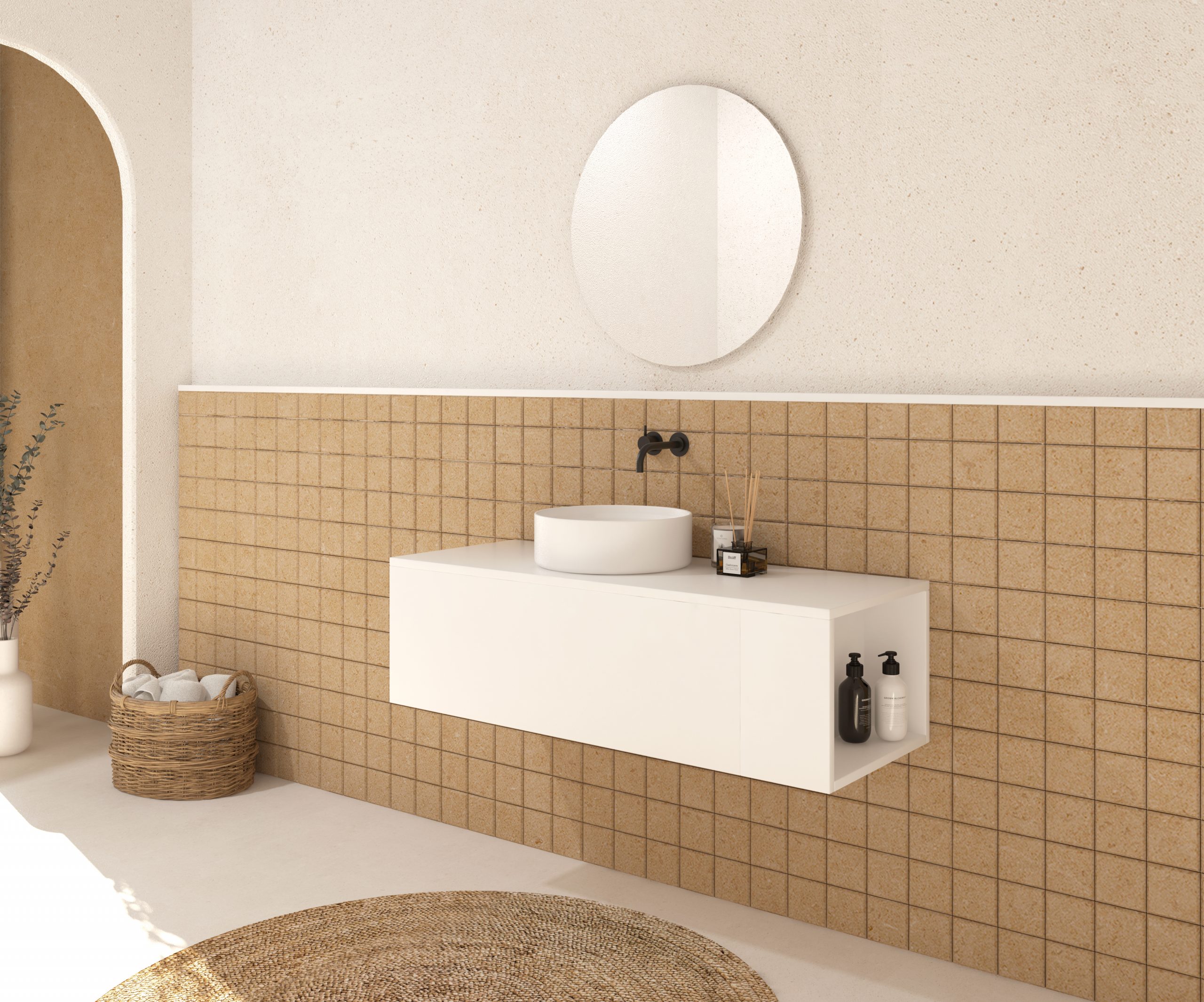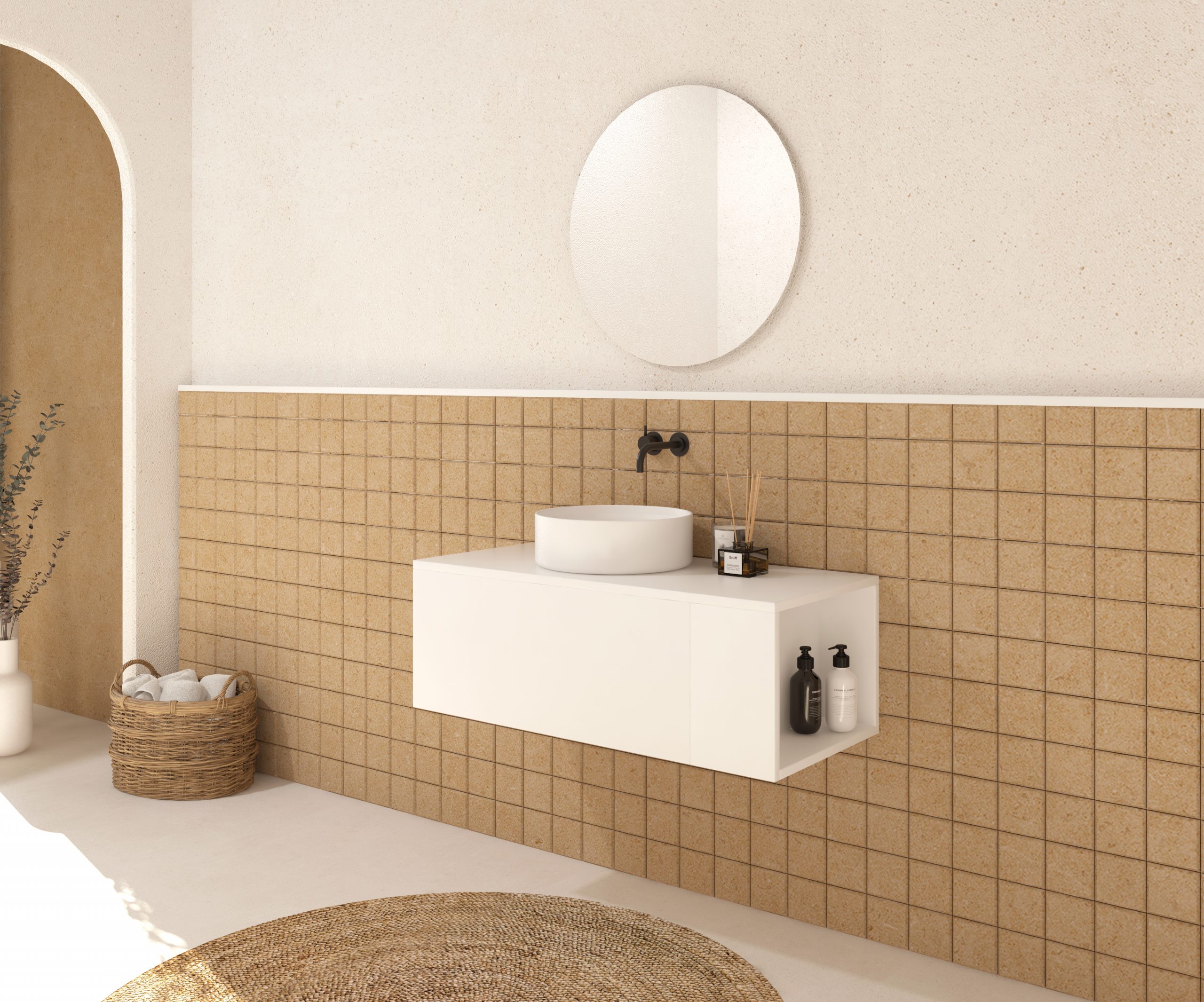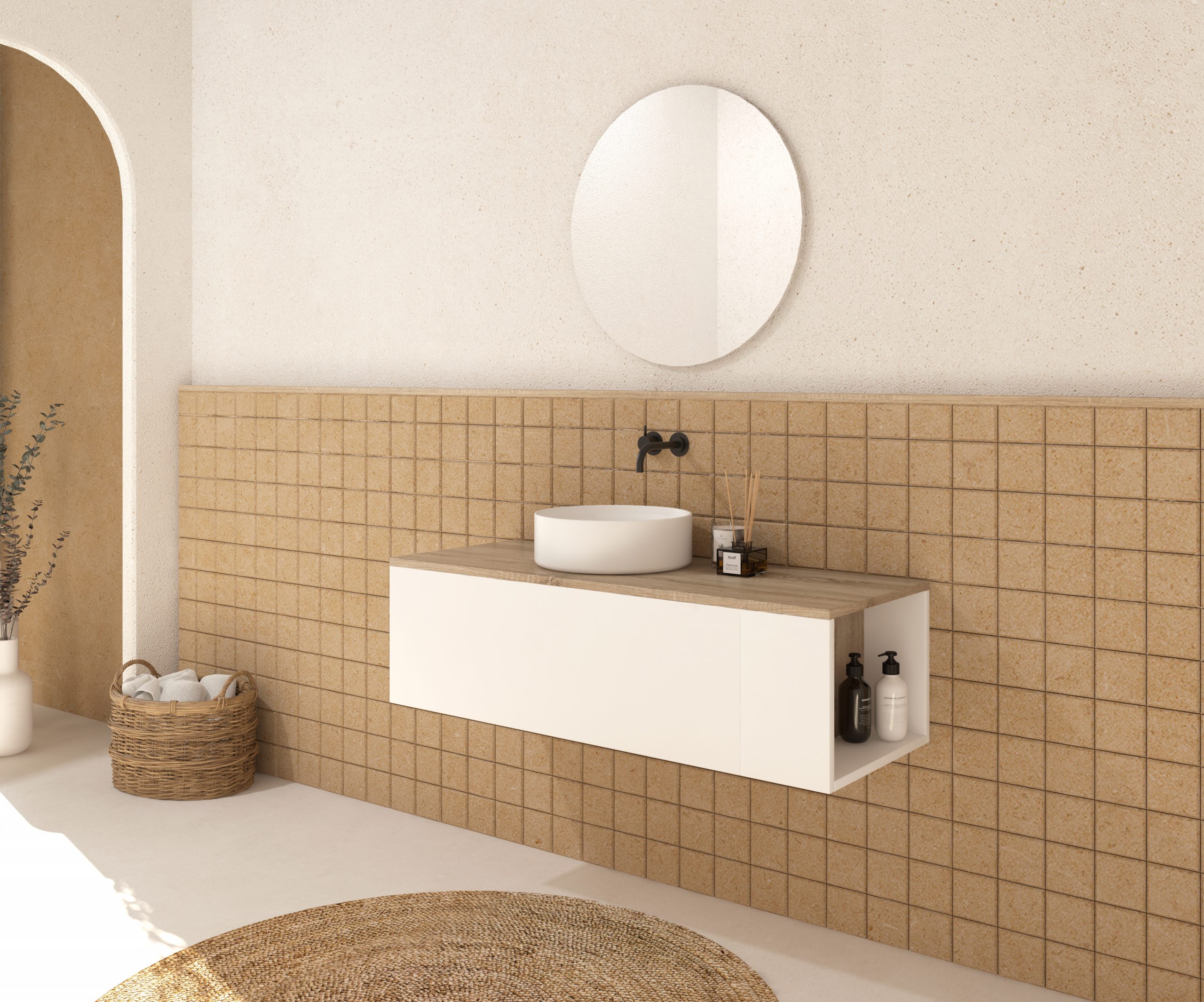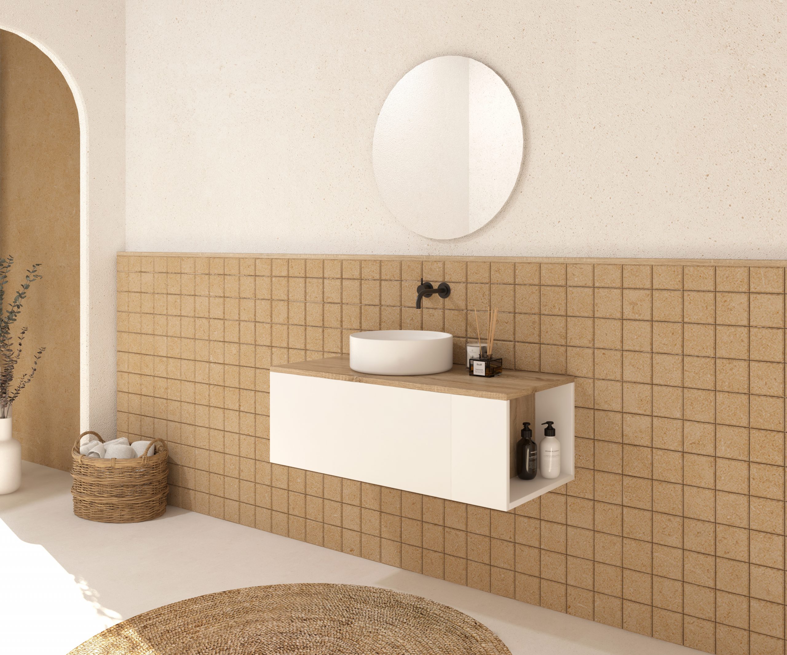 Ensemble comprenant un meuble sous-vasque suspendu, une vasque et un miroir circulaire.