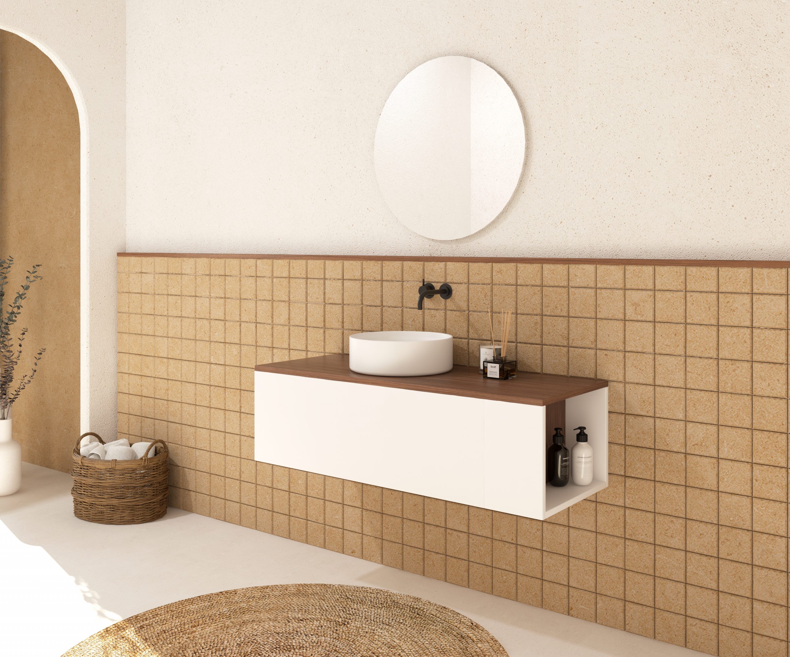 Le meuble suspendu se compose d’un module tiroir et d’un espace décoratif latéral. Meuble fabriqué en panneau de particules de 19 mm avec revêtement mélaminé, écologique et recyclable. Tiroir métallique à double paroi, à l’esthétique minimaliste, avec des parois fines et des lignes droites, doté d’une fermeture amortie et d’une capacité de charge de 25 kg. Tiroir avec accessibilité totale et espace arrière disponible.