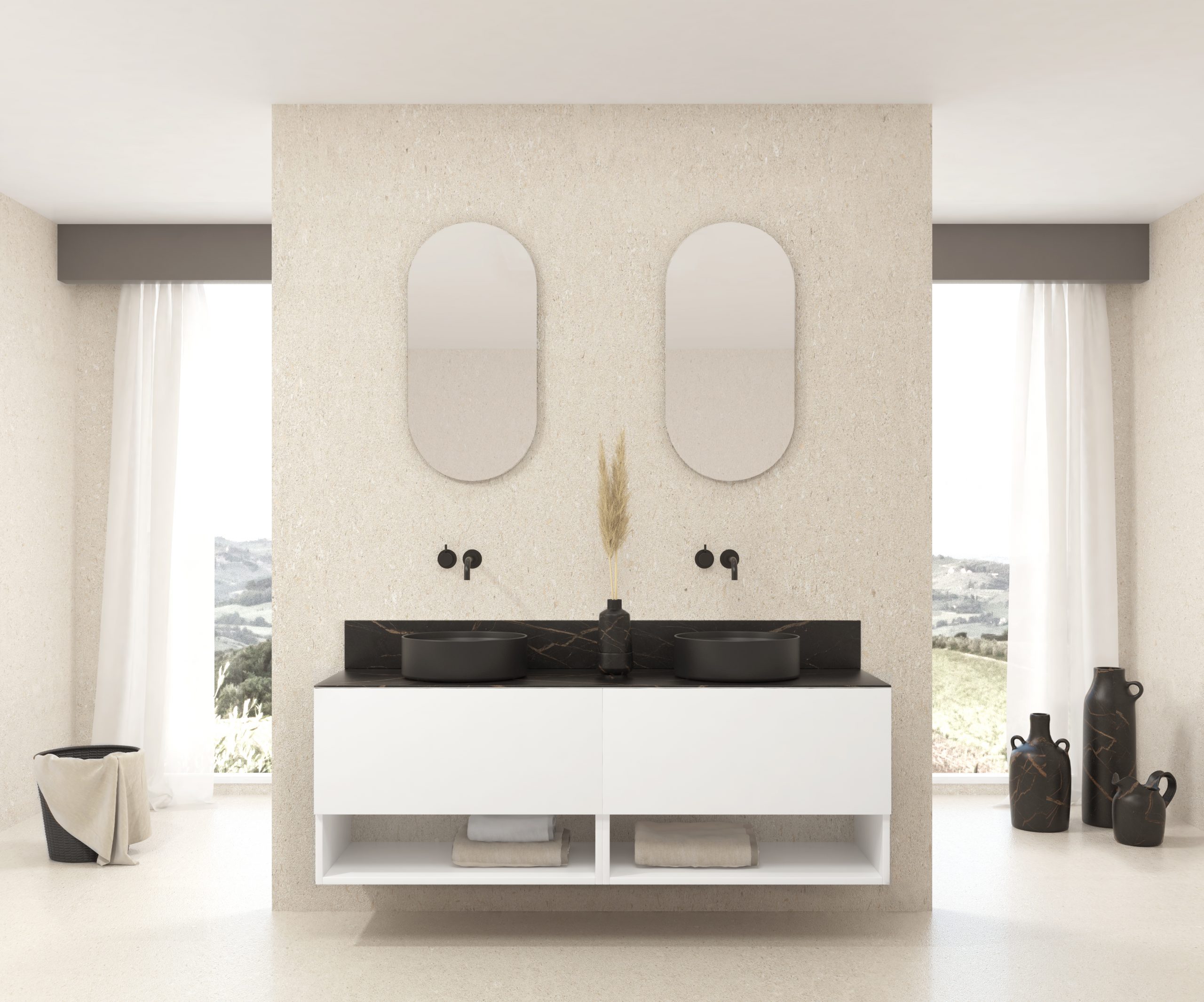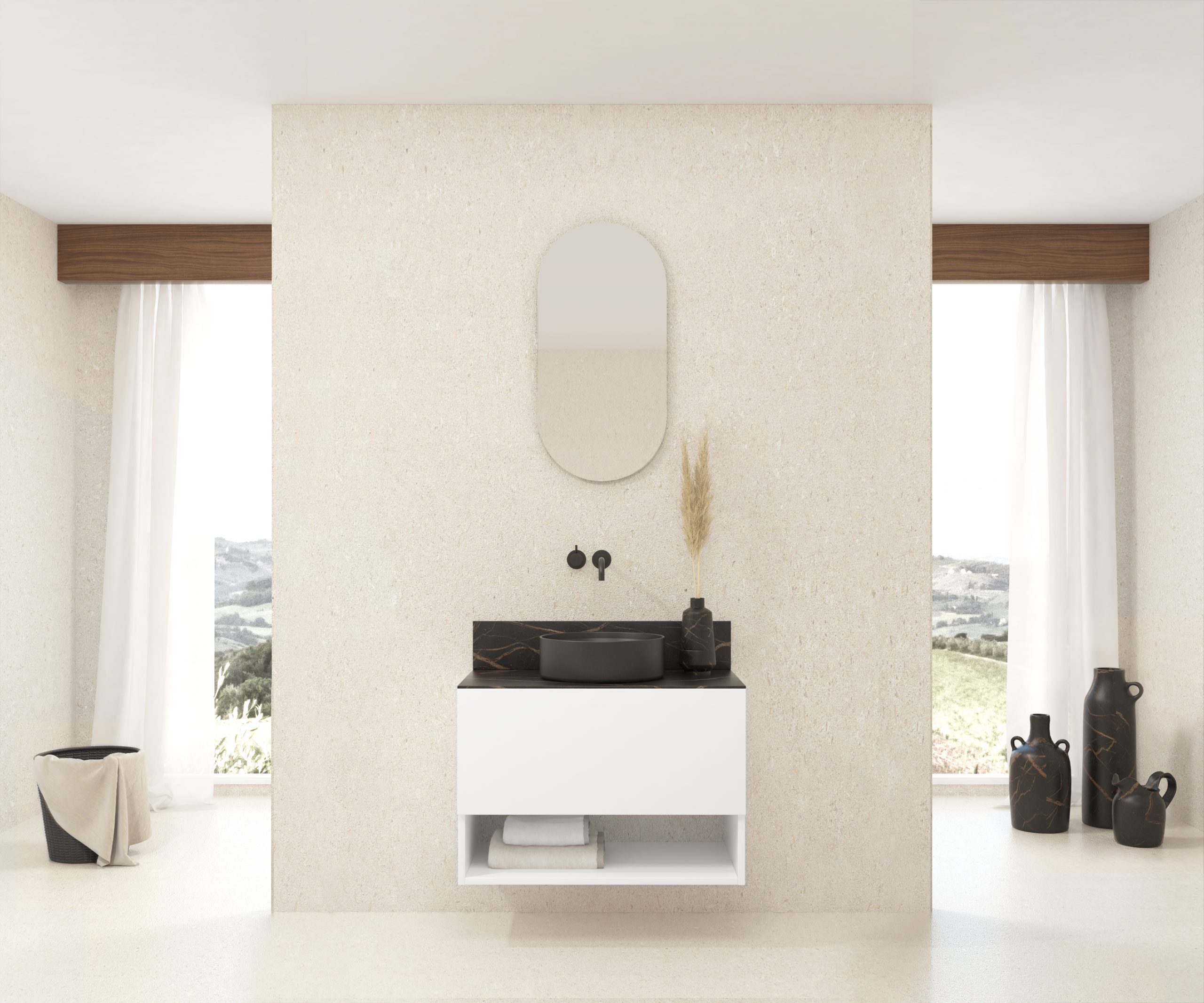 Miroir design capsule inclus. Vasque à poser assortie au plan de travail incluse. Livré monté, prêt à être accroché au mur. Comprend toute la quincaillerie nécessaire. Fabriqué en Espagne. Robinet et siphon non inclus.