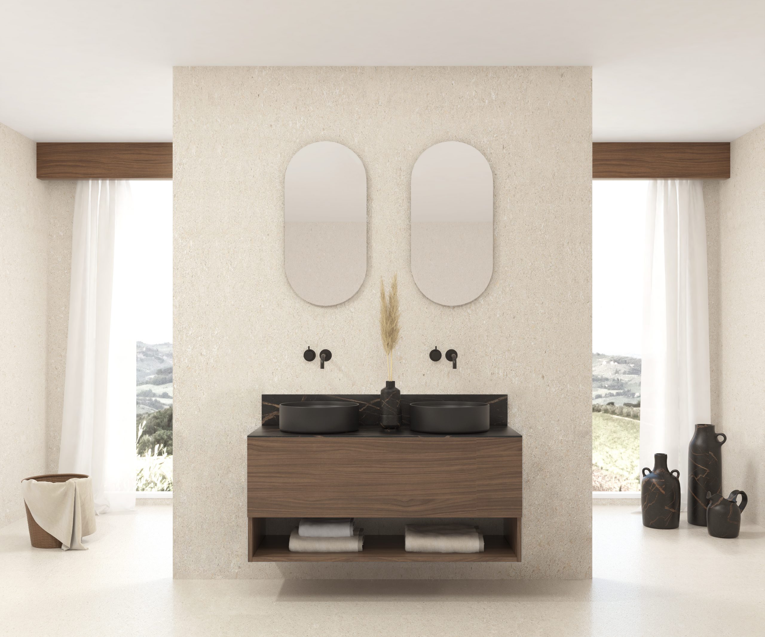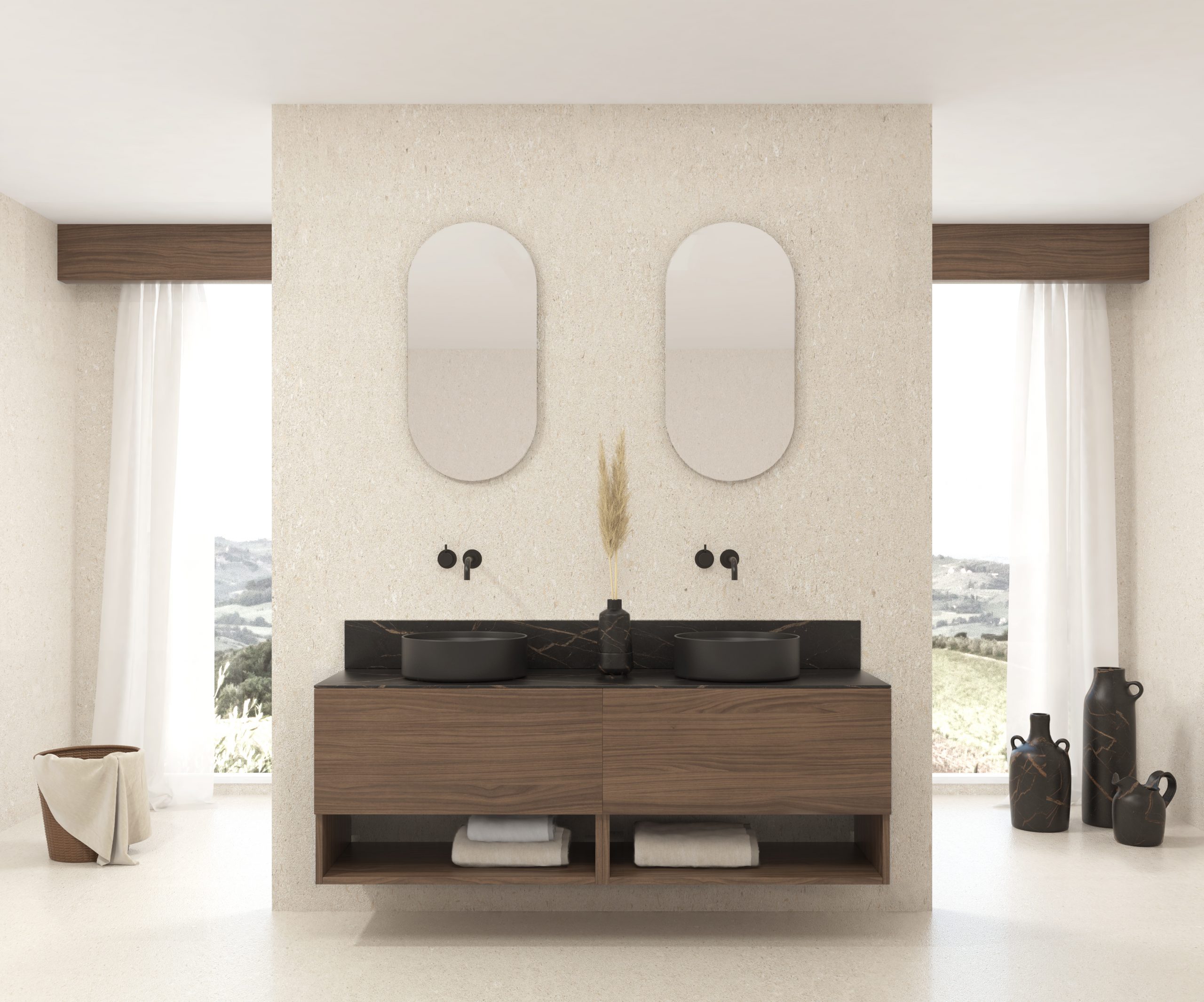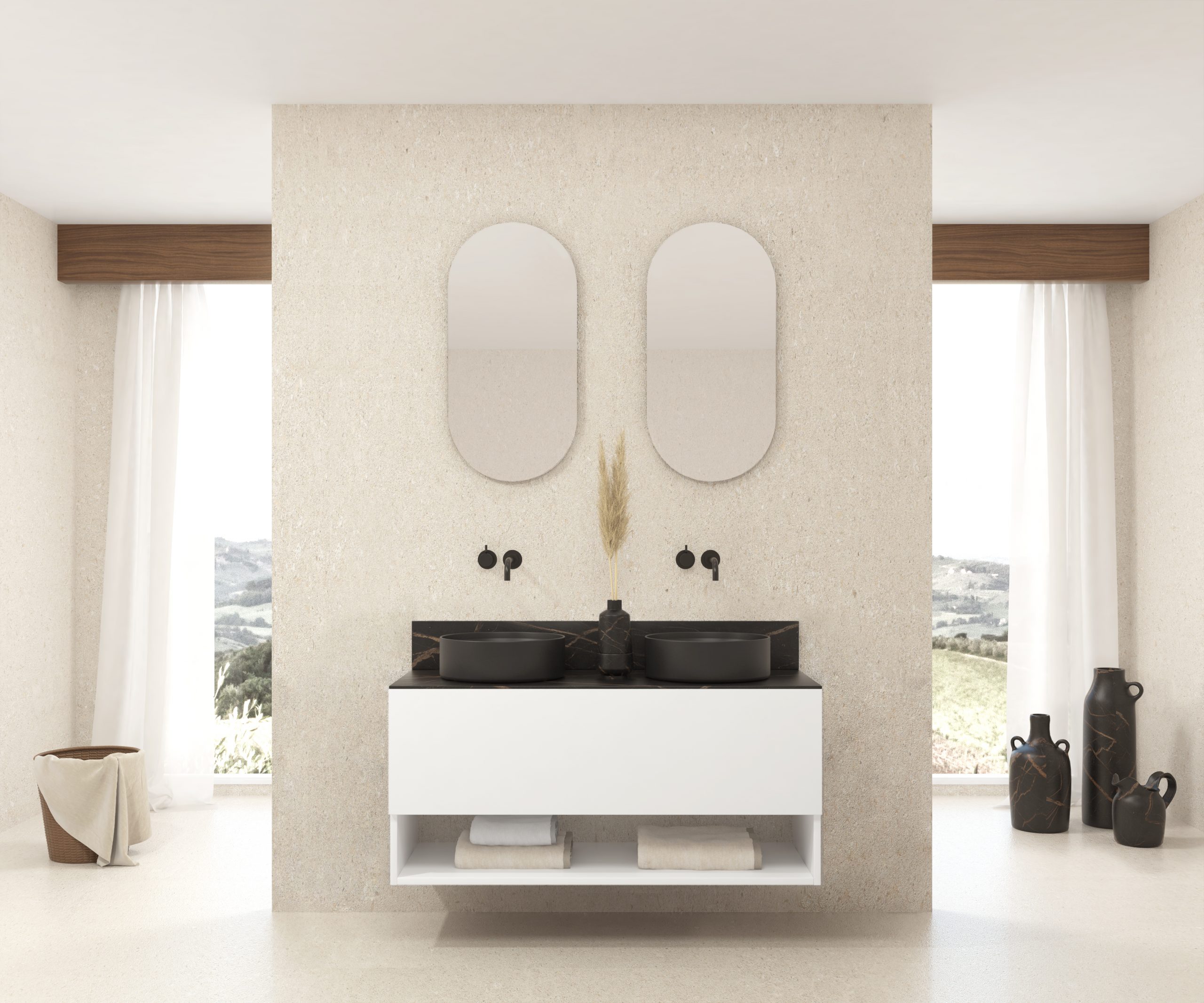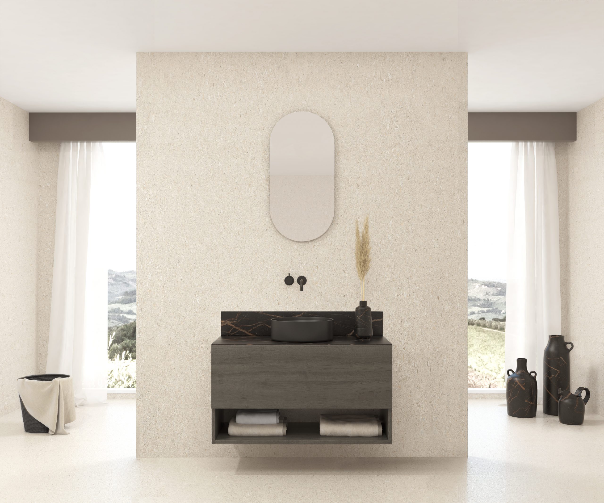Pack composé d’un meuble sous-vasque, d’un plan de travail en matériau Dekton de Cosentino, d’une vasque et d’un miroir capsule.