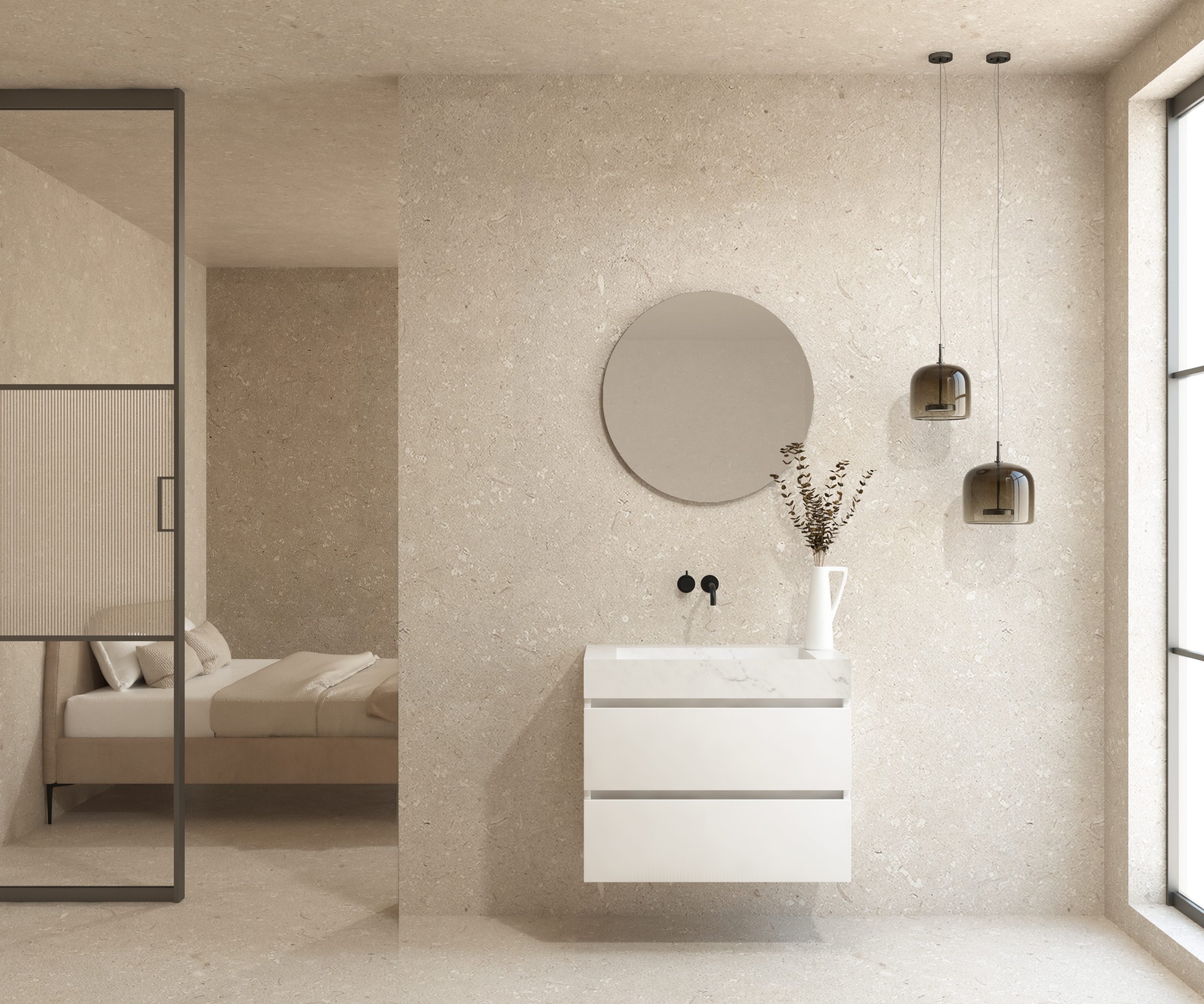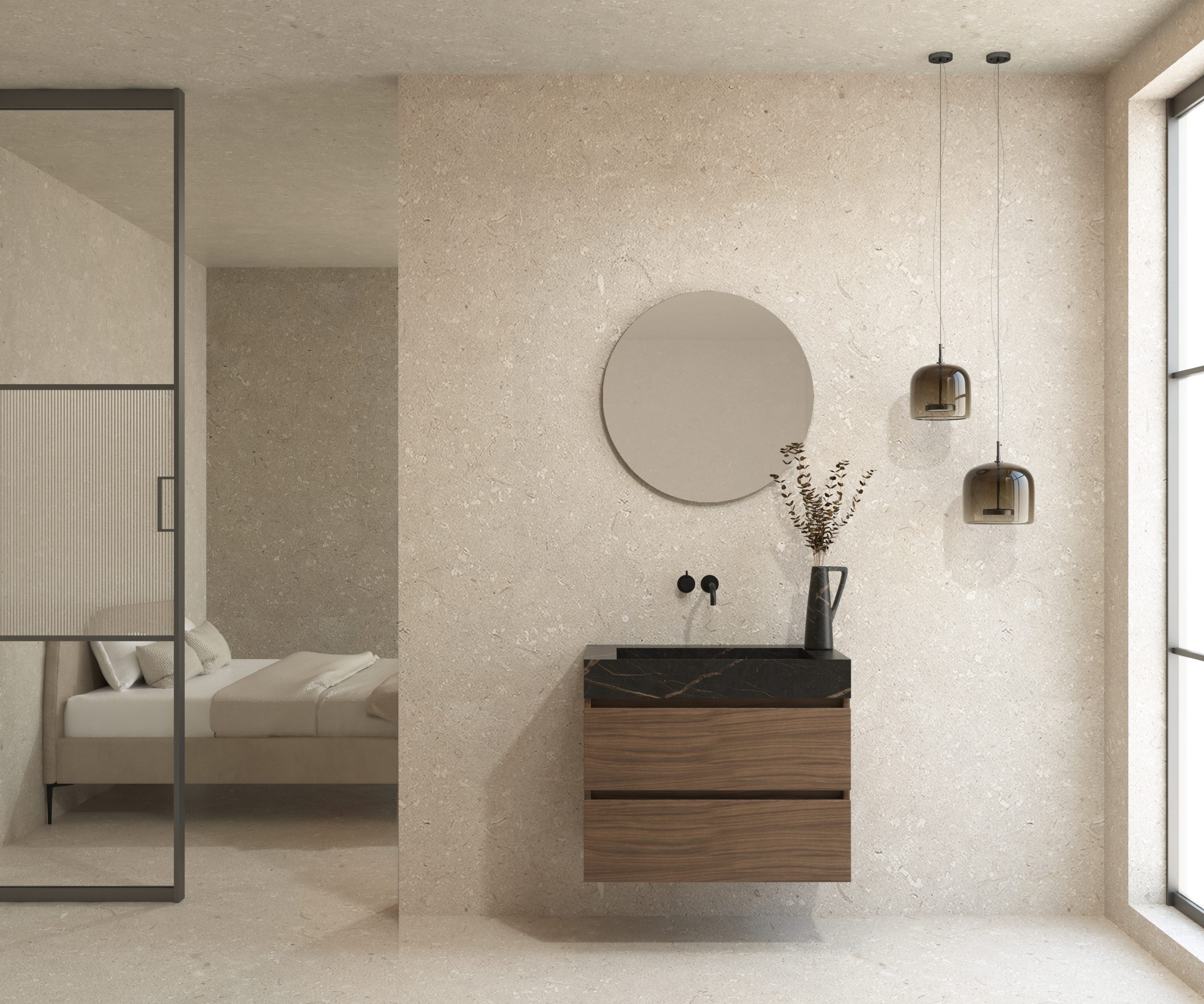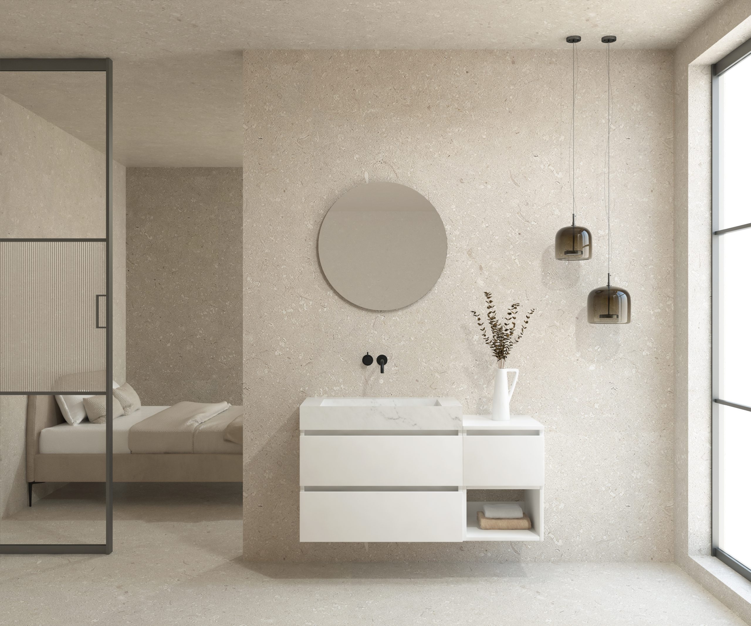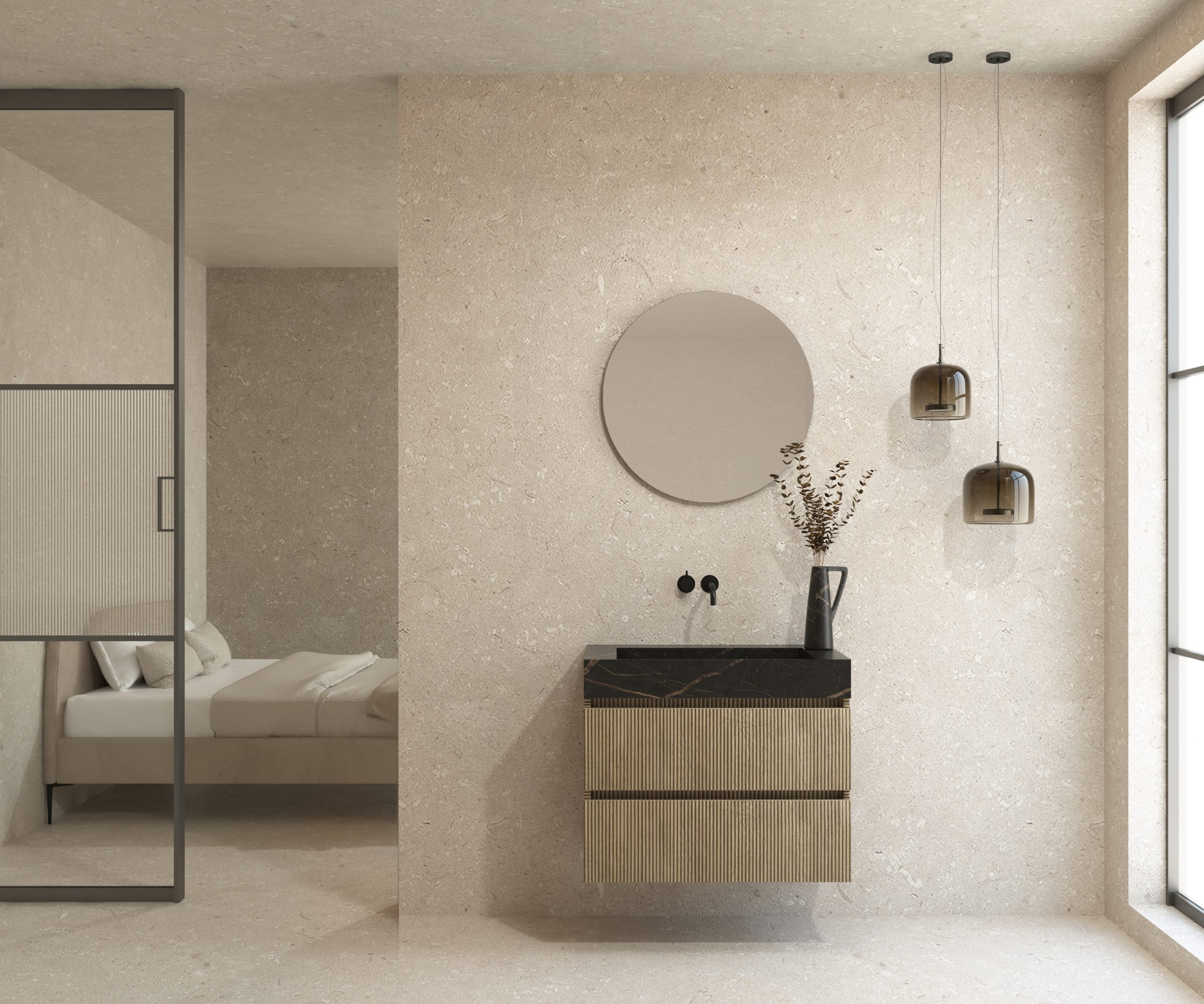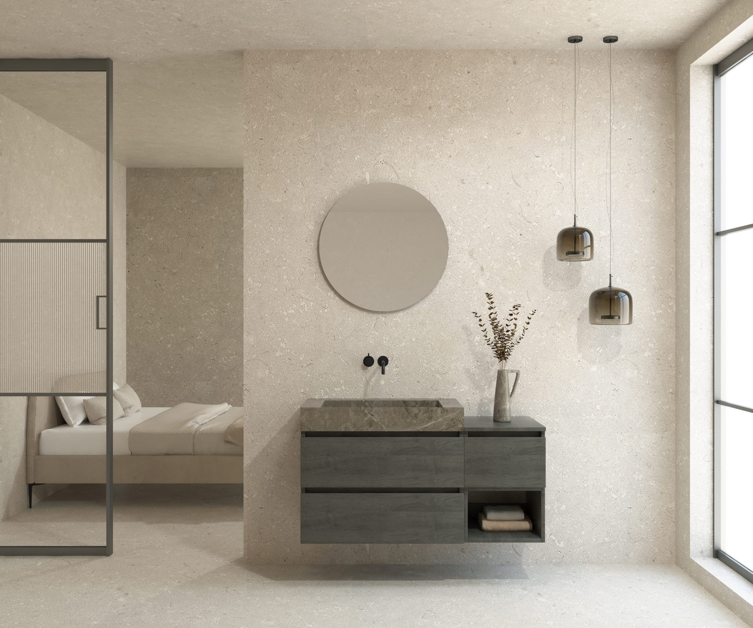 Pack composé d’un lavabo suspendu en matériau Dekton de Cosentino, d’un meuble et d’un miroir circulaire.