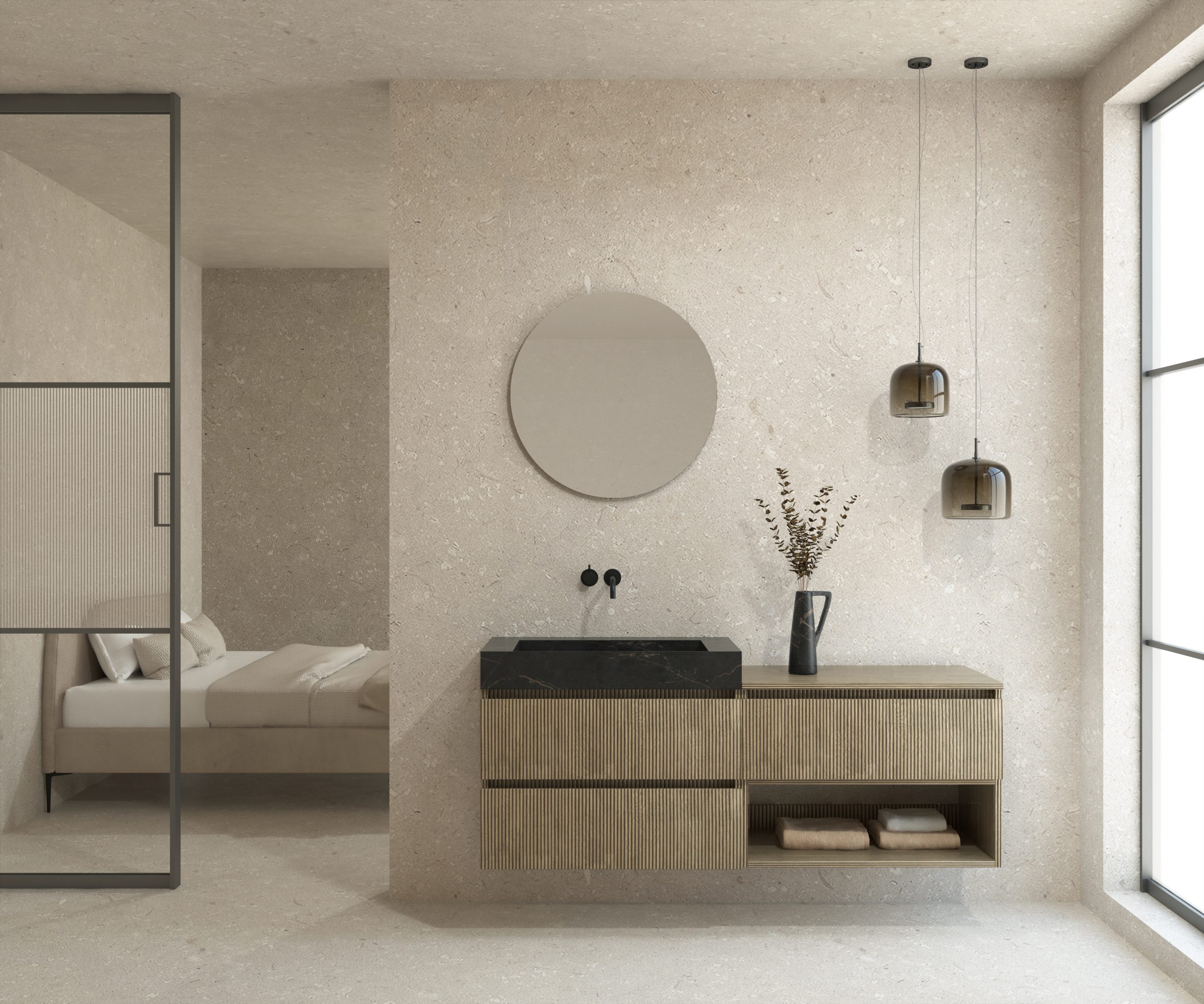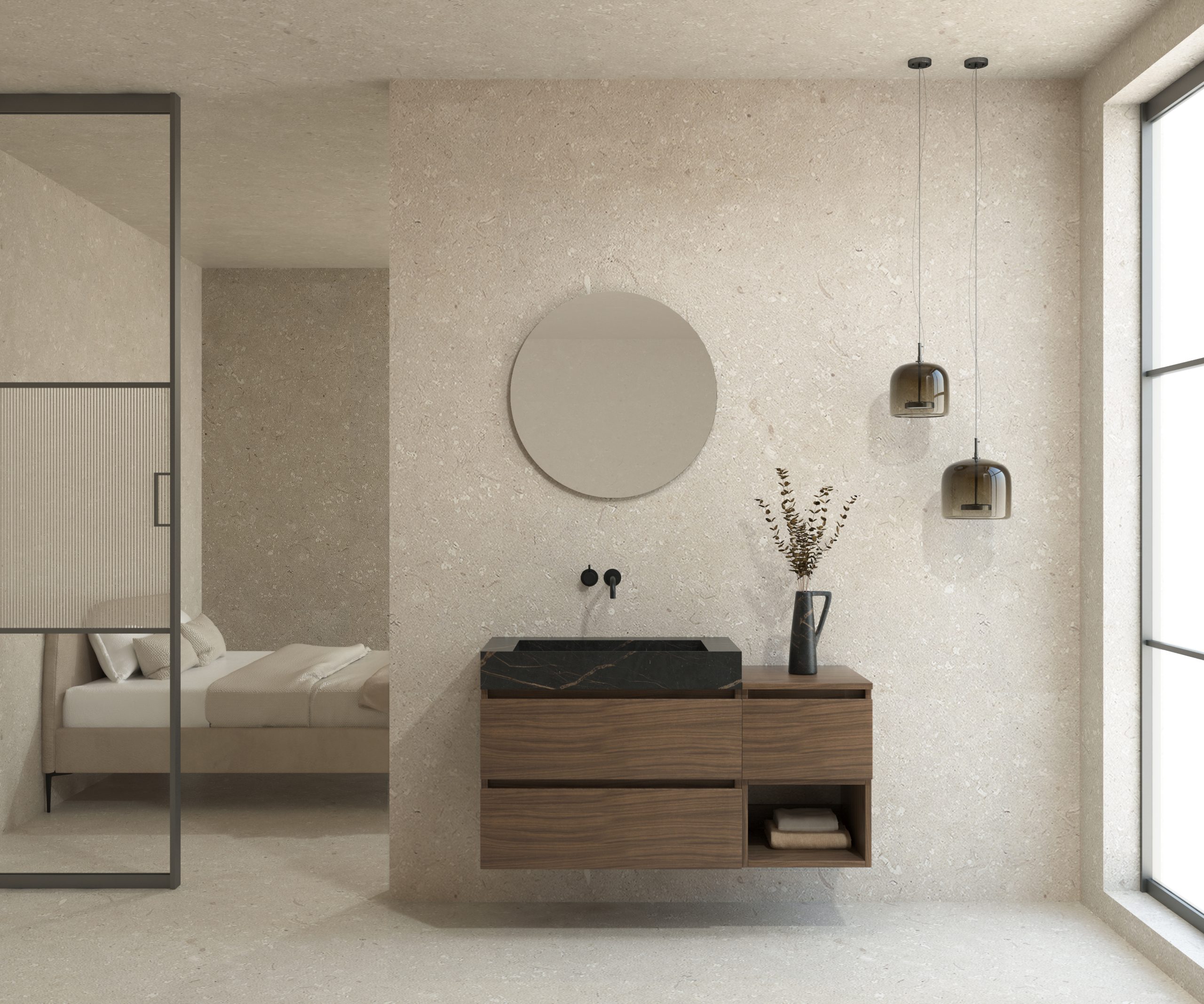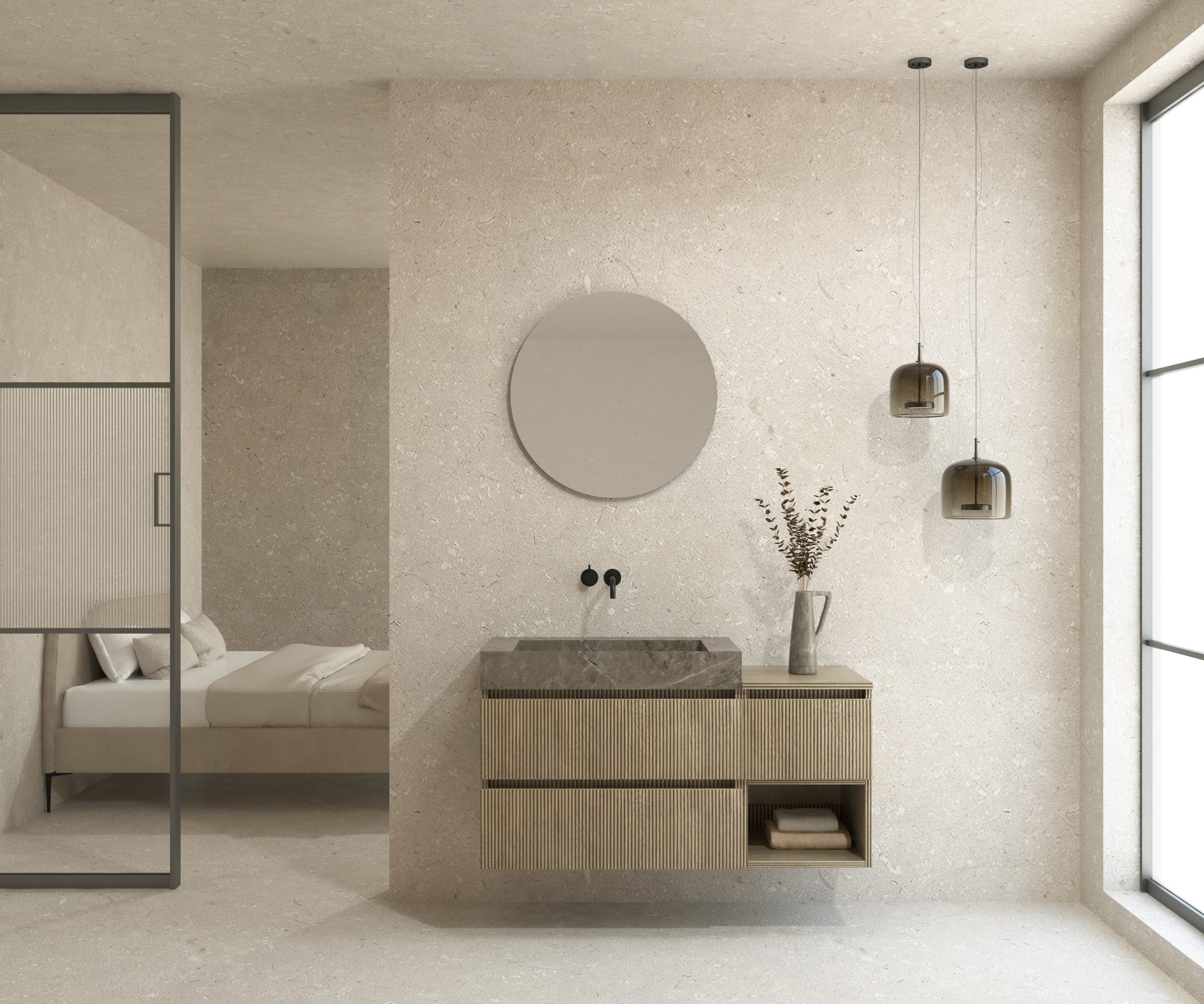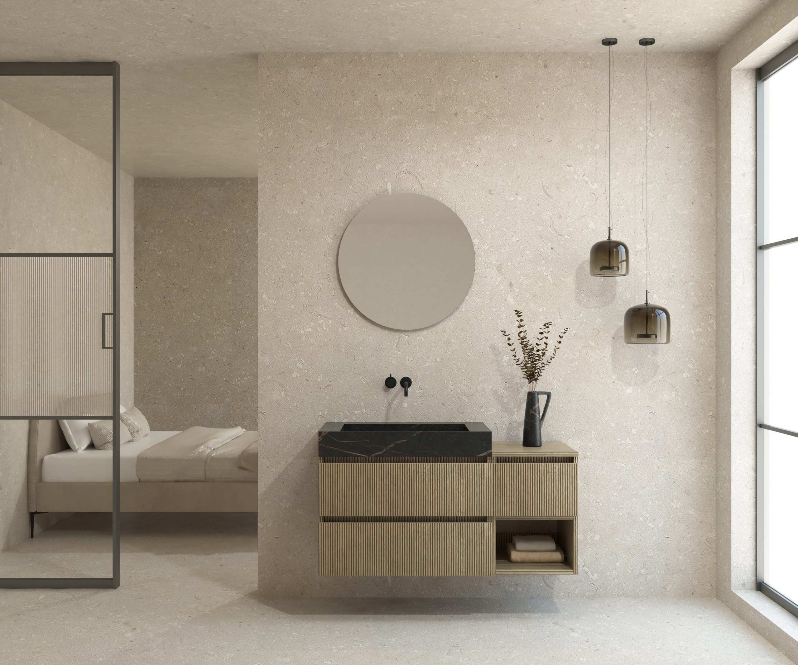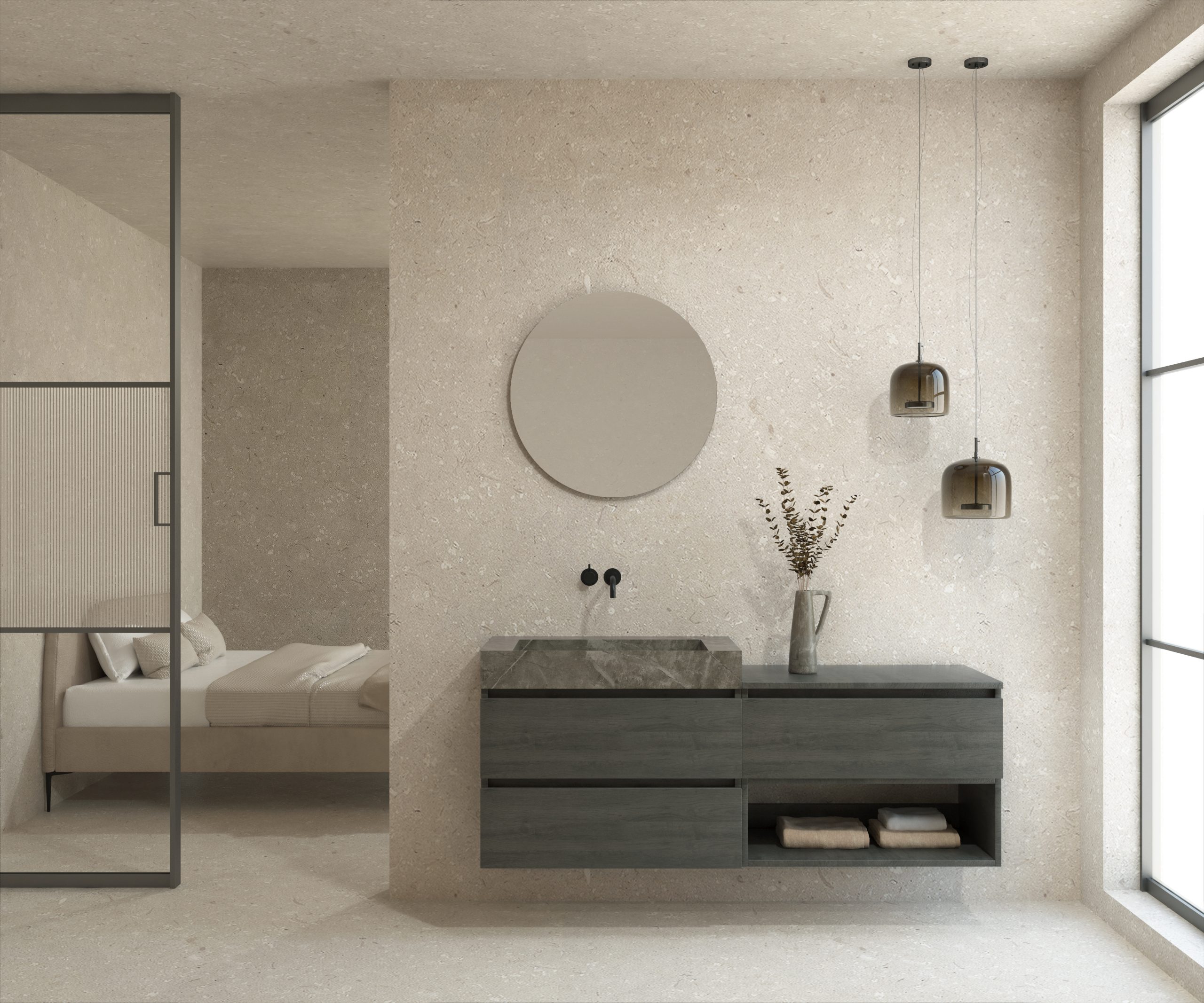 Pack composé d’un lavabo suspendu en matériau Dekton de Cosentino, d’un meuble et d’un miroir circulaire.