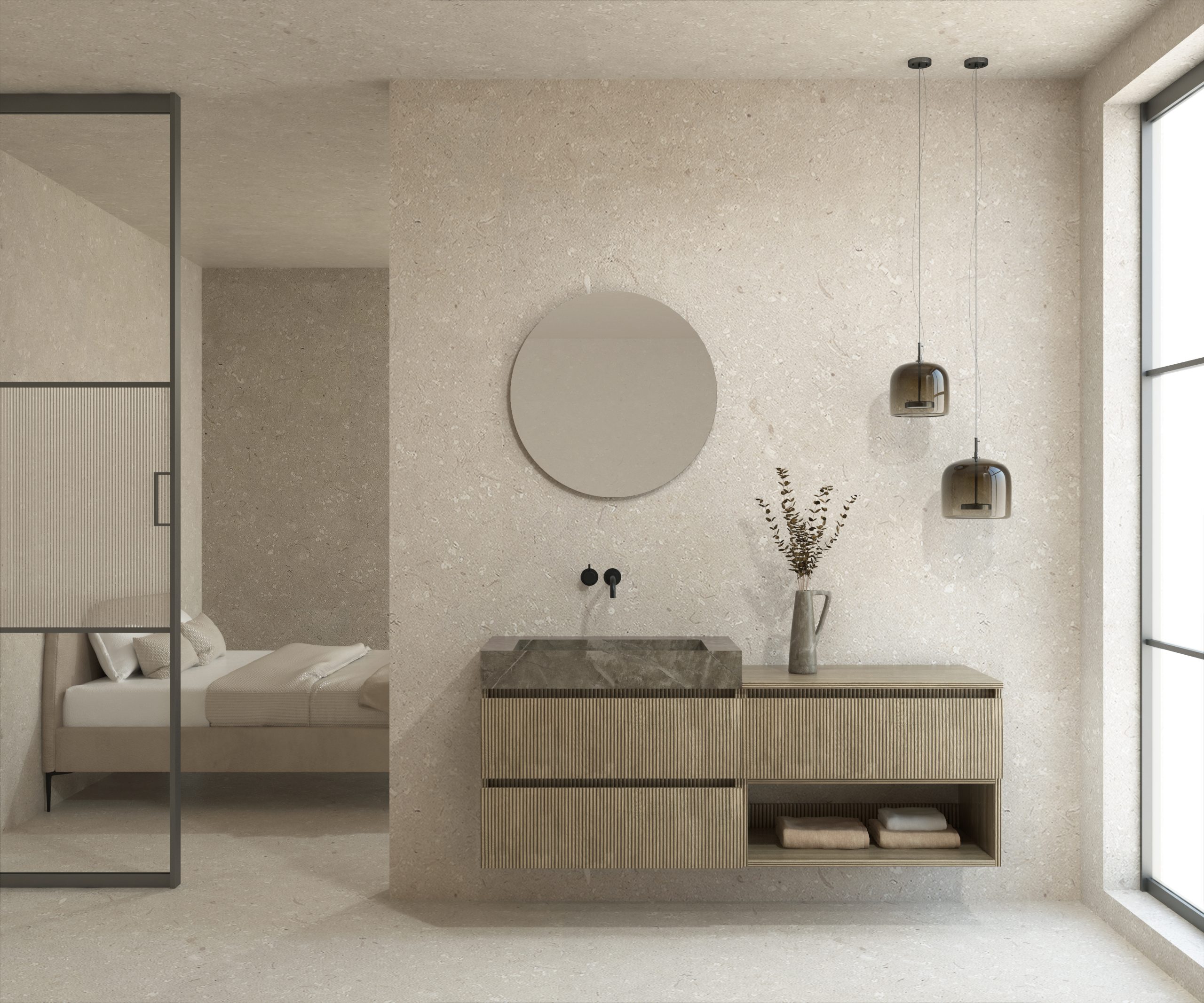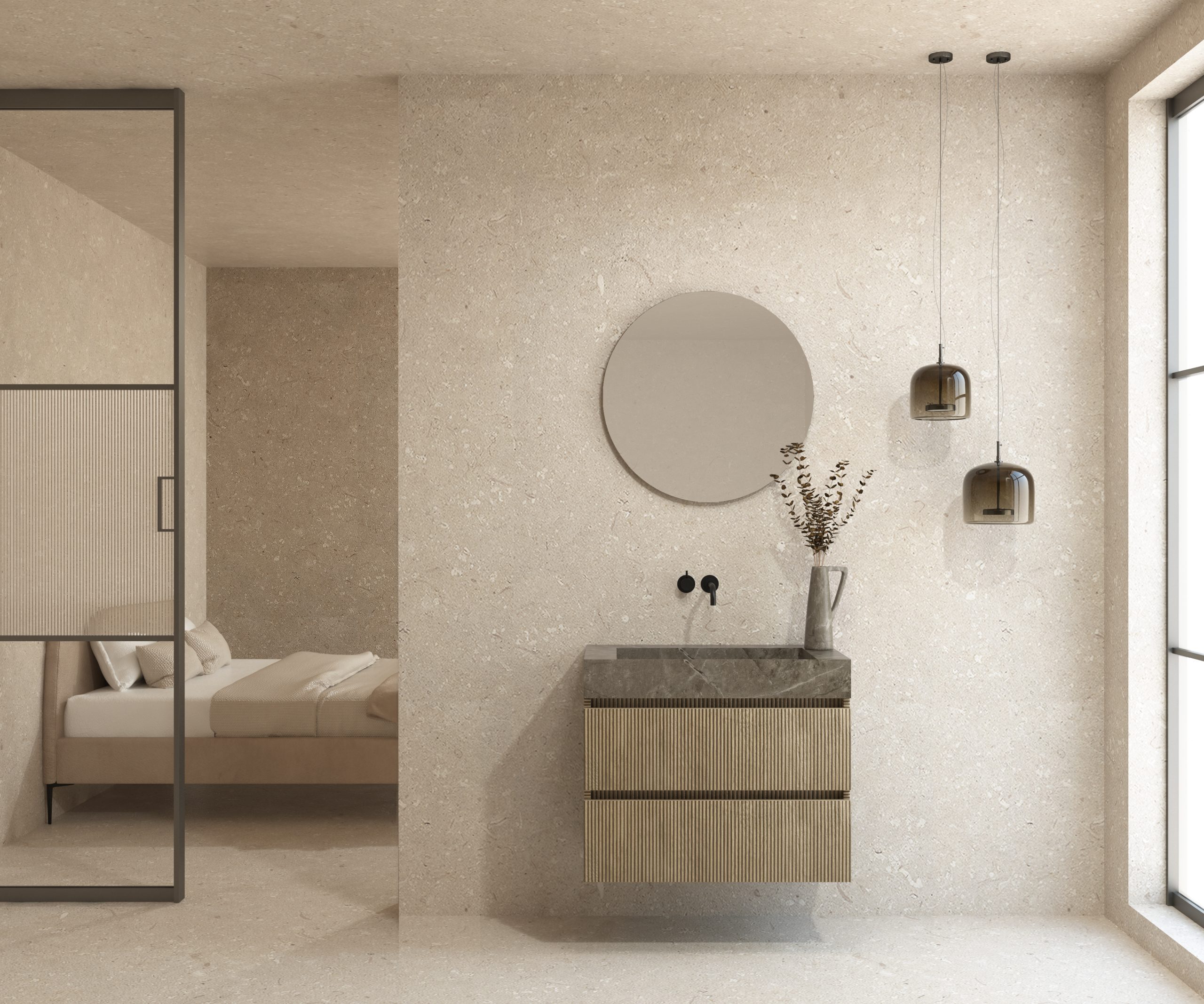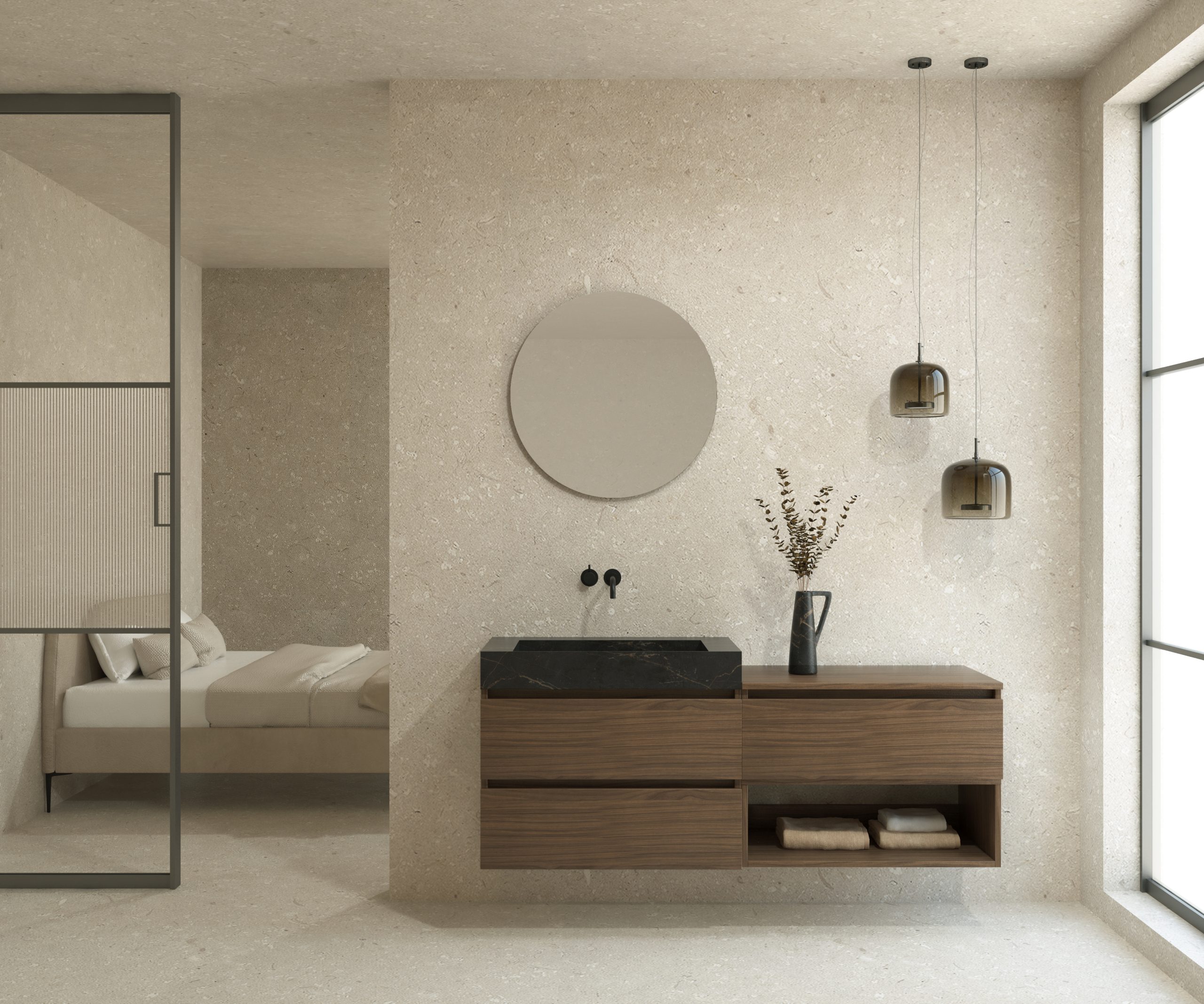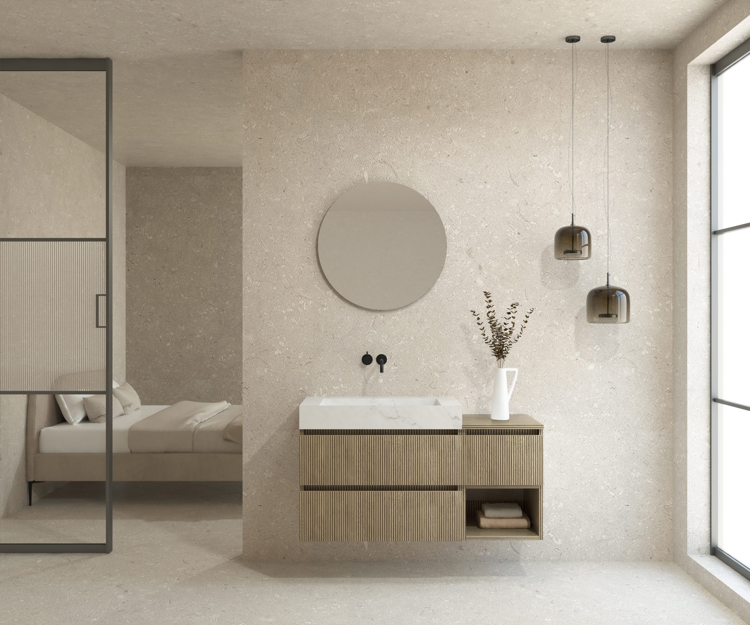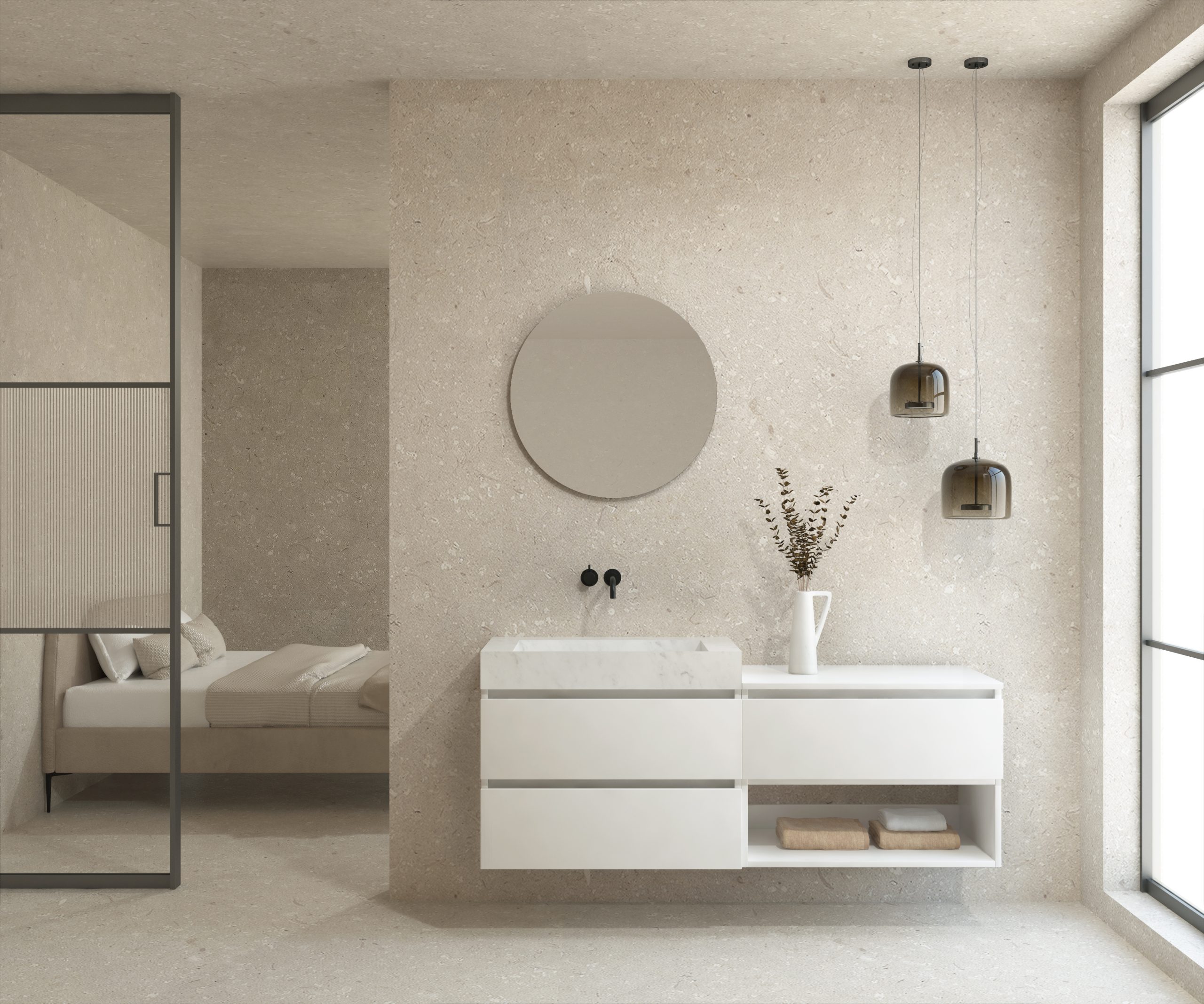 Pack composé d’un lavabo suspendu en matériau Dekton de Cosentino, d’un meuble et d’un miroir circulaire.