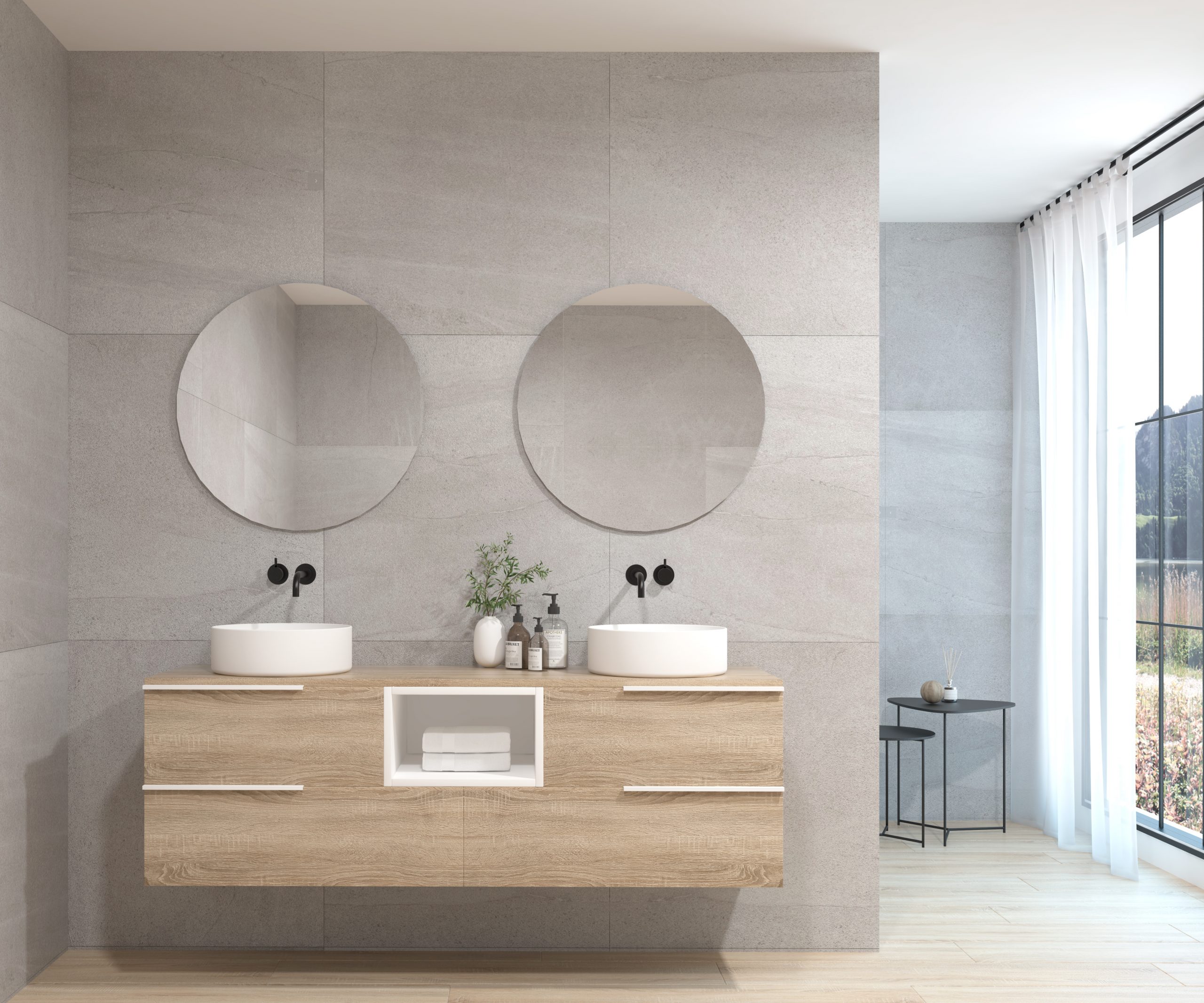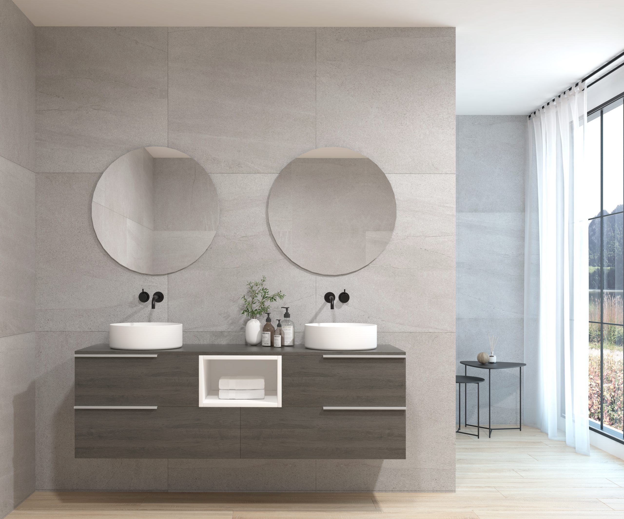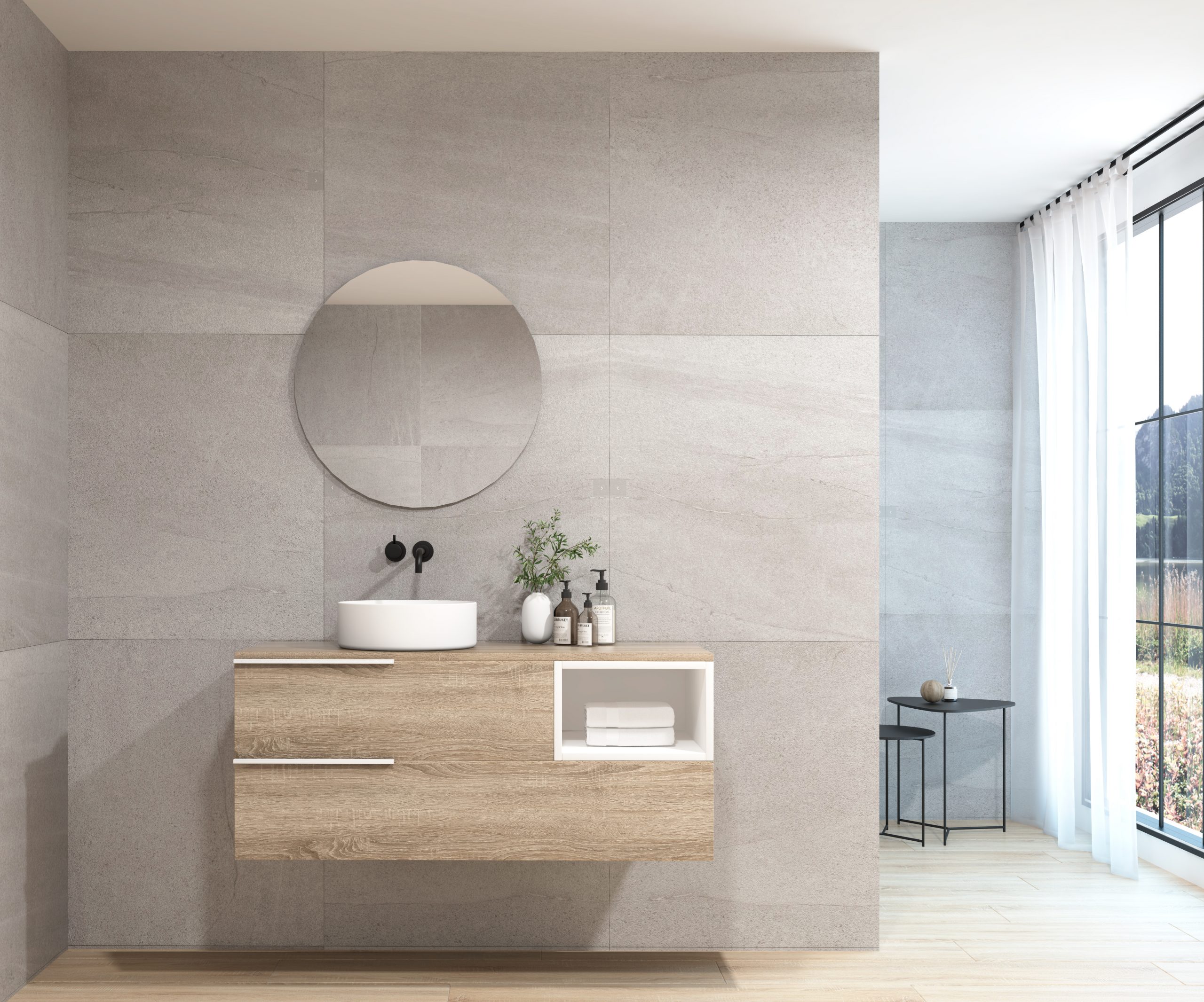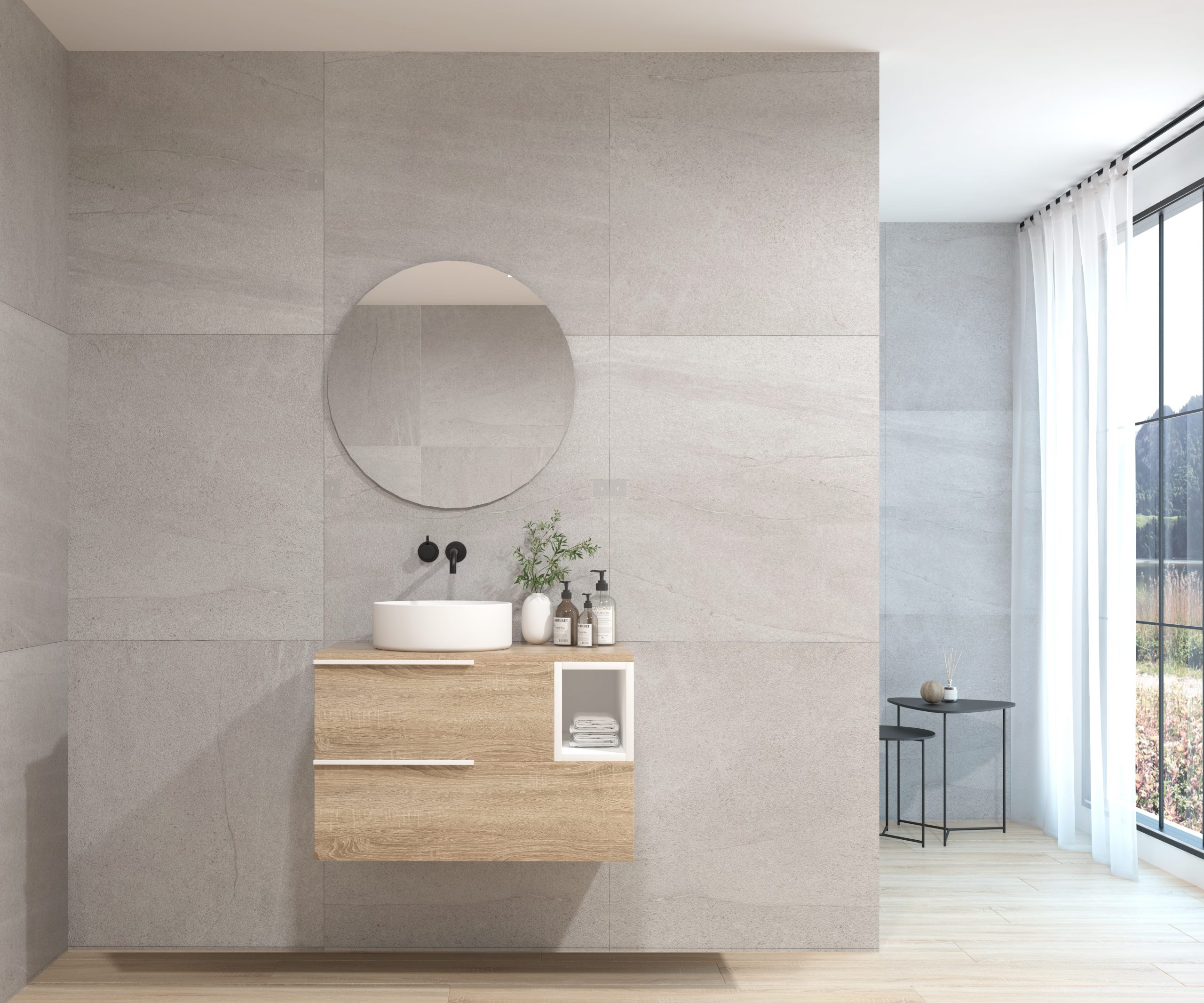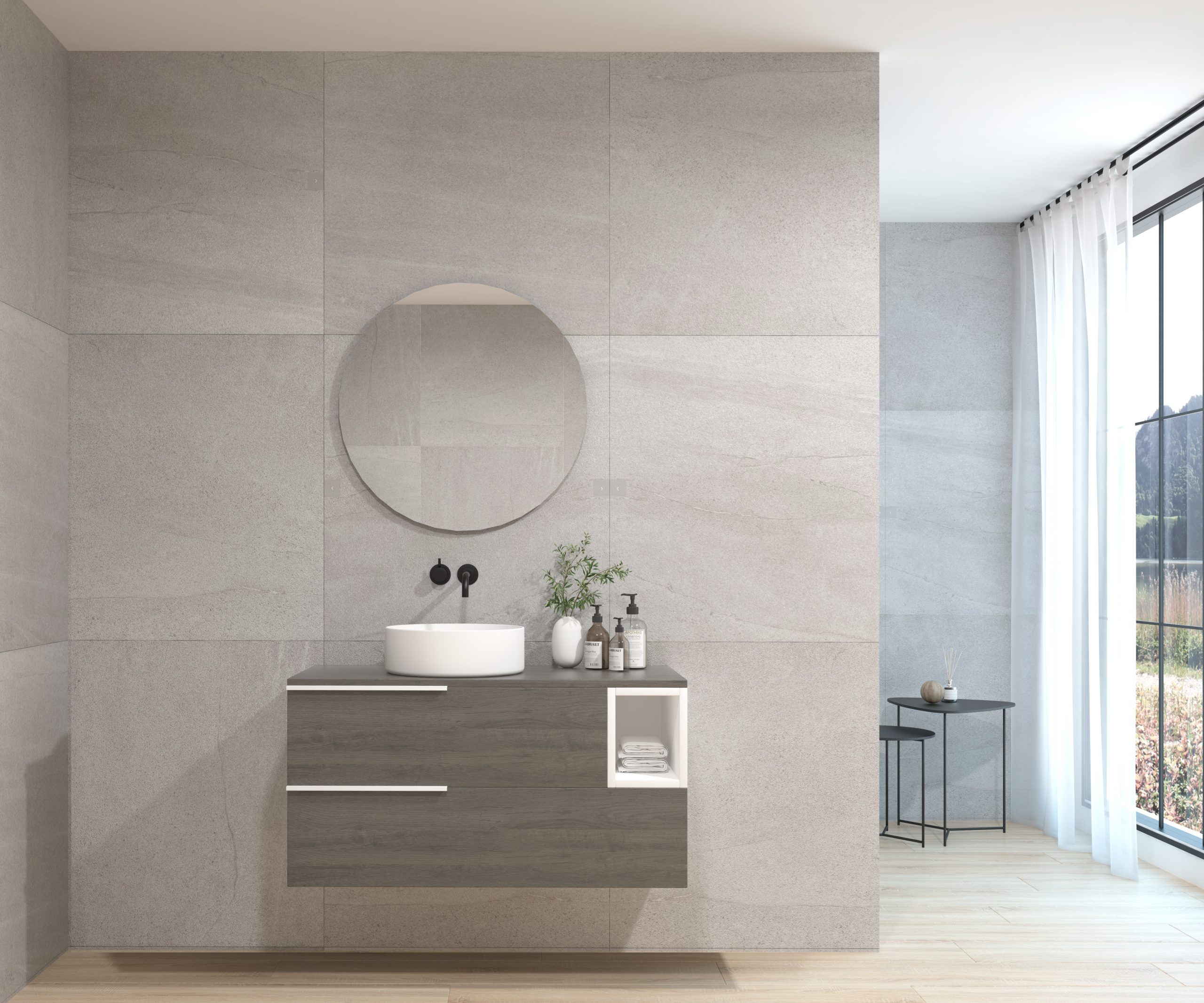 Ensemble composé d’un meuble sous-vasque suspendu, d’une vasque et d’un miroir au design circulaire.