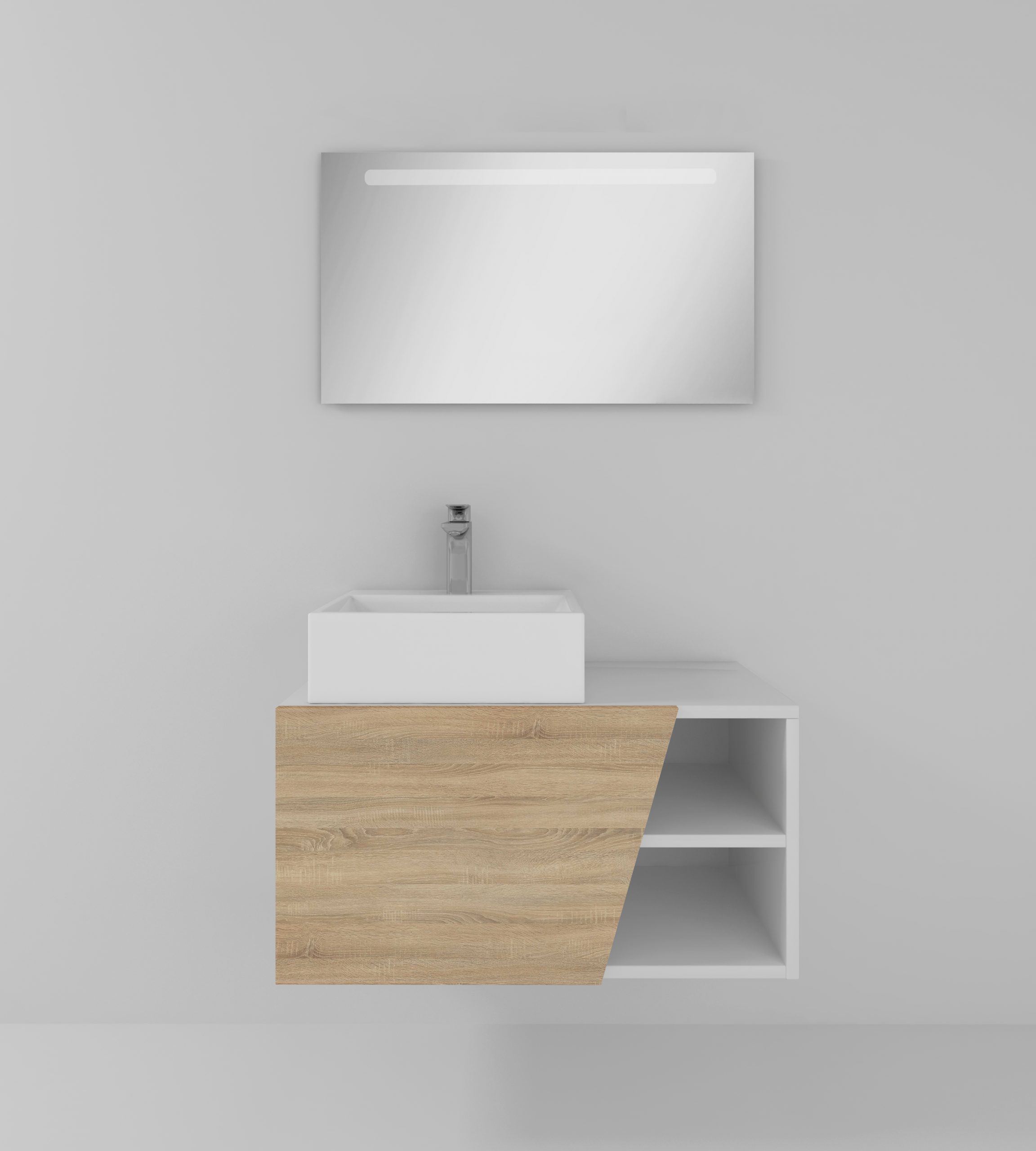 Pack formado por mueble de baño de 80 cm realizado en material laminado hidrófugo y puerta laminada acabado madera. Está formado por una puerta con cierre softclosing y estante decorativo. Incluye lavabo sobreencimera cerámico de color blanco y espejo con iluminación LED de 80x50cm. Made in Spain.