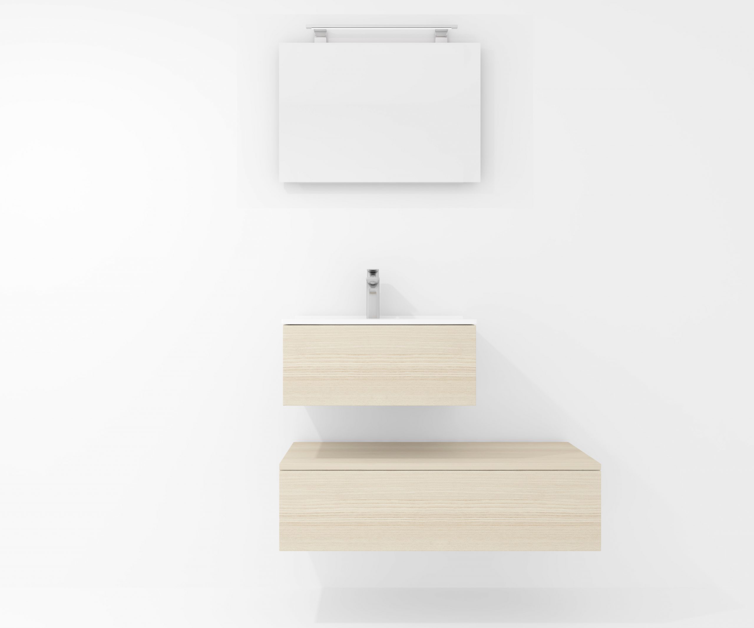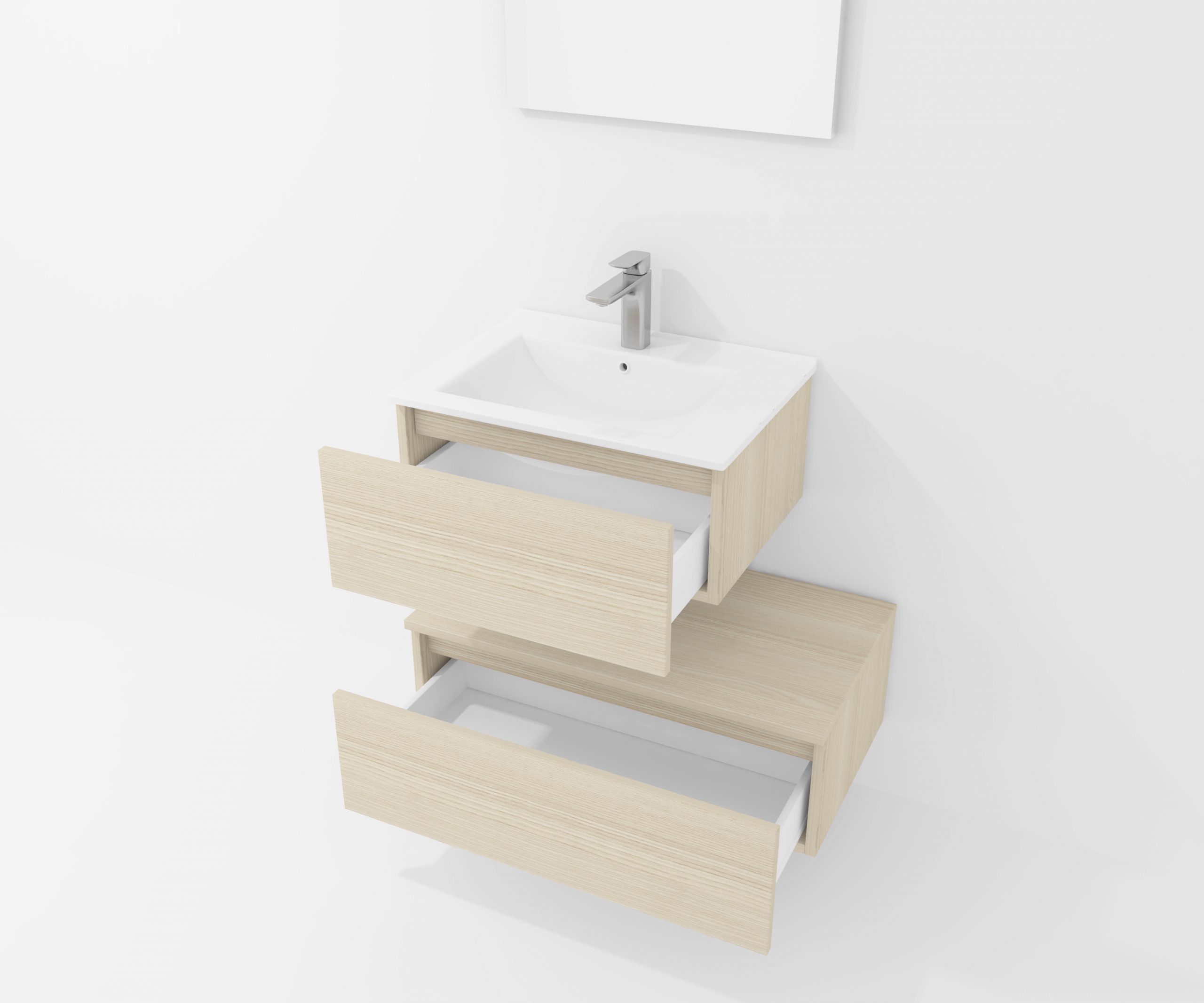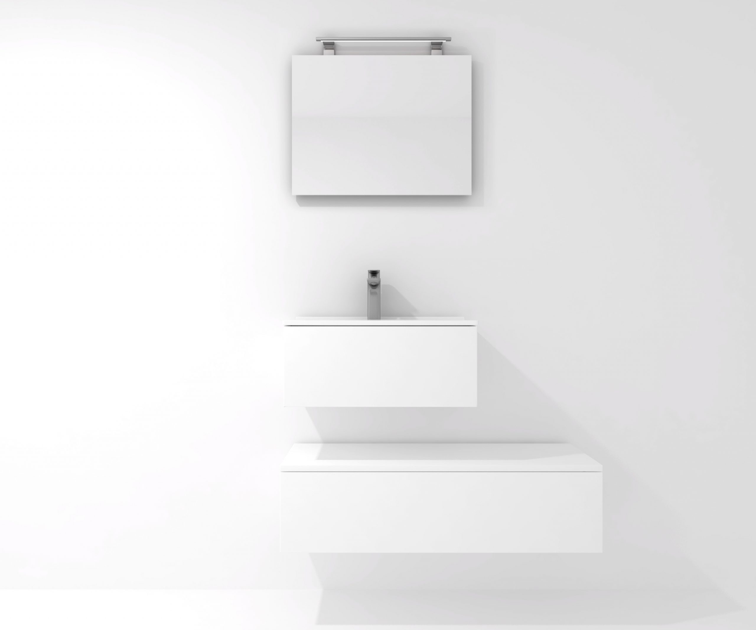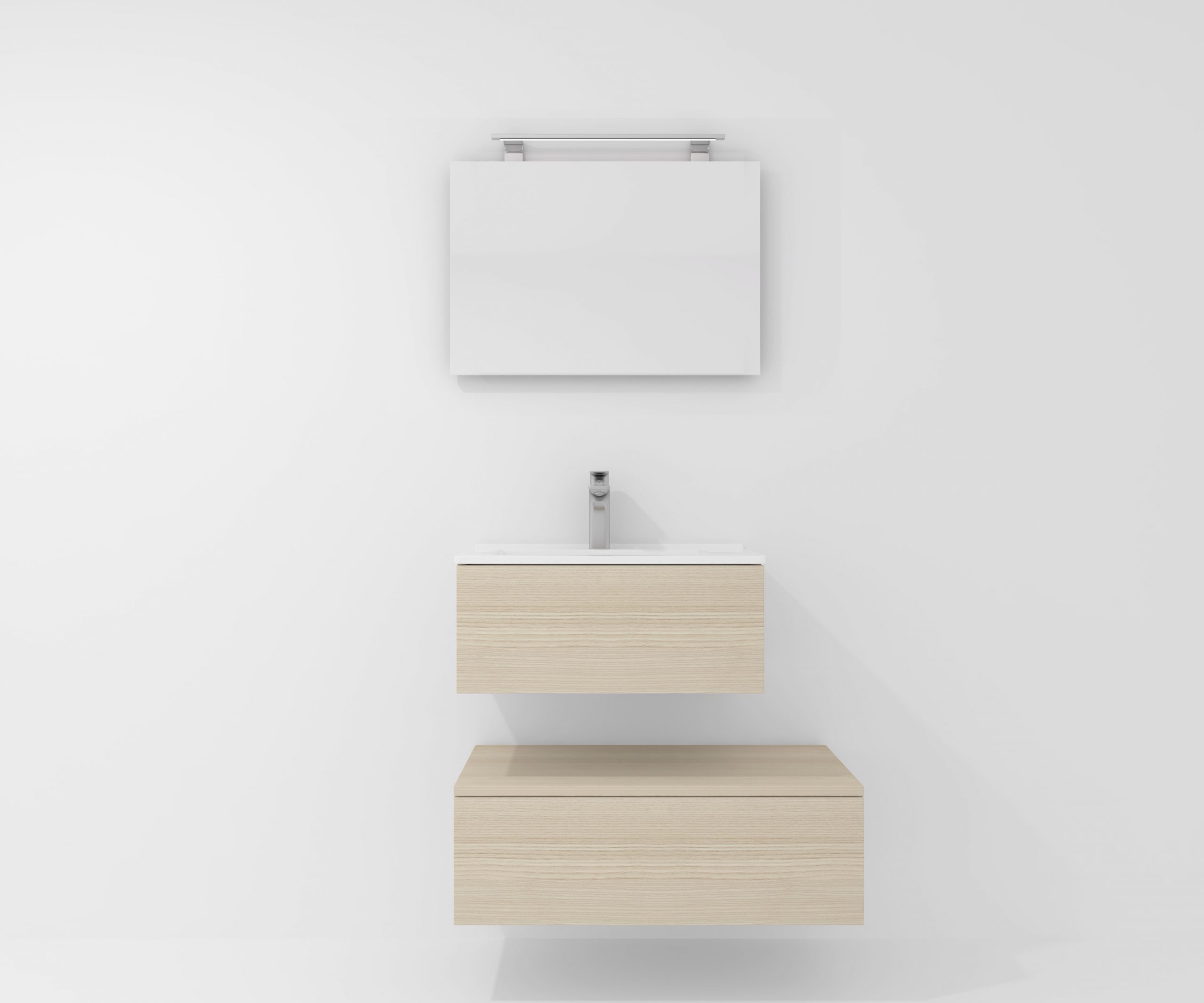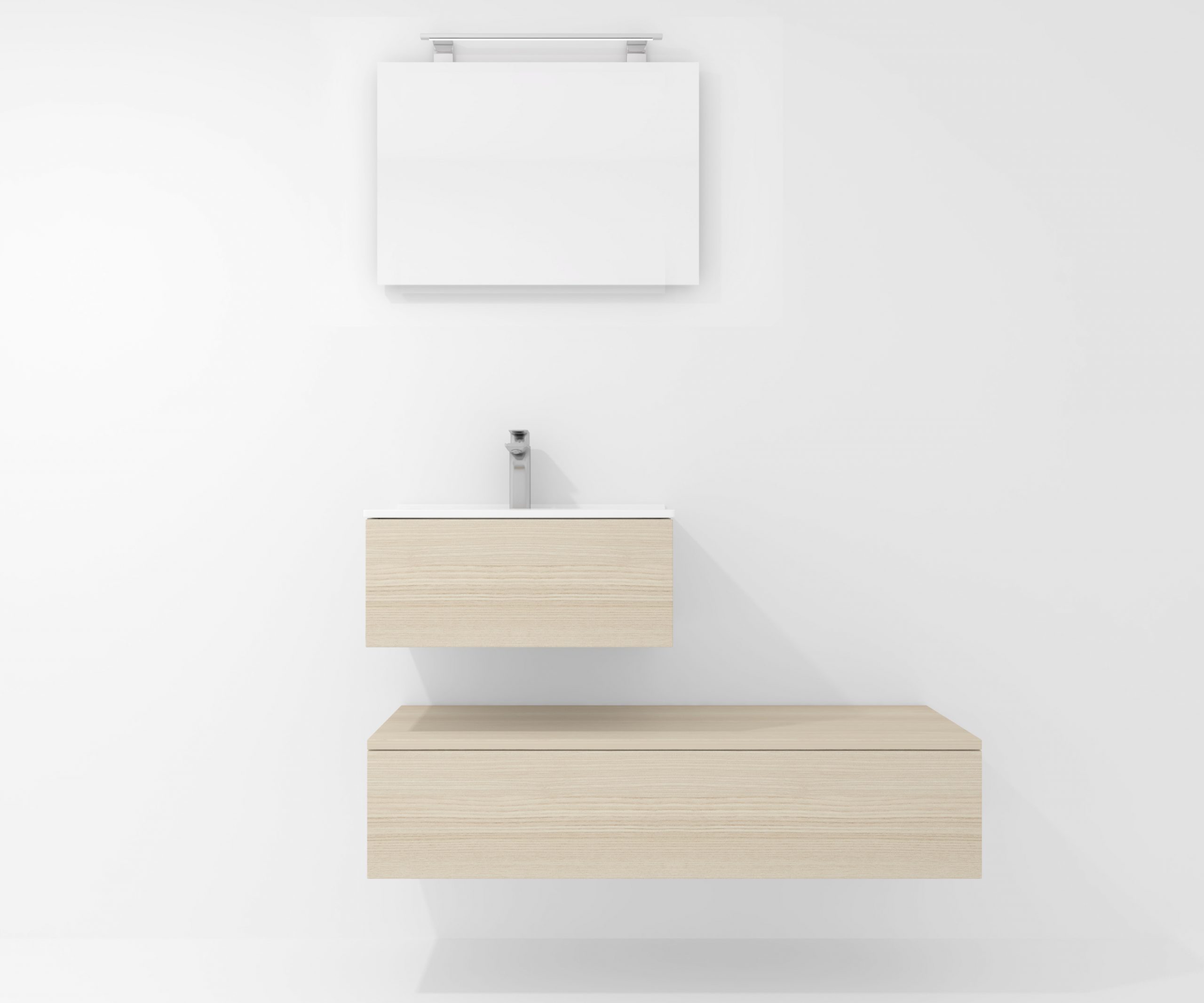 Pack compuesto por dos muebles de baño suspendidos, lavabo y espejo iluminado. Muebles fabricados en tablero de partículas laminado de 19mm, con cajones de extracción total y cierre suave. Cantos realizados en PVC de 1 mm. Lavabo sobreencimera de cerámica blanco brillo, espejo liso con foco iluminación LED y temperatura de color de 6000 K LED incluidos. Fabricado en España. Grifo no incluido.