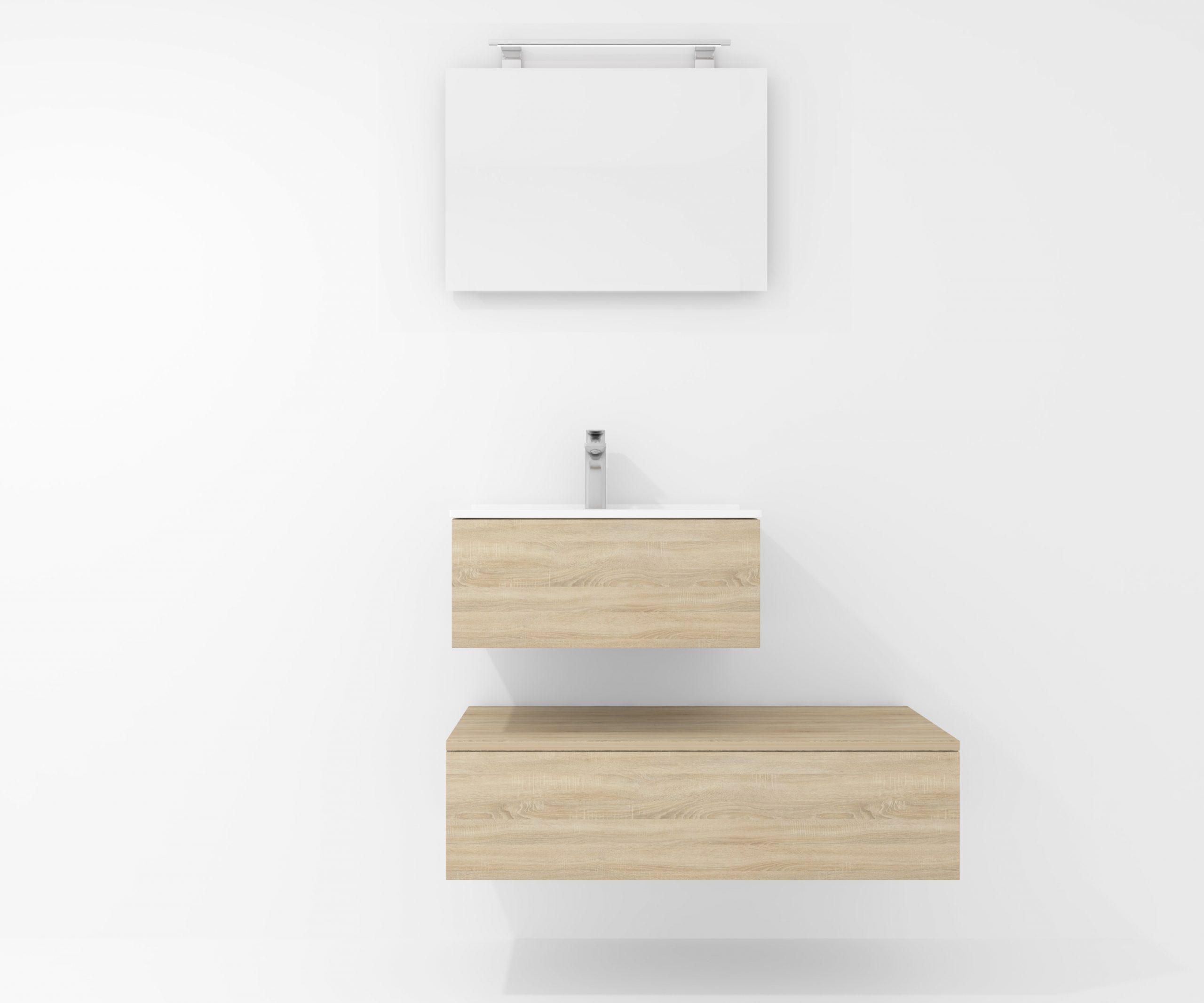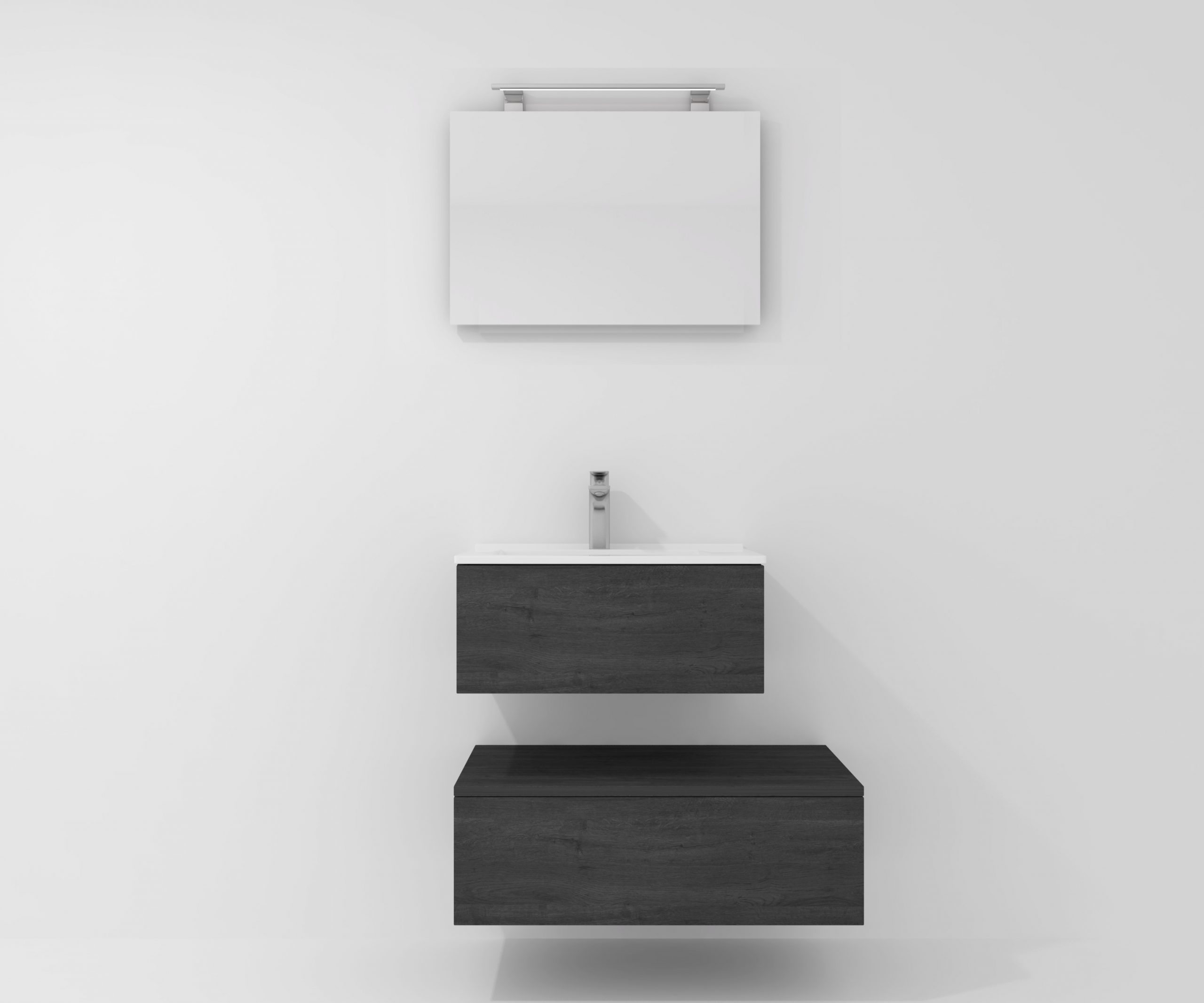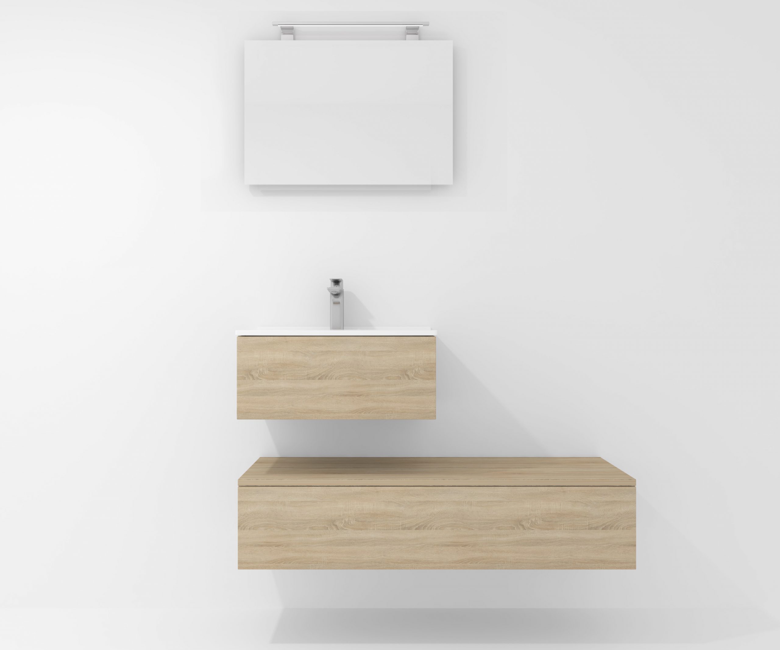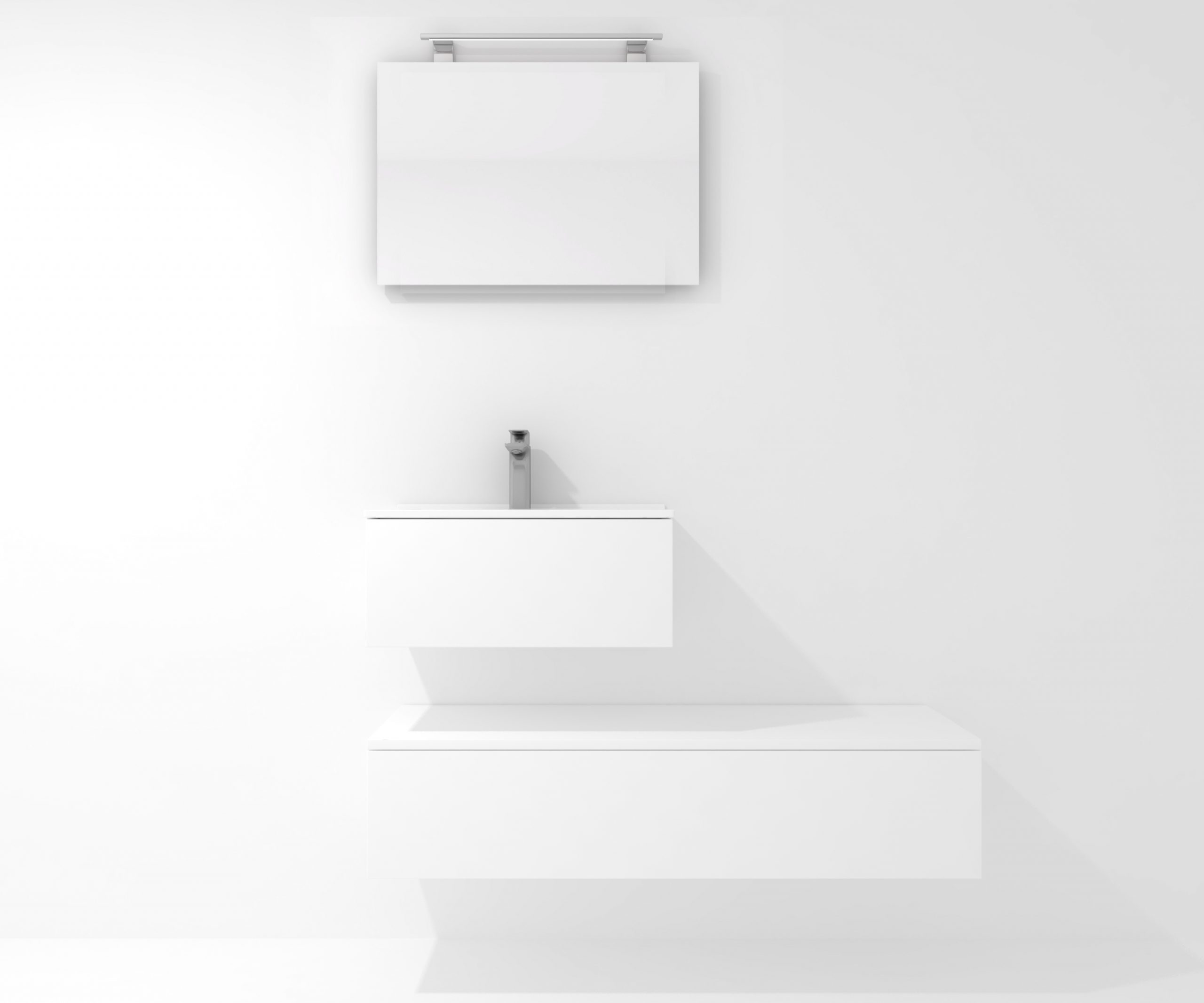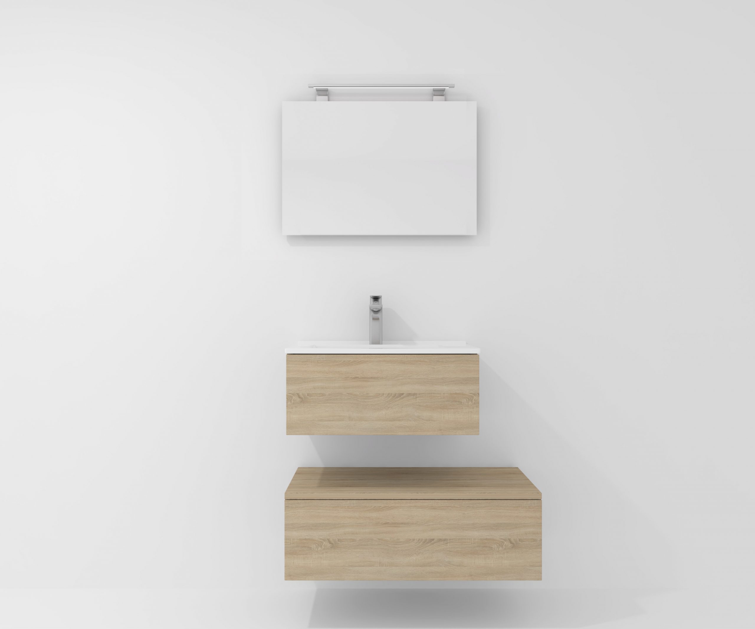 Pack compuesto por dos muebles de baño suspendidos, lavabo y espejo iluminado. Muebles fabricados en tablero de partículas laminado de 19mm, con cajones de extracción total y cierre suave. Cantos realizados en PVC de 1 mm. Lavabo sobreencimera de cerámica blanco brillo, espejo liso con foco iluminación LED y temperatura de color de 6000 K LED incluidos. Fabricado en España. Grifo no incluido.