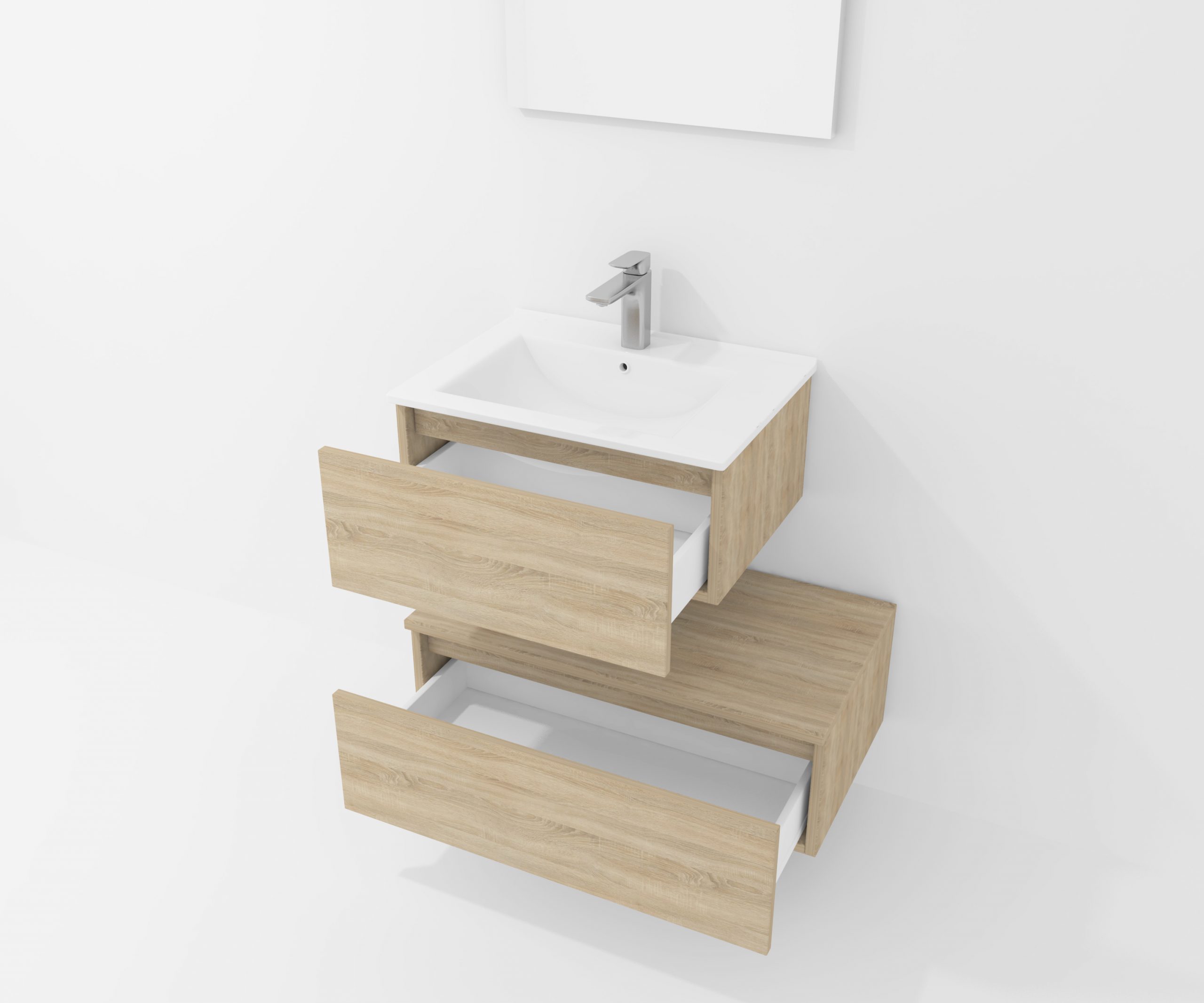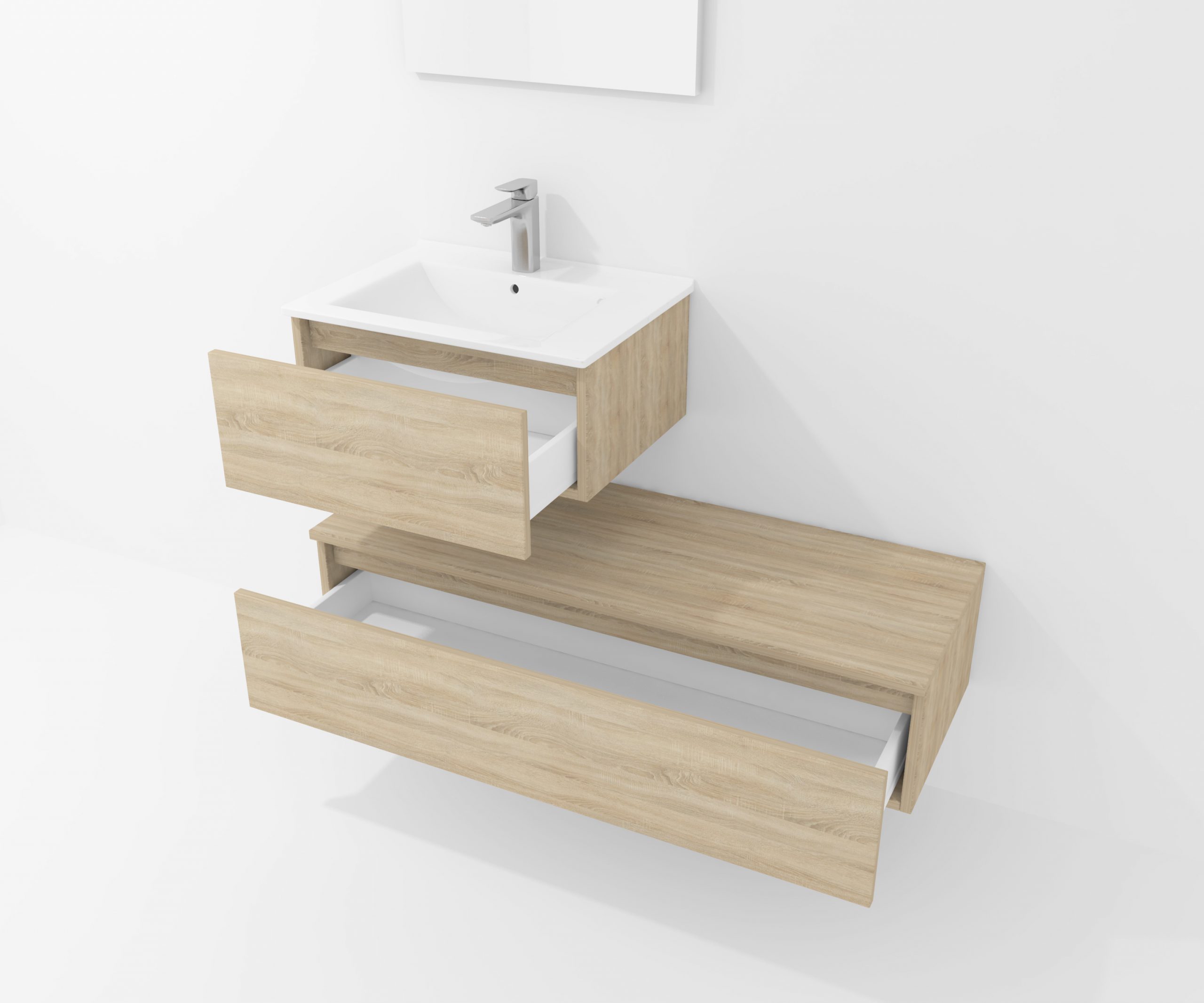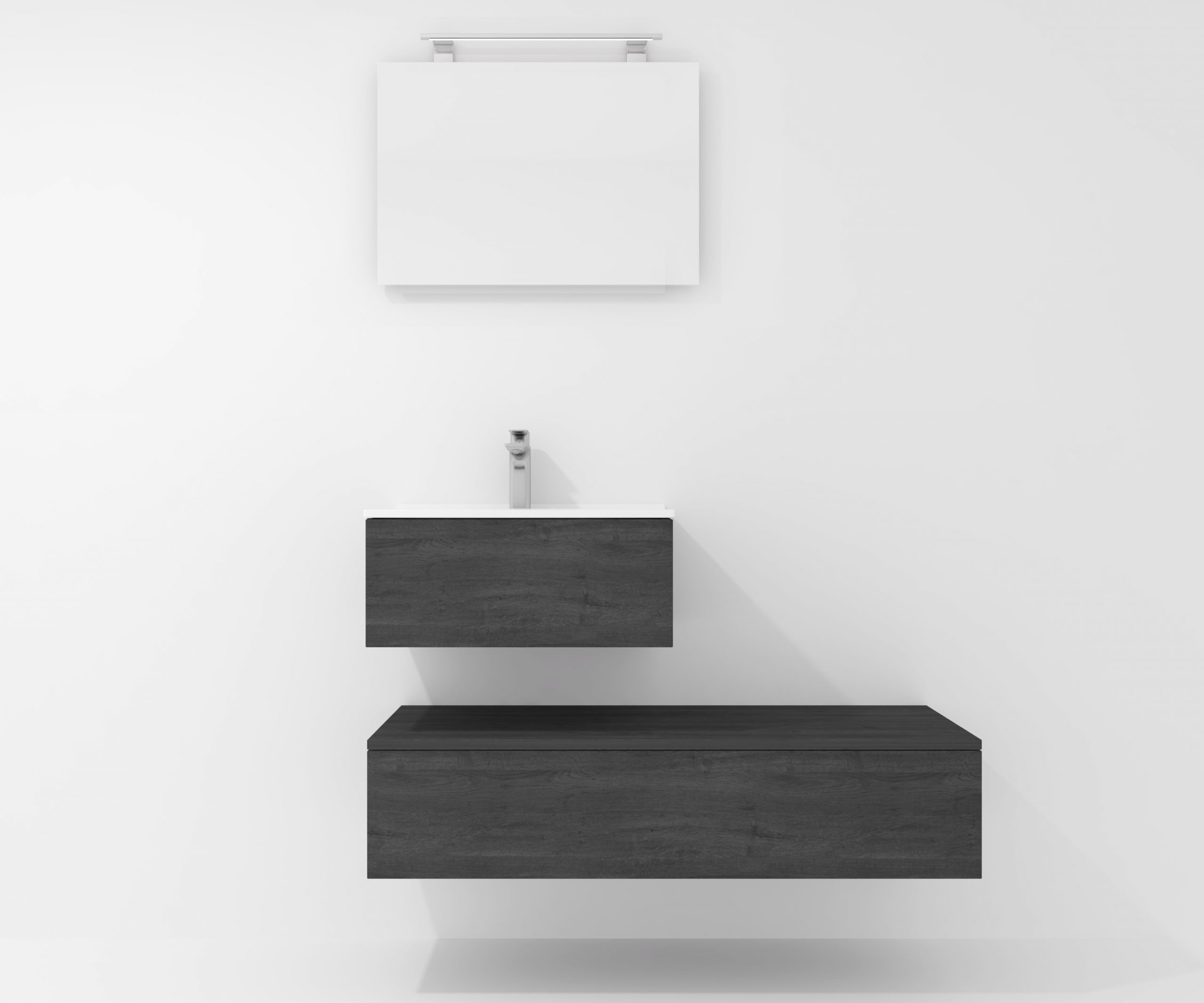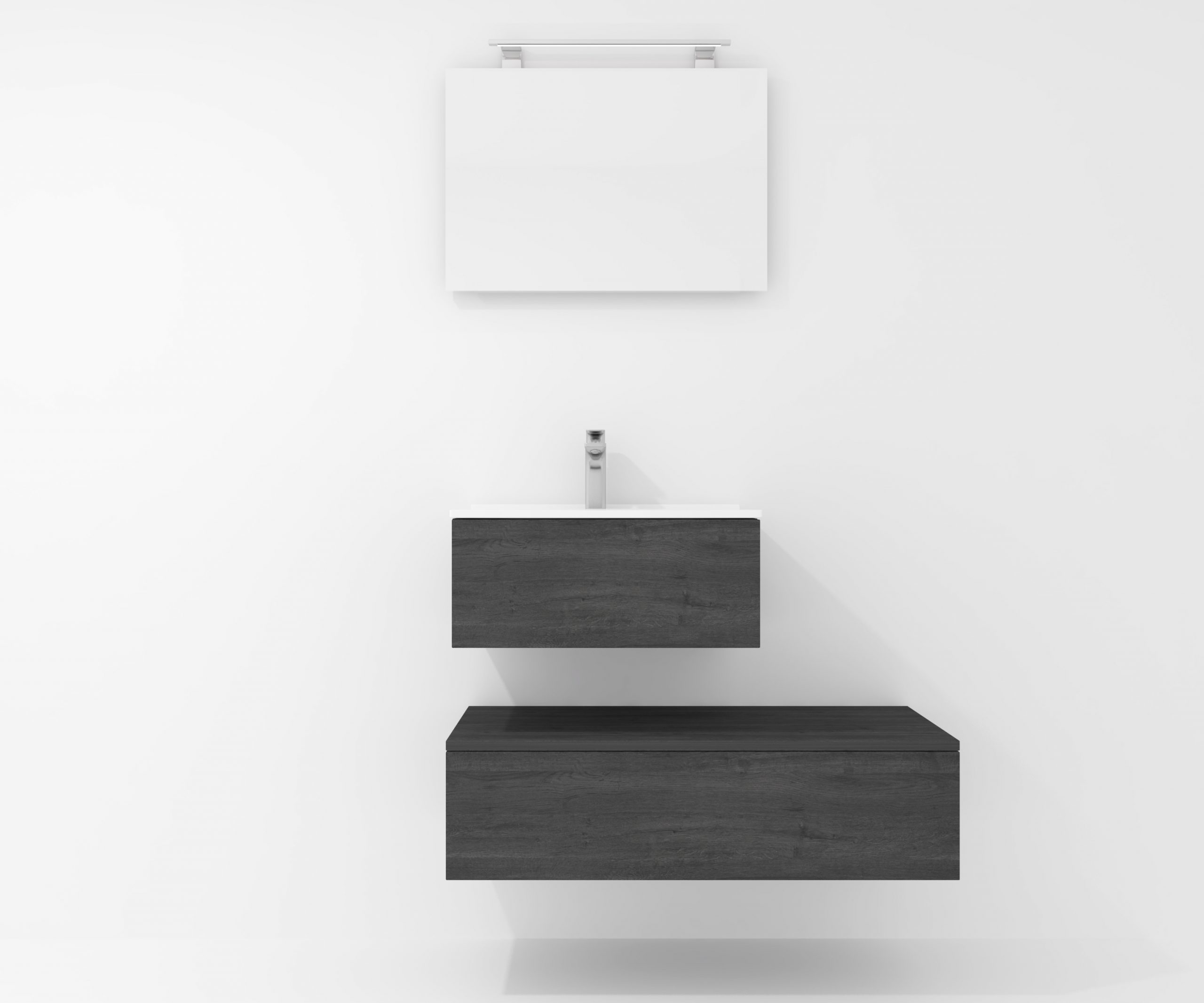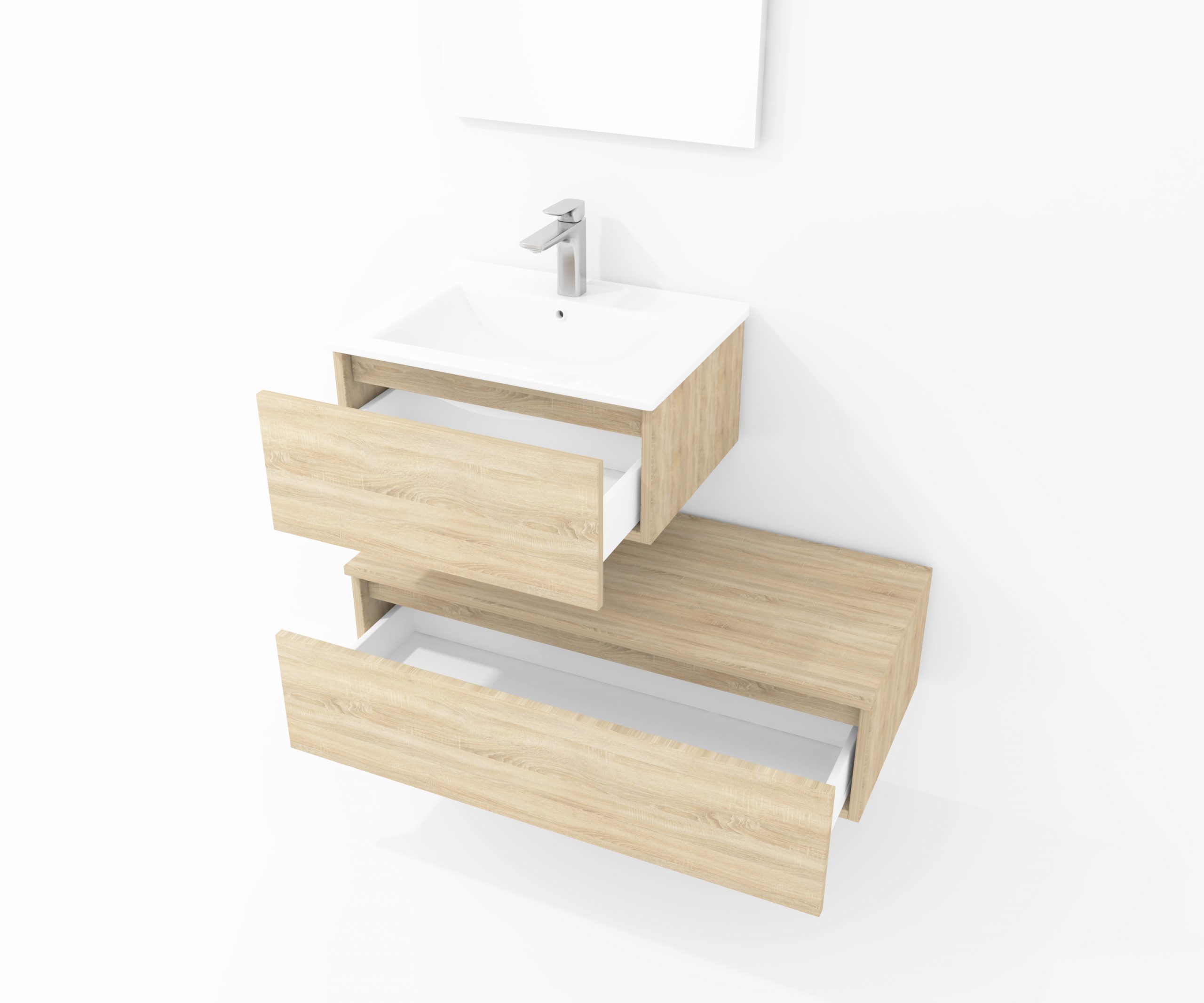Pack compuesto por dos muebles de baño suspendidos, lavabo y espejo iluminado. Muebles fabricados en tablero de partículas laminado de 19mm, con cajones de extracción total y cierre suave. Cantos realizados en PVC de 1 mm. Lavabo sobreencimera de cerámica blanco brillo, espejo liso con foco iluminación LED y temperatura de color de 6000 K LED incluidos. Fabricado en España. Grifo no incluido.