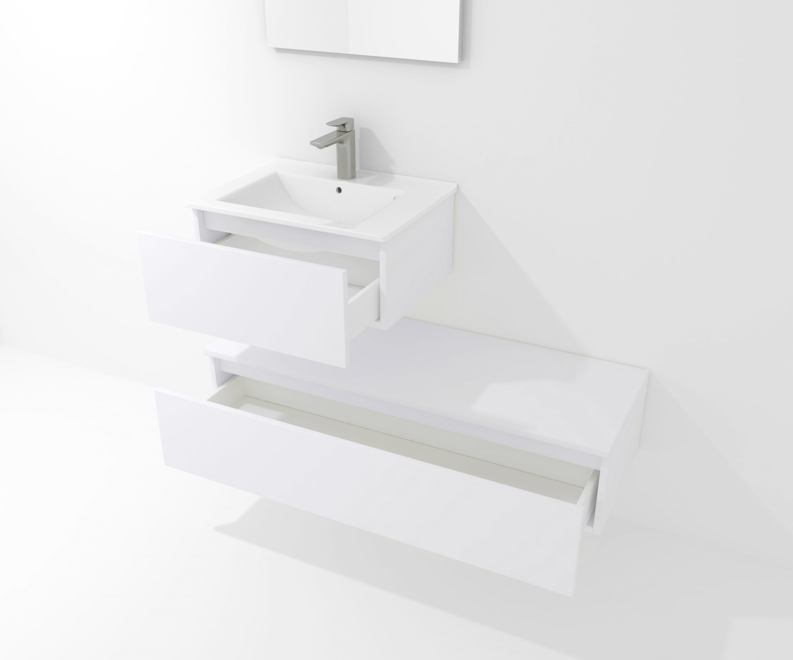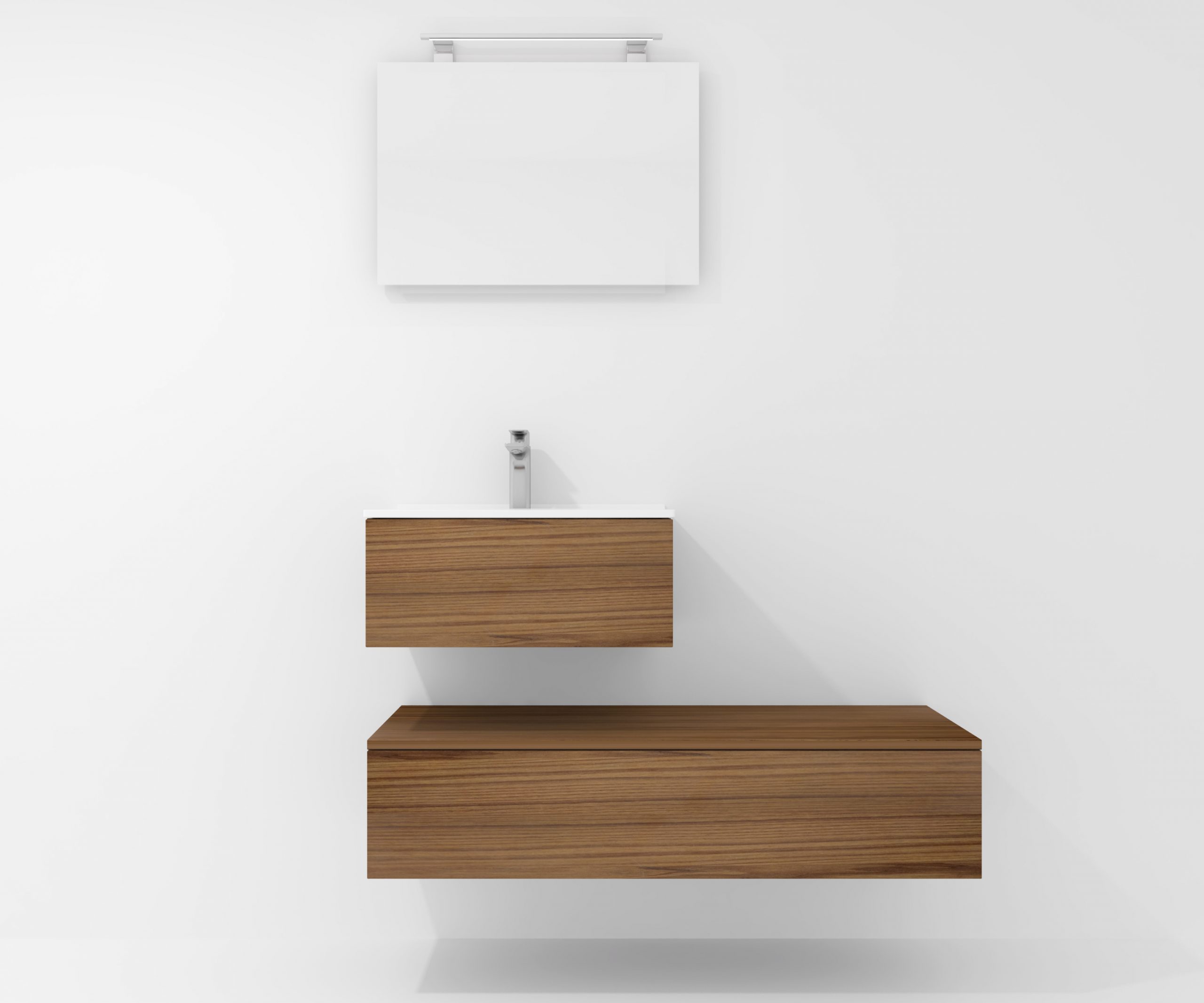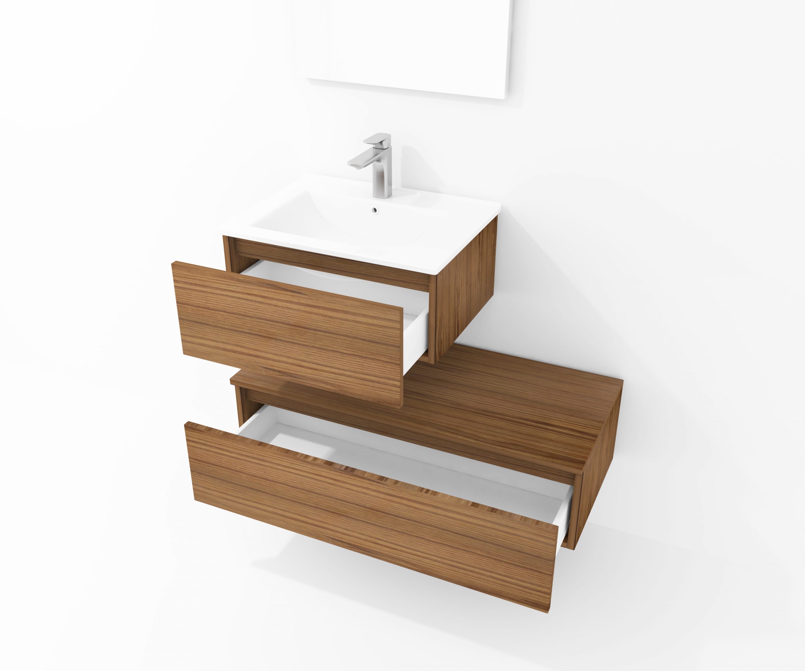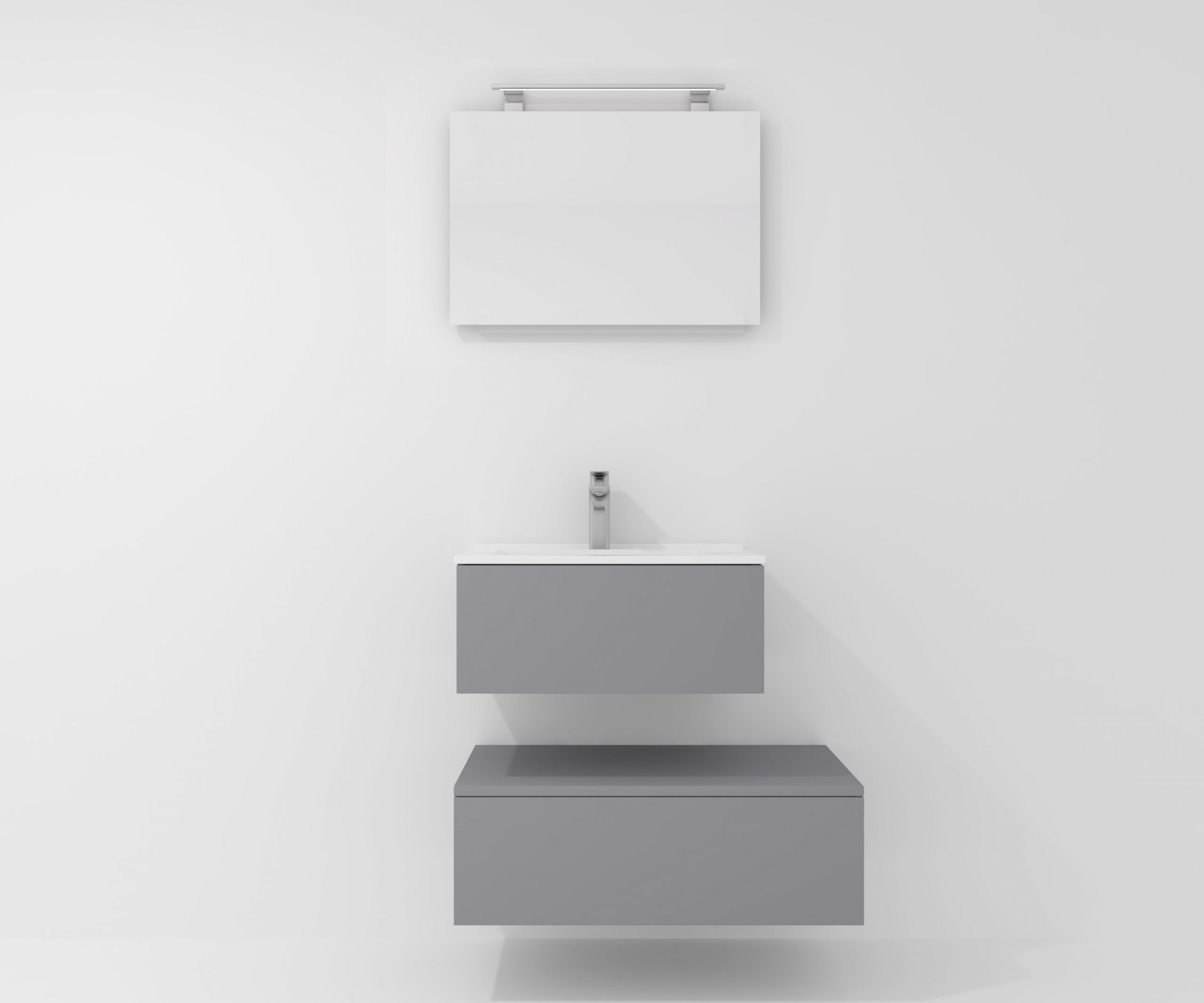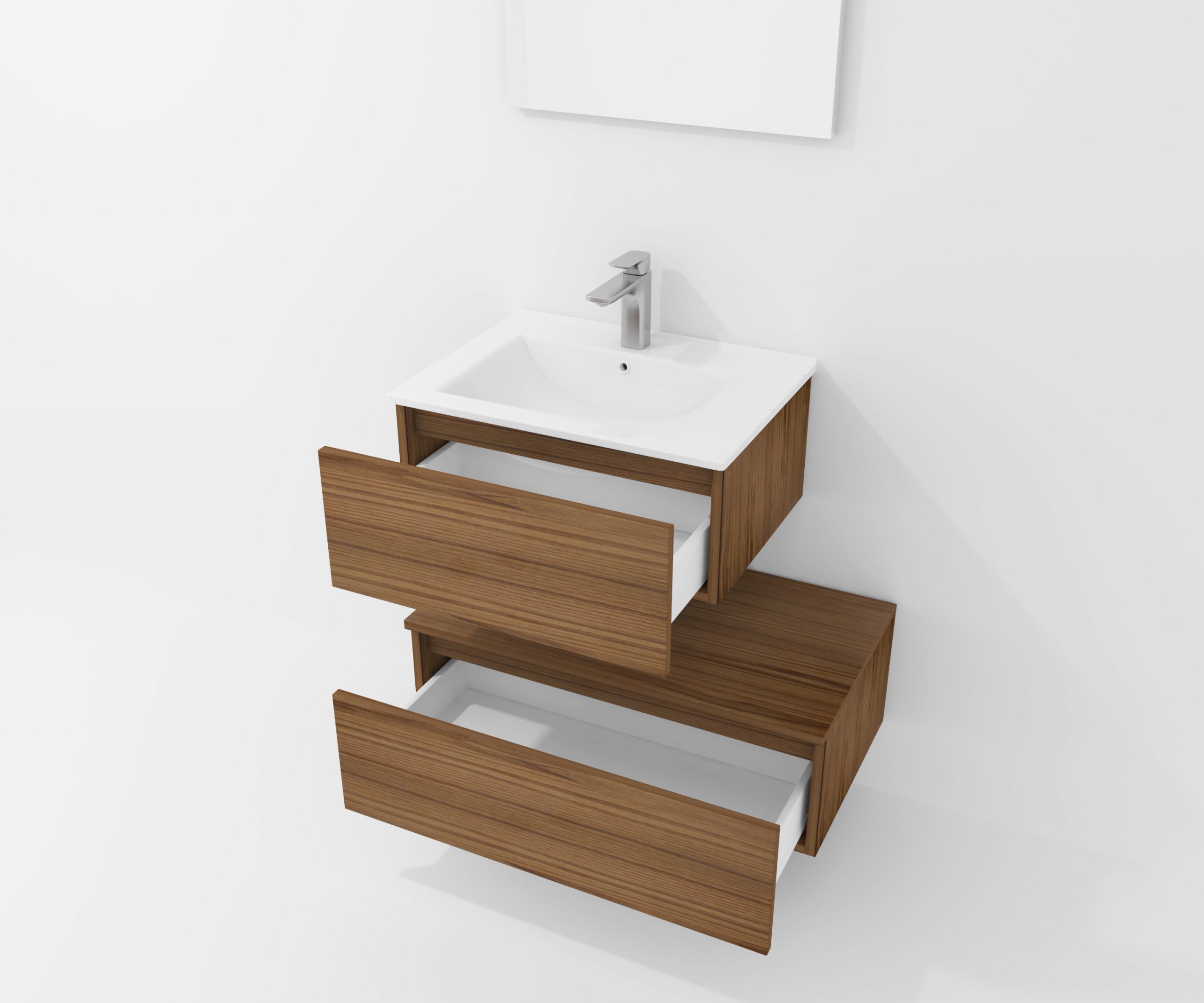Pack compuesto por dos muebles de baño suspendidos, lavabo y espejo iluminado. Muebles fabricados en tablero de partículas laminado de 19mm, con cajones de extracción total y cierre suave. Cantos realizados en PVC de 1 mm. Lavabo sobreencimera de cerámica blanco brillo, espejo liso con foco iluminación LED y temperatura de color de 6000 K LED incluidos. Fabricado en España. Grifo no incluido.