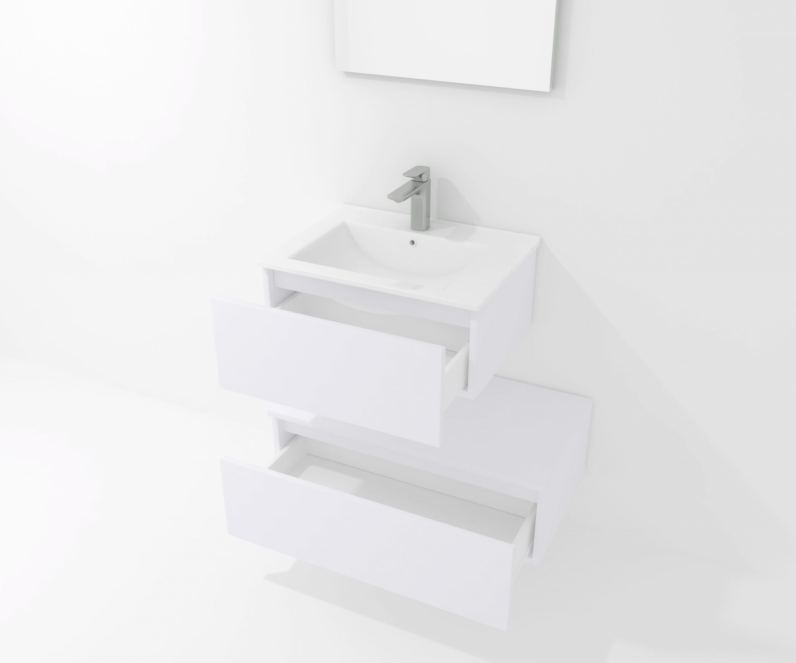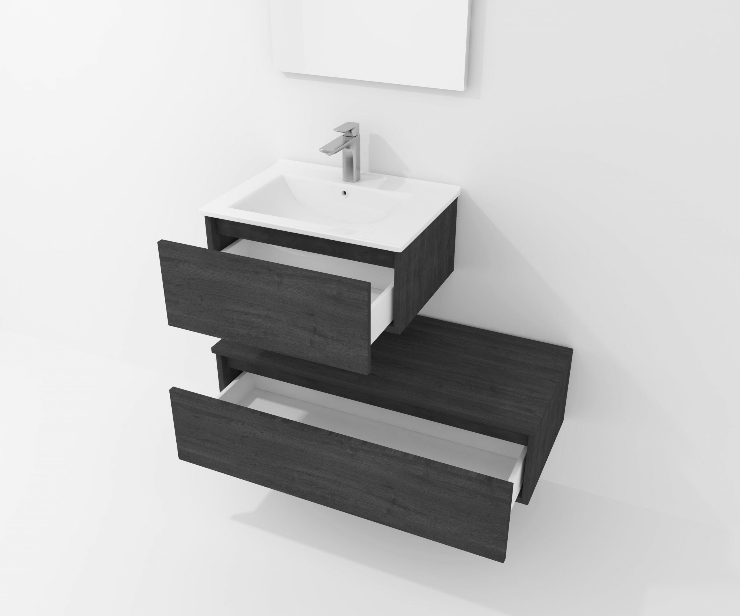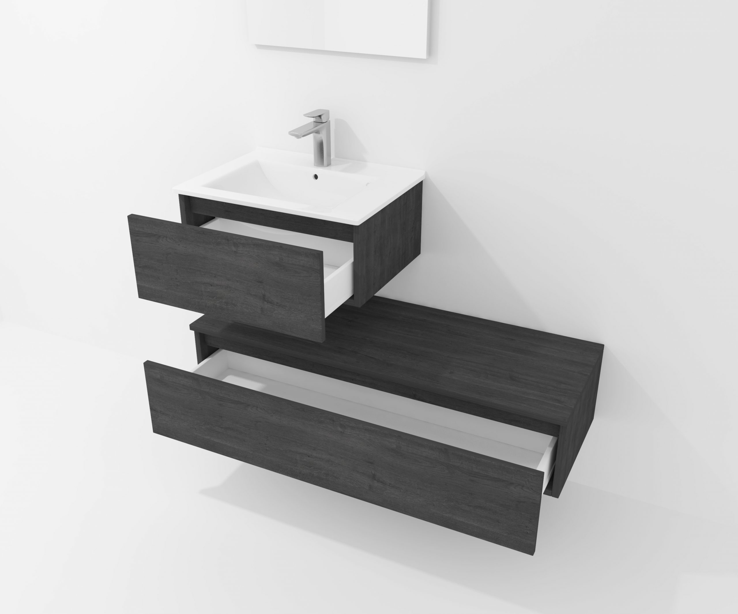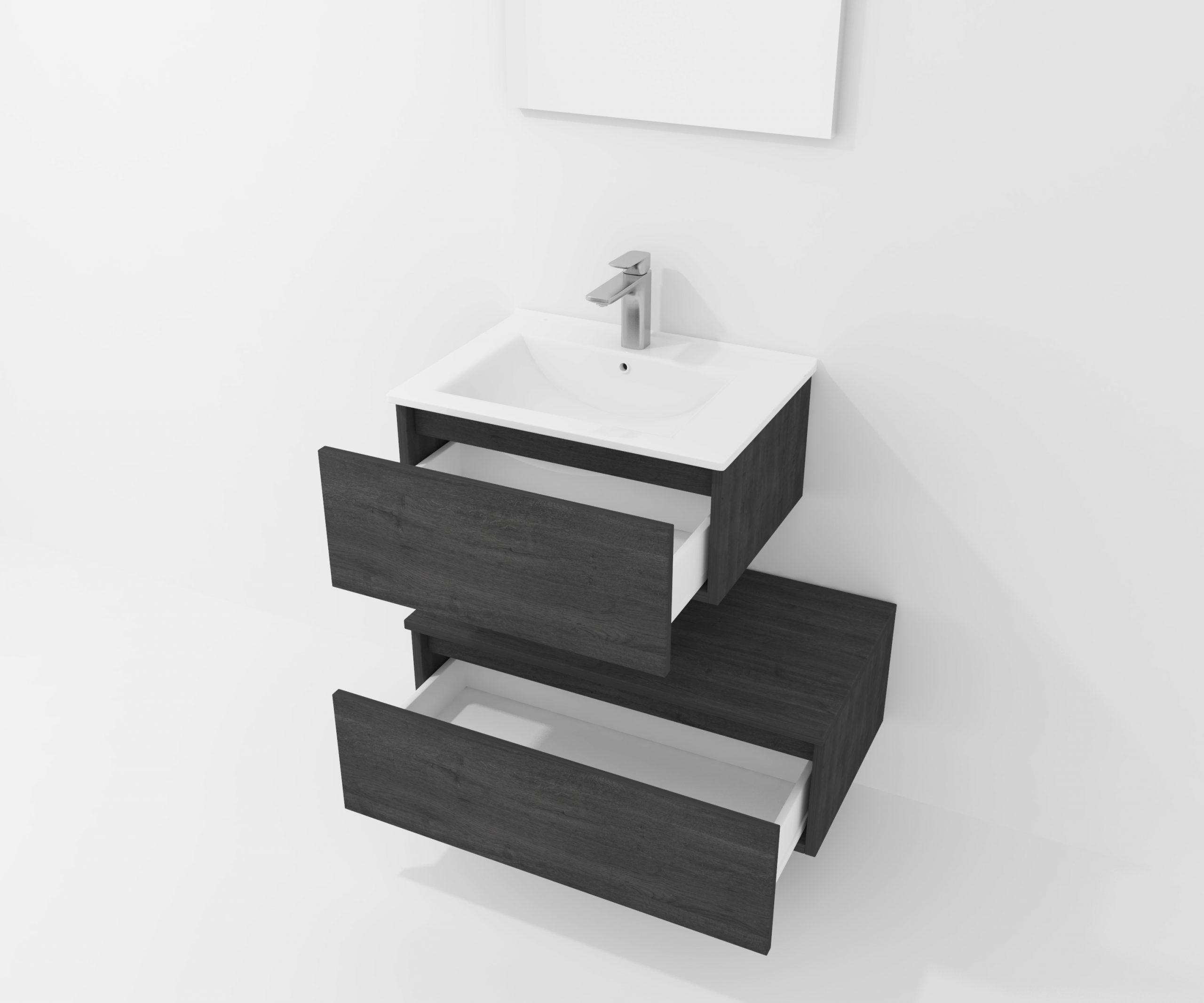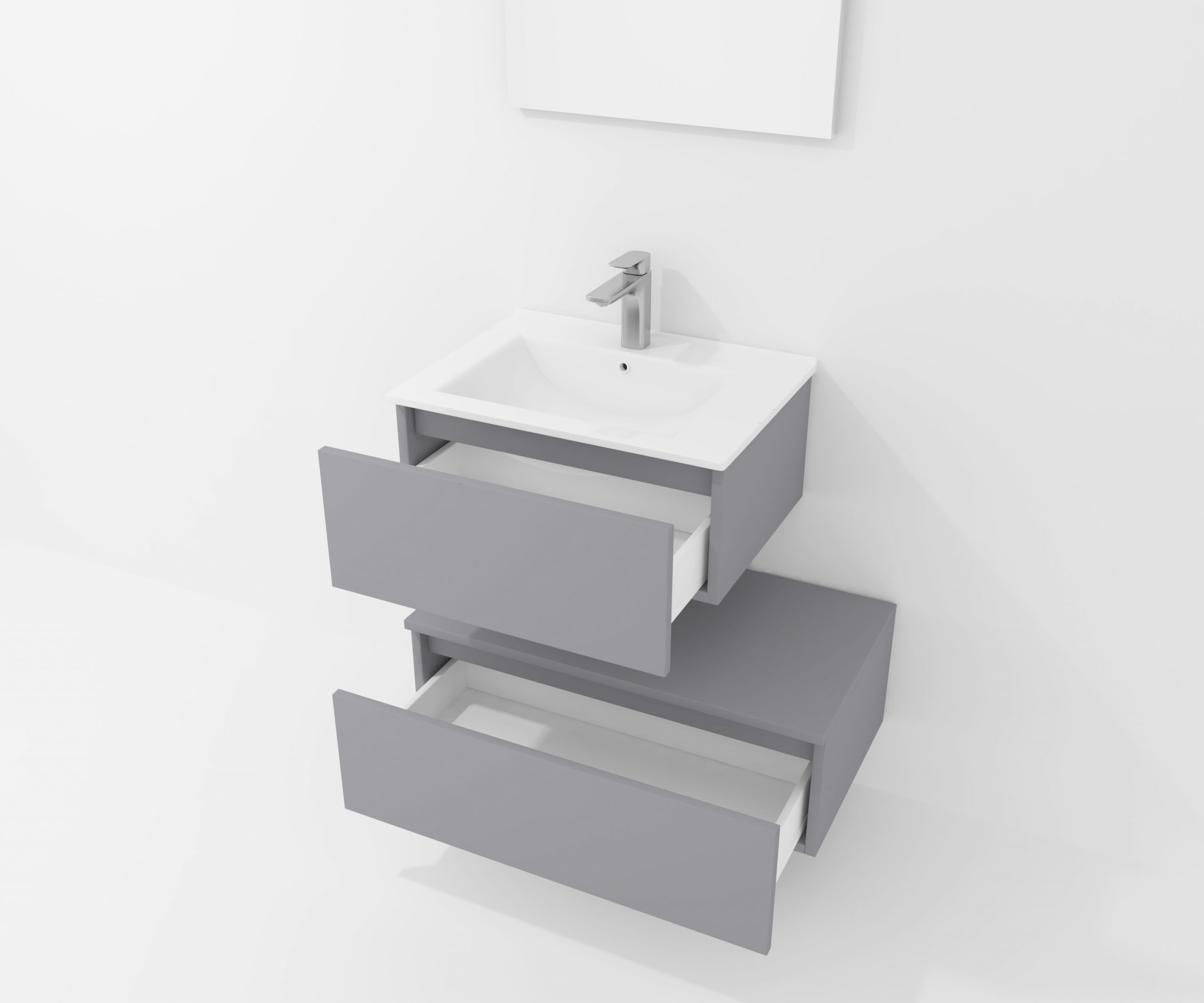 Pack compuesto por dos muebles de baño suspendidos, lavabo y espejo iluminado. Muebles fabricados en tablero de partículas laminado de 19mm, con cajones de extracción total y cierre suave. Cantos realizados en PVC de 1 mm. Lavabo sobreencimera de cerámica blanco brillo, espejo liso con foco iluminación LED y temperatura de color de 6000 K LED incluidos. Fabricado en España. Grifo no incluido.