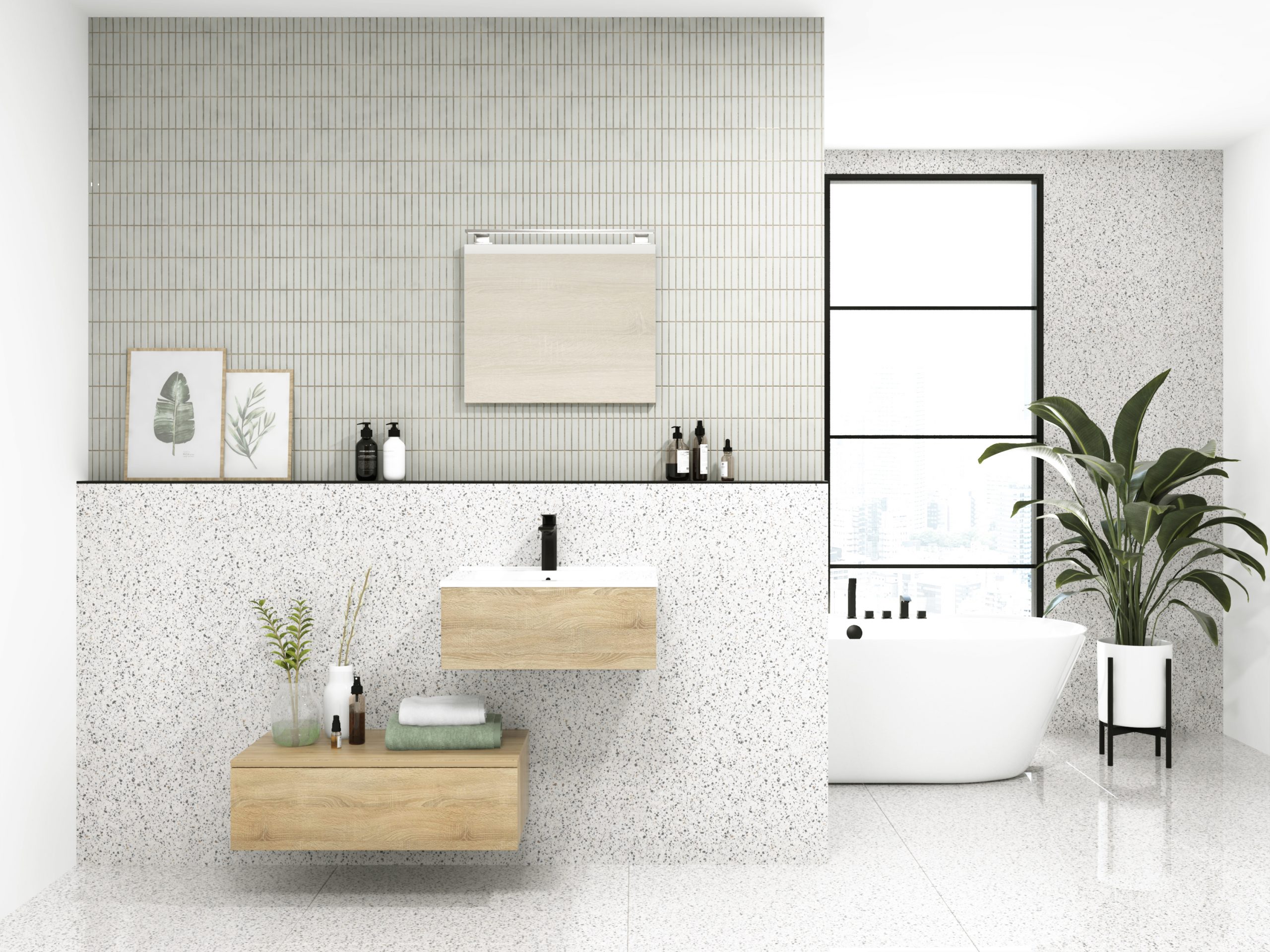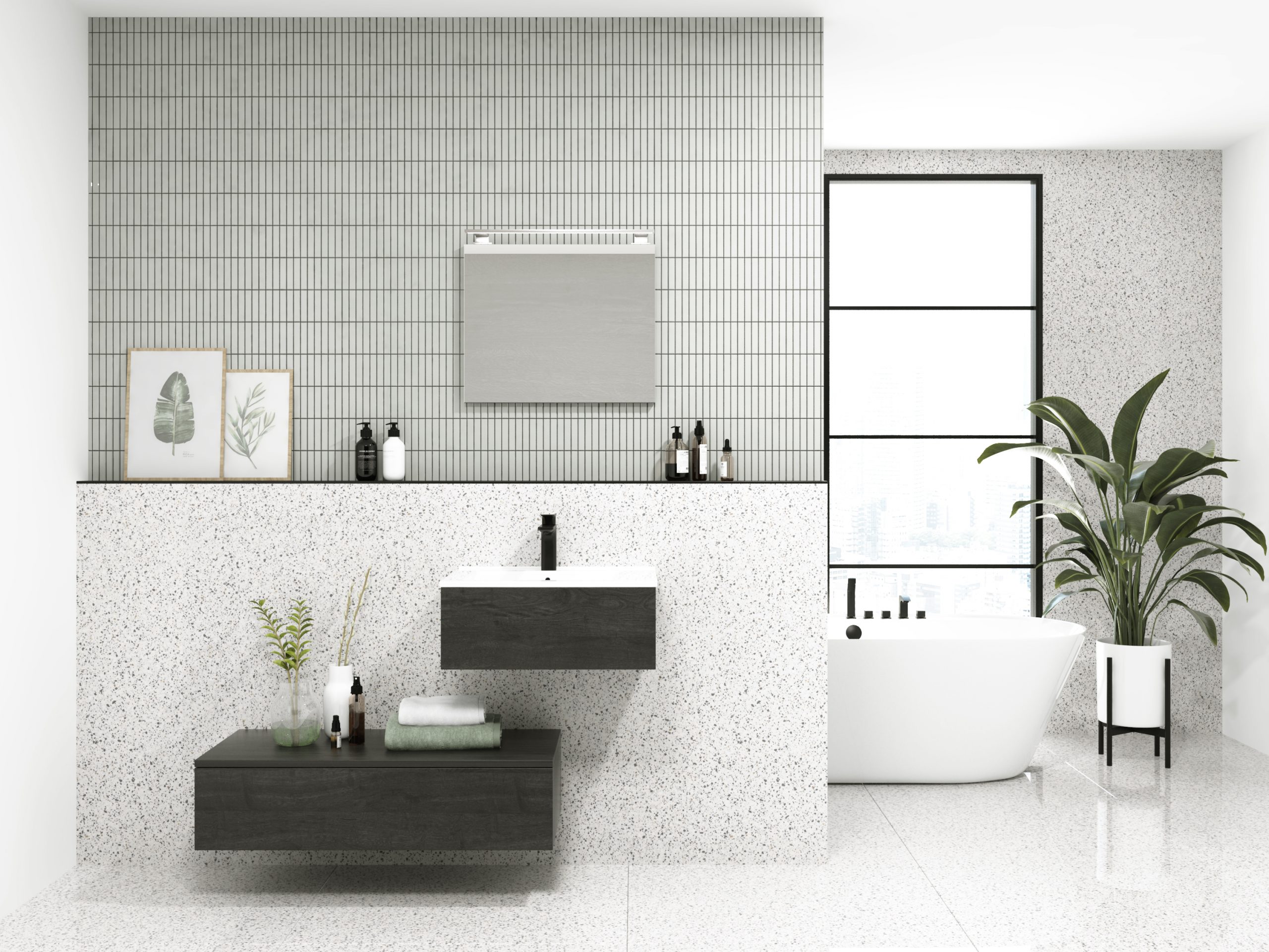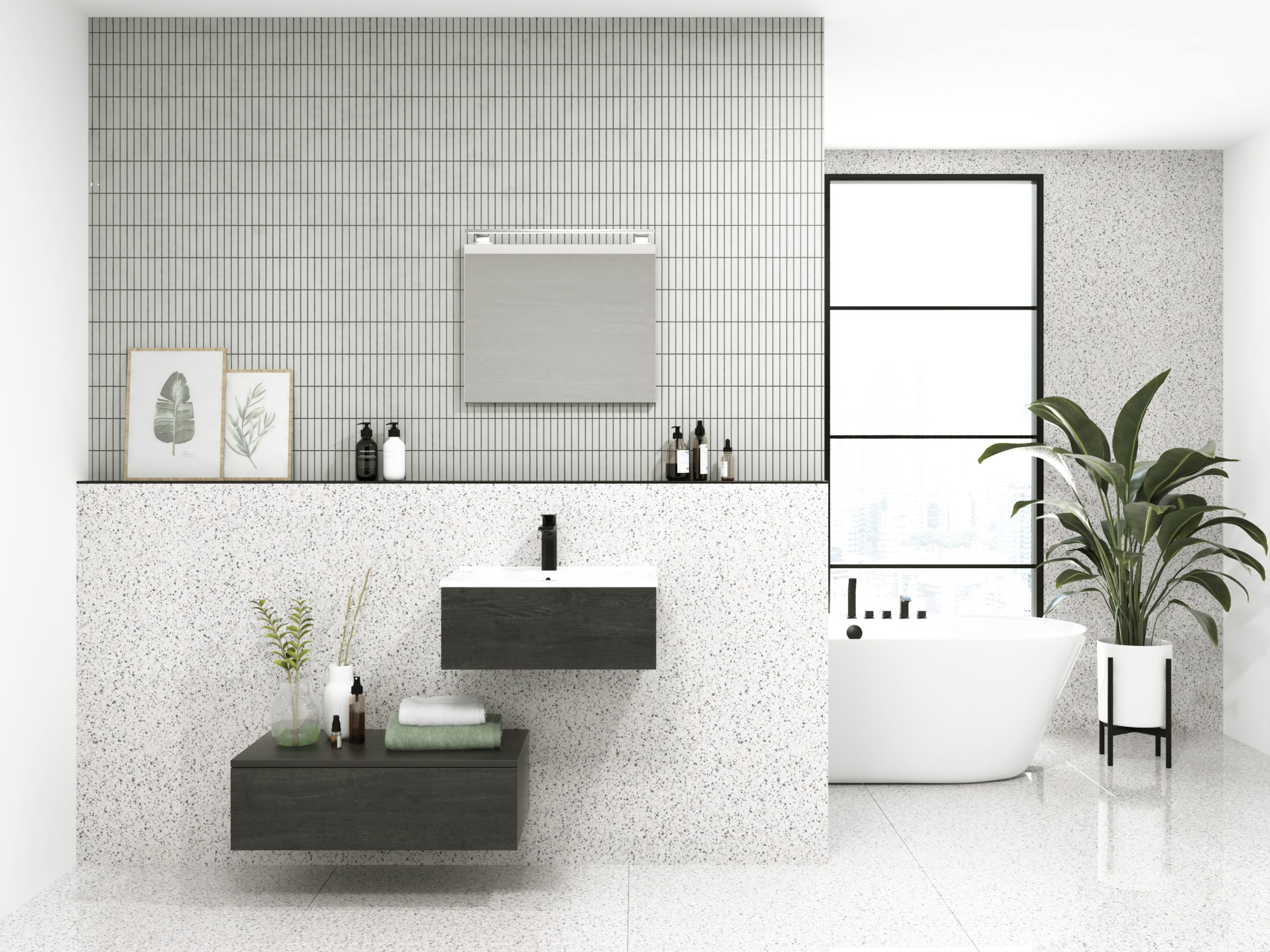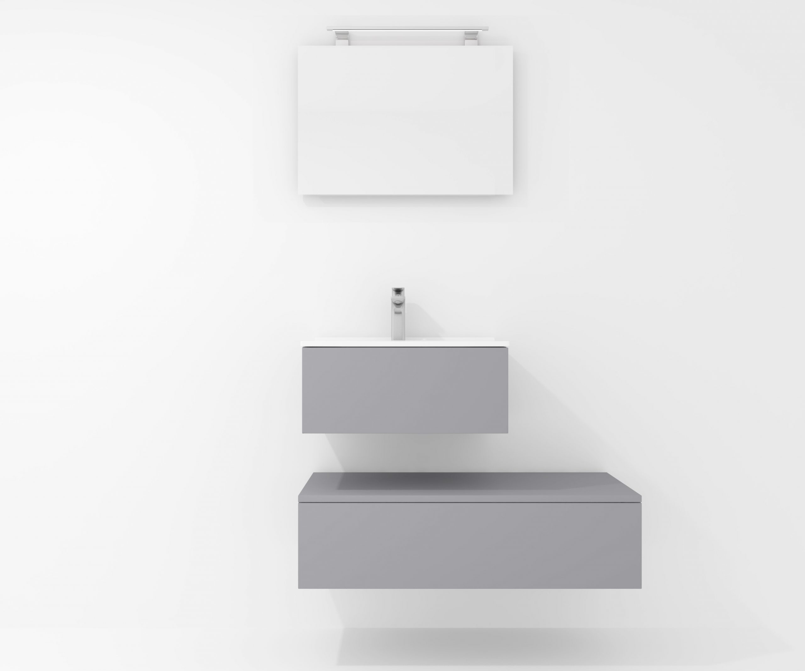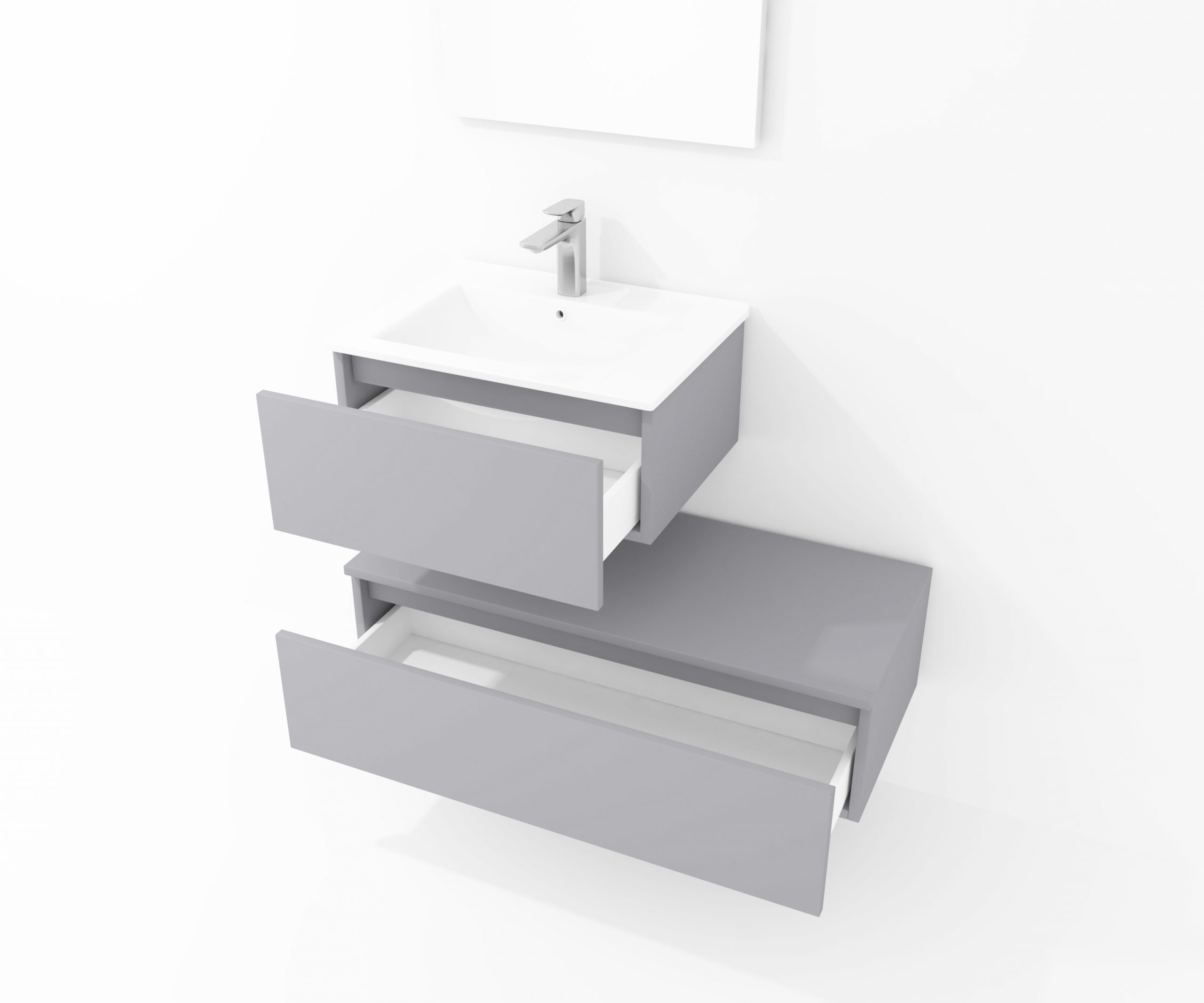 Pack compuesto por dos muebles de baño suspendidos, lavabo y espejo iluminado. Muebles fabricados en tablero de partículas laminado de 19mm, con cajones de extracción total y cierre suave. Cantos realizados en PVC de 1 mm. Lavabo sobreencimera de cerámica blanco brillo, espejo liso con foco iluminación LED y temperatura de color de 6000 K LED incluidos. Fabricado en España. Grifo no incluido.