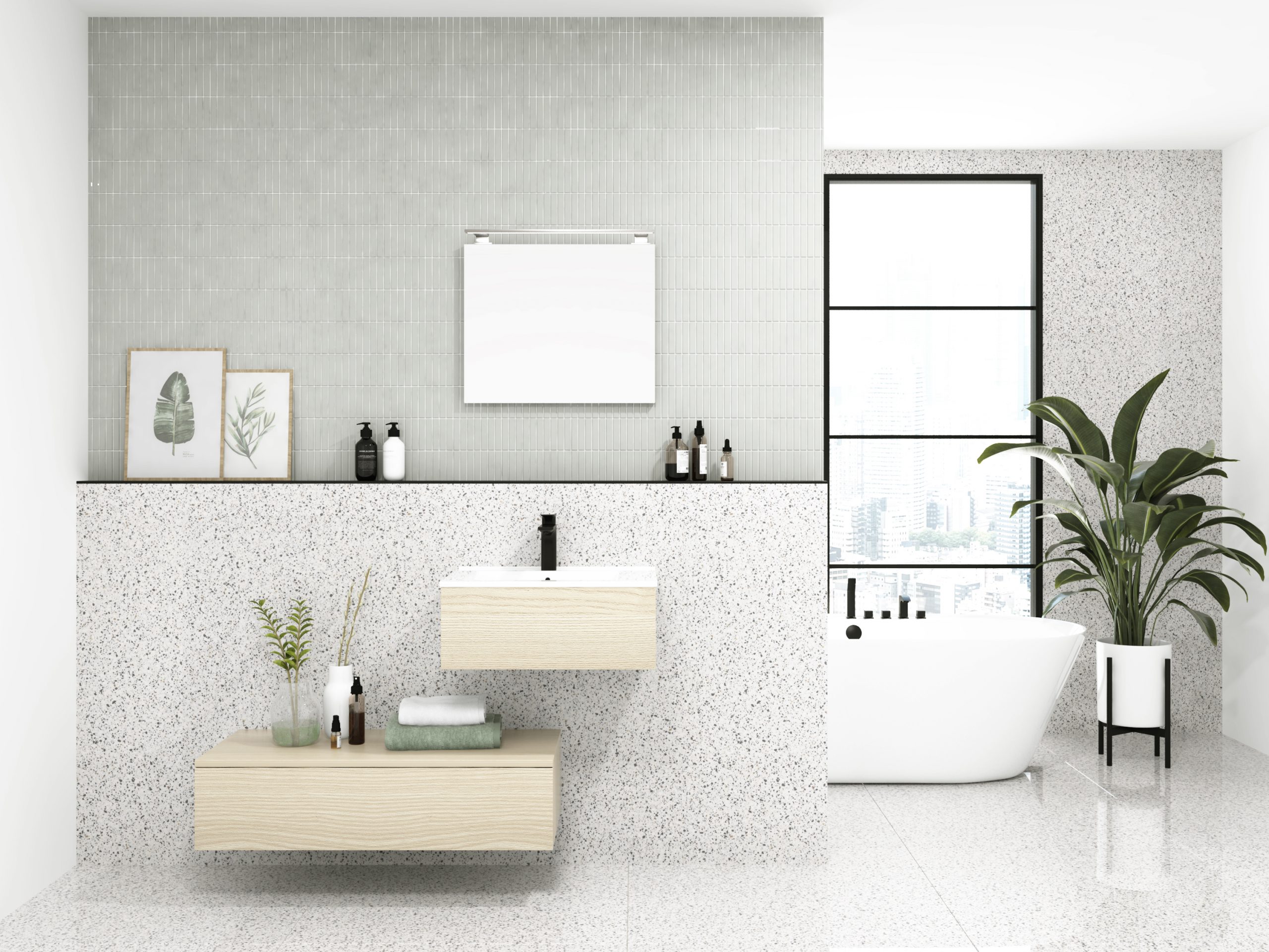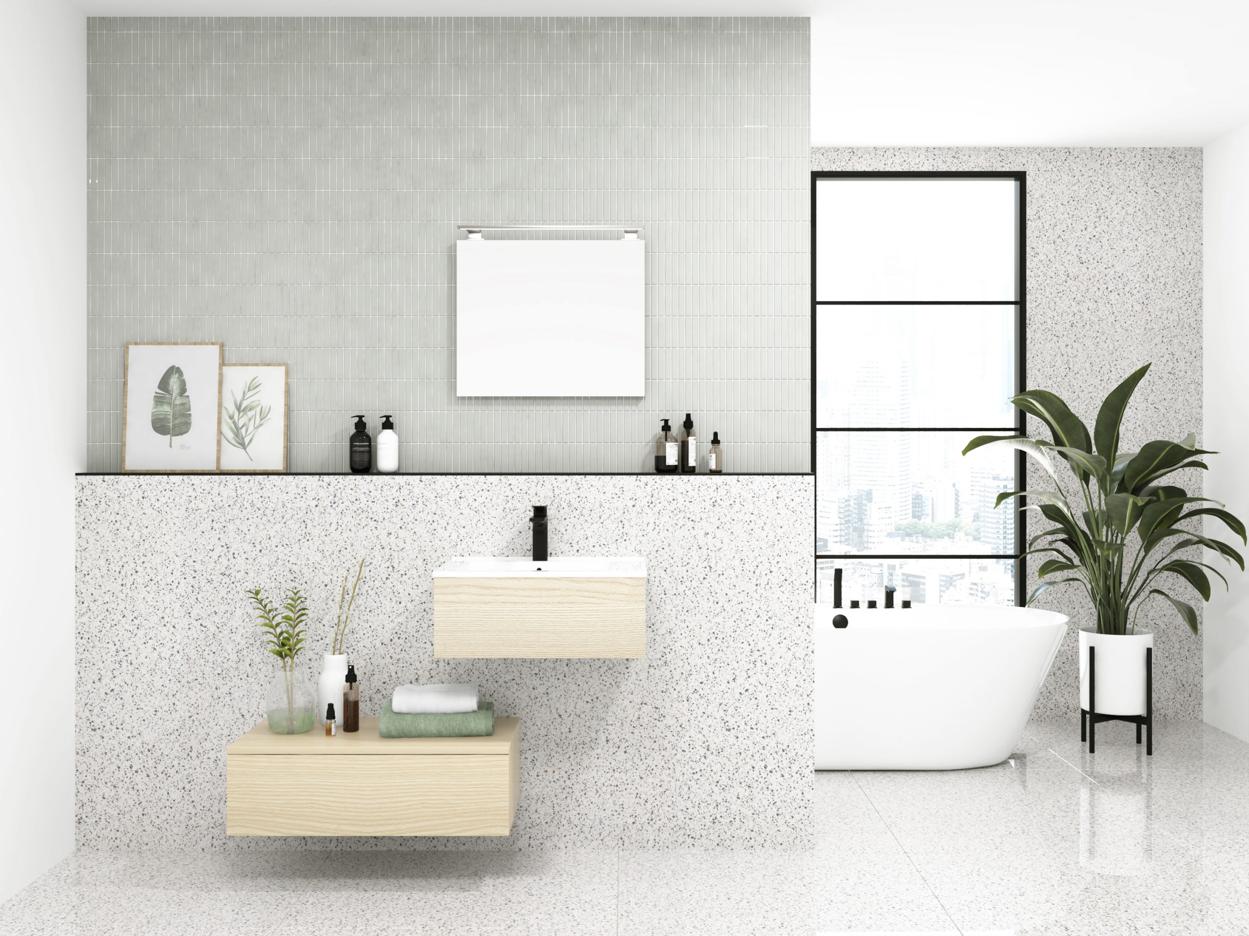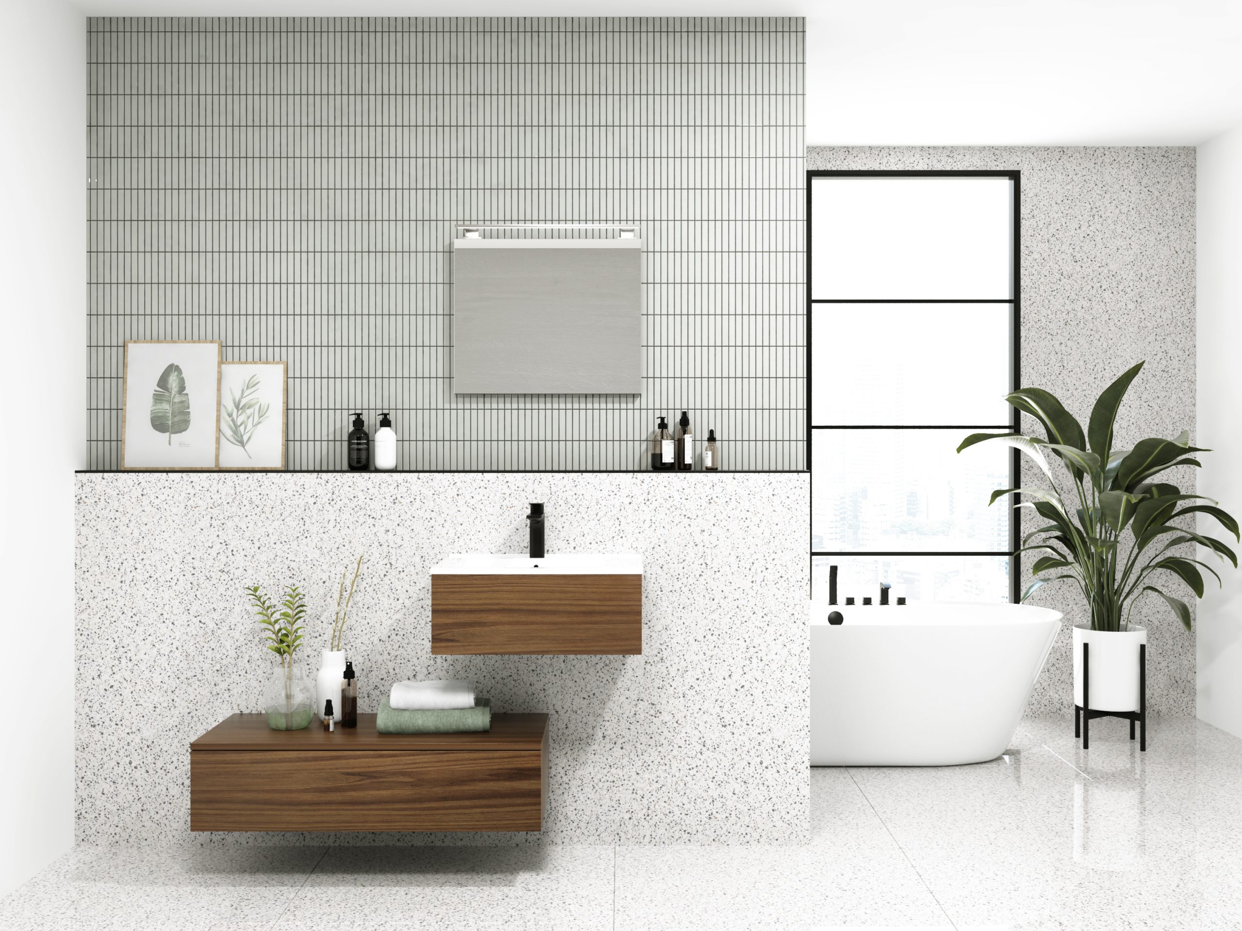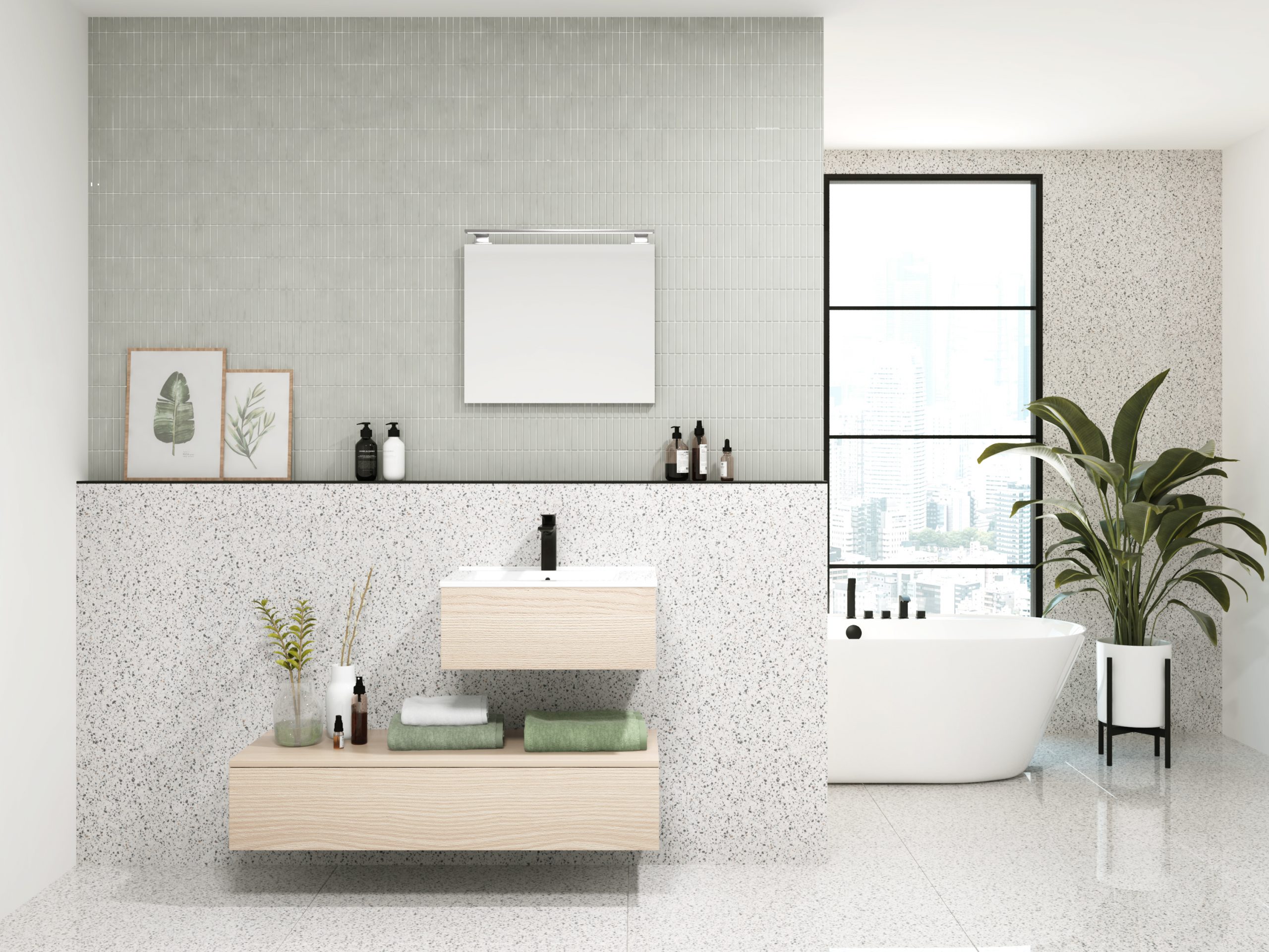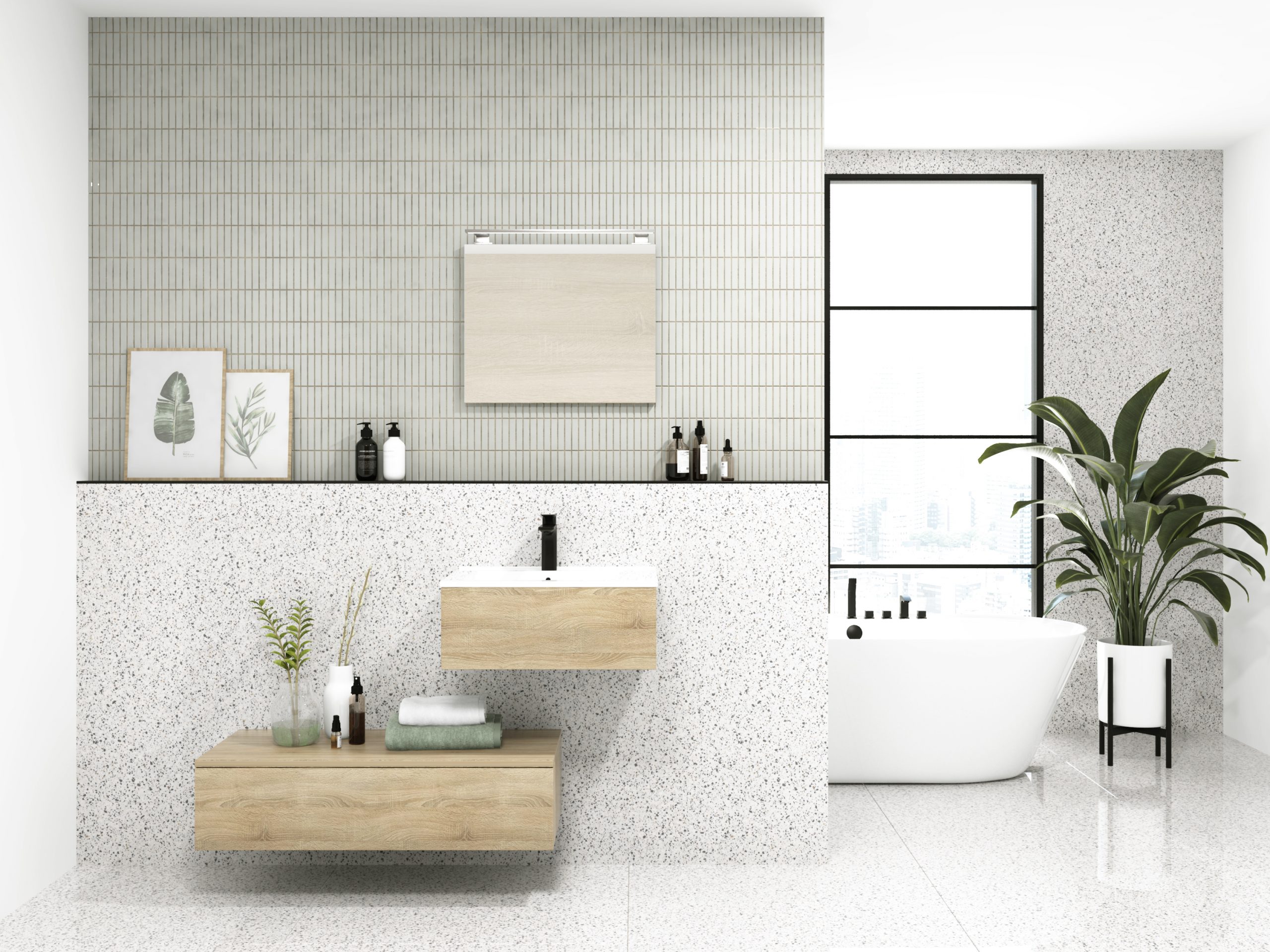 Pack compuesto por dos muebles de baño suspendidos, lavabo y espejo iluminado. Muebles fabricados en tablero de partículas laminado de 19mm, con cajones de extracción total y cierre suave. Cantos realizados en PVC de 1 mm. Lavabo sobreencimera de cerámica blanco brillo, espejo liso con foco iluminación LED y temperatura de color de 6000 K LED incluidos. Fabricado en España. Grifo no incluido.