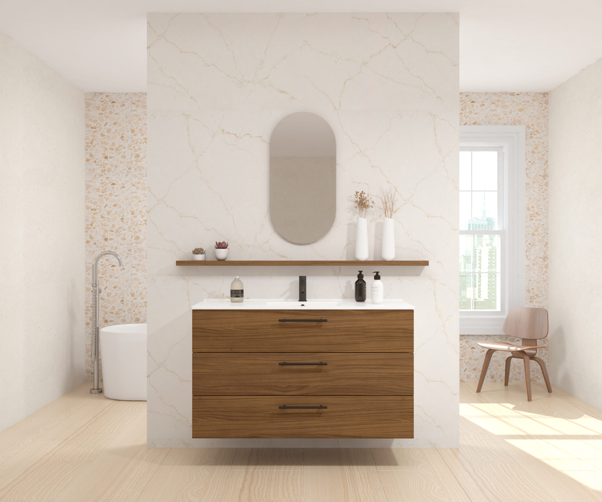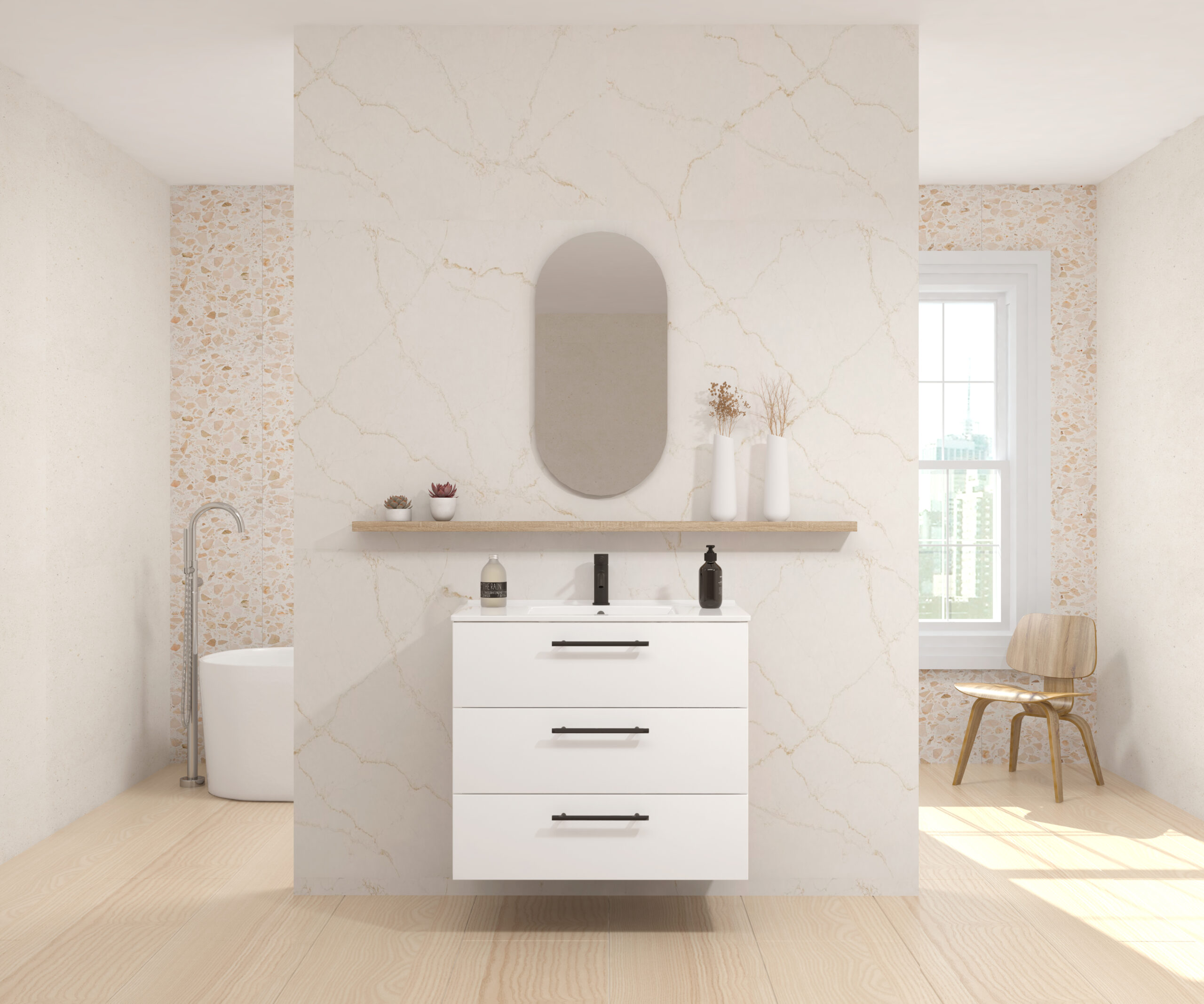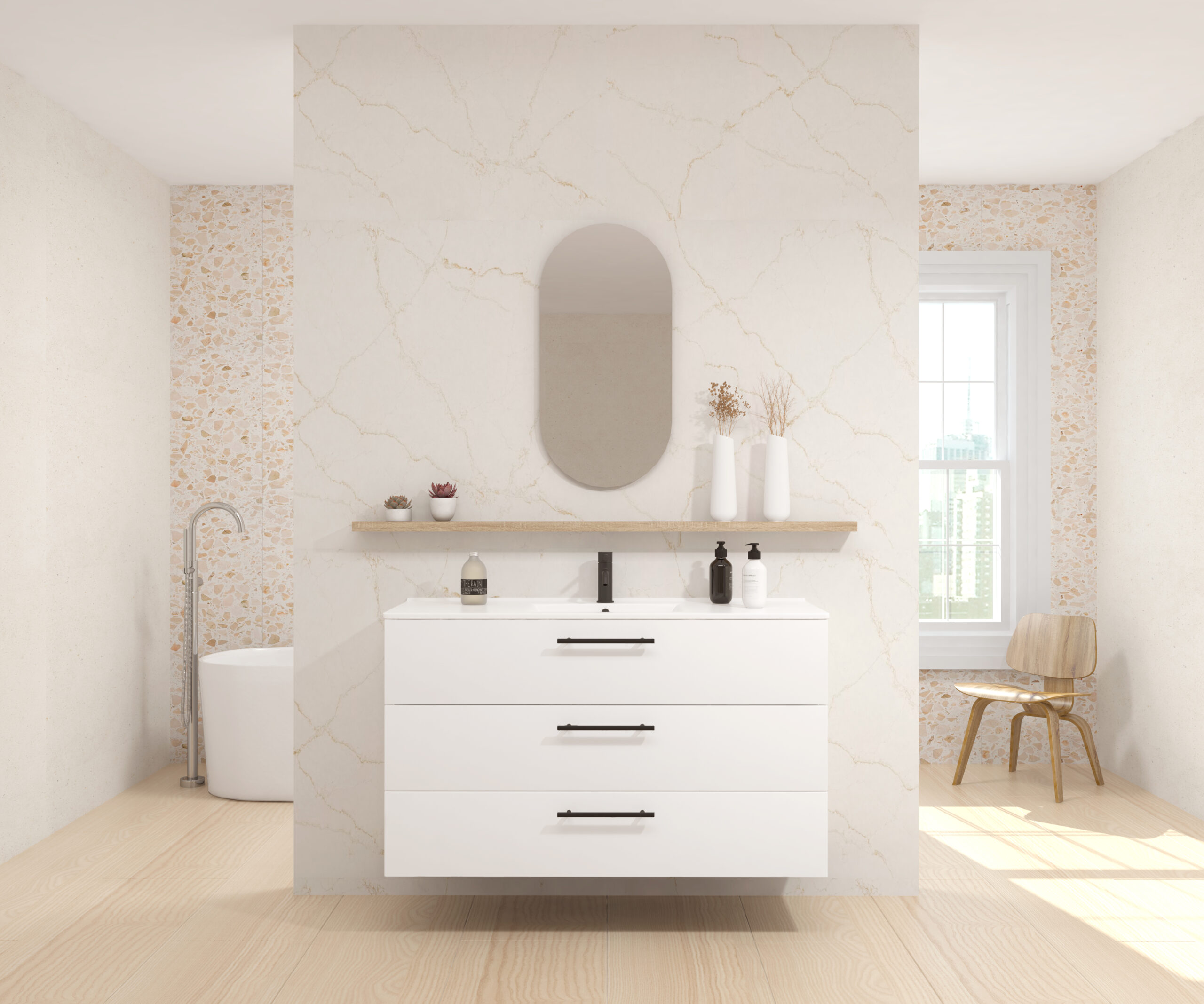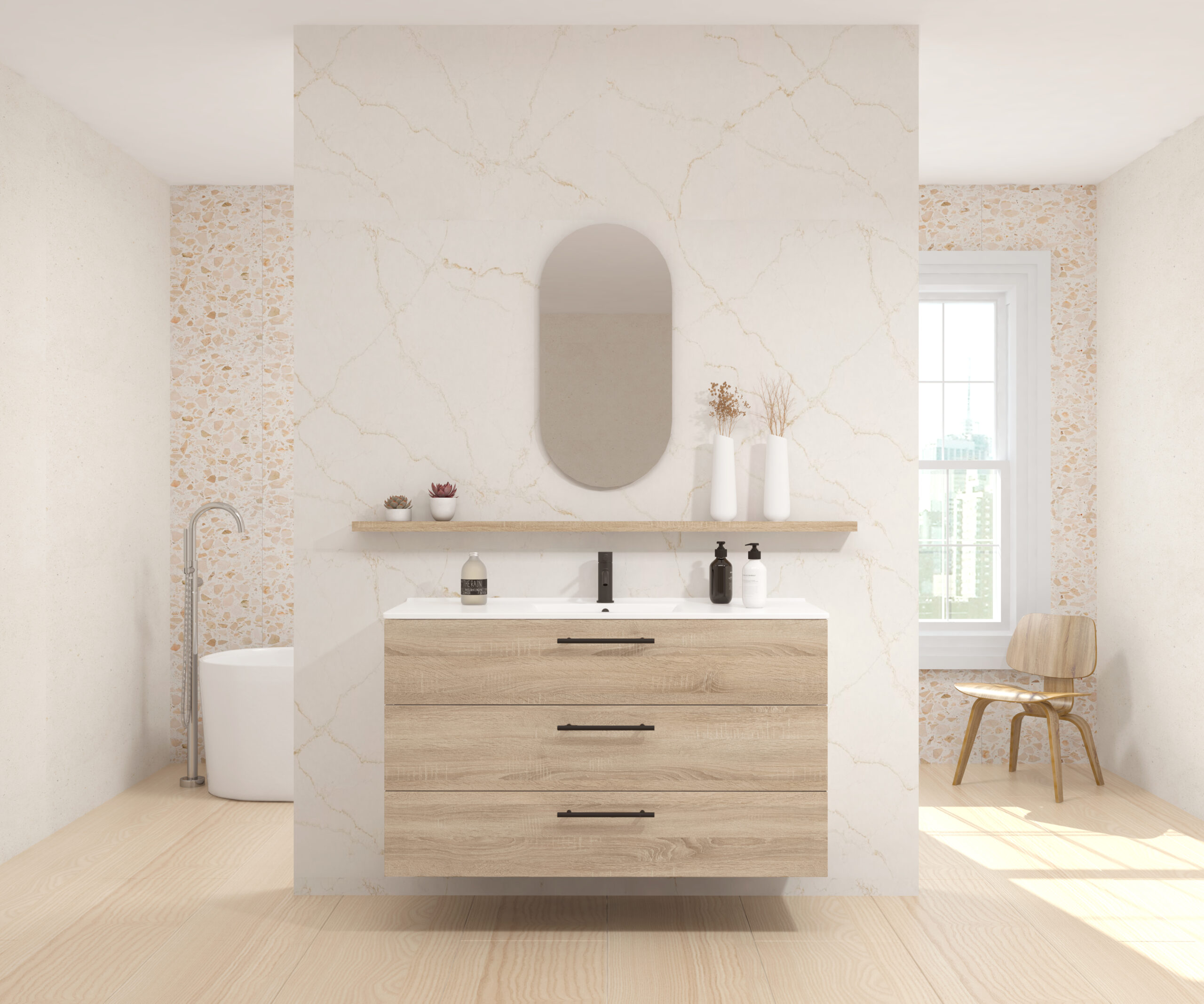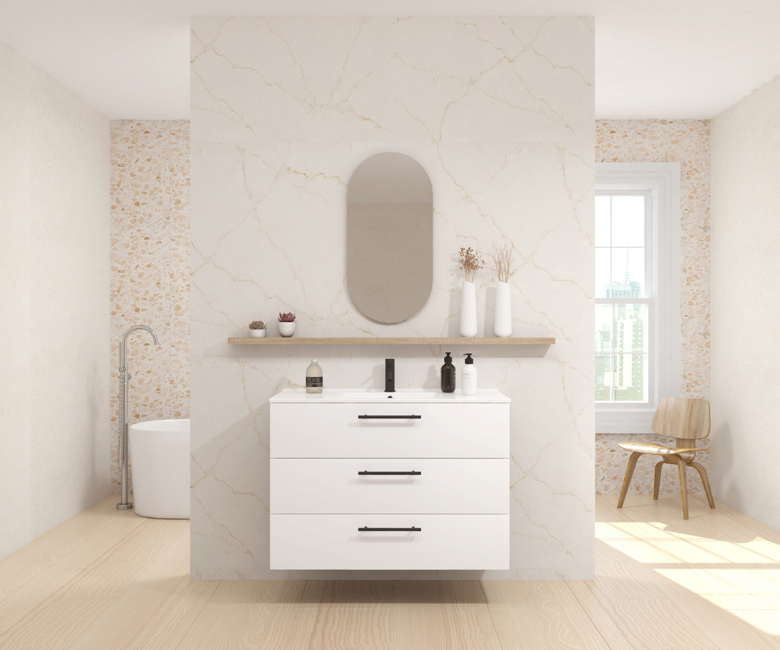 Pack composé d’un meuble sous-vasque suspendu, d’une vasque et d’un miroir design capsule.