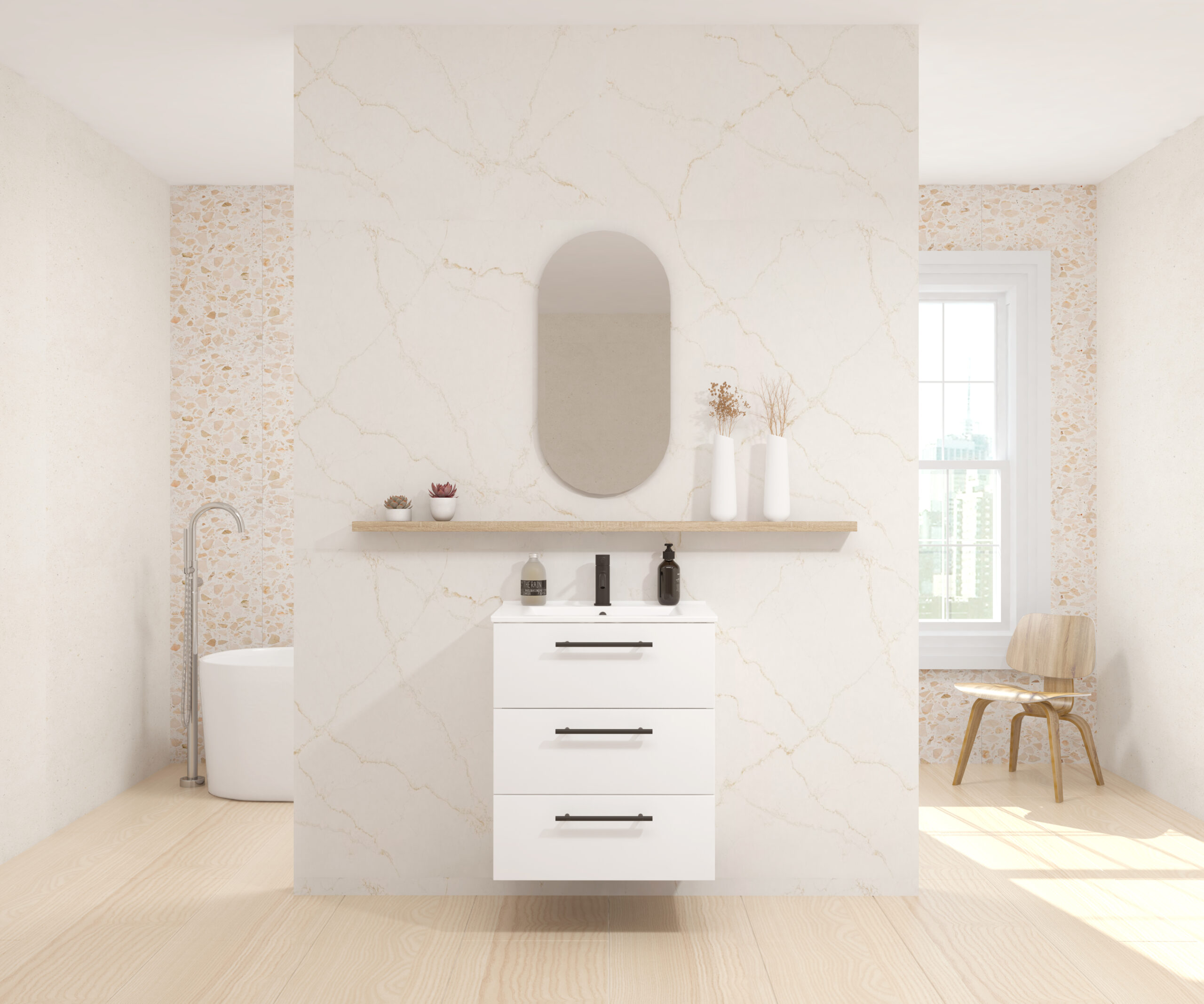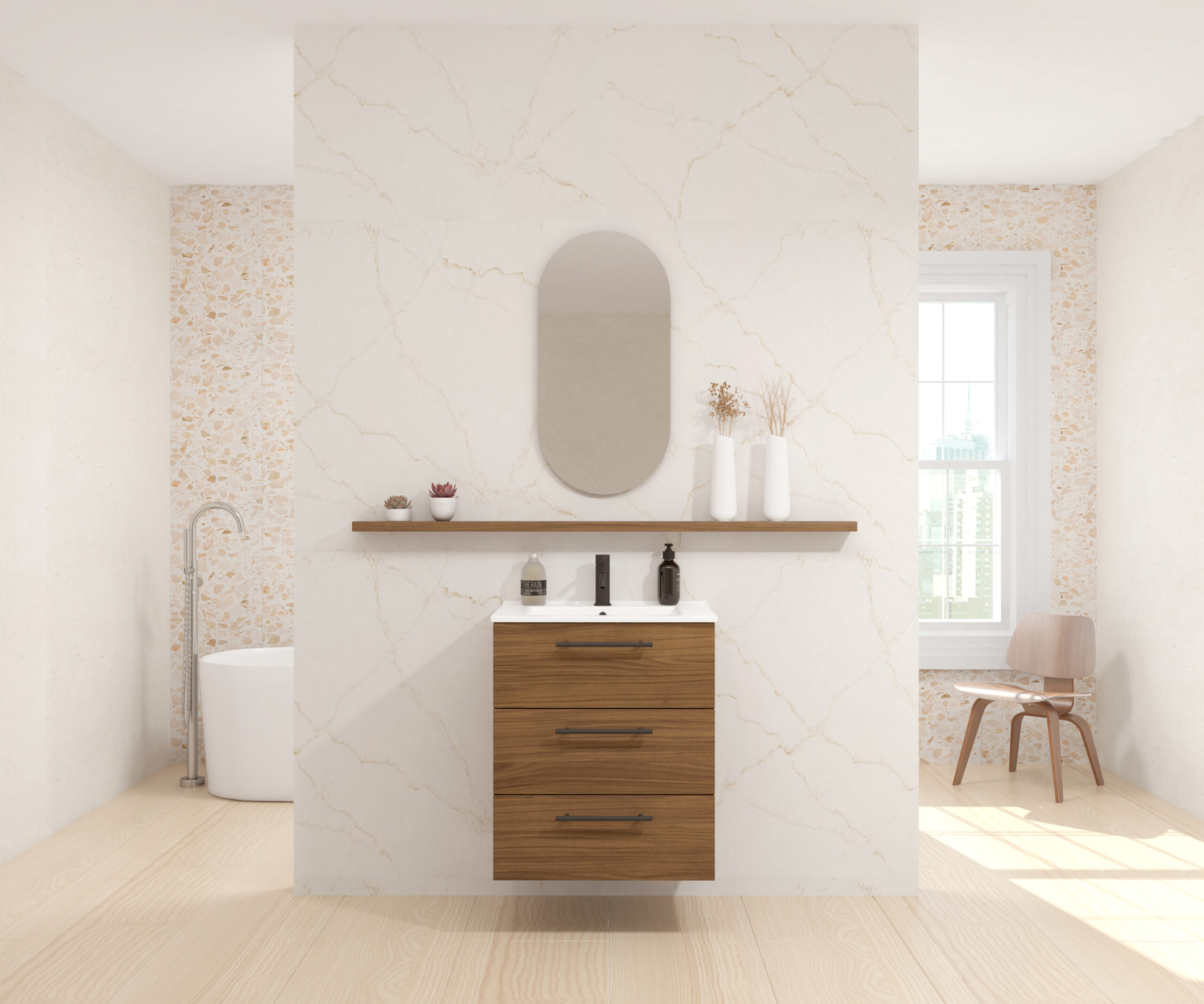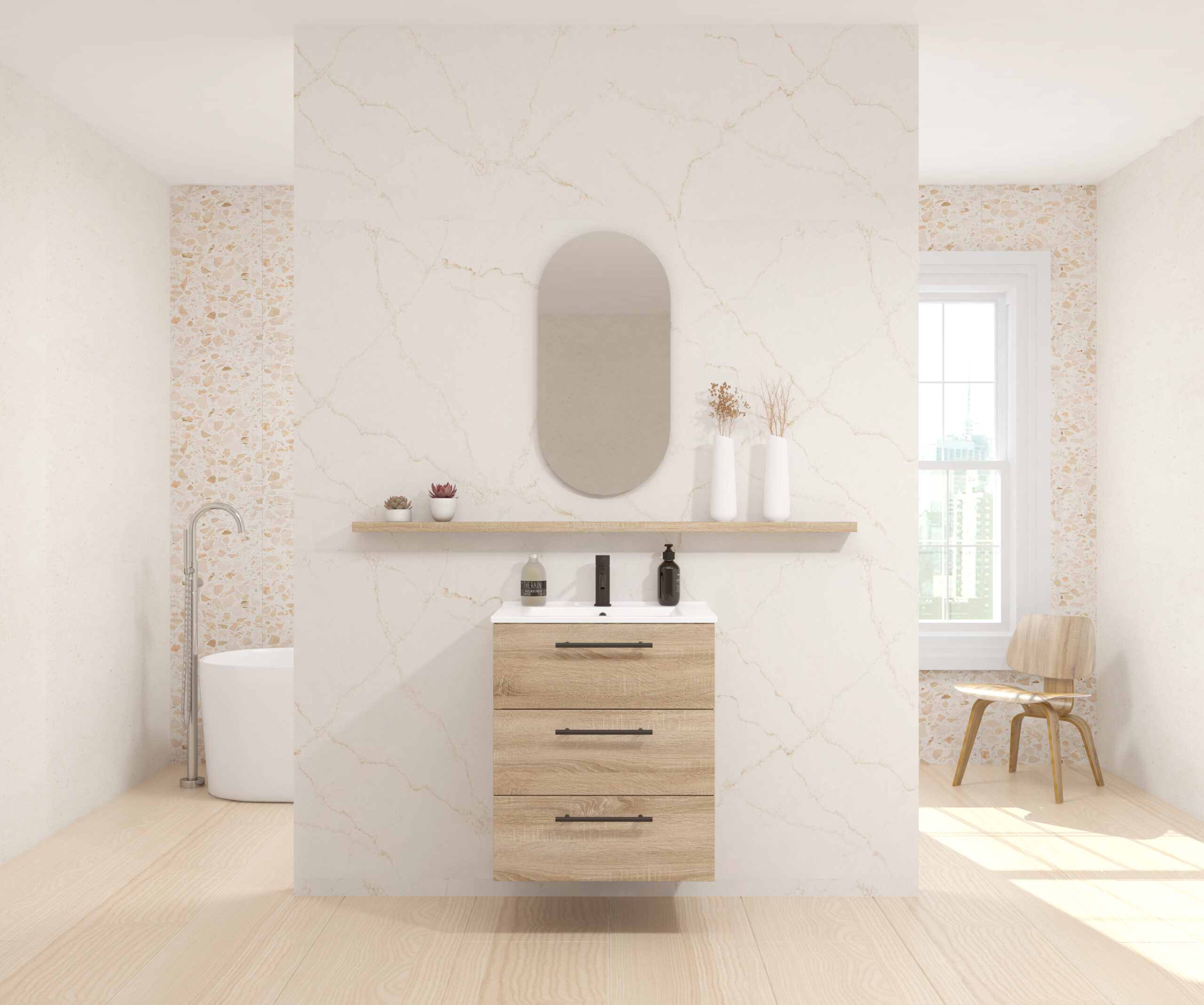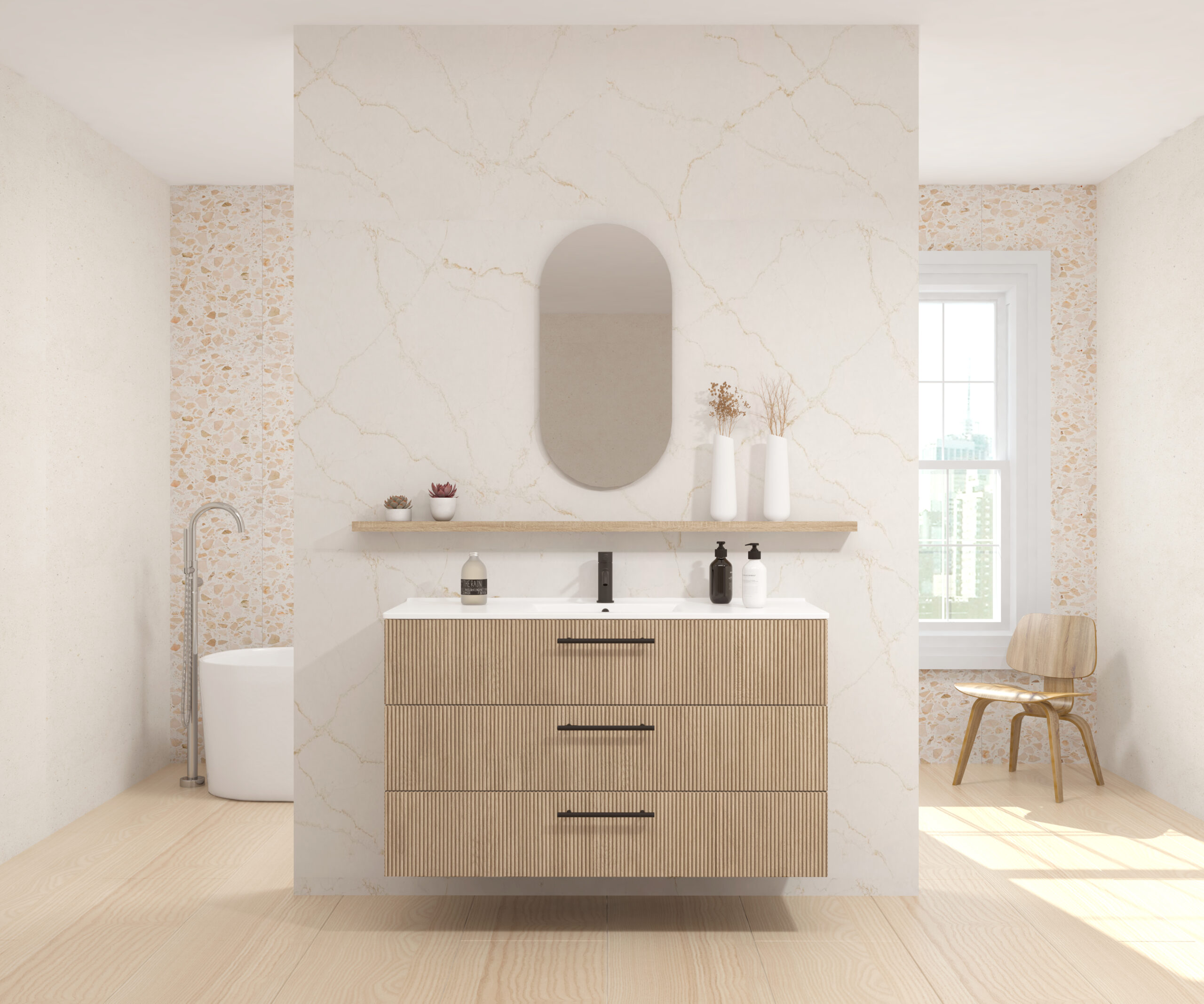 Pack composé d’un meuble sous-vasque suspendu, d’une vasque et d’un miroir design capsule.