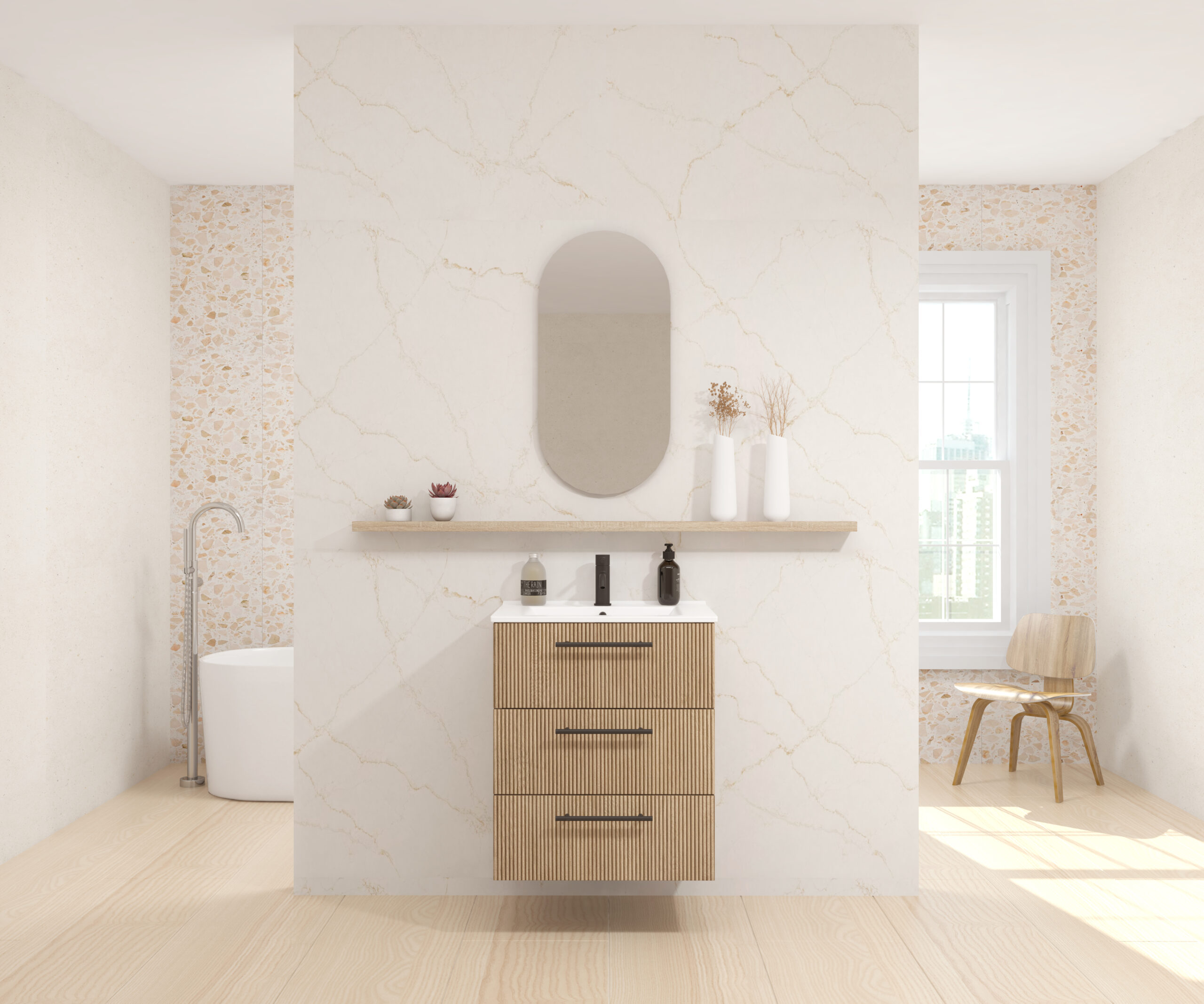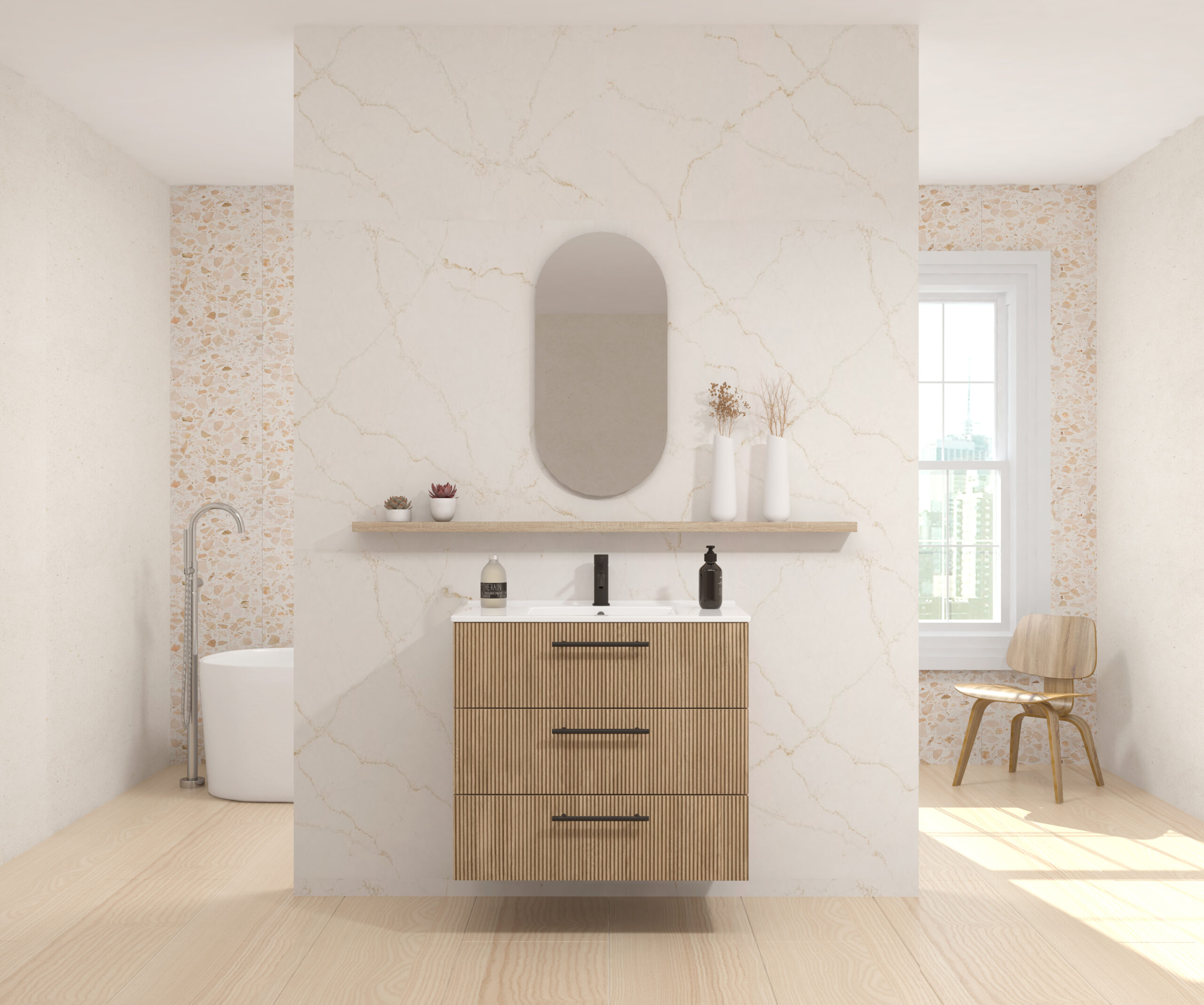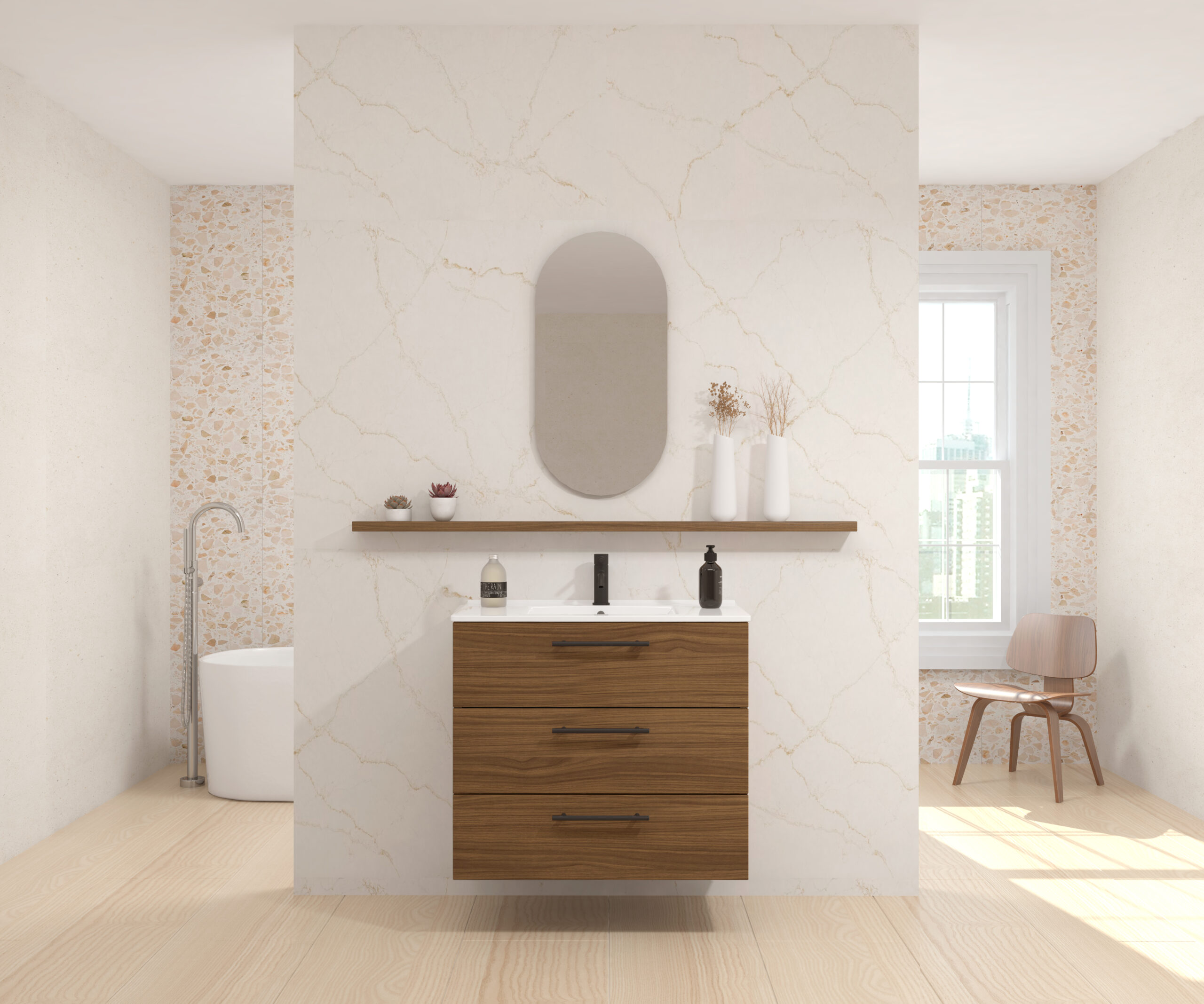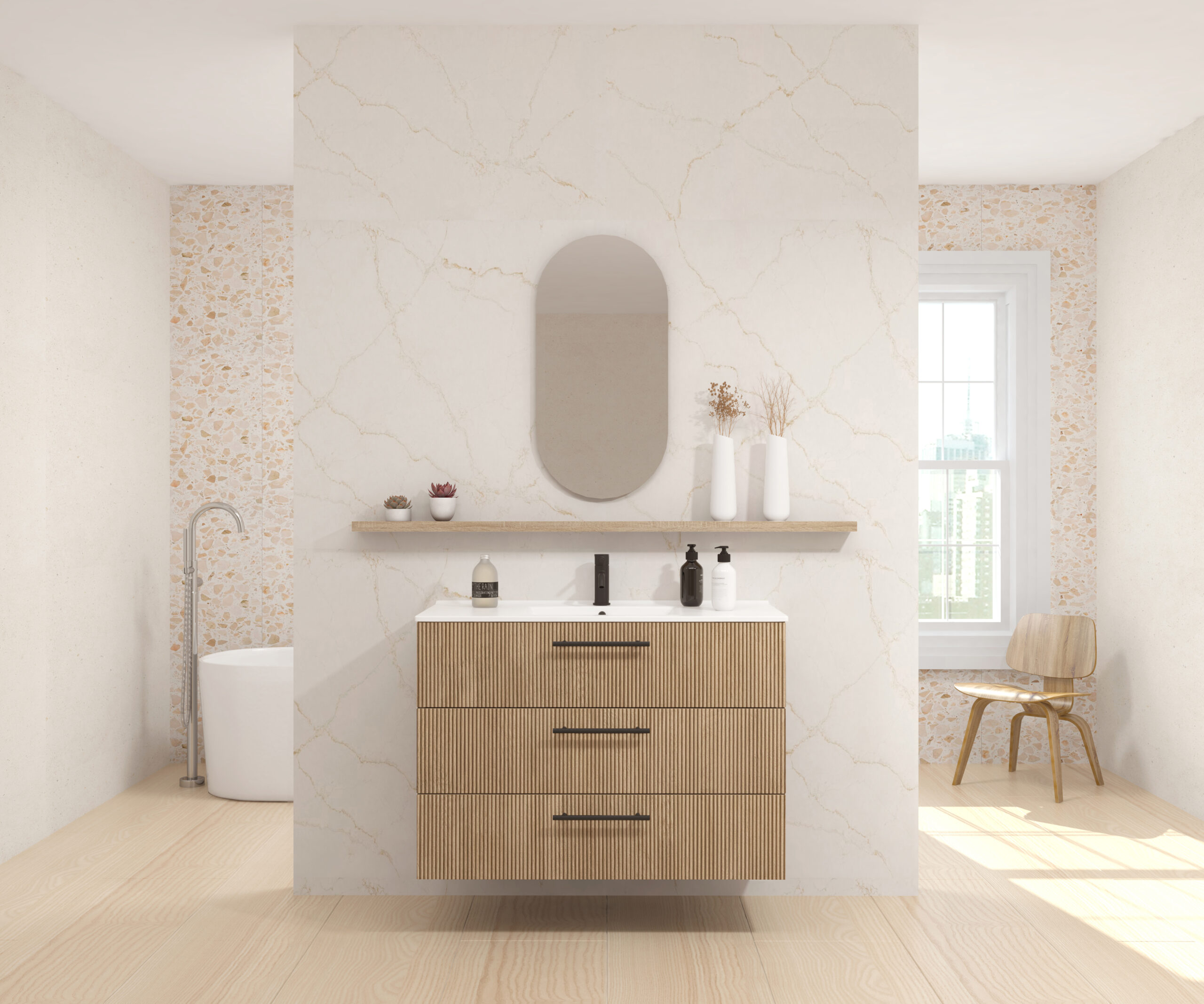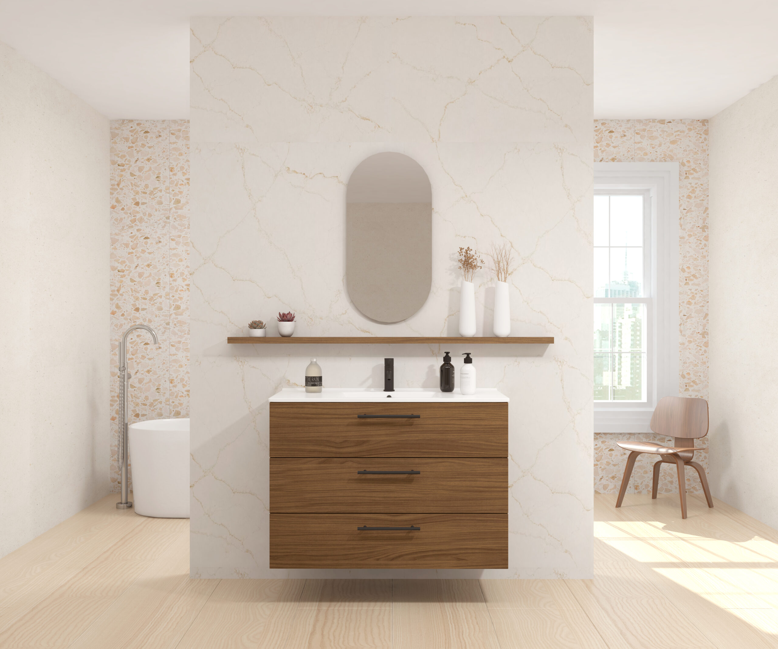 Pack composé d’un meuble sous-vasque suspendu, d’une vasque et d’un miroir design capsule.