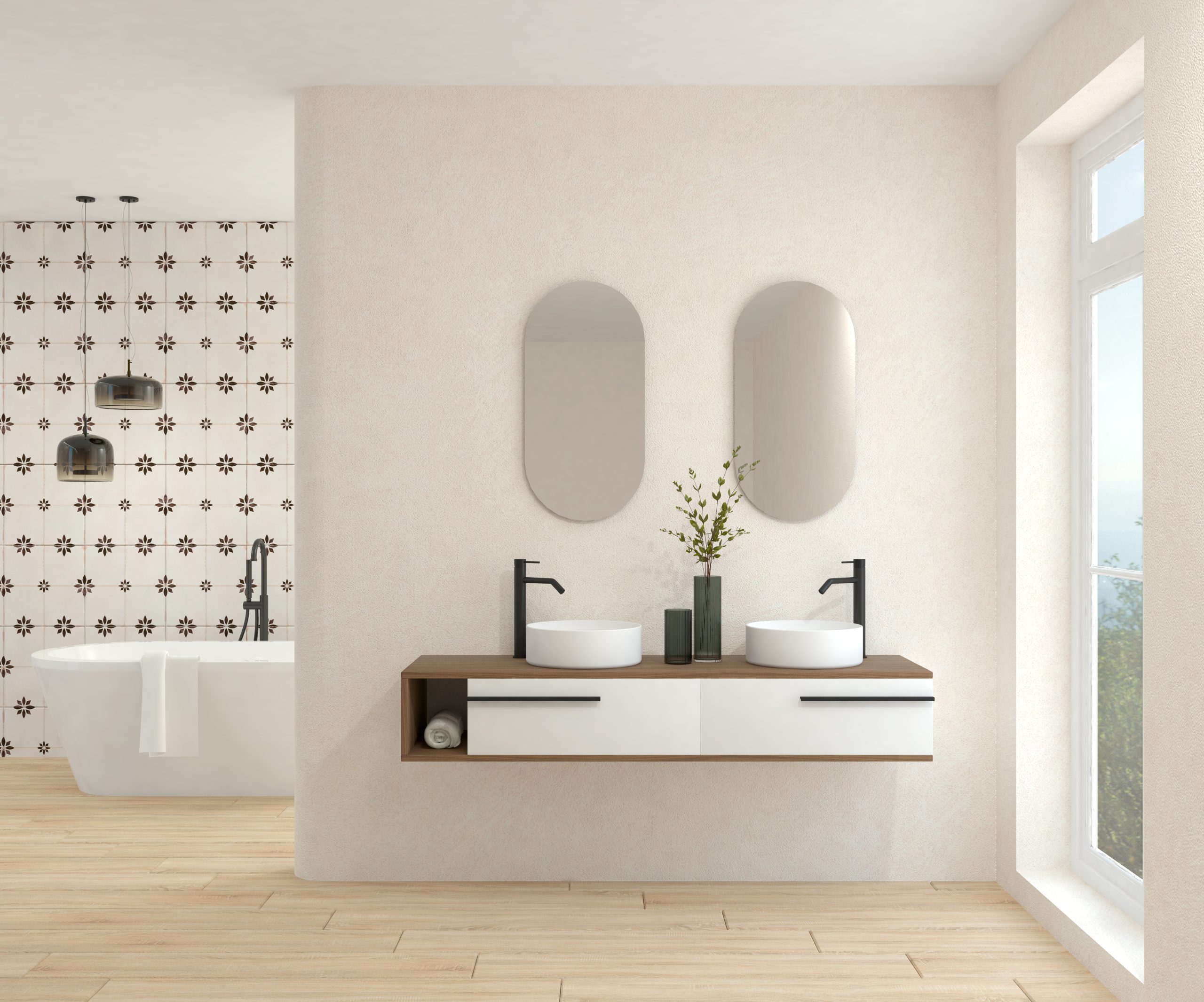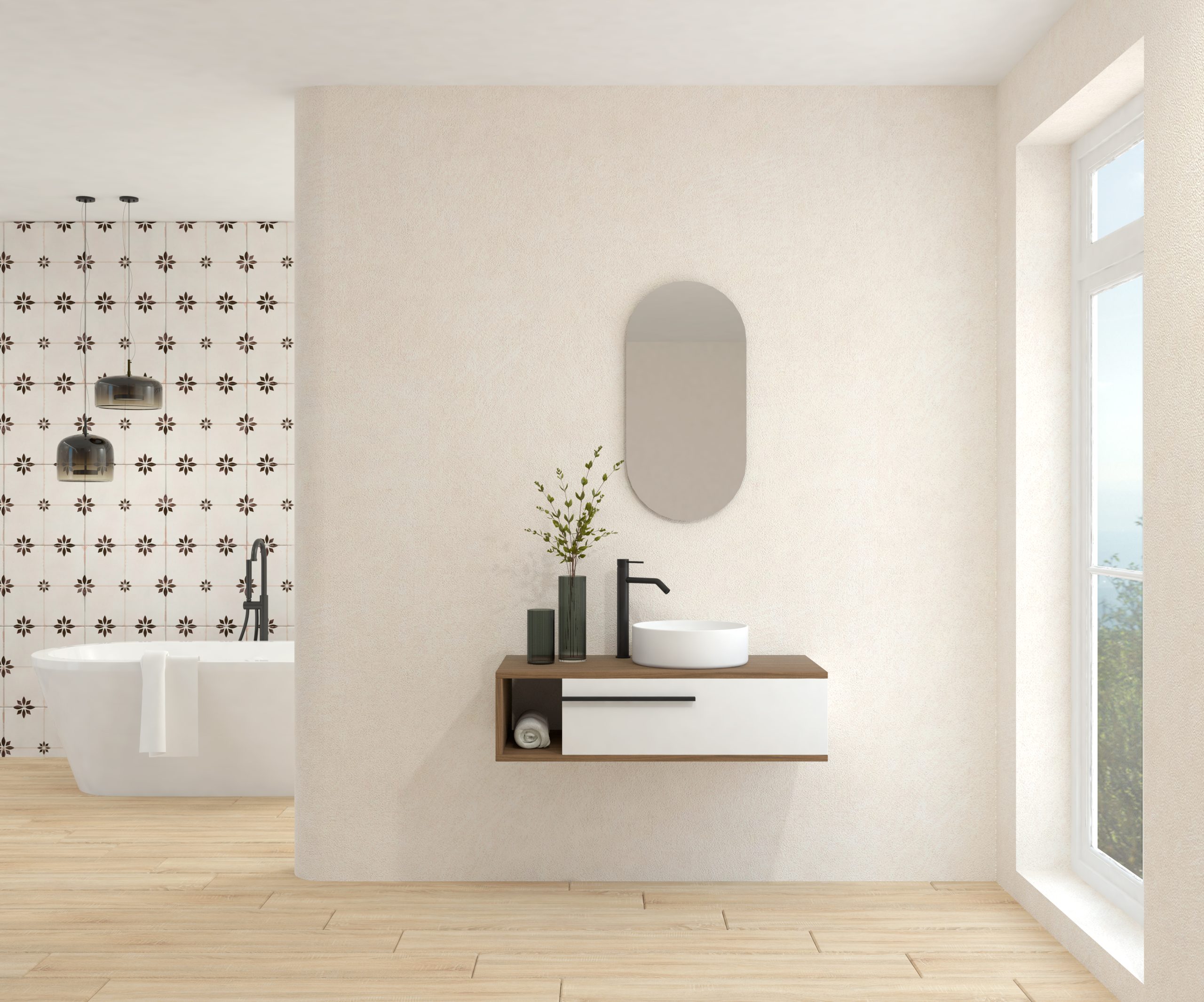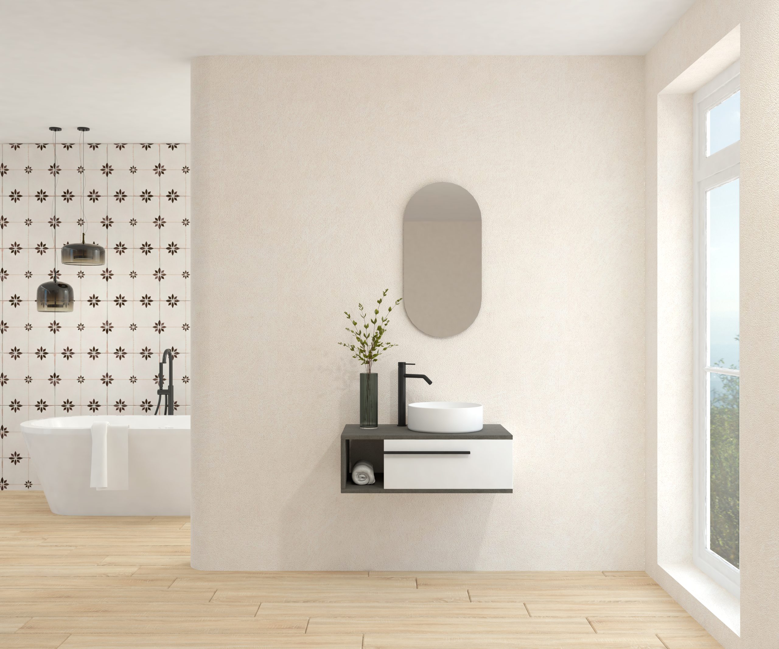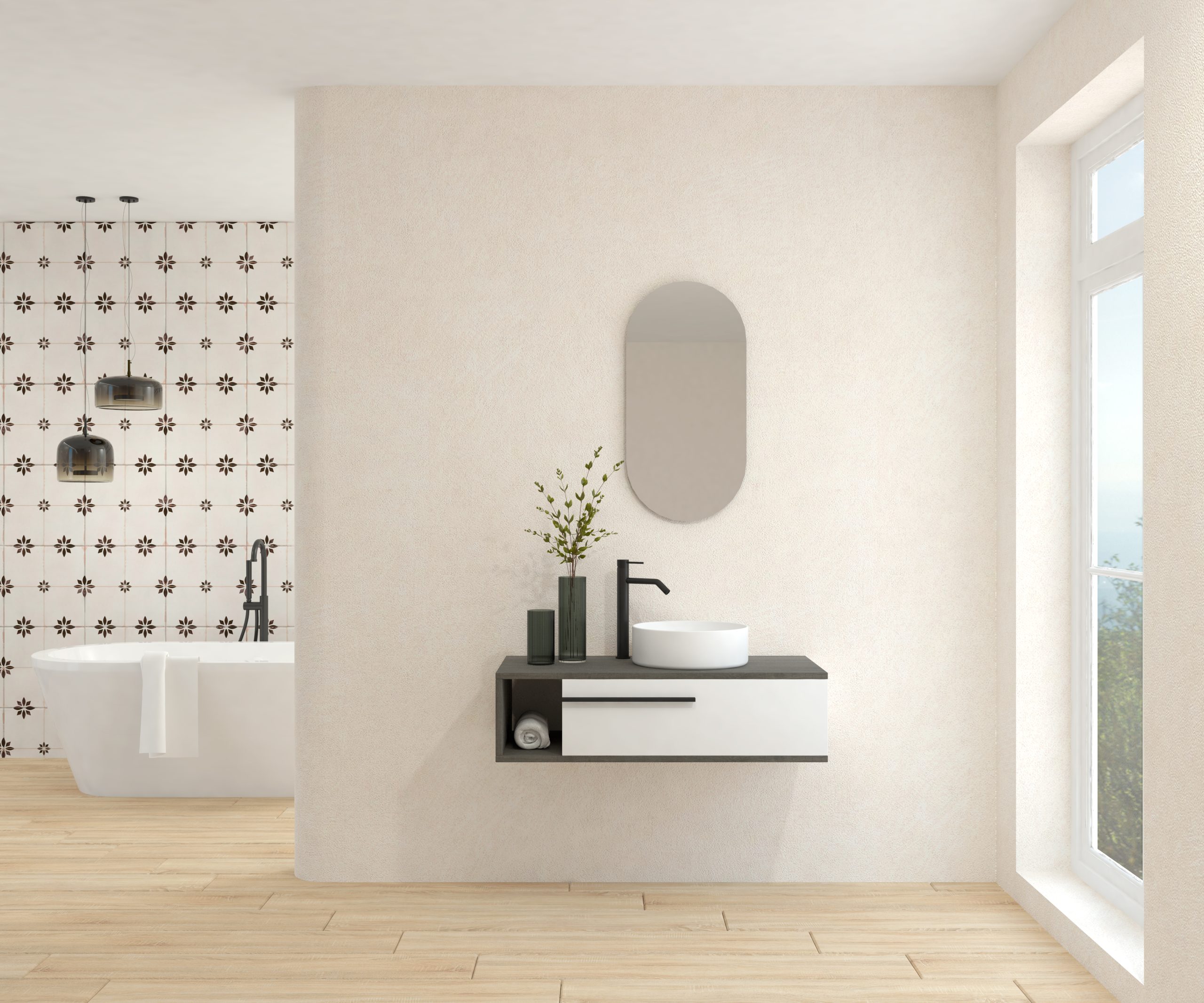 Vasque à poser en céramique incluse. Miroir design capsule inclus. Livré monté, prêt à être fixé au mur. Tout le matériel de fixation nécessaire est inclus. Fabriqué en Espagne. Robinet et siphon non inclus.