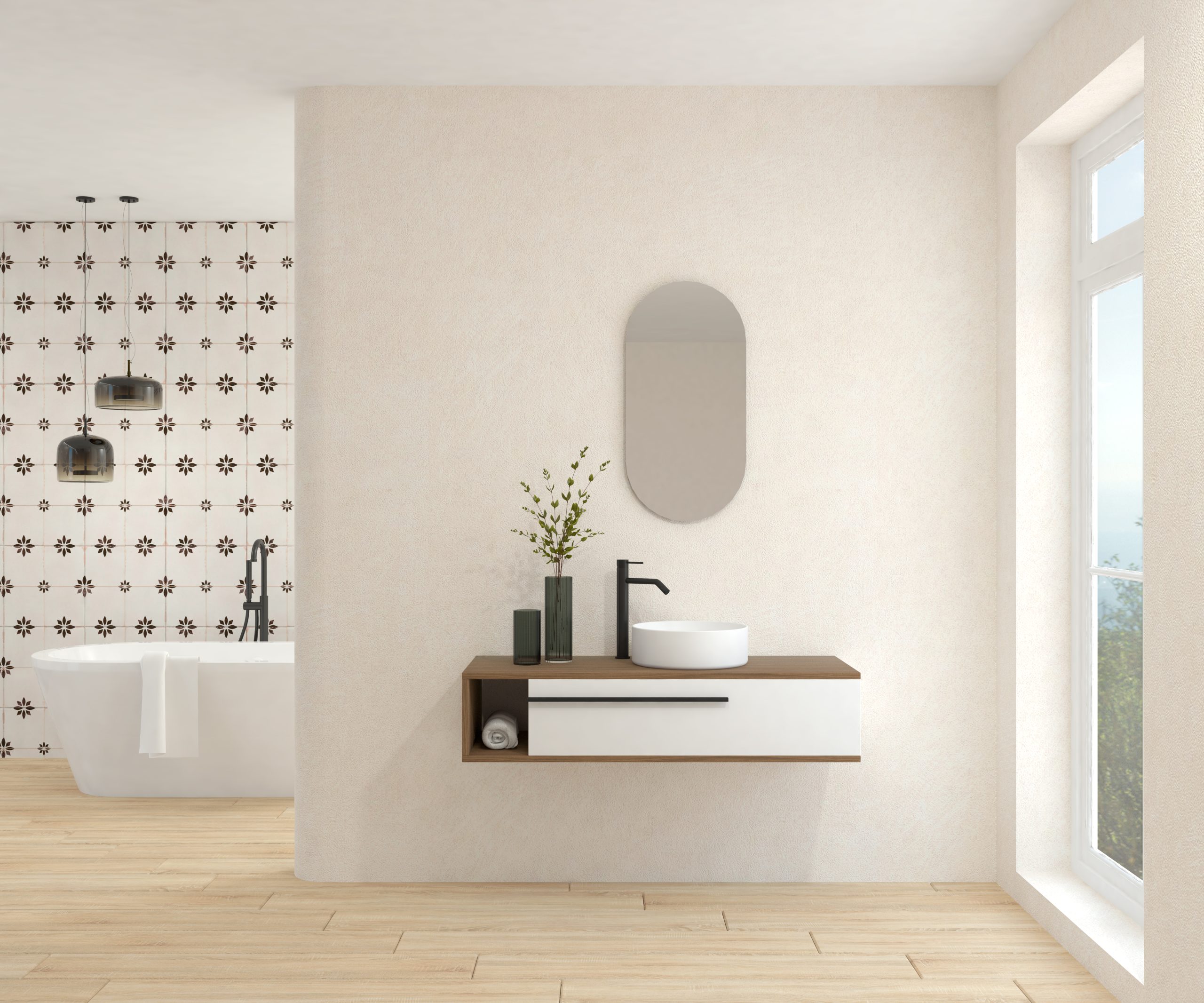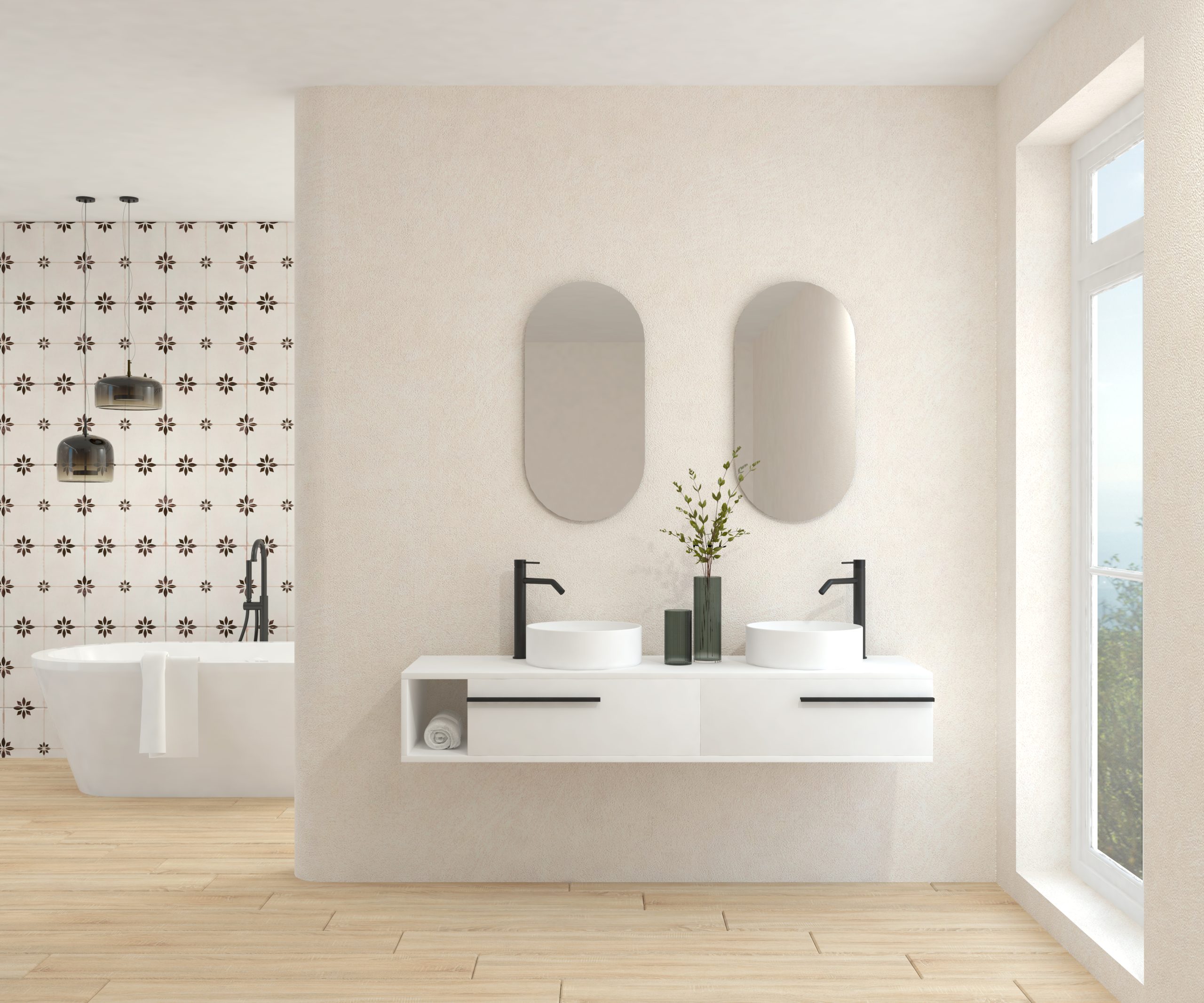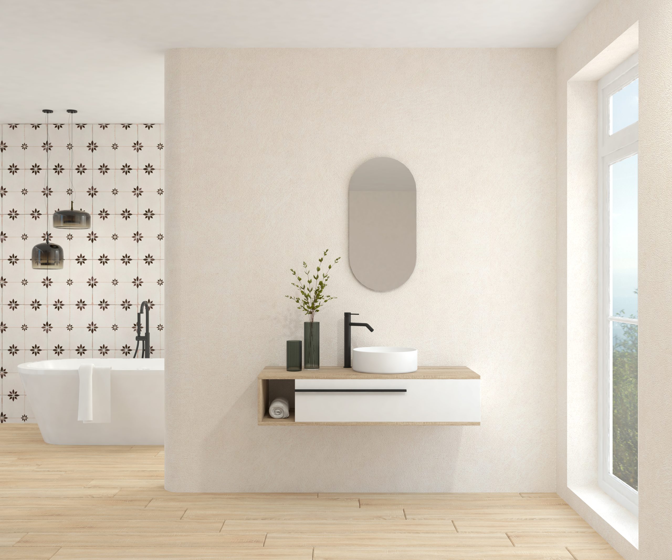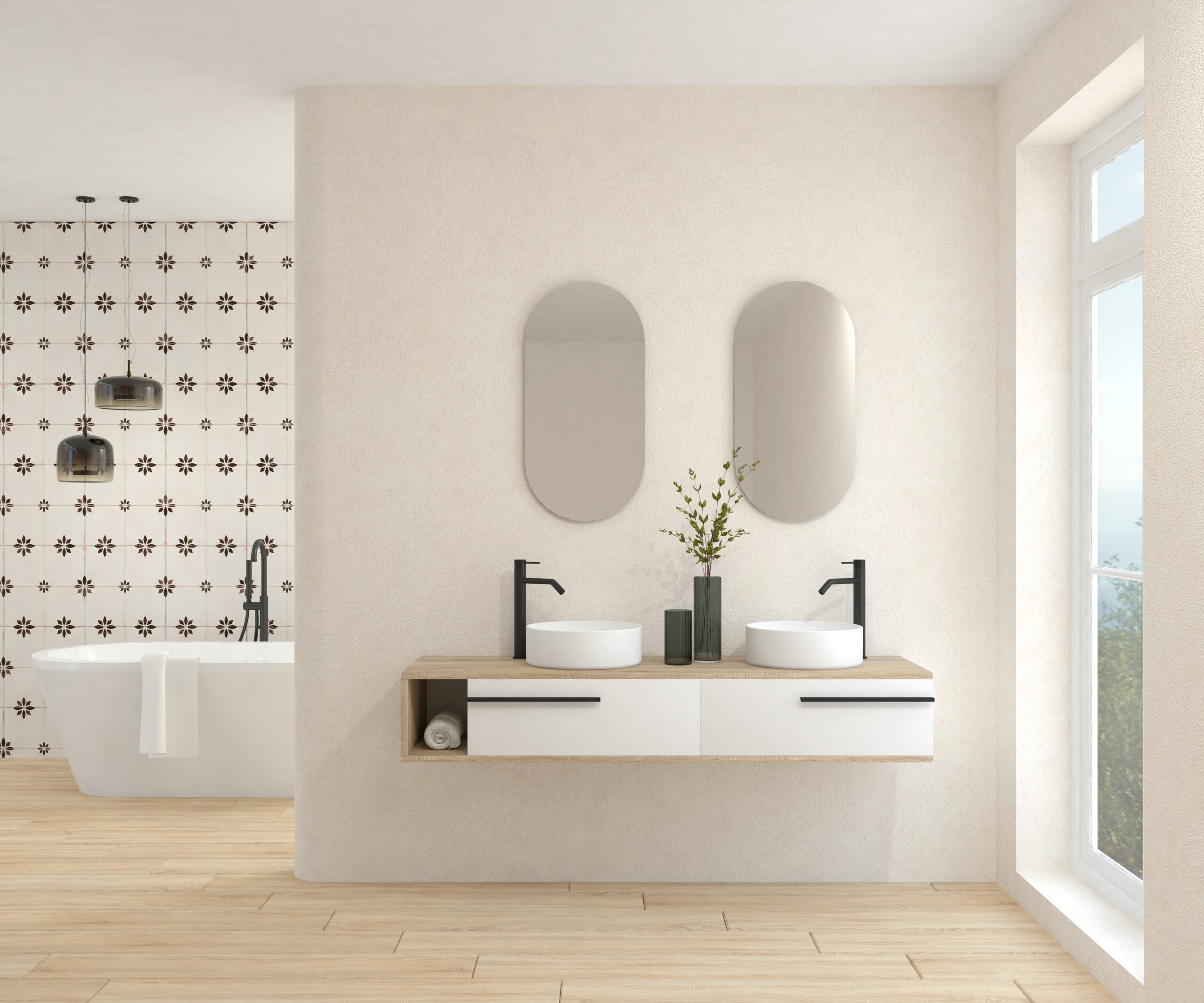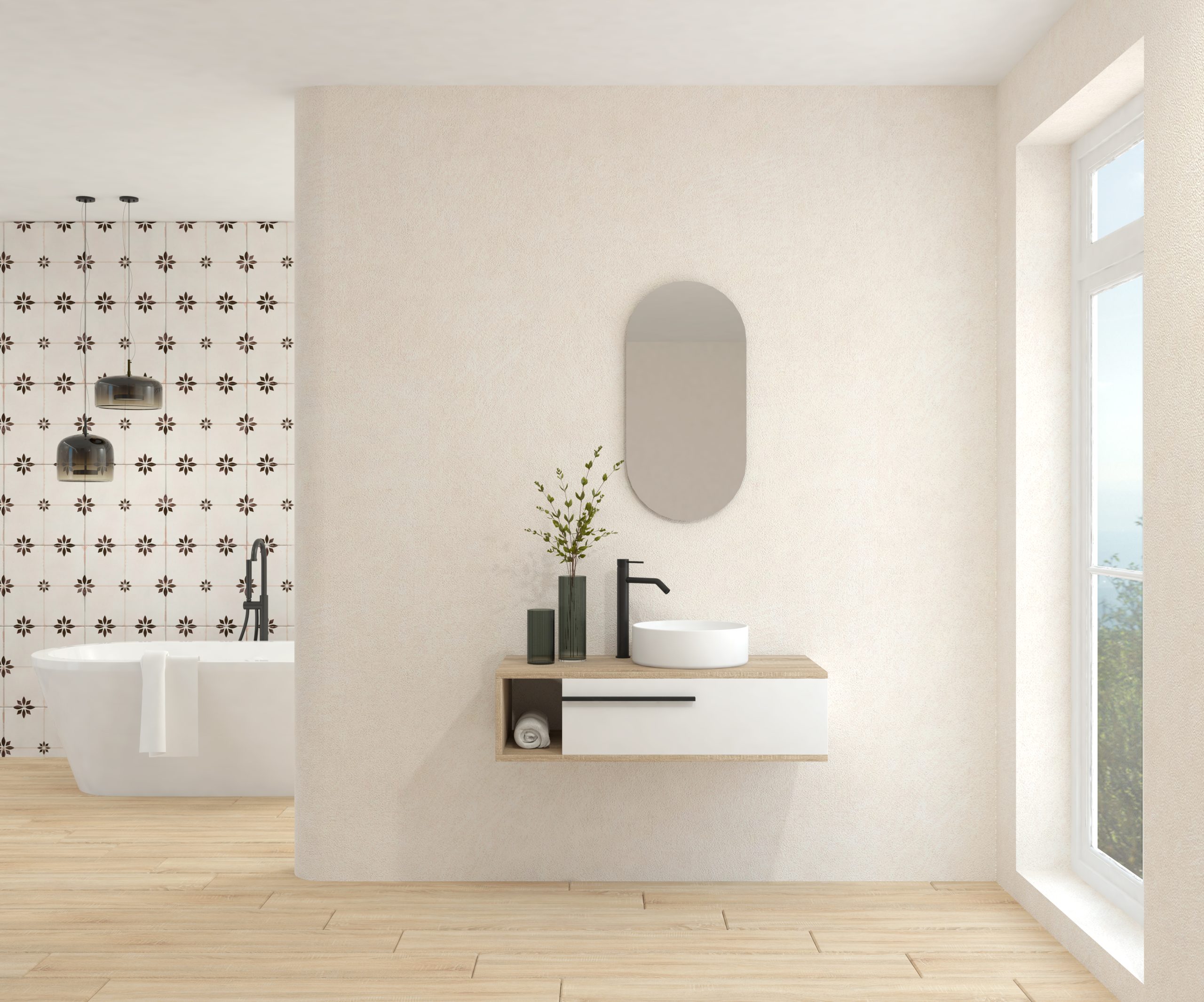 Vasque à poser en céramique incluse. Miroir design capsule inclus. Livré monté, prêt à être fixé au mur. Tout le matériel de fixation nécessaire est inclus. Fabriqué en Espagne. Robinet et siphon non inclus.