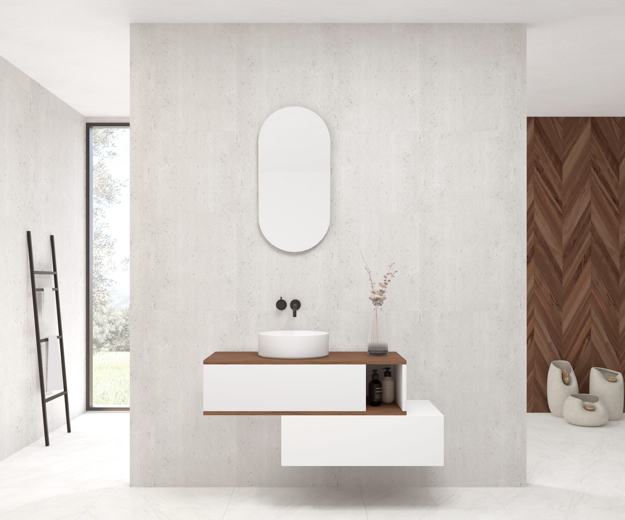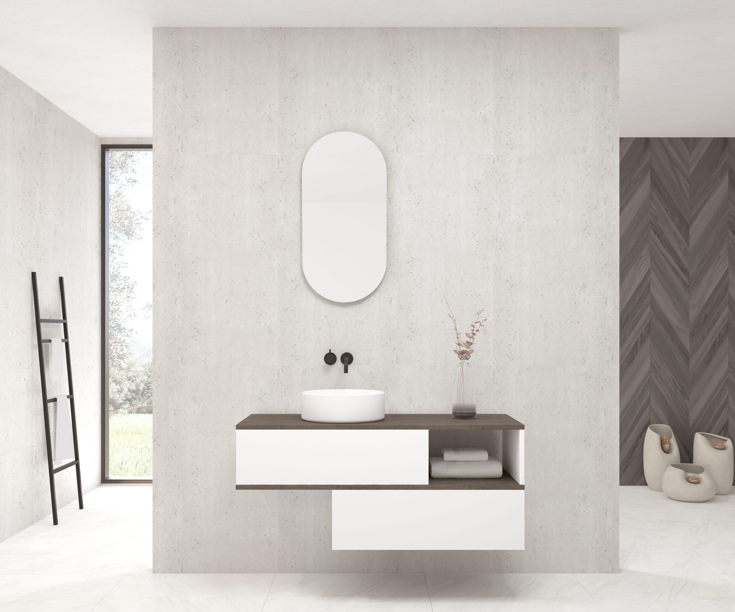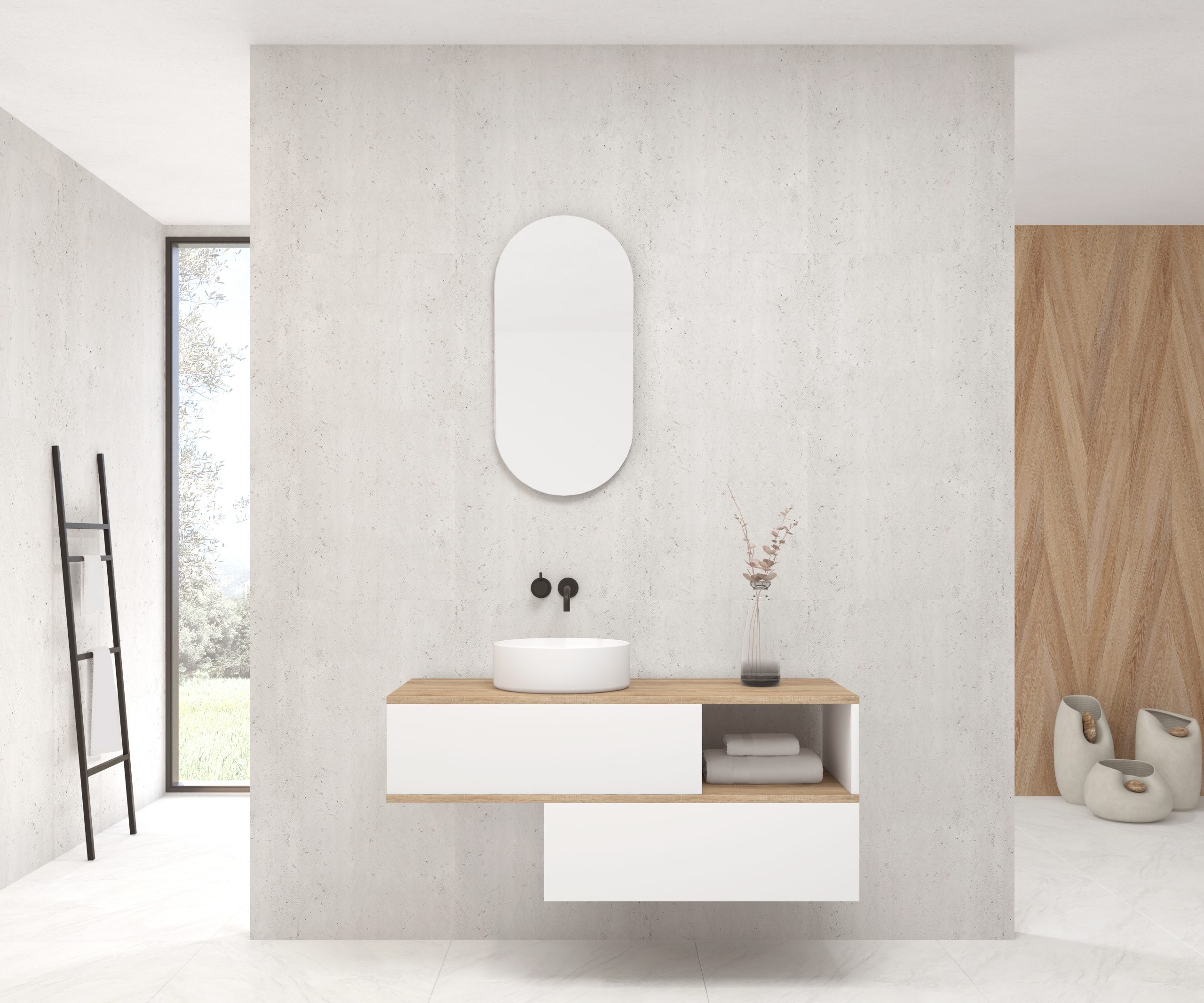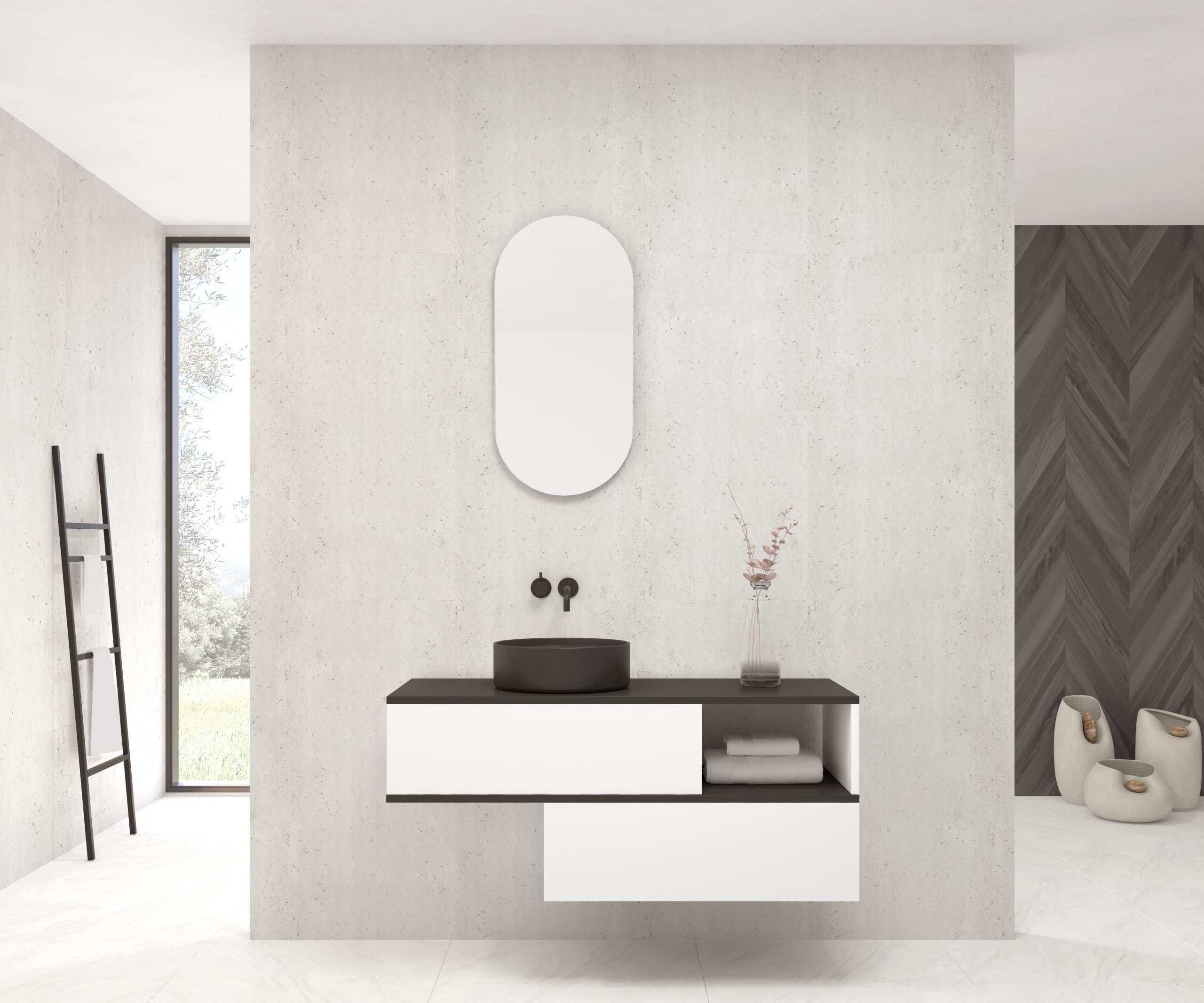 Ensemble composé d’un meuble sous-vasque suspendu, d’une vasque et d’un miroir design capsule.