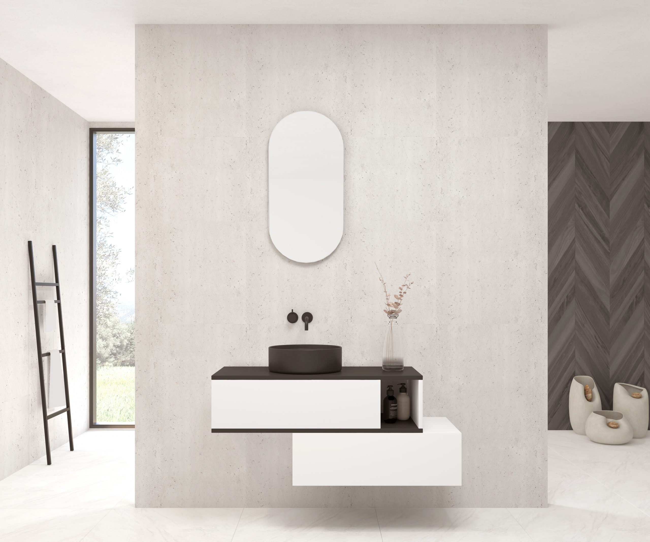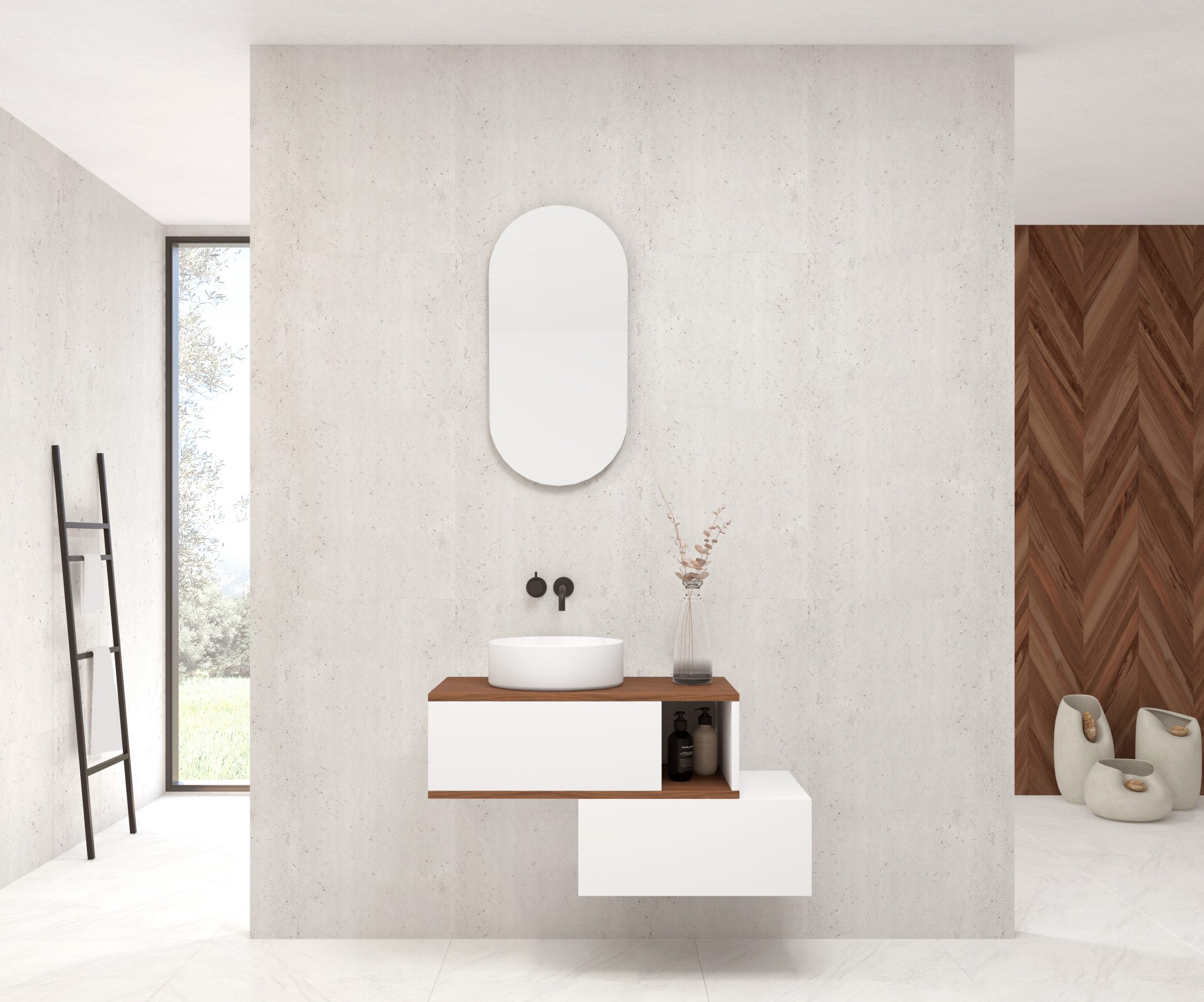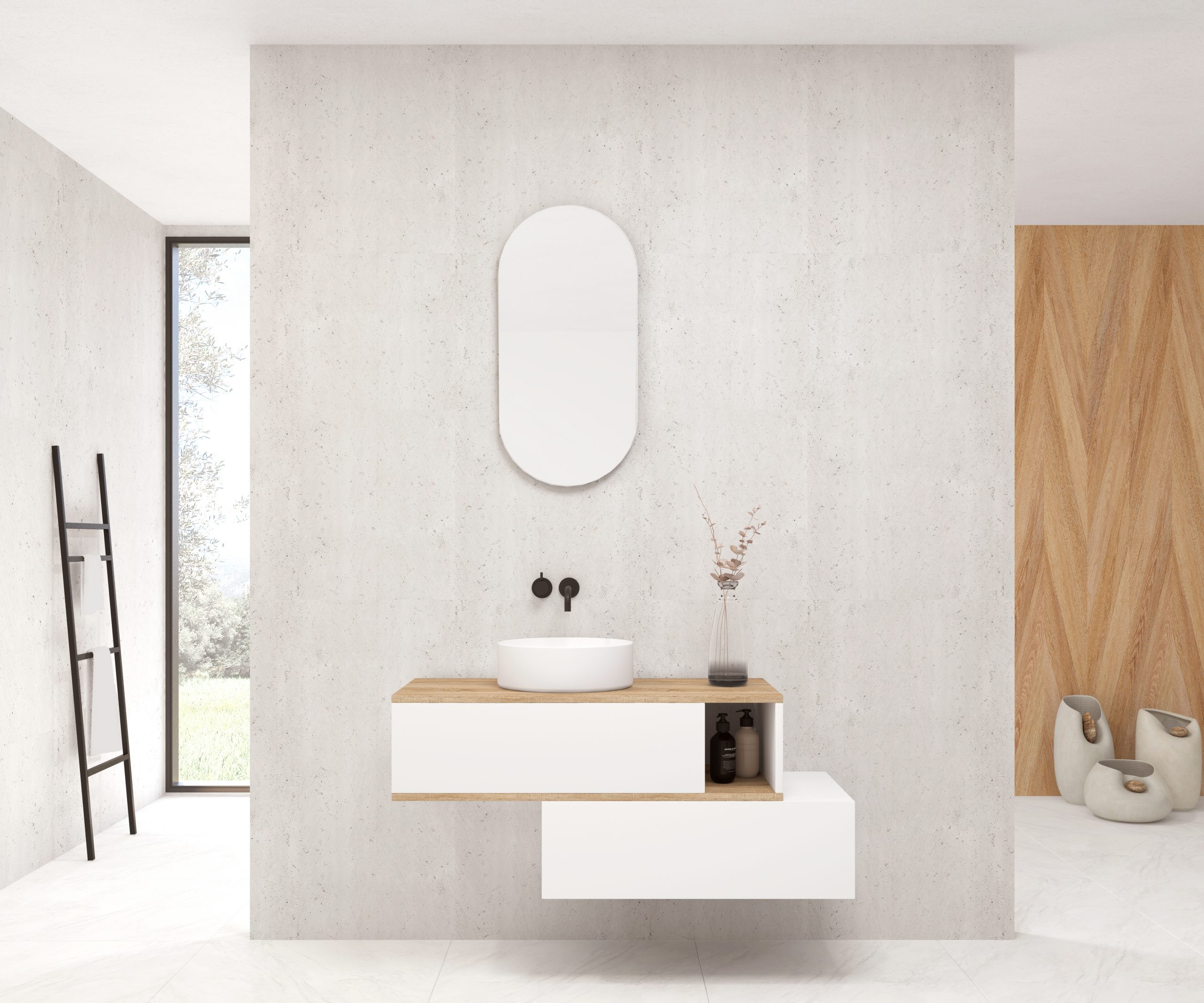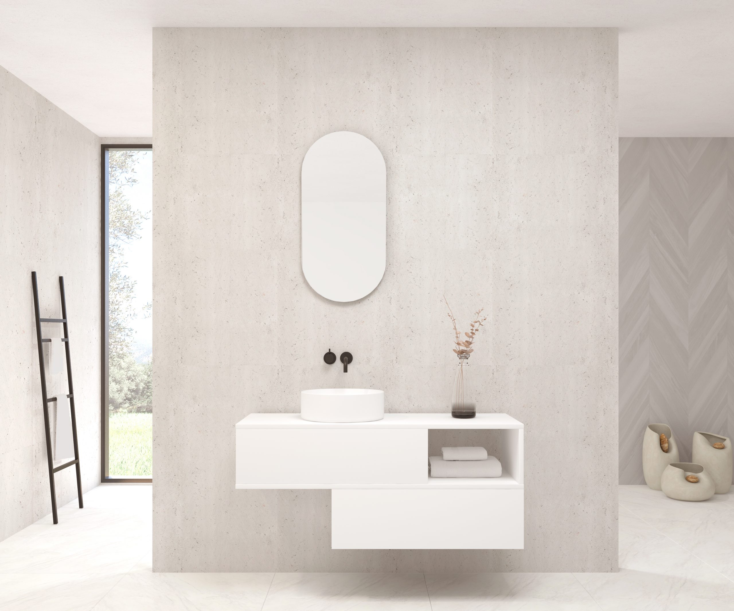Ensemble composé d’un meuble sous-vasque suspendu, d’une vasque et d’un miroir design capsule.