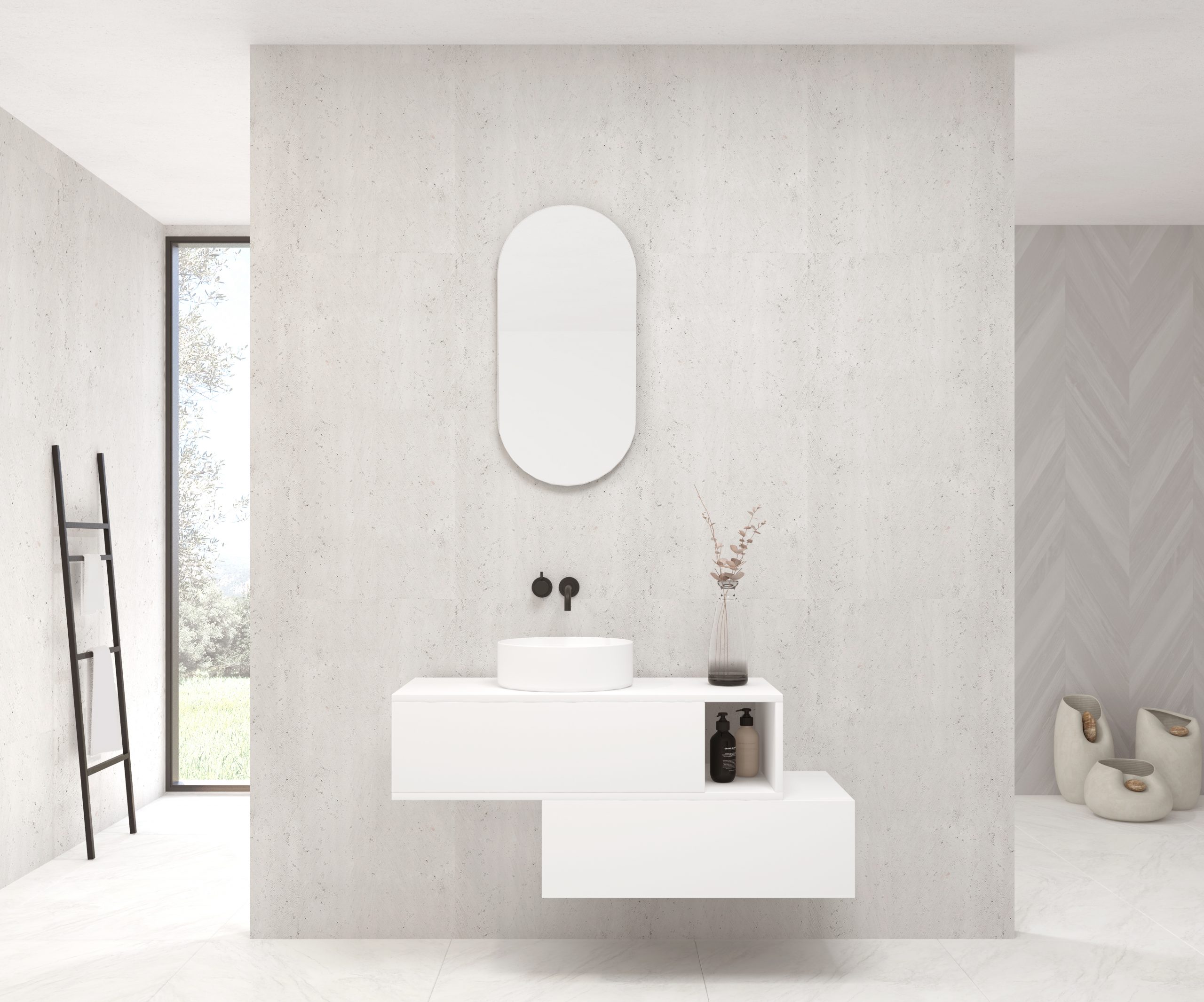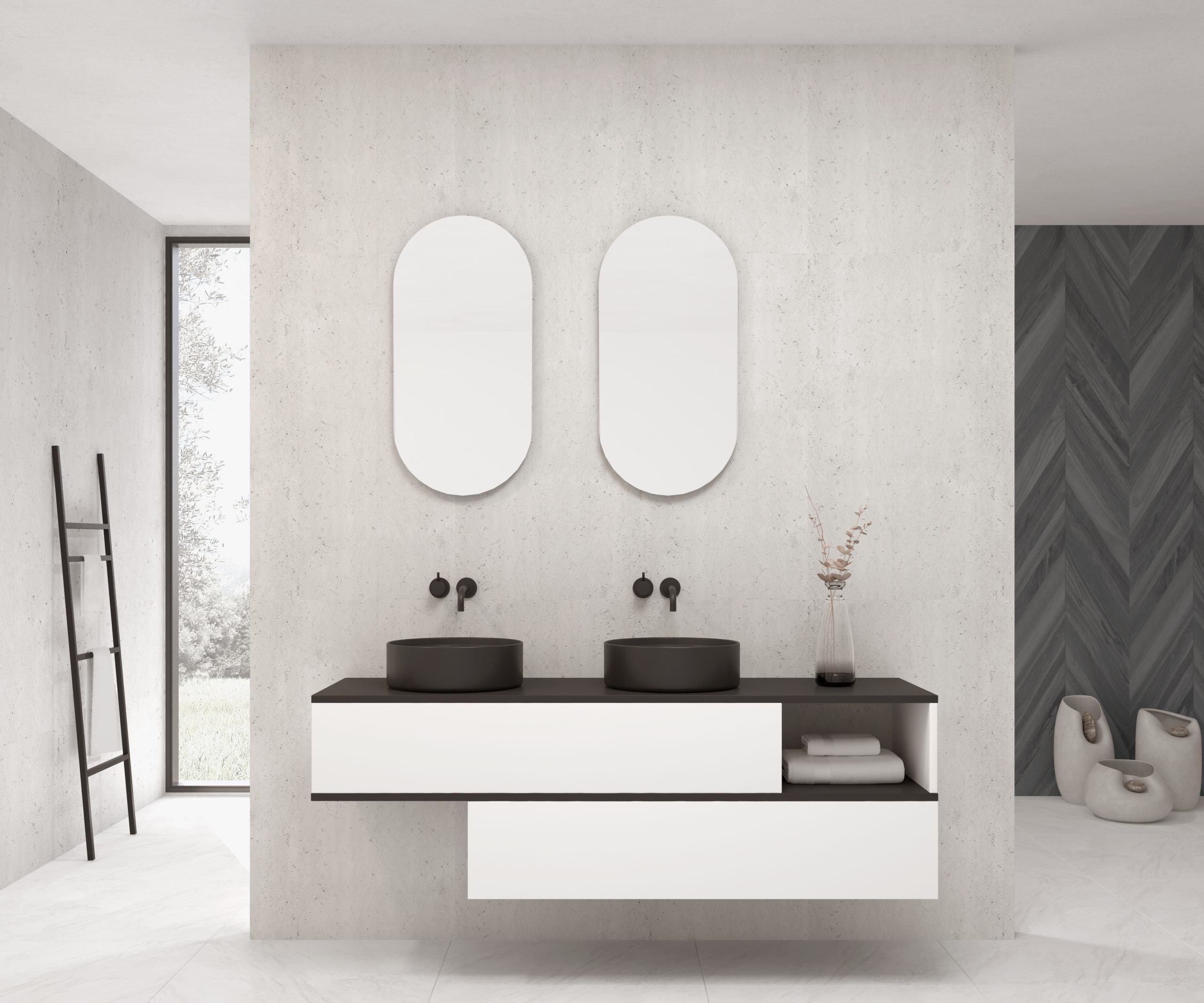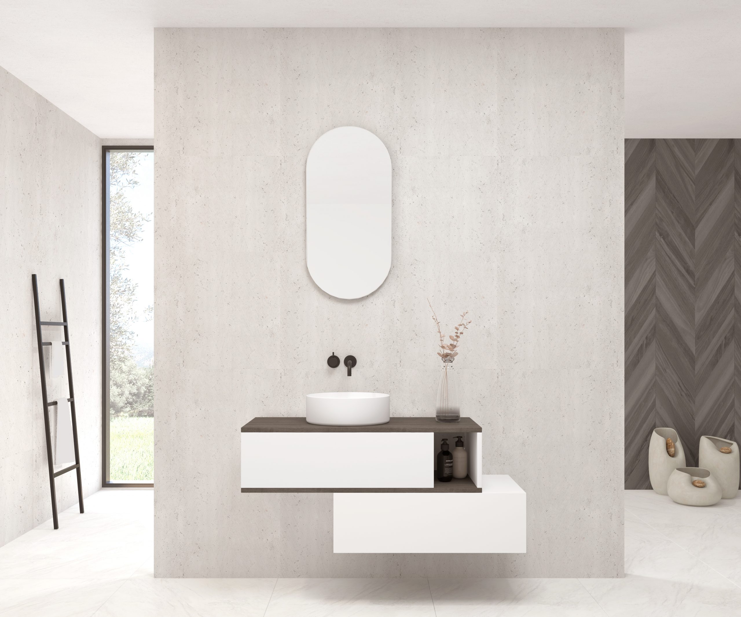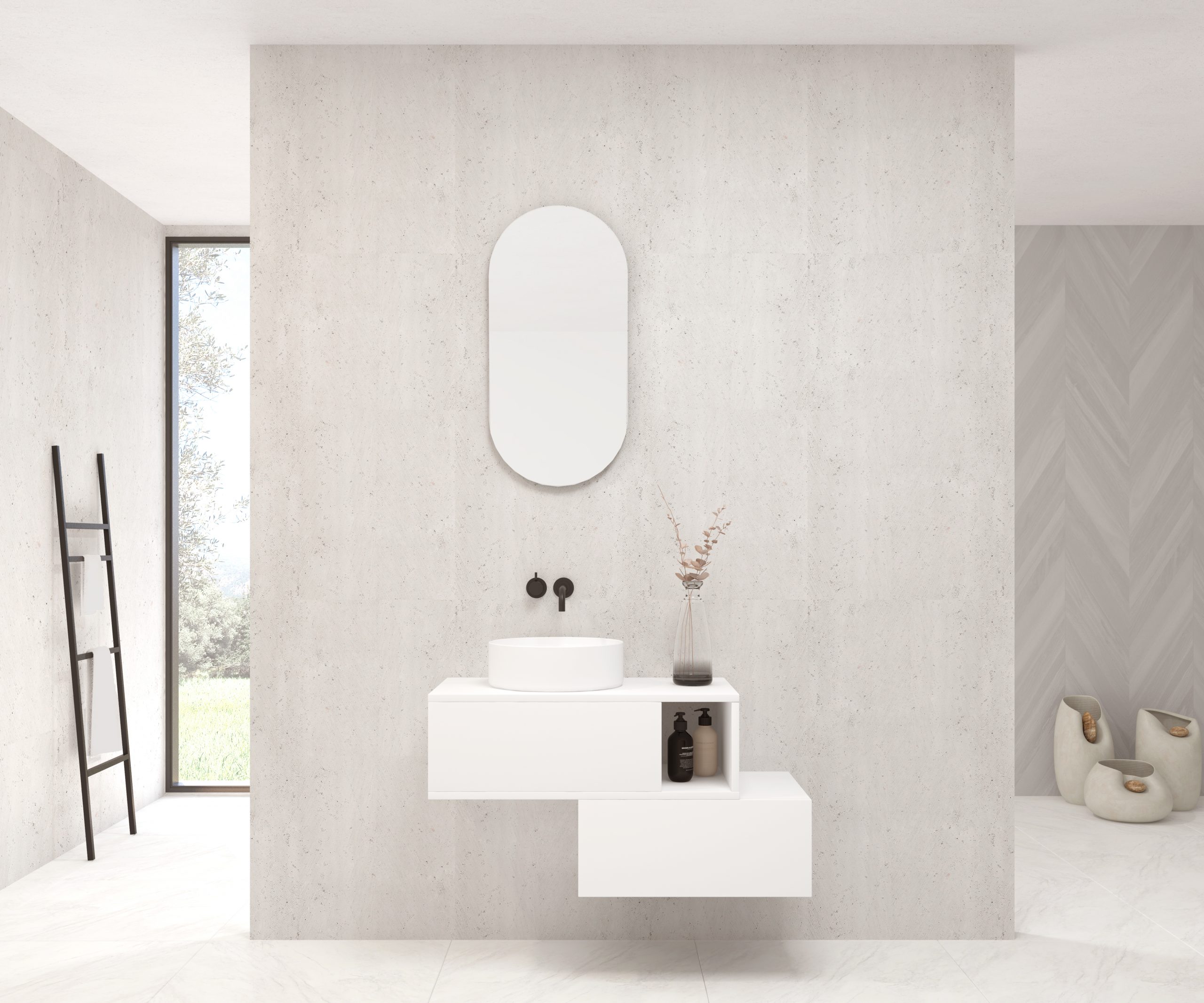 Ensemble composé d’un meuble sous-vasque suspendu, d’une vasque et d’un miroir design capsule.
