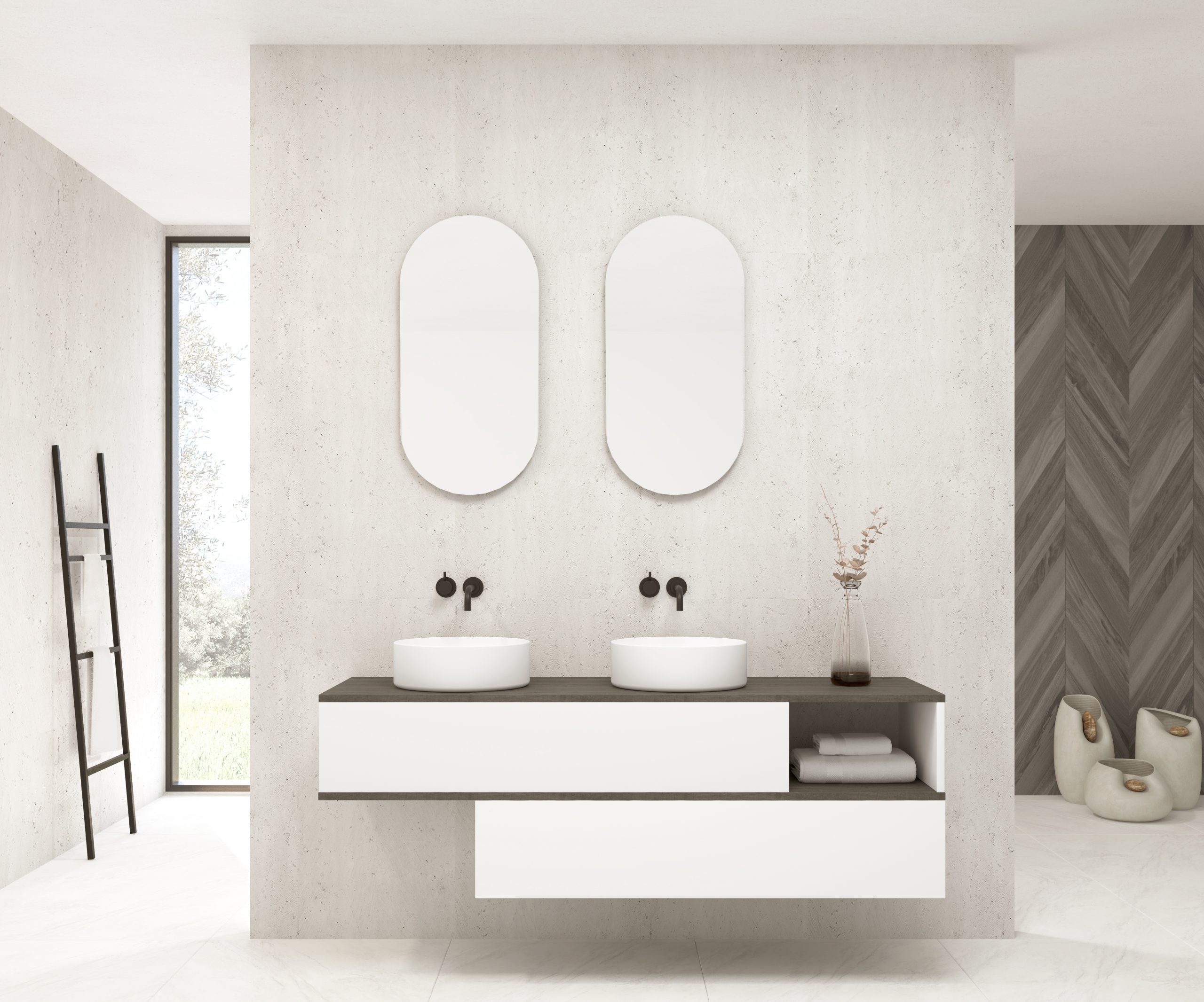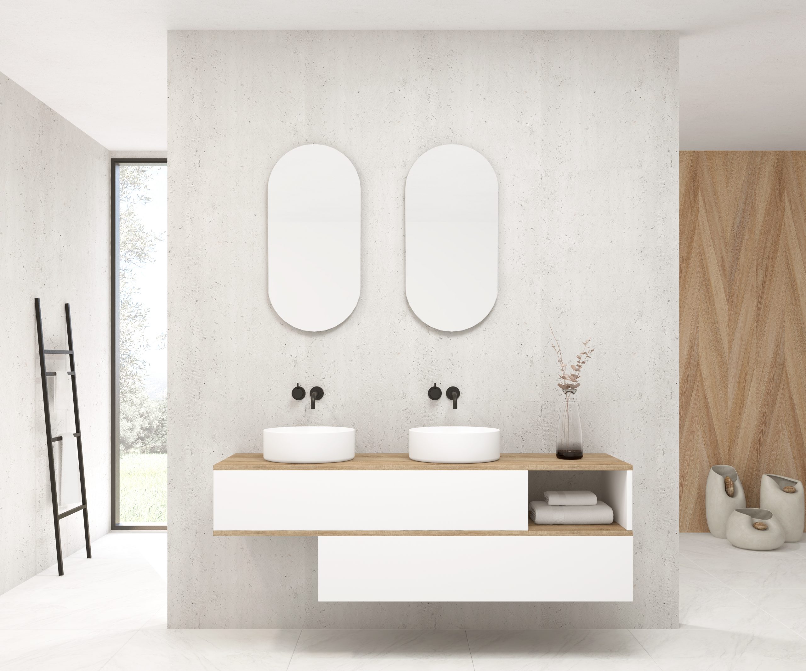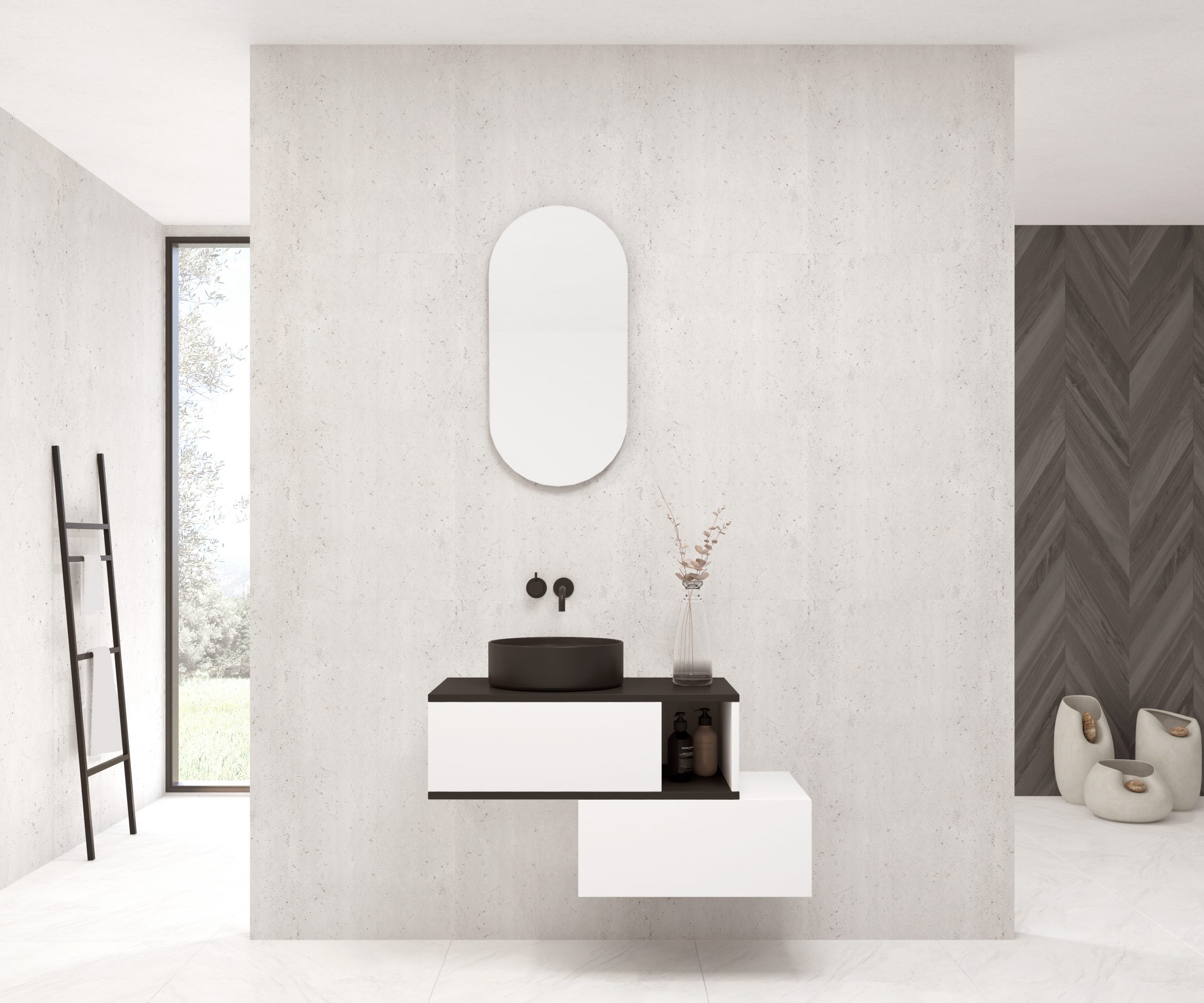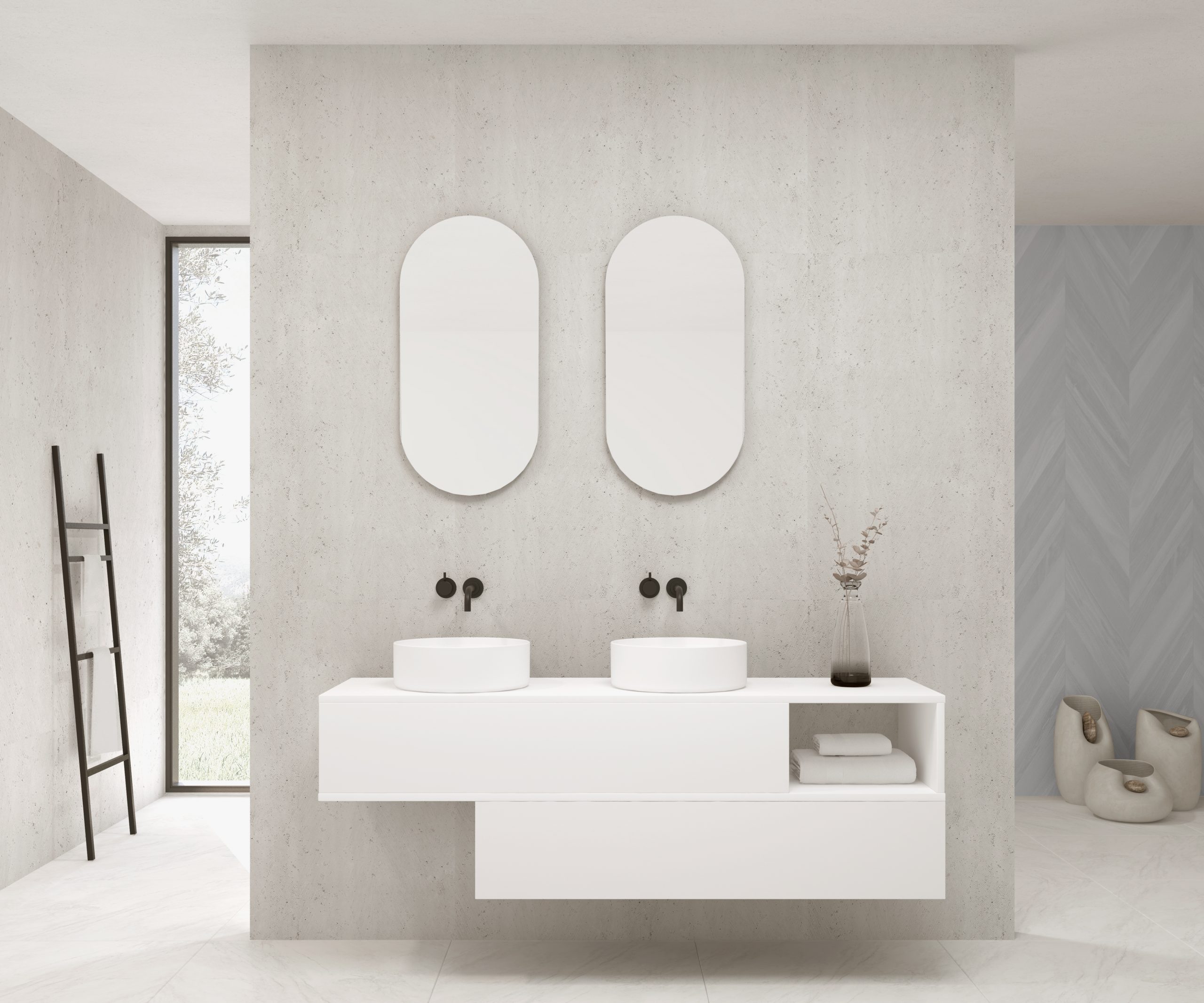 Ensemble composé d’un meuble sous-vasque suspendu, d’une vasque et d’un miroir design capsule.