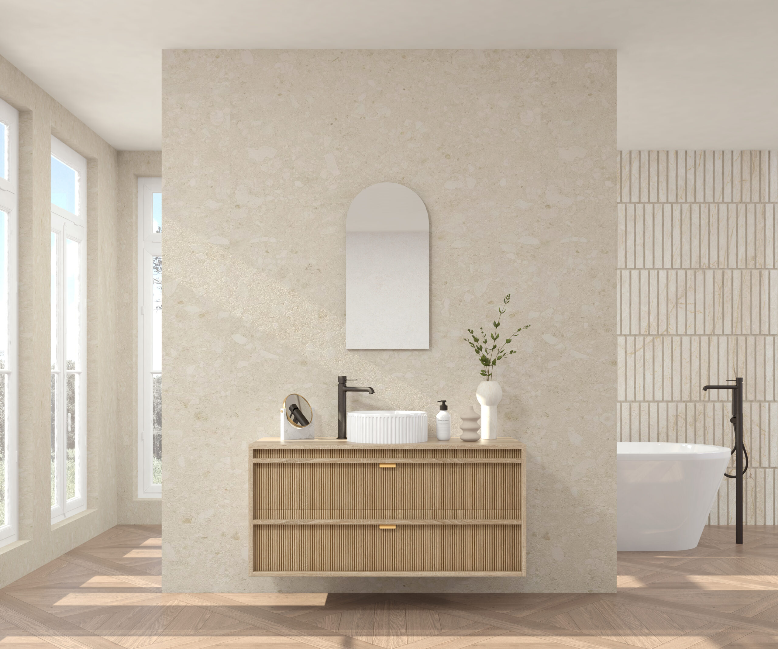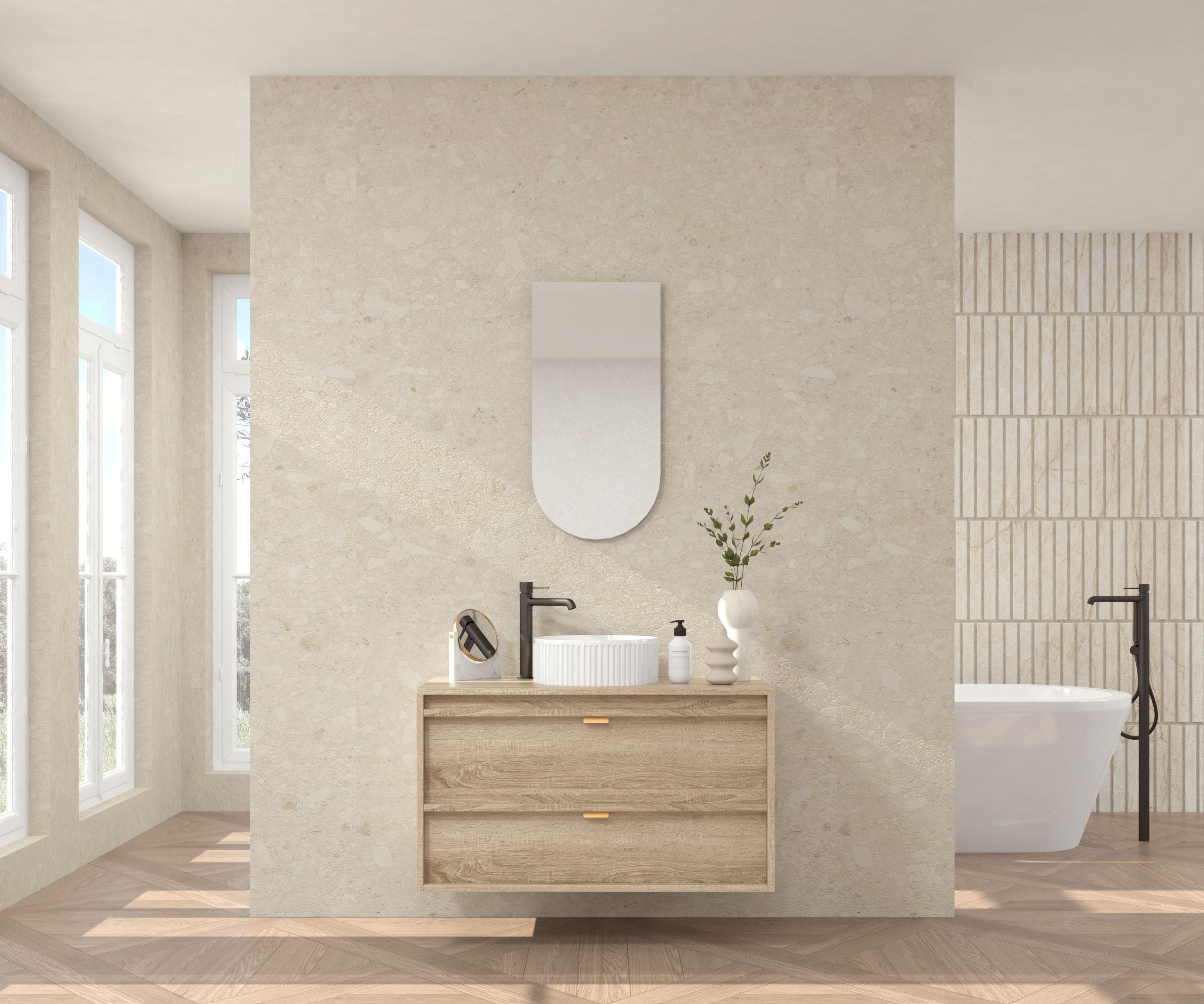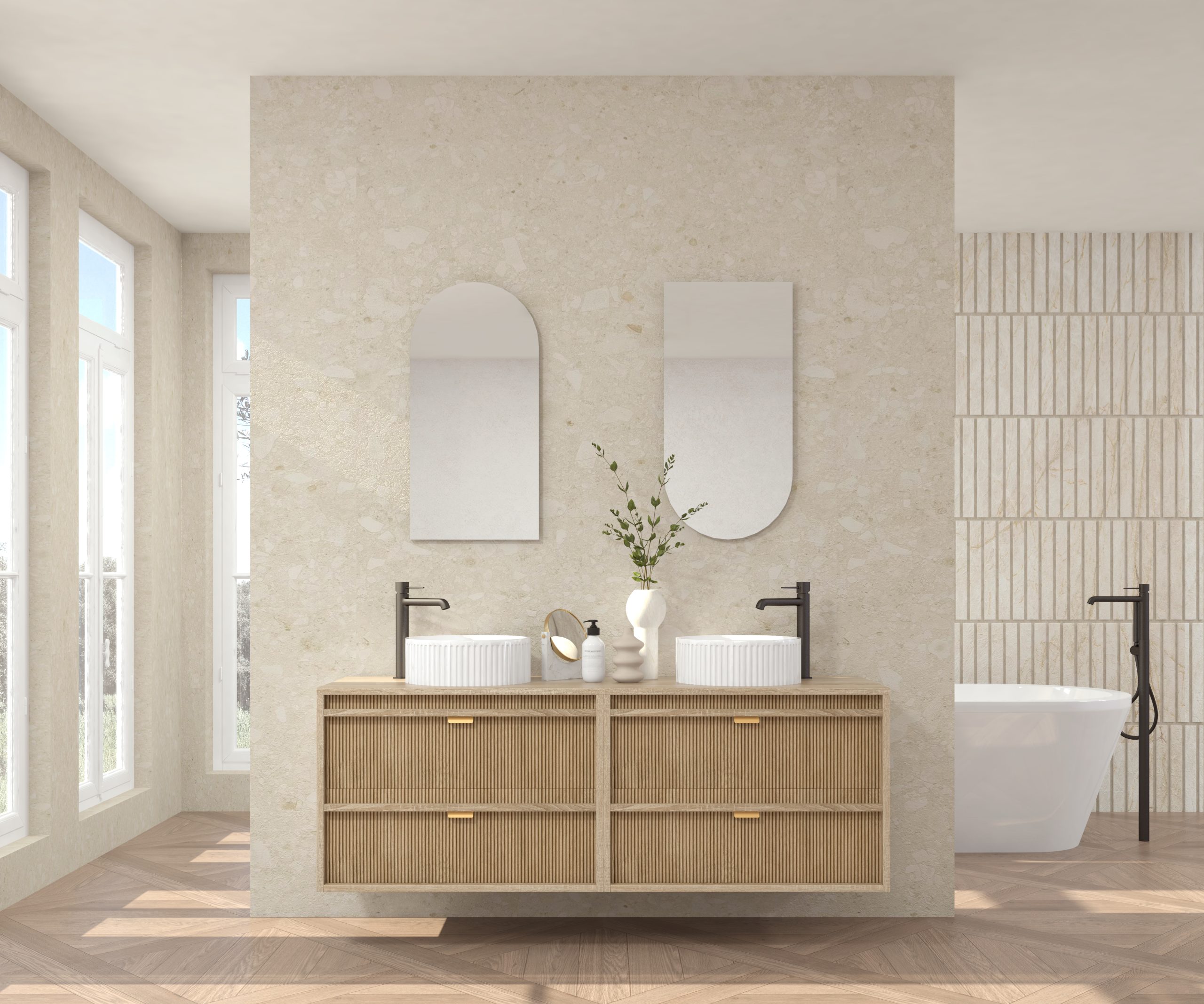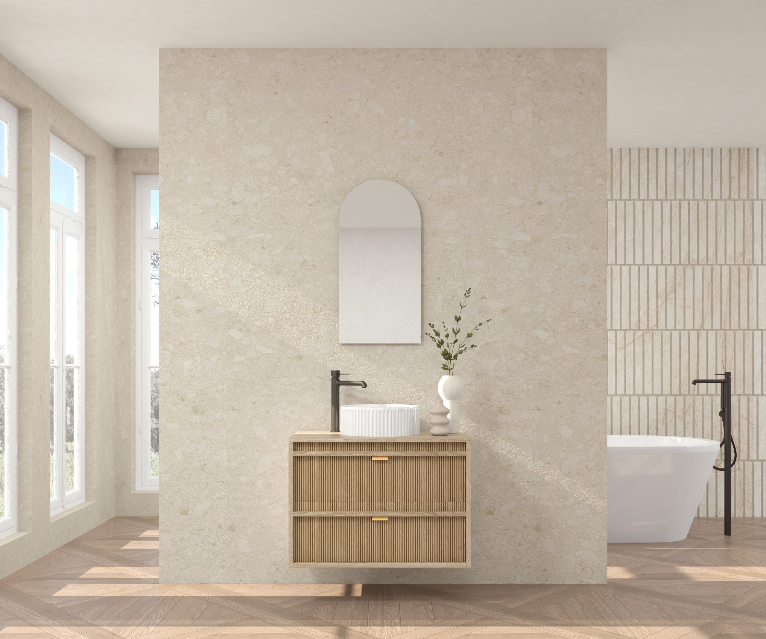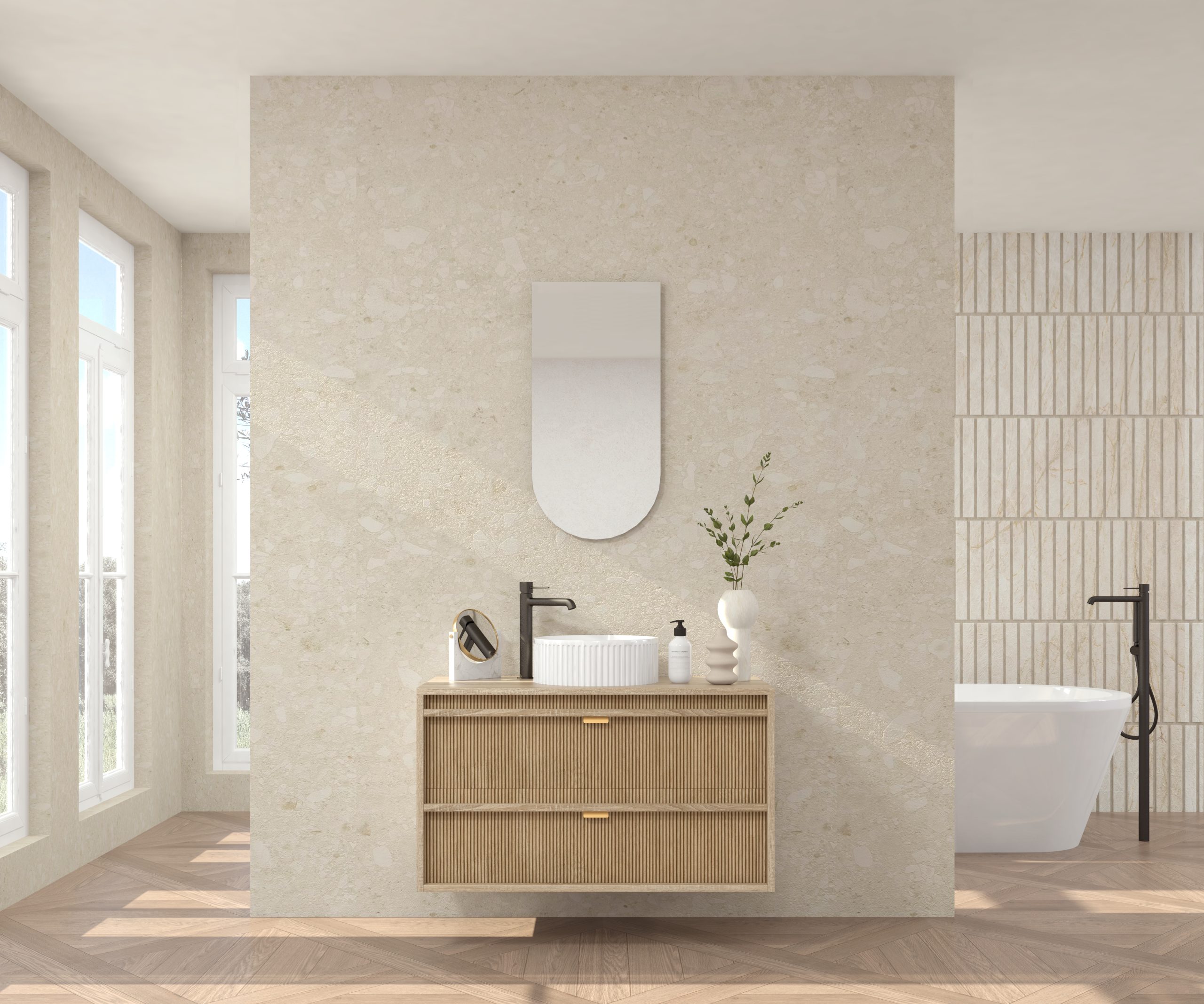 Pack composé d’un meuble sous-vasque suspendu, d’une vasque striée et d’un miroir Alma.