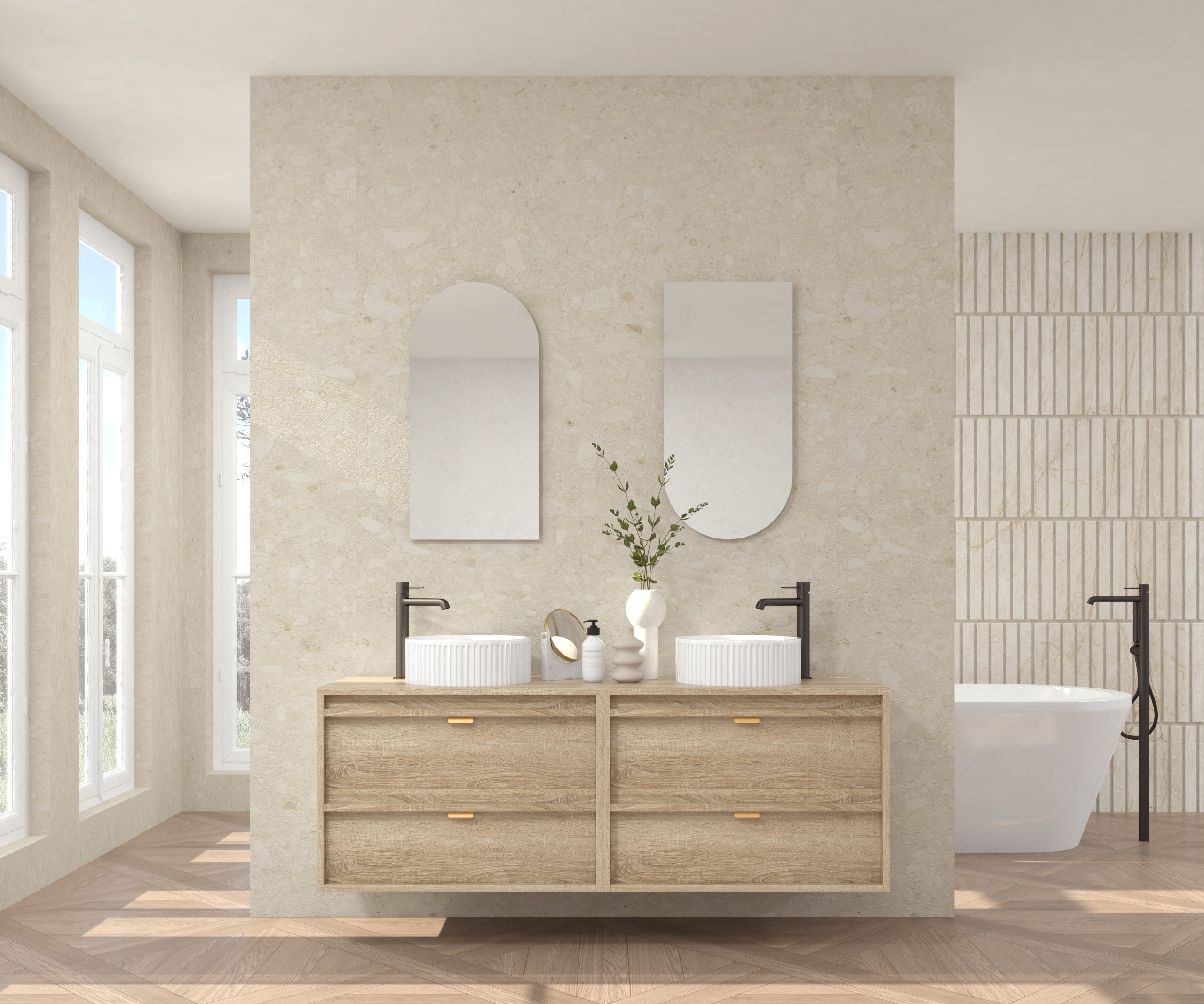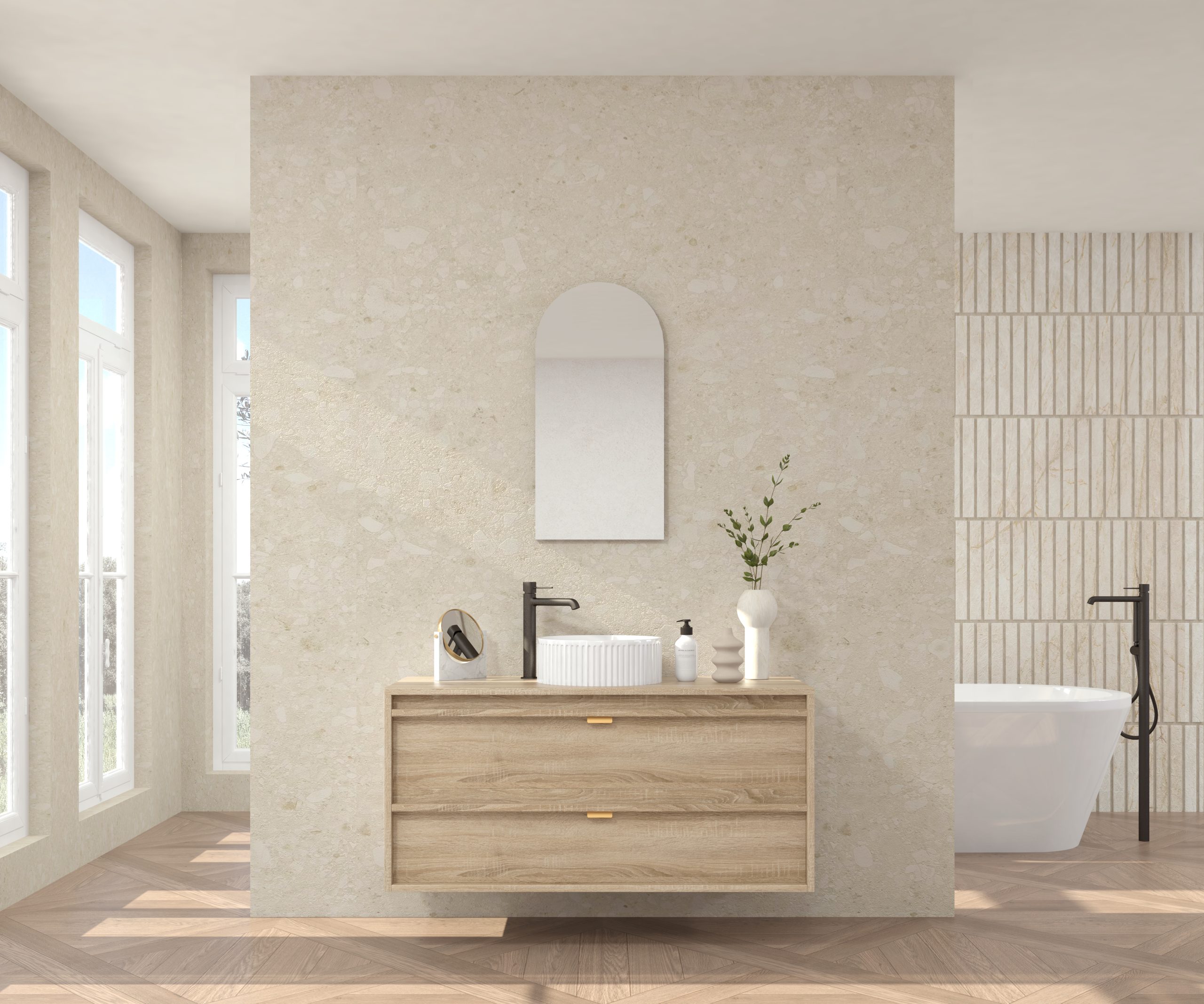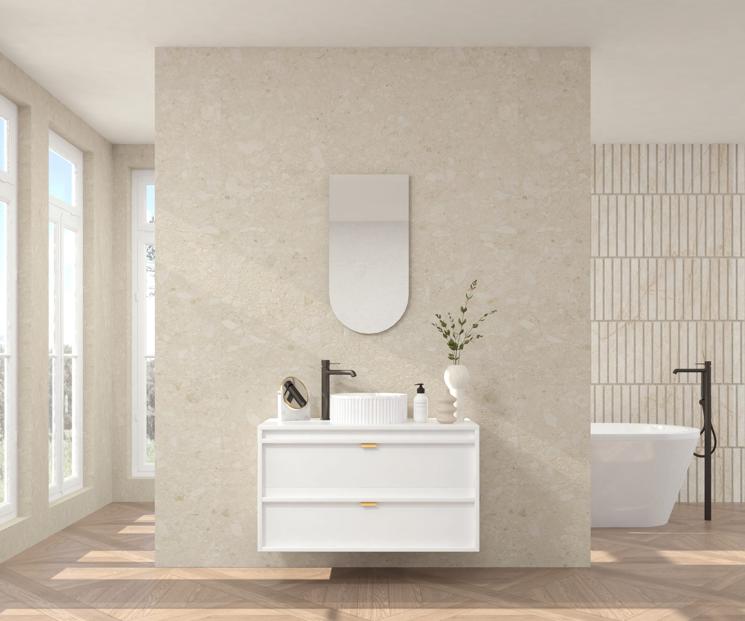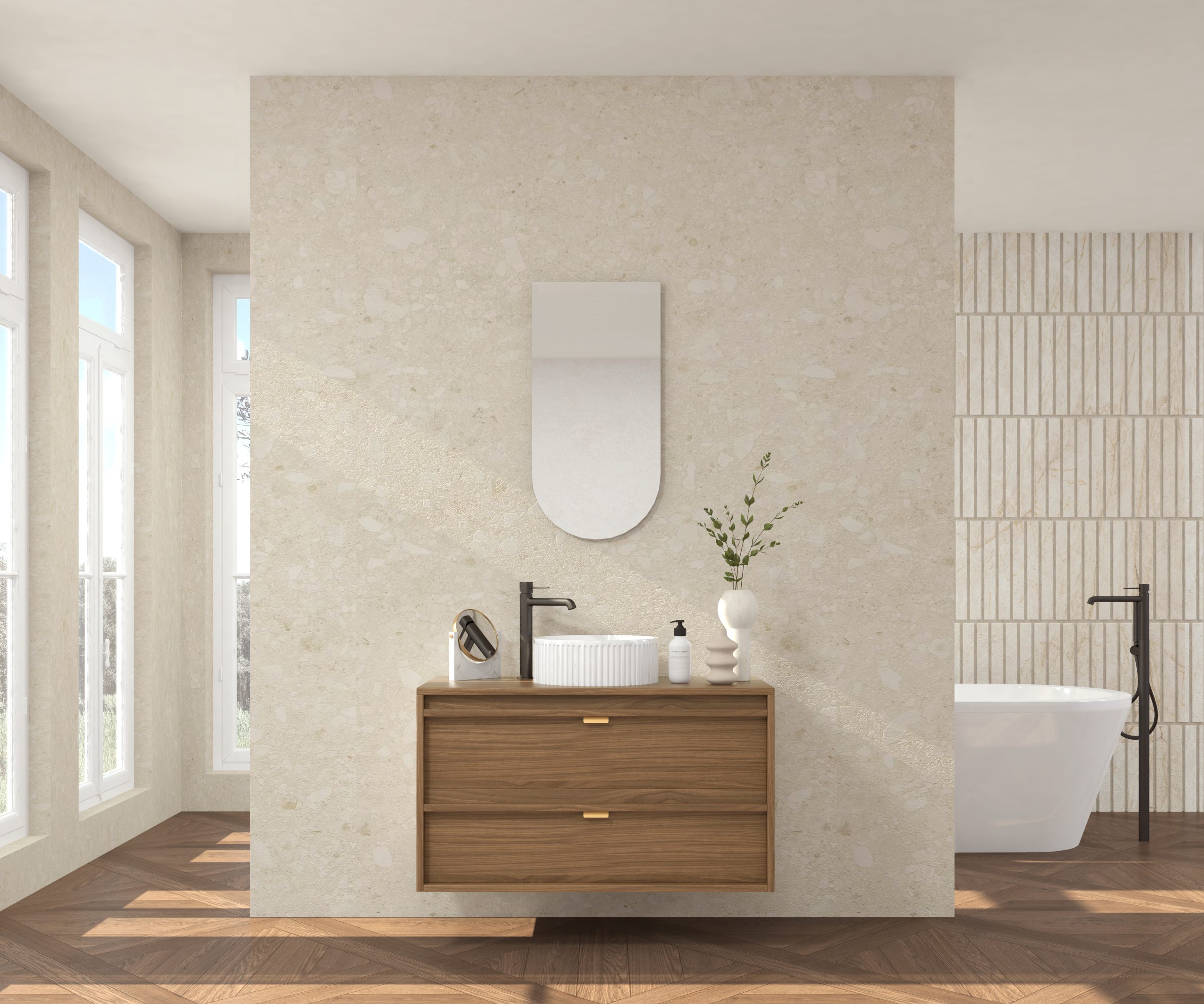 Pack composé d’un meuble sous-vasque suspendu, d’une vasque striée et d’un miroir Alma.