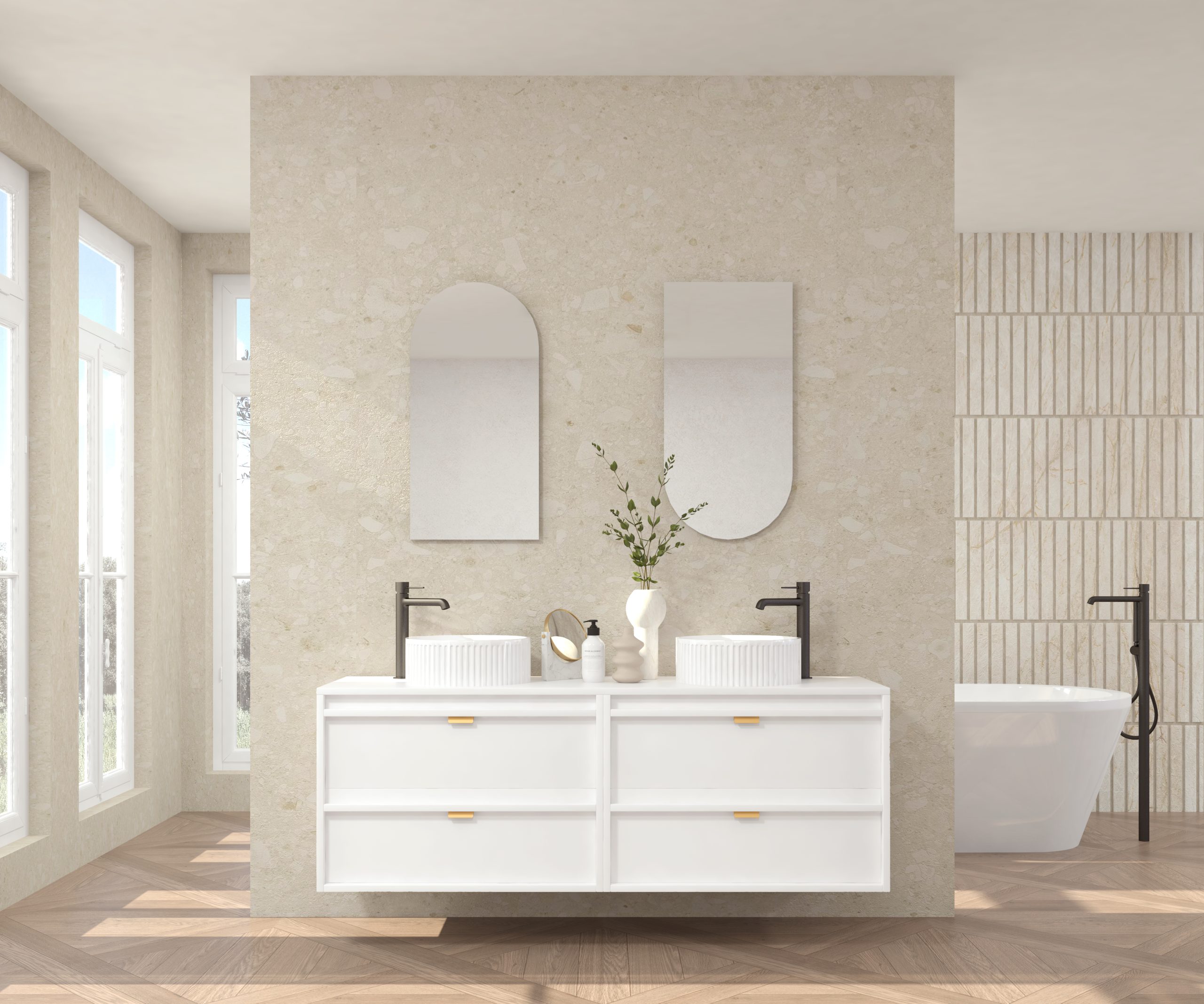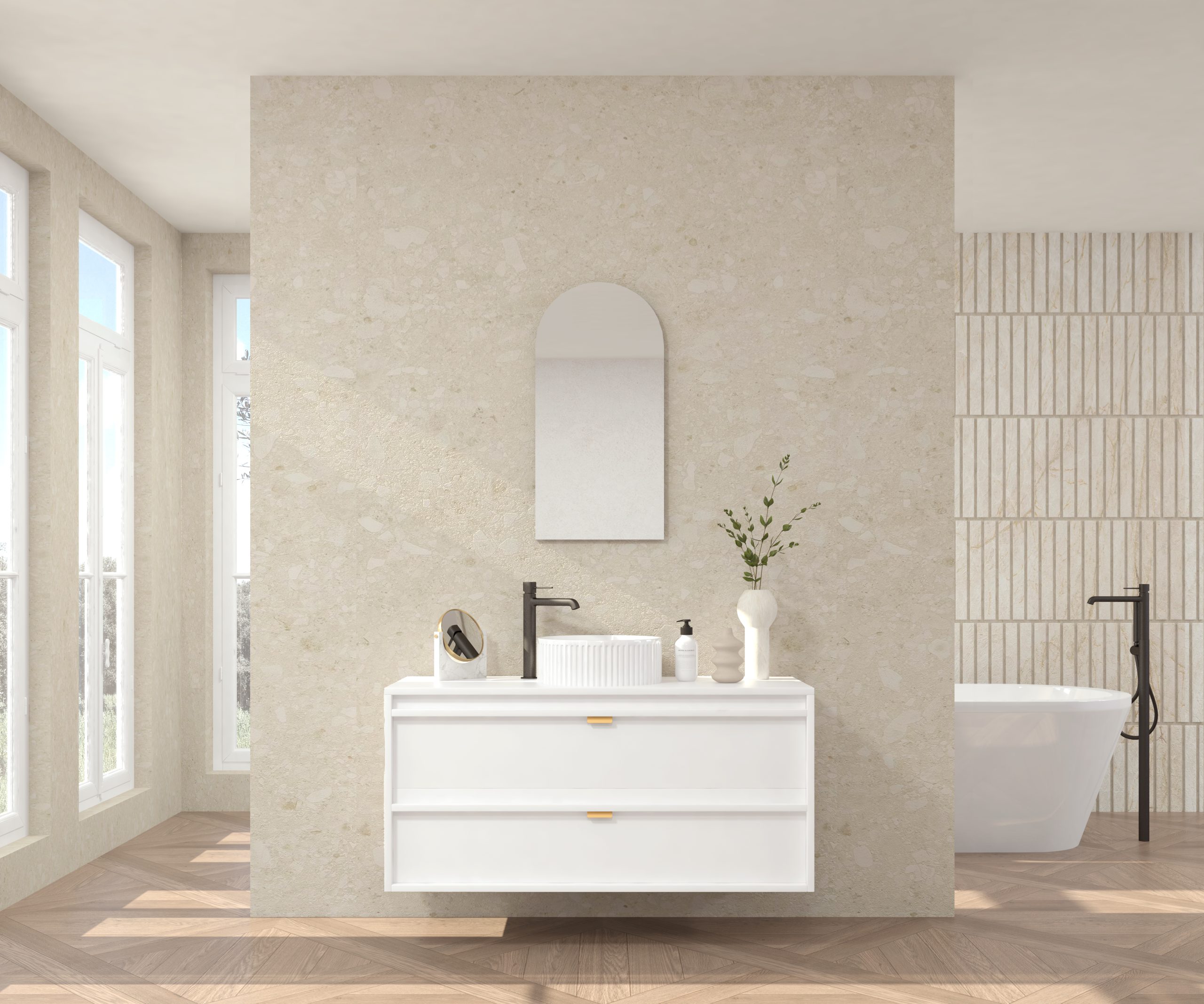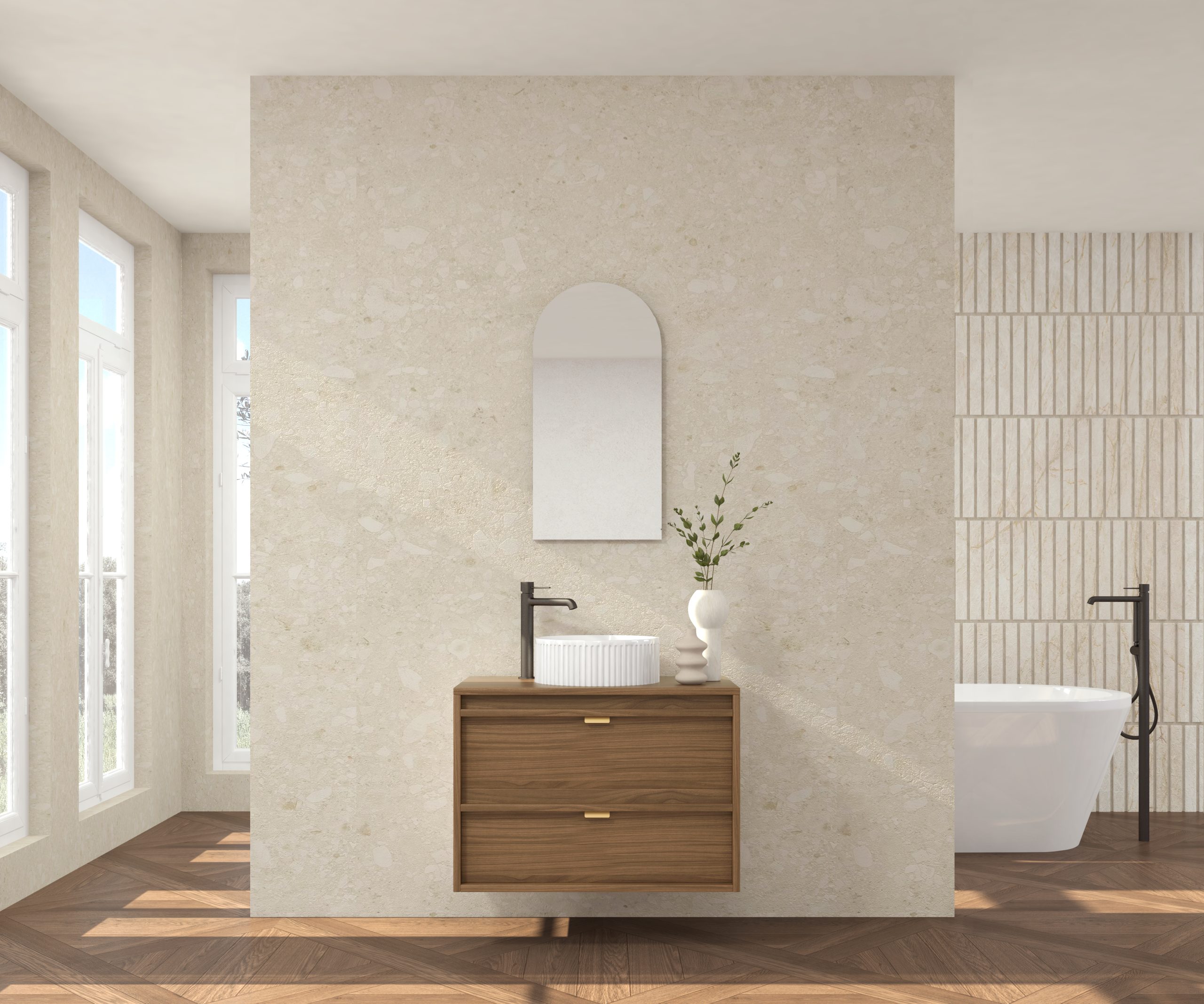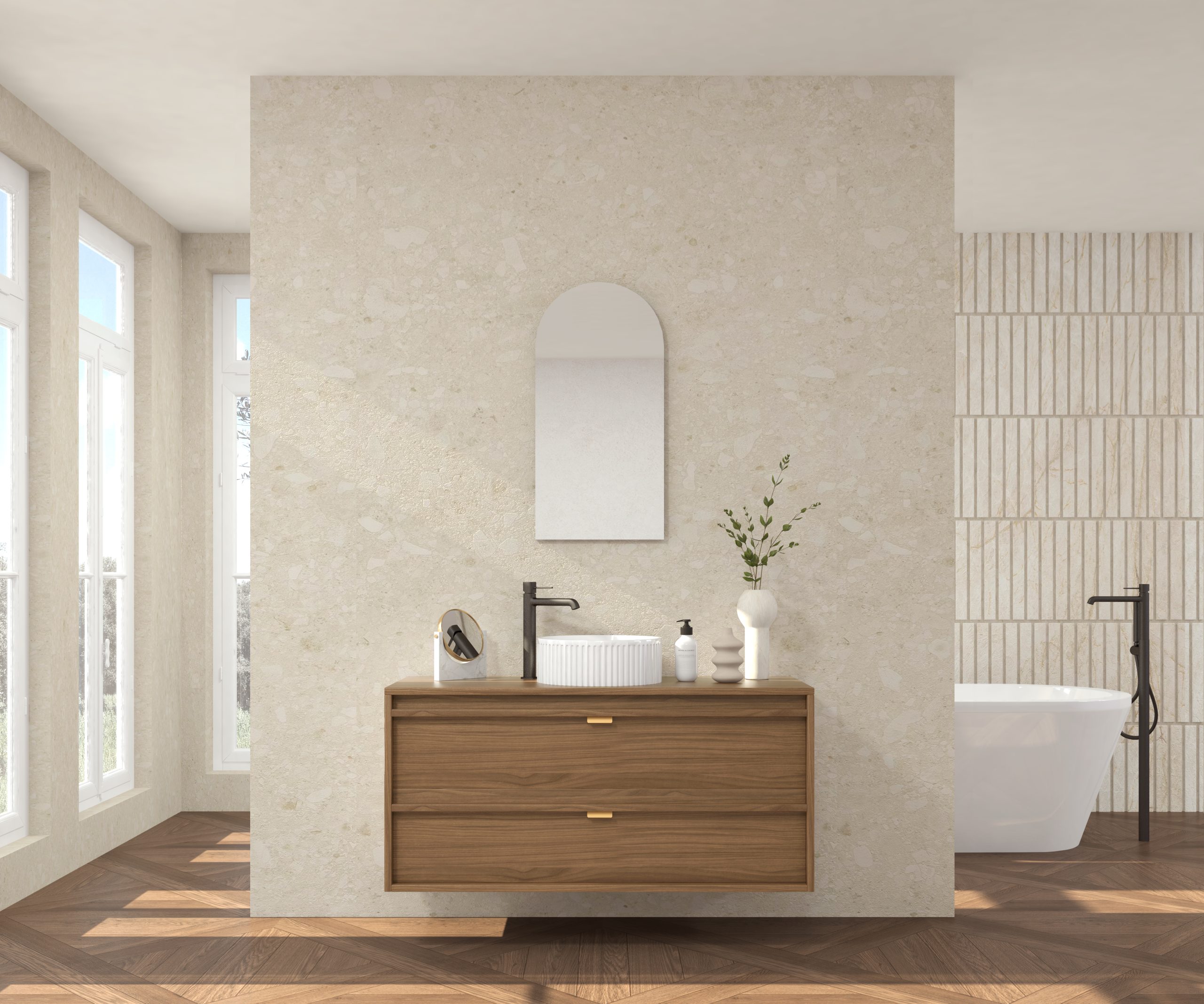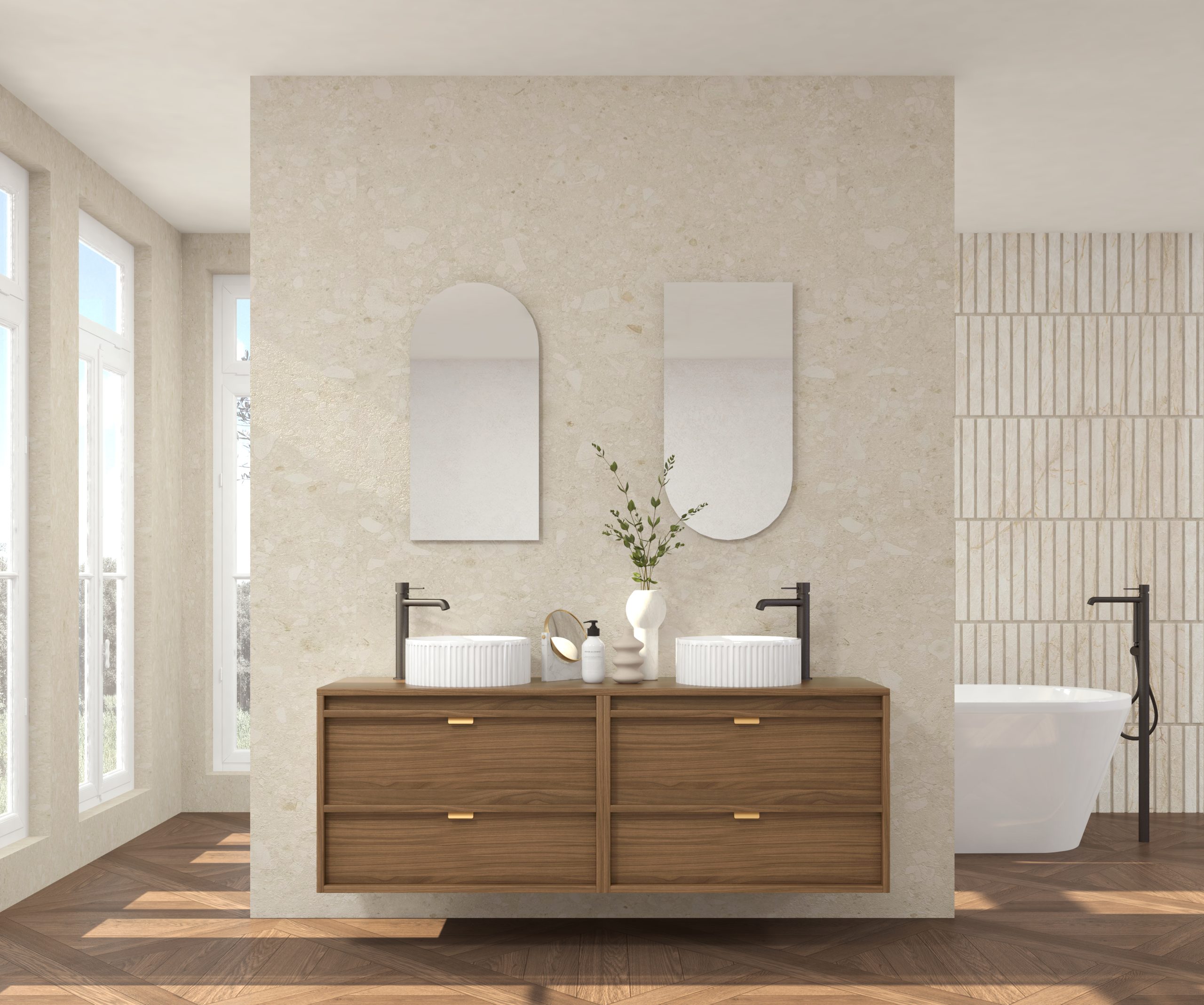Pack composé d’un meuble sous-vasque suspendu, d’une vasque striée et d’un miroir Alma.