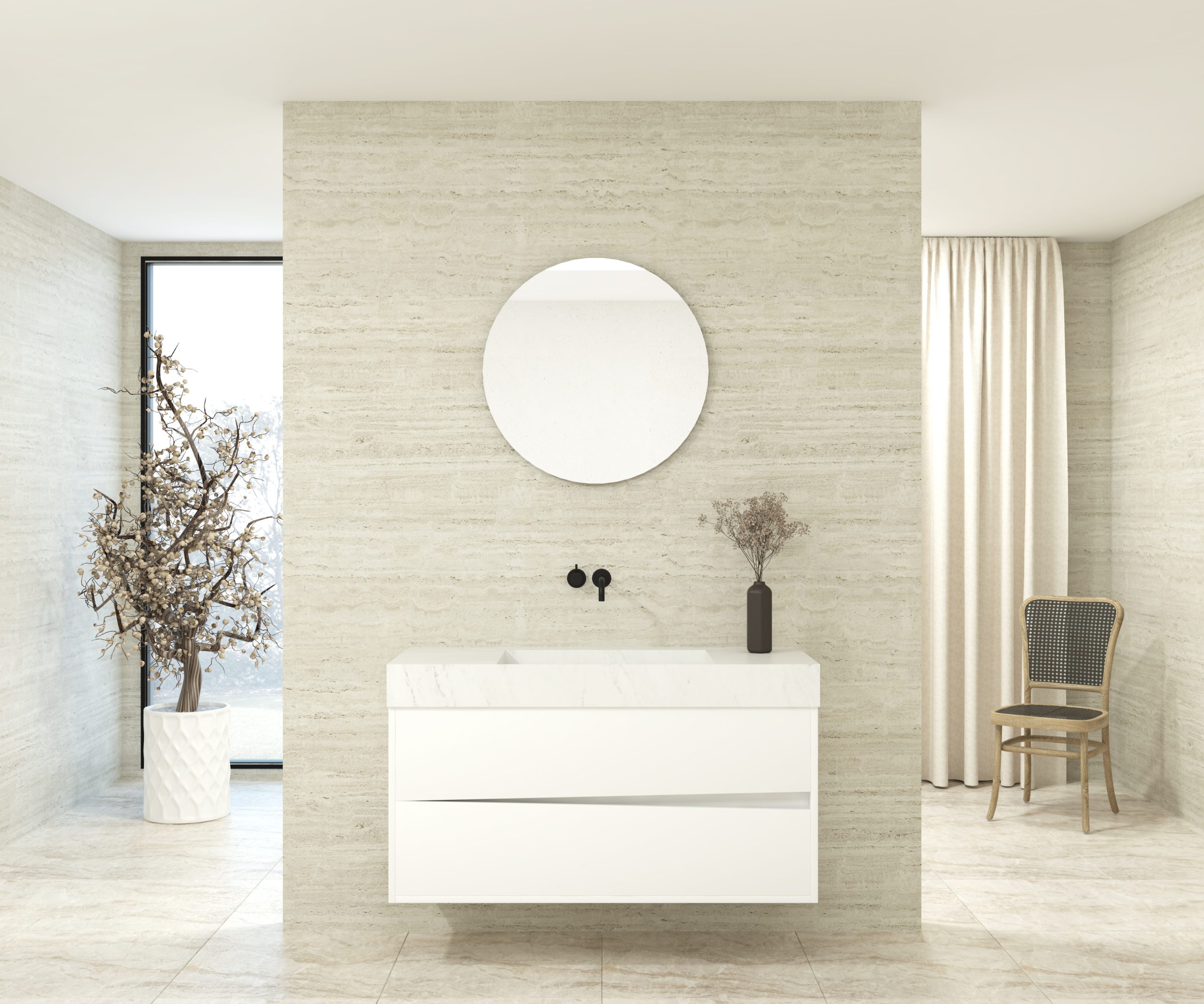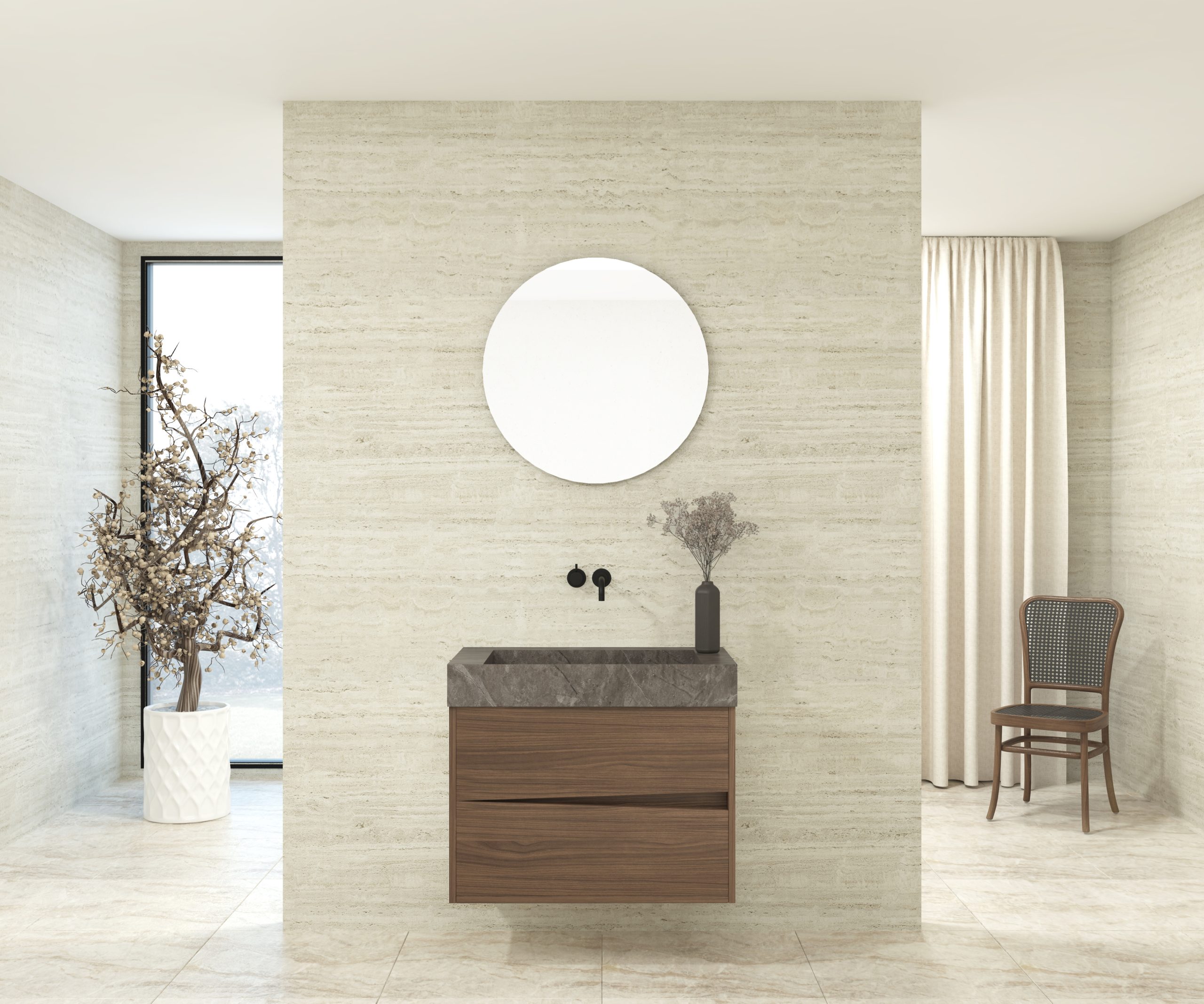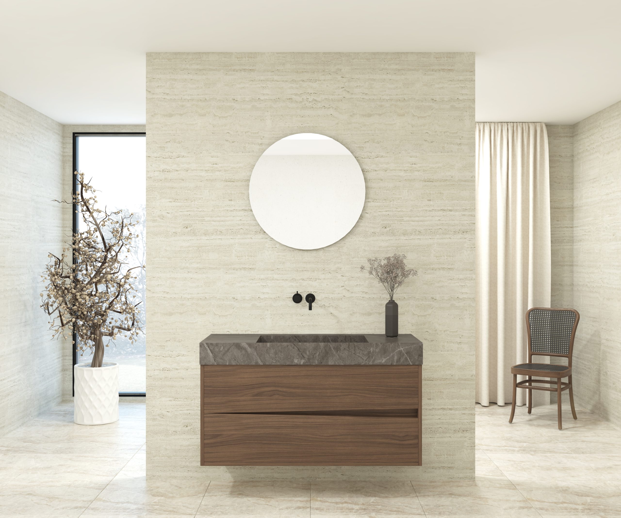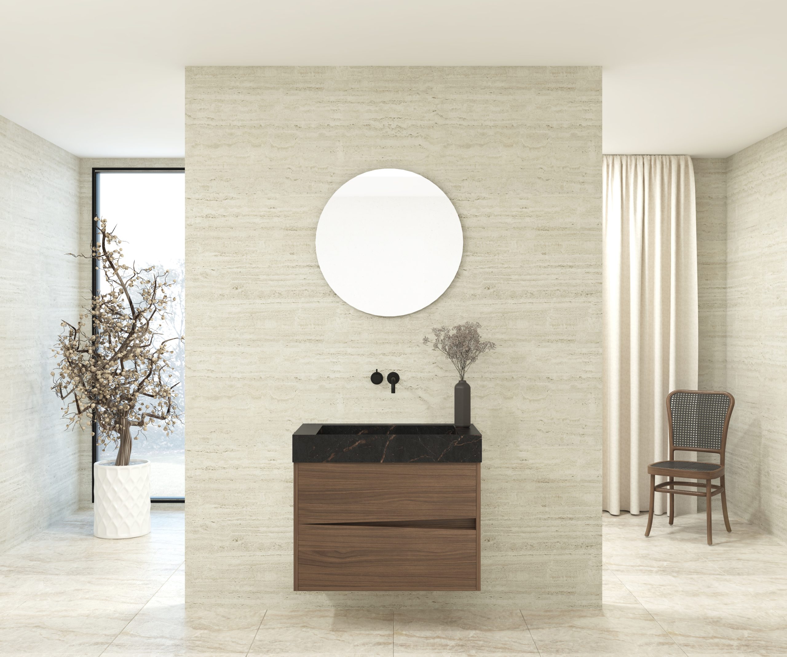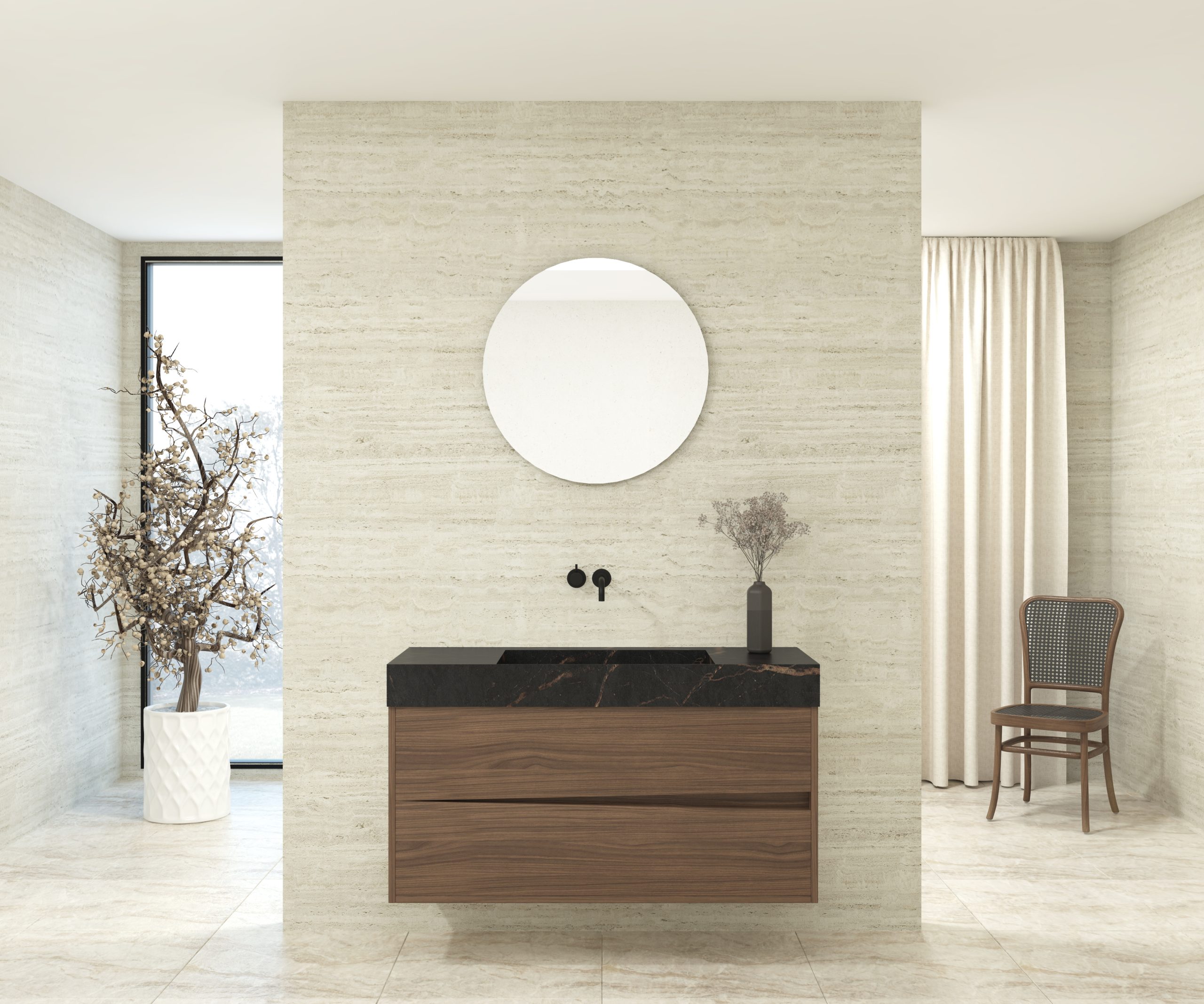 Pack composé d’une vasque suspendue en matériau Dekton de Cosentino, d’un meuble et d’un miroir circulaire.