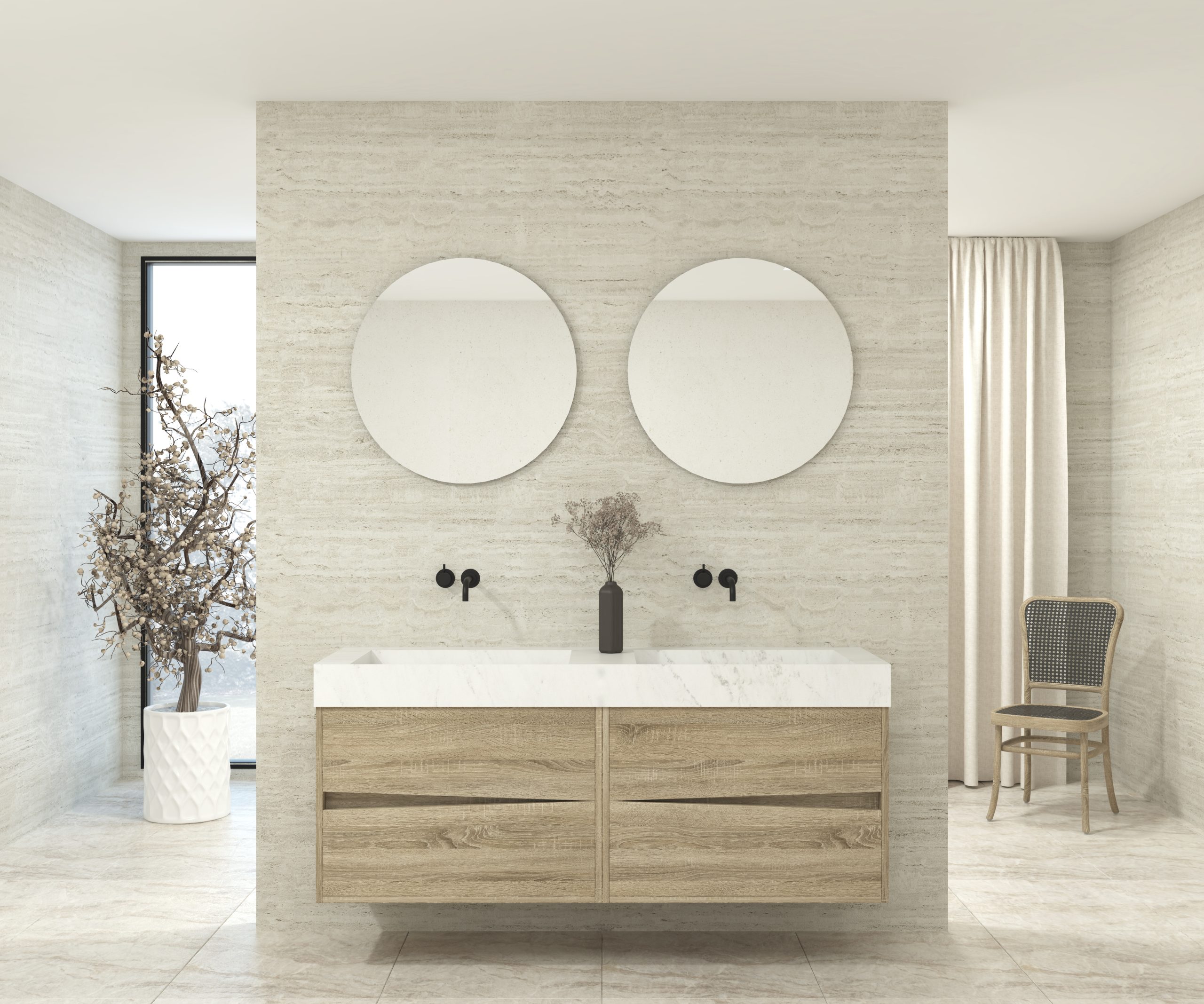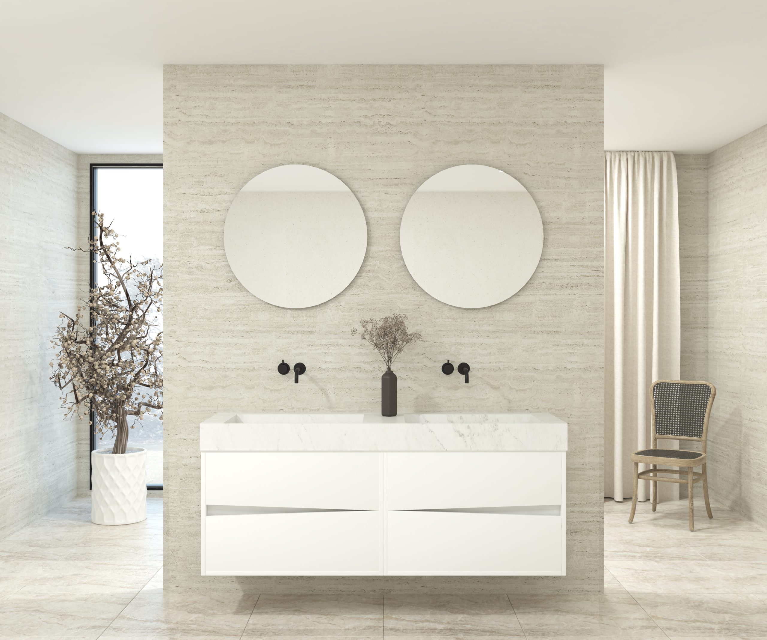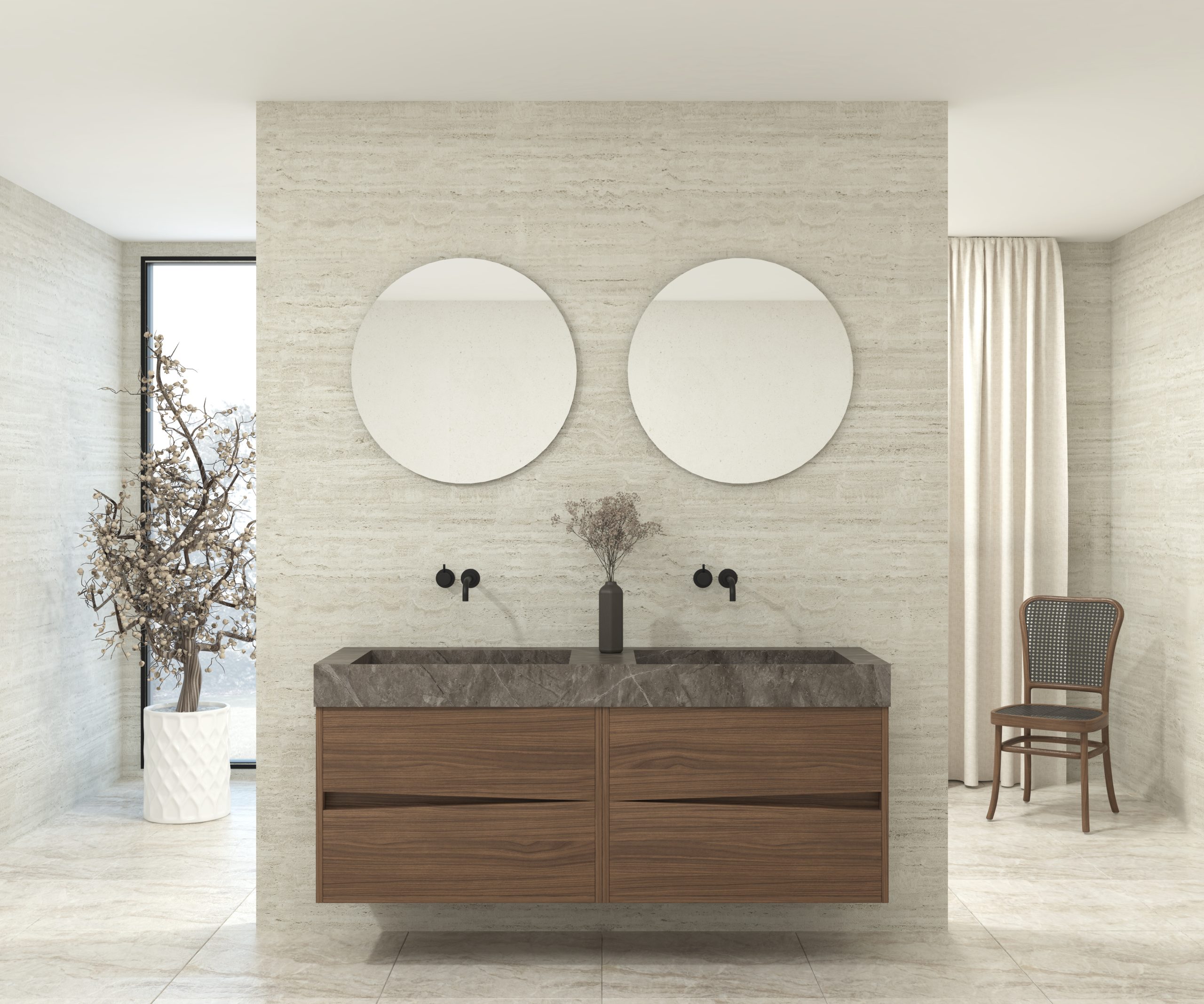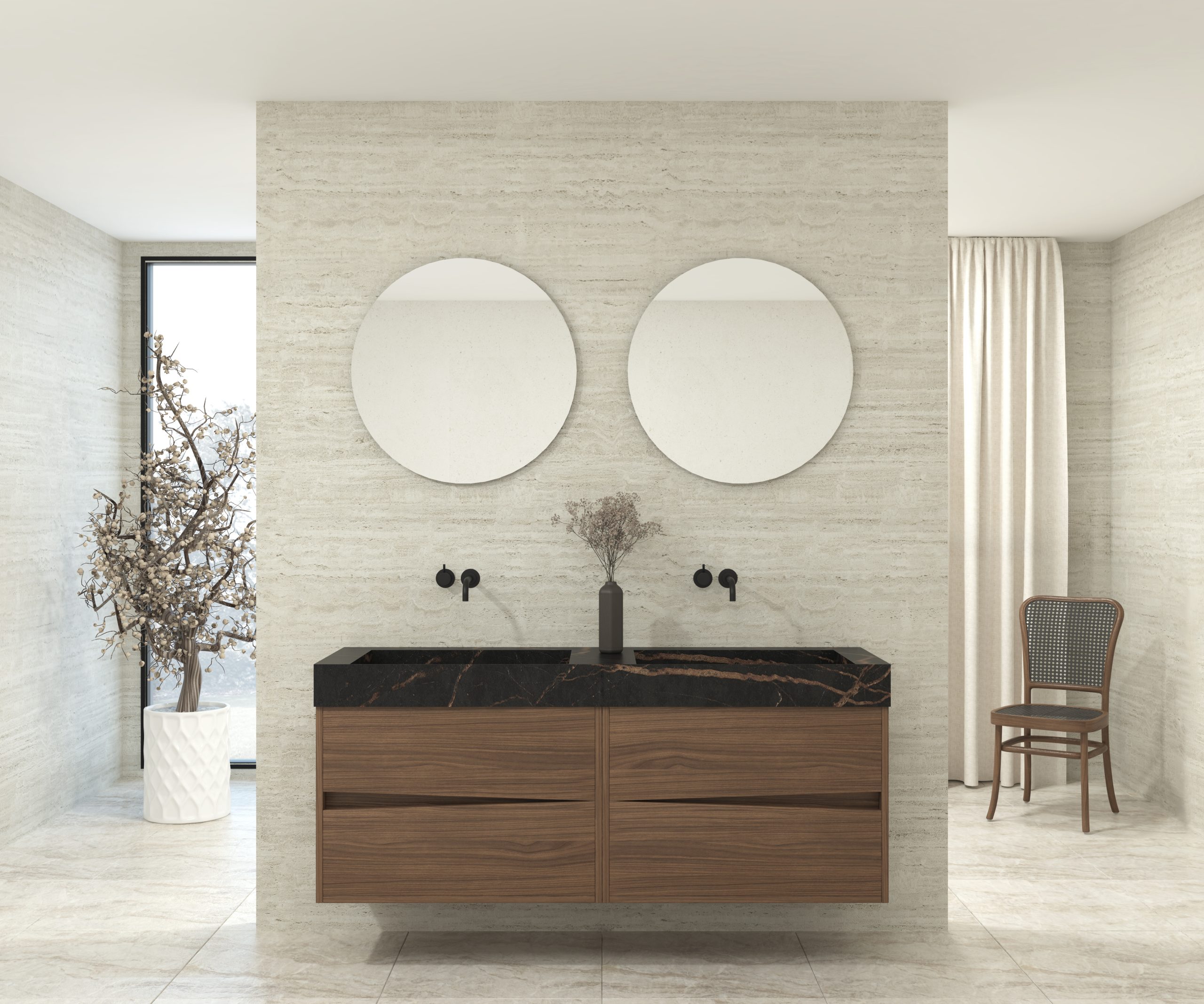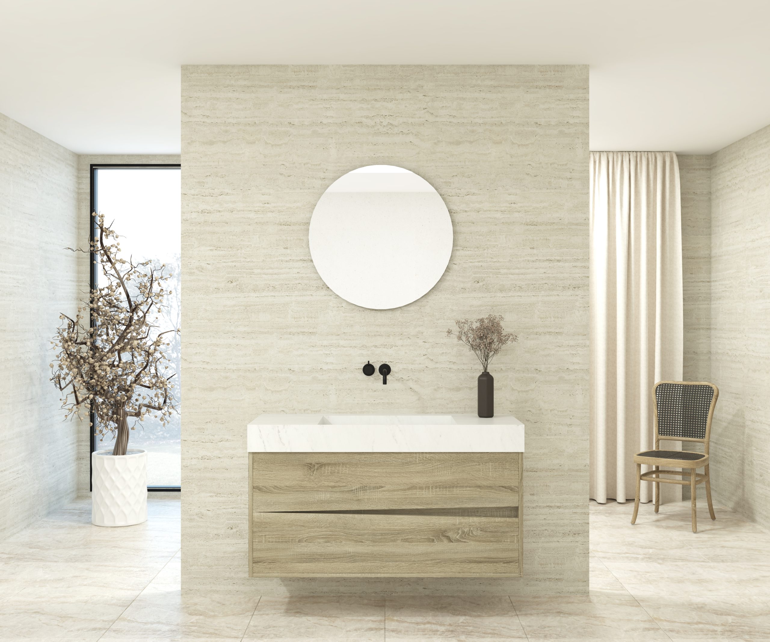 Pack composé d’une vasque suspendue en matériau Dekton de Cosentino, d’un meuble et d’un miroir circulaire.