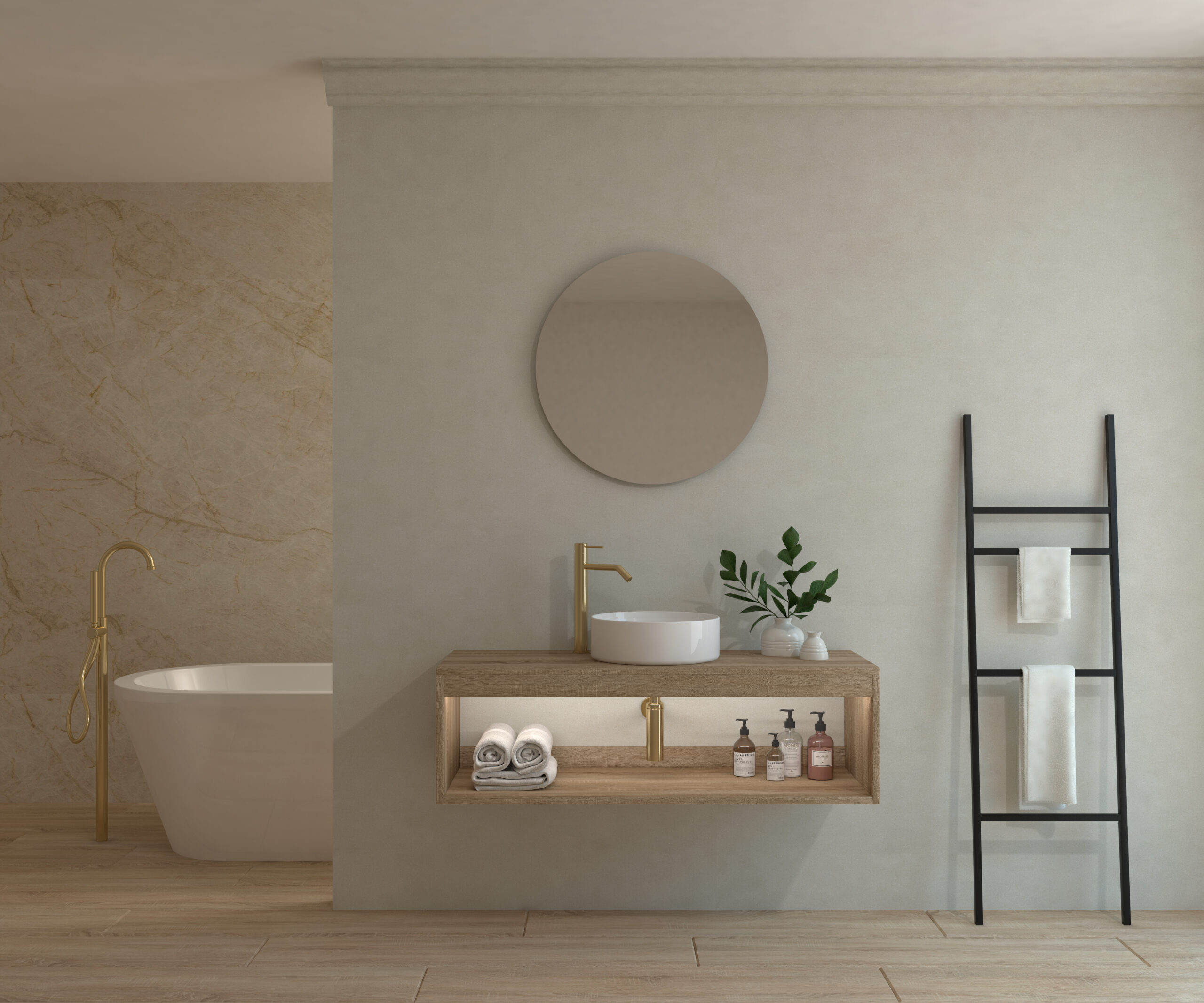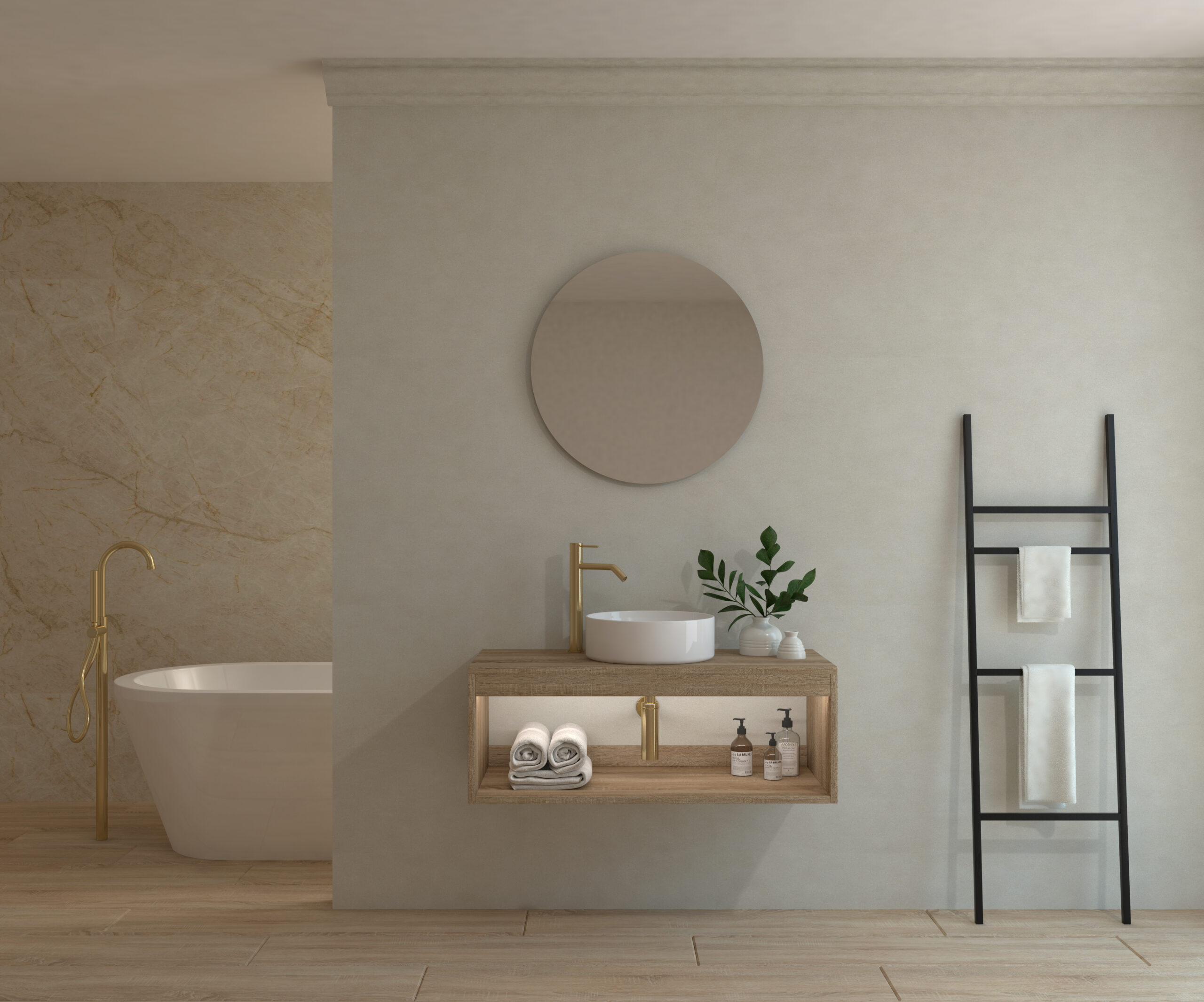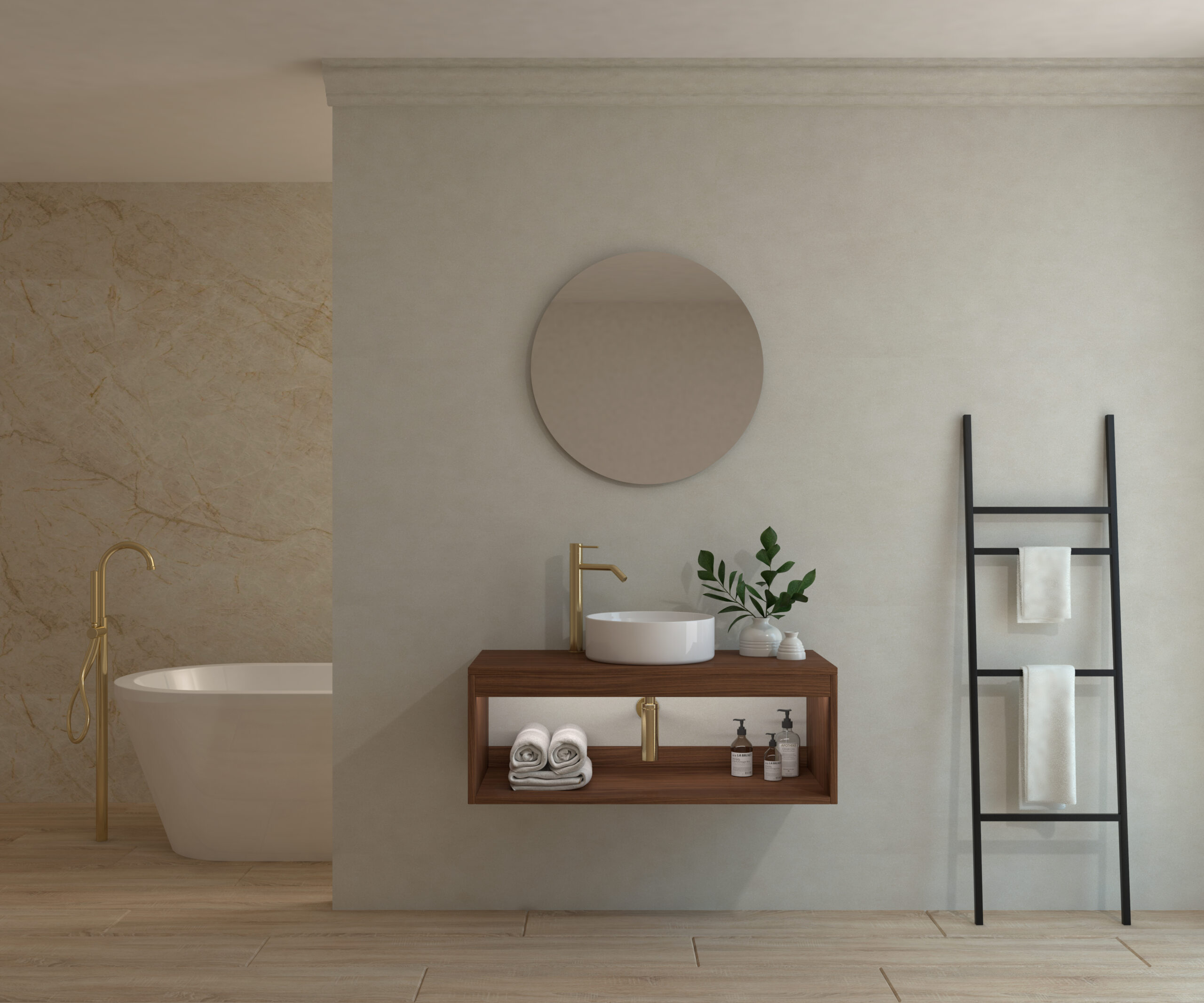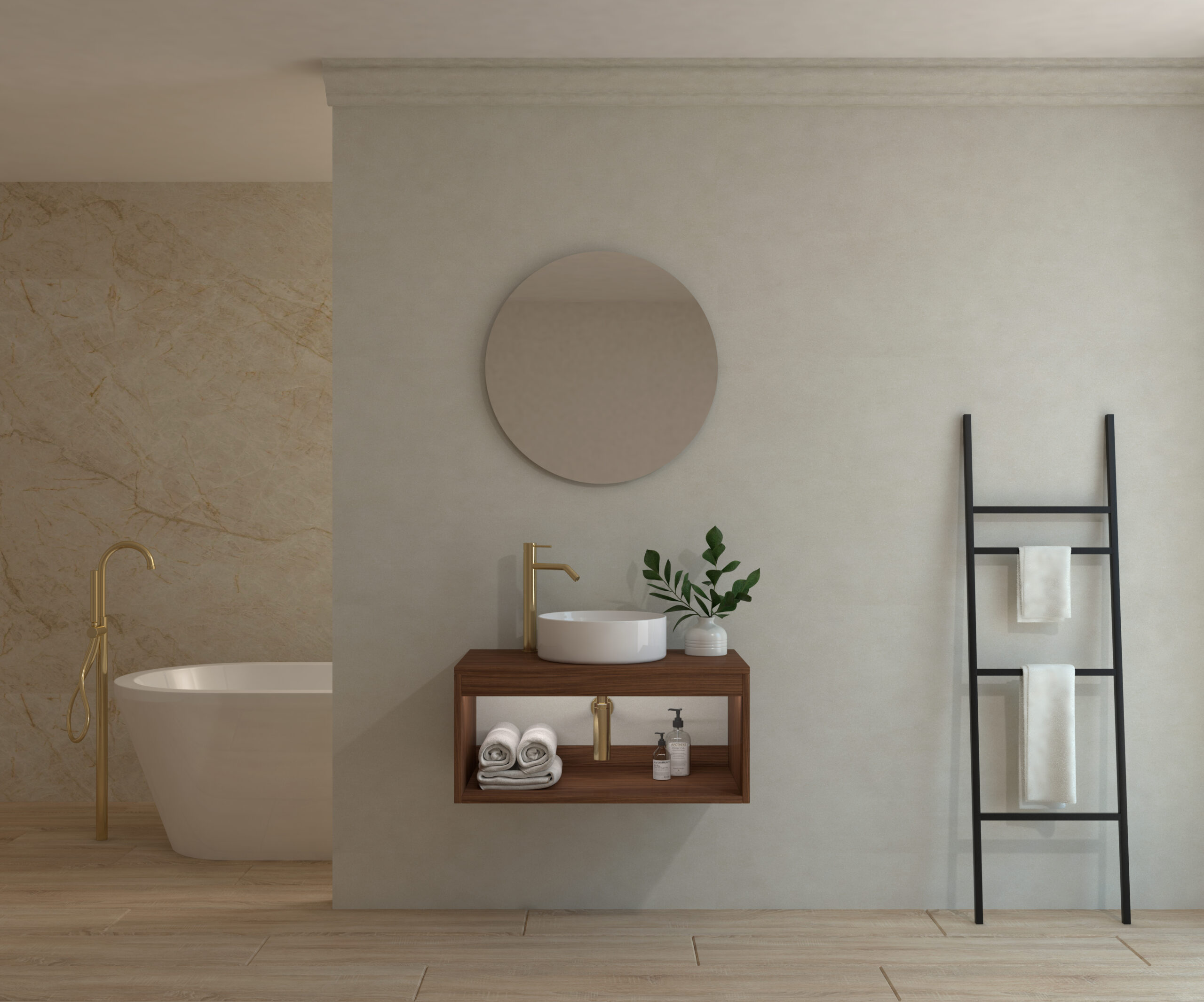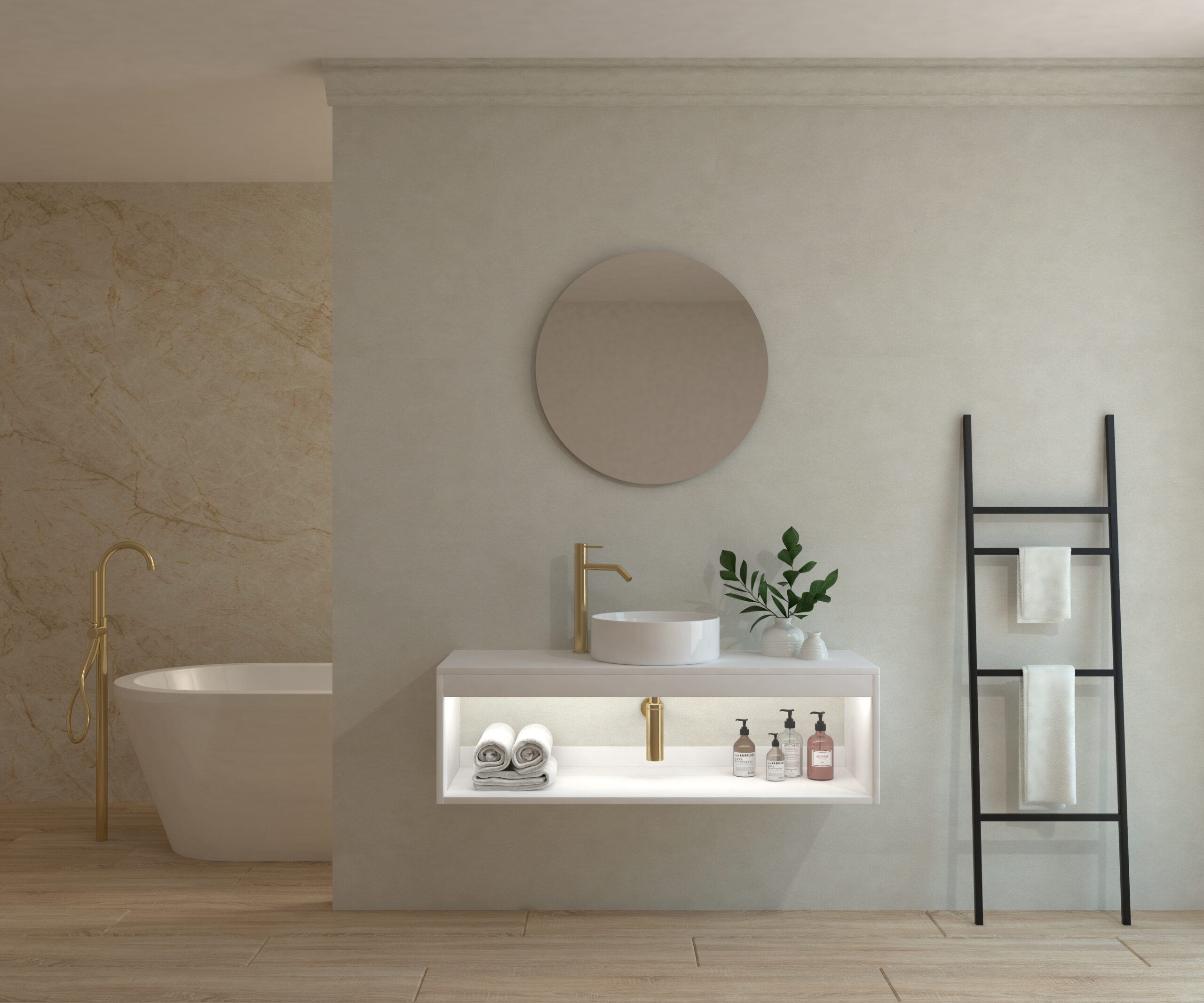Ensemble de salle de bain compos d’un meuble suspendu, d’un lavabo poser et d’un miroir circulaire.