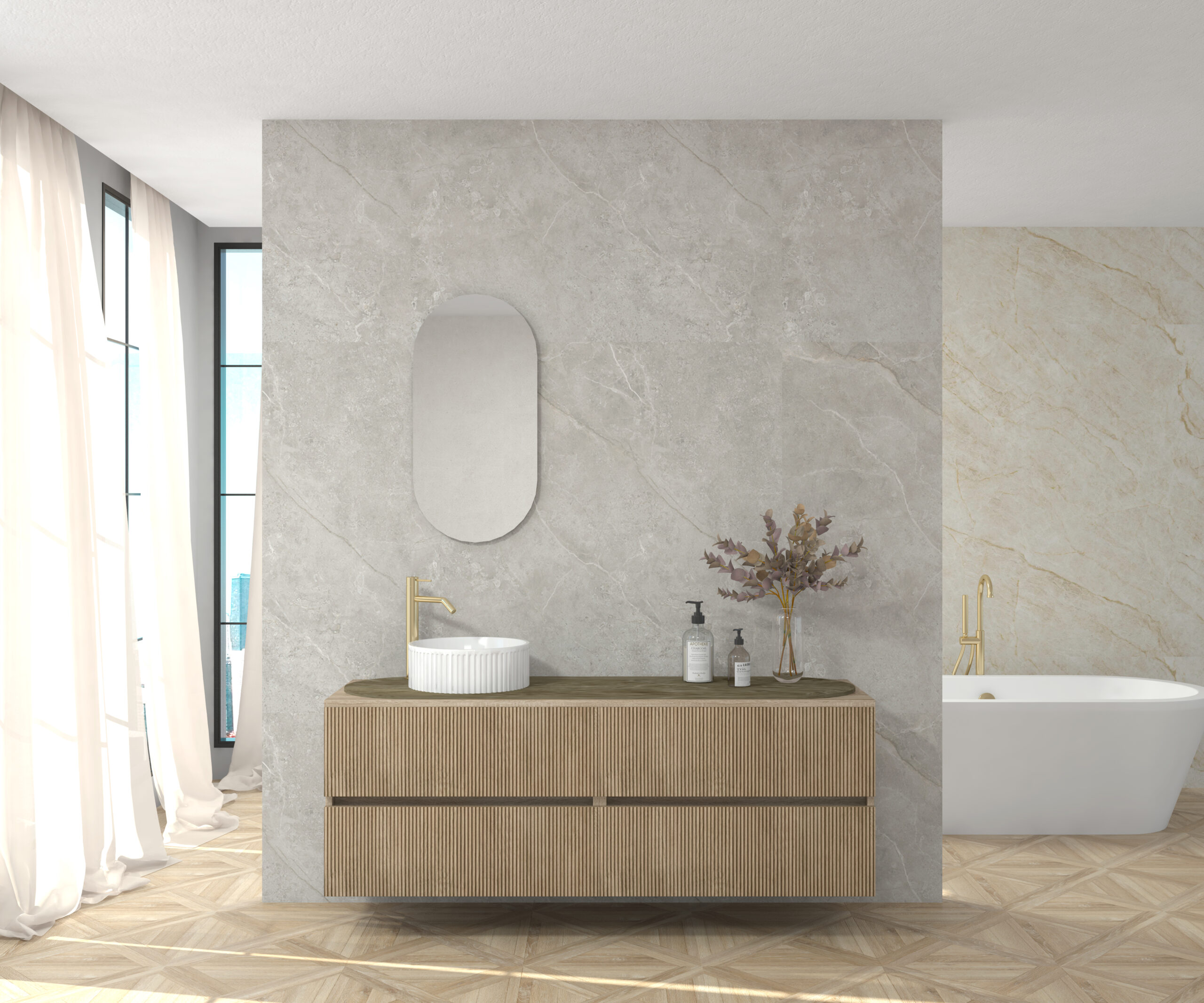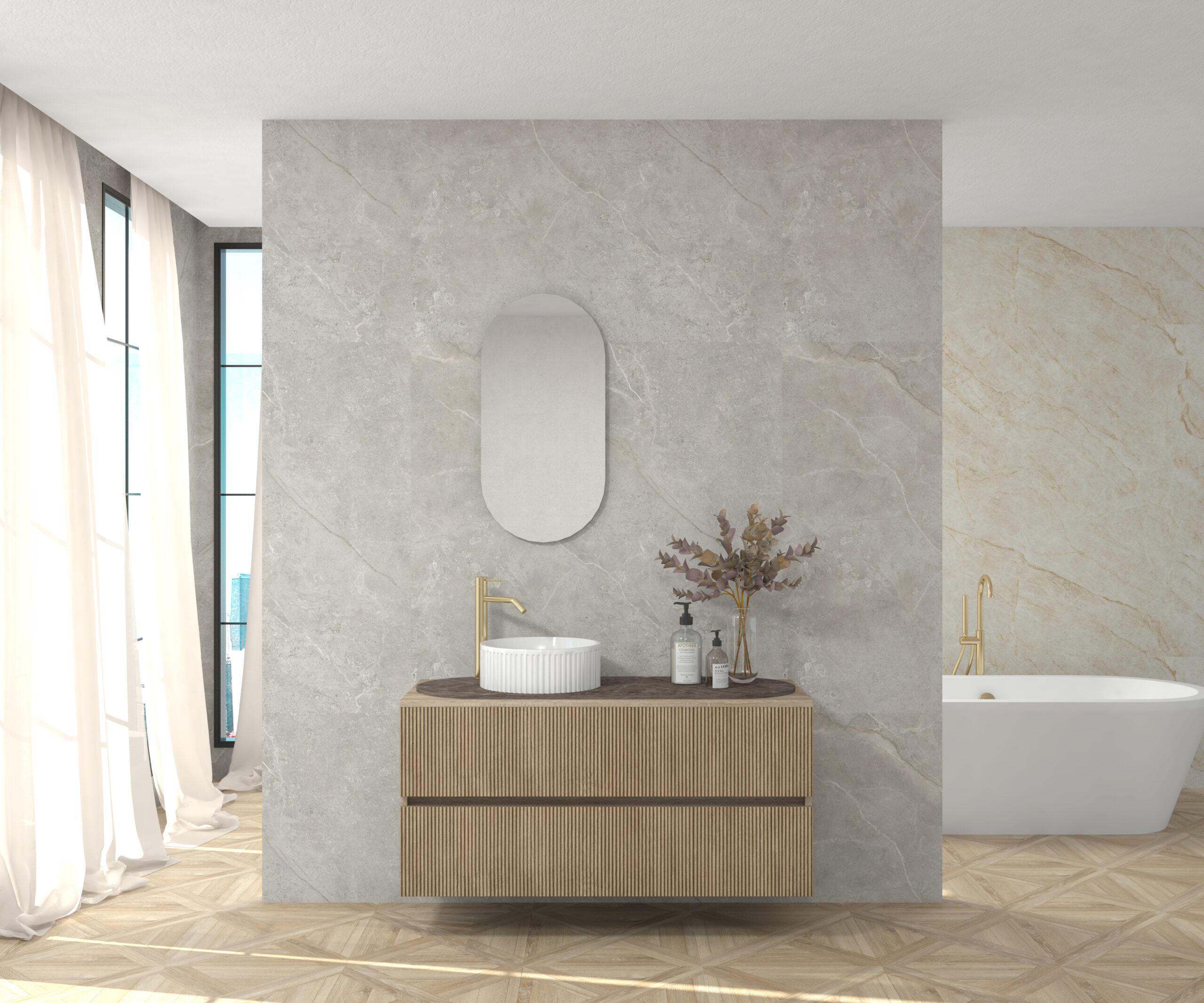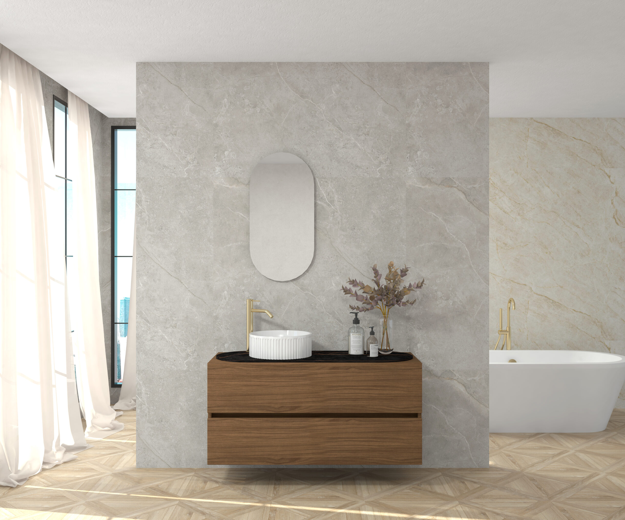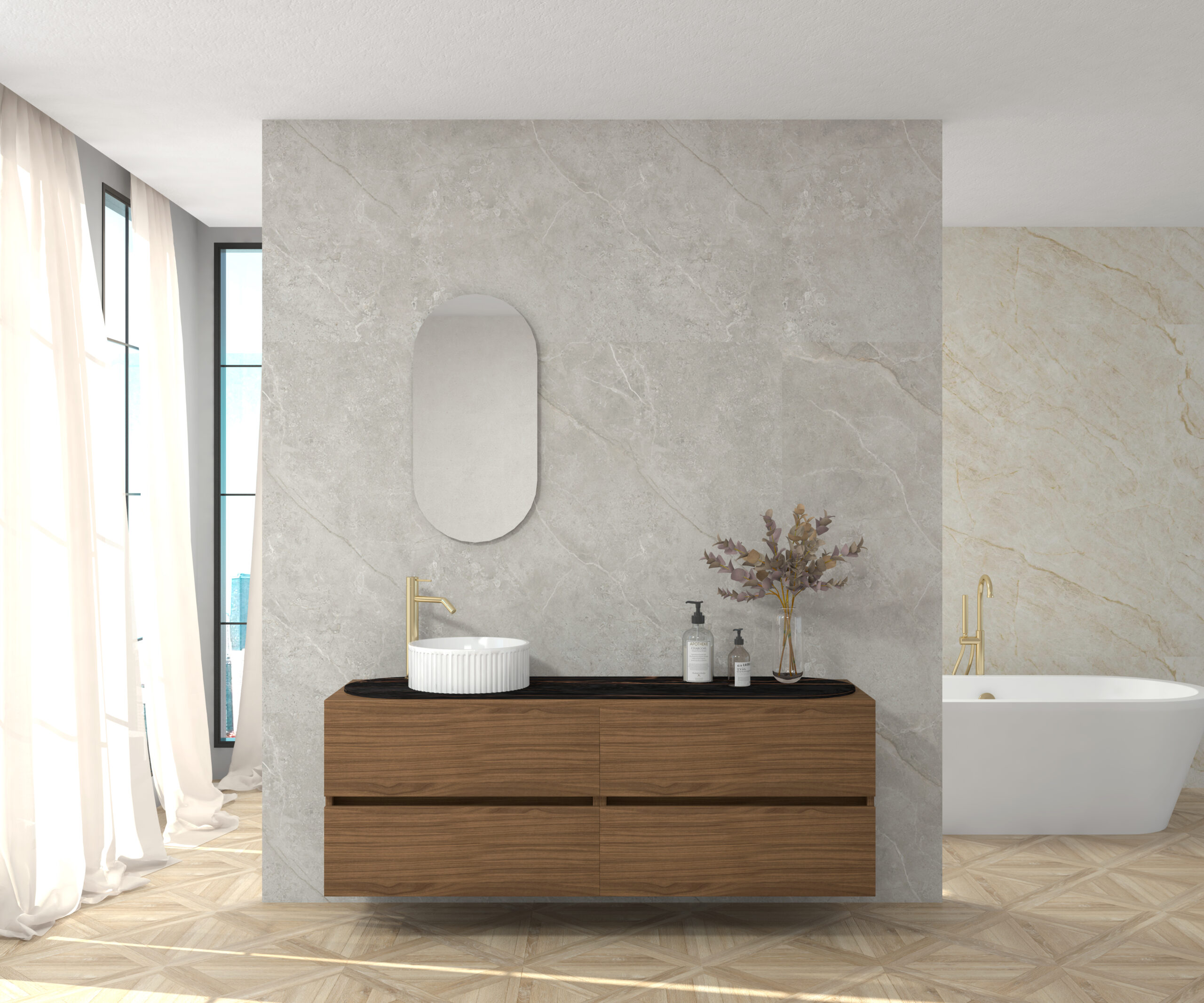 Pack composé d’un meuble suspendu pour lavabo, d’un plan de travail en Dekton de Cosentino, d’un lavabo et d’un miroir design capsule.