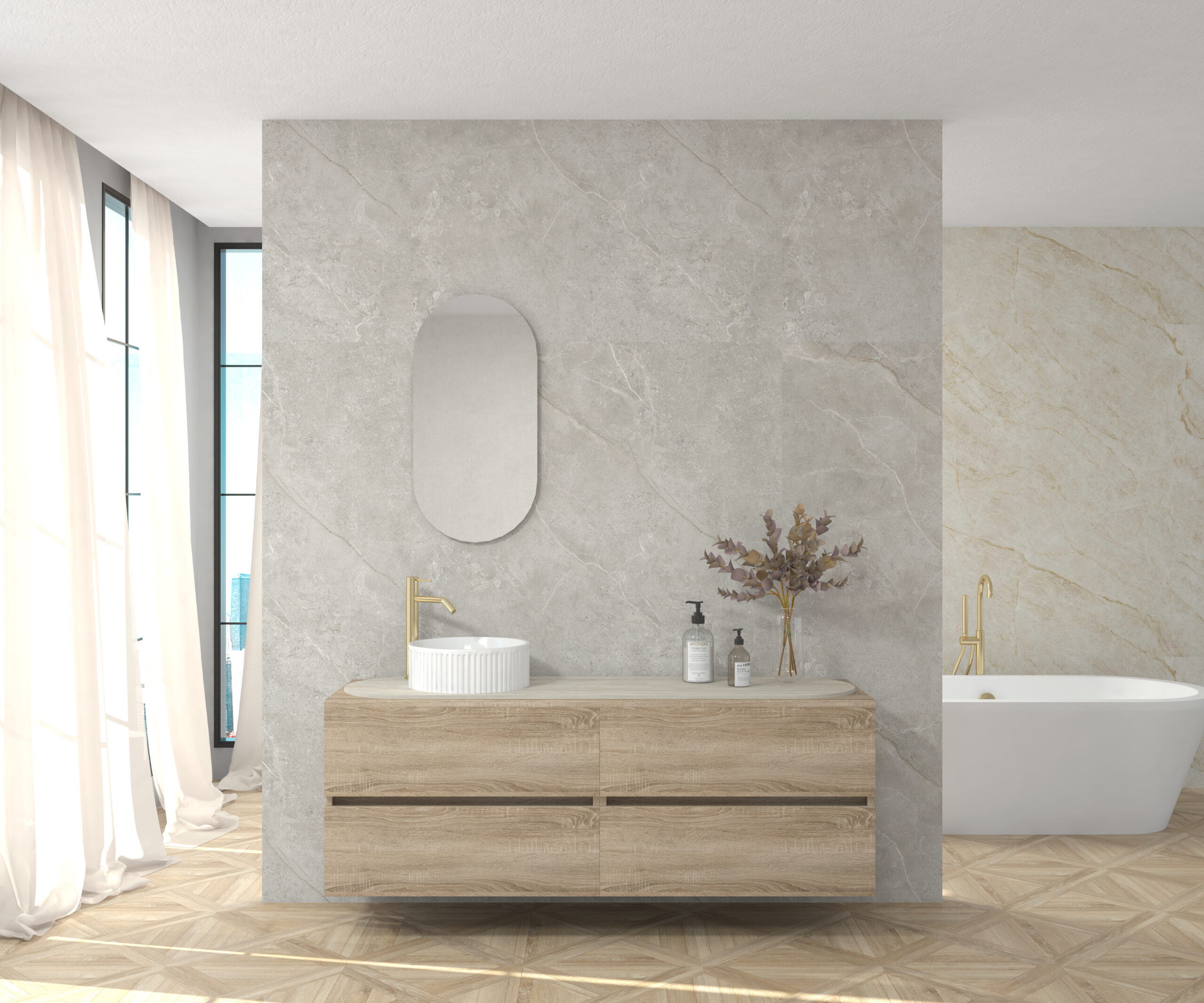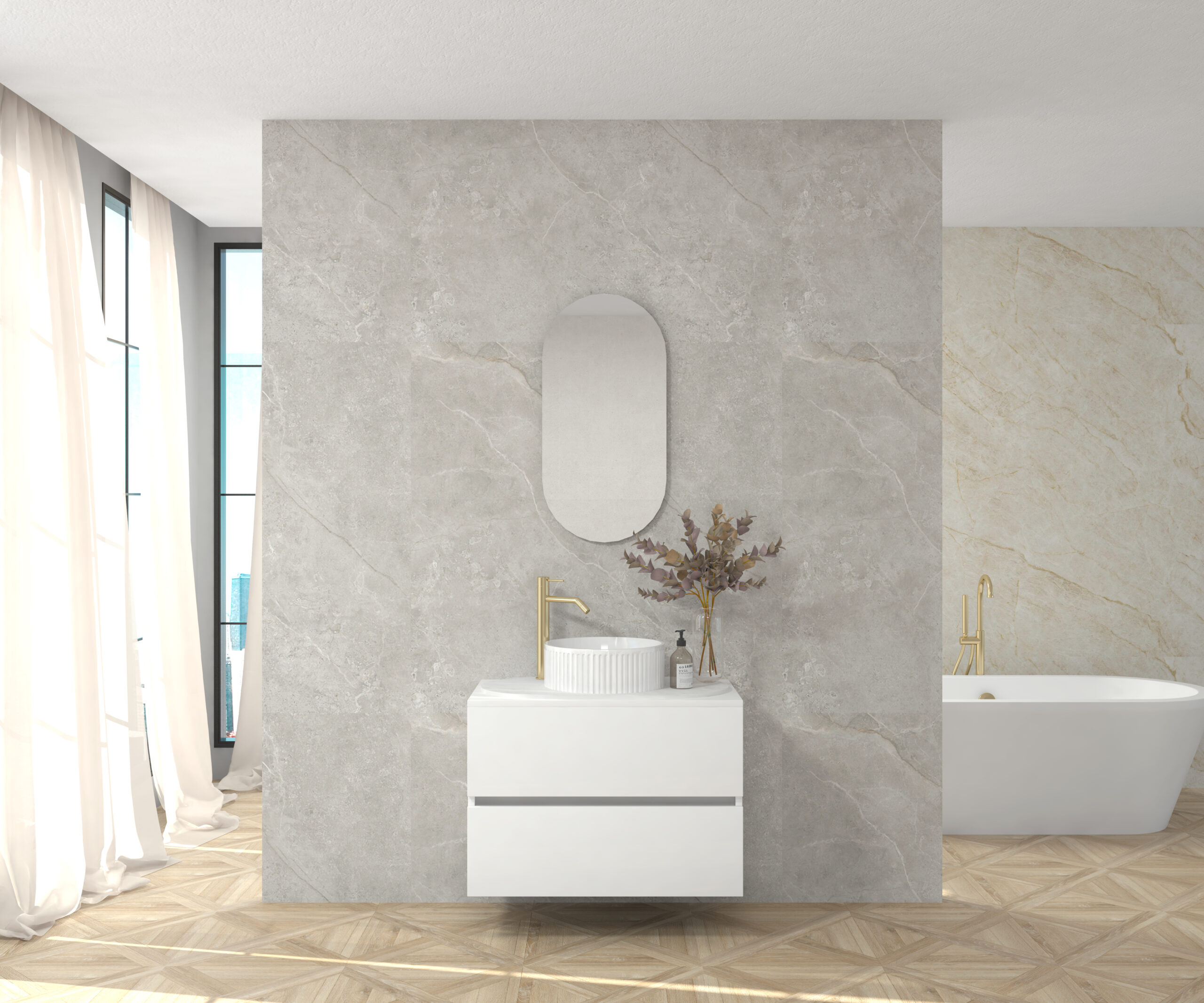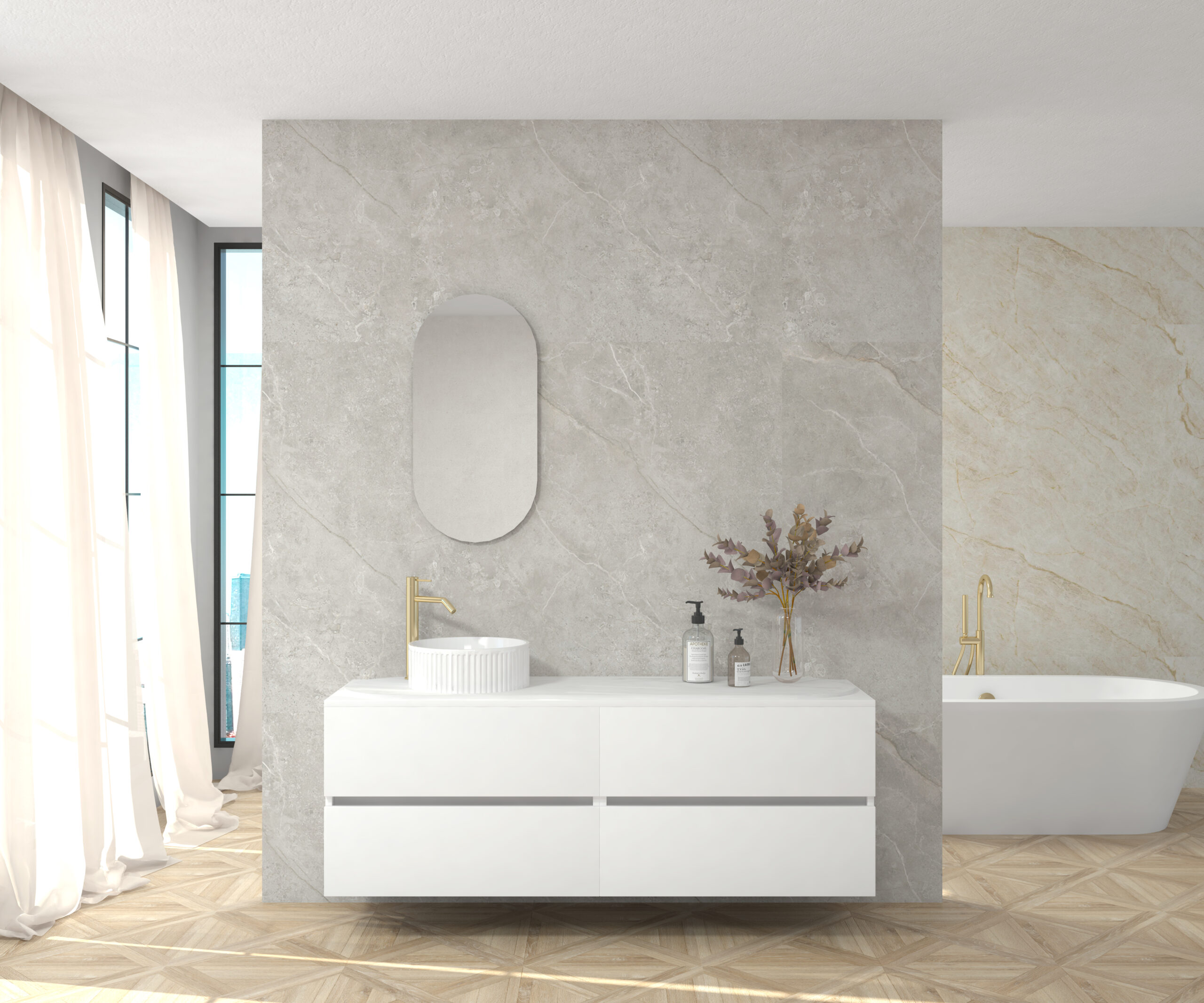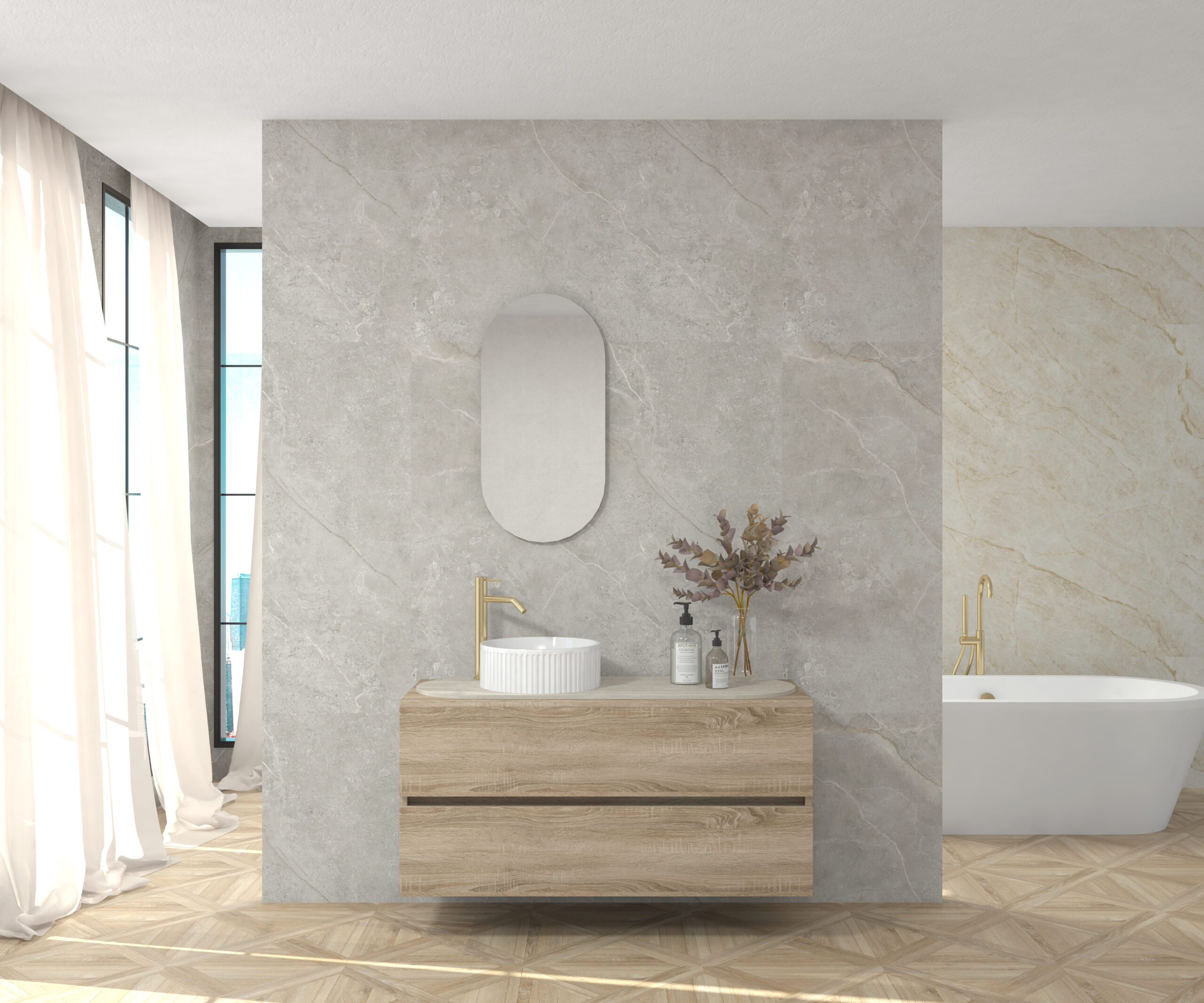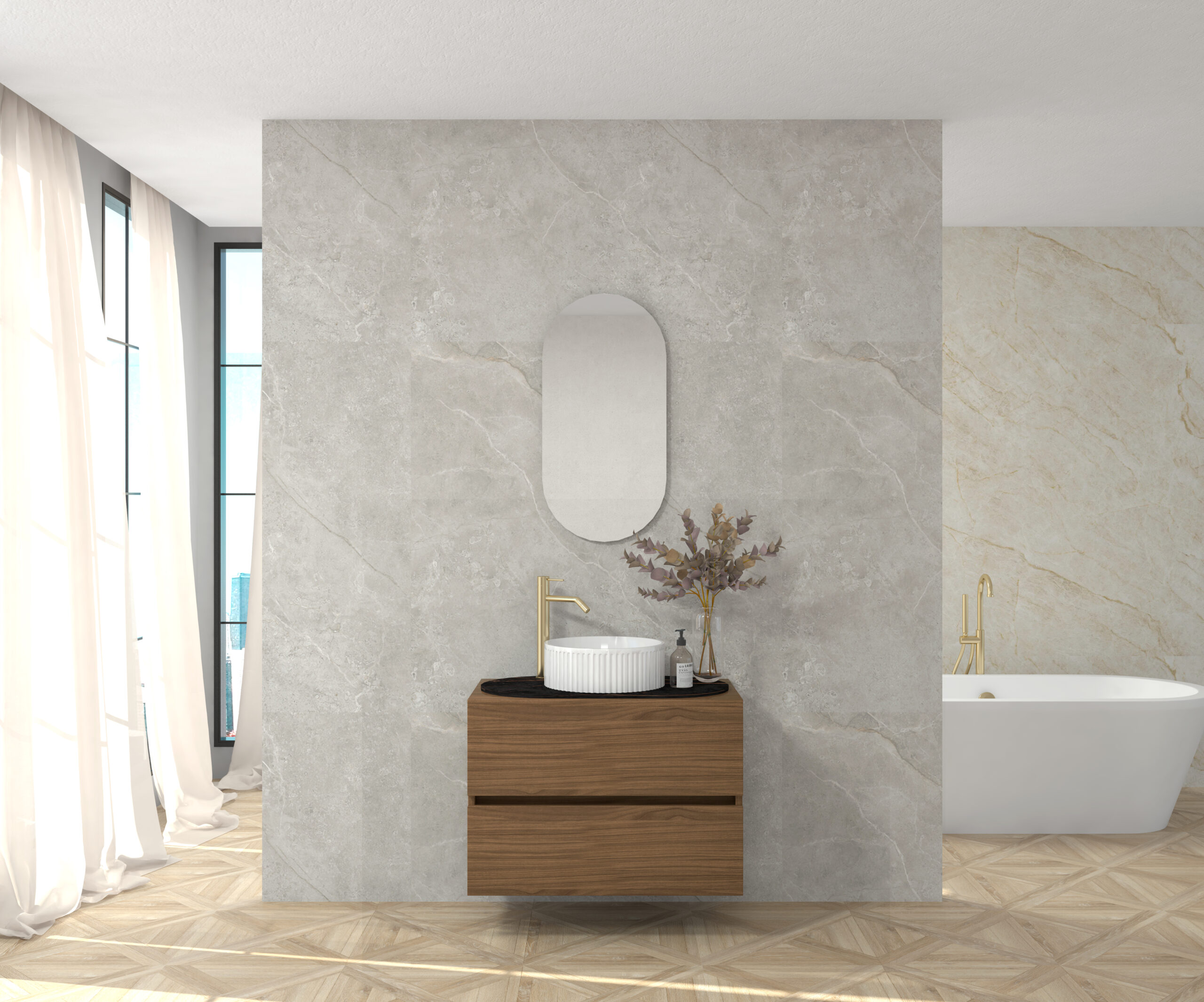 Pack composé d’un meuble suspendu pour lavabo, d’un plan de travail en Dekton de Cosentino, d’un lavabo et d’un miroir design capsule.