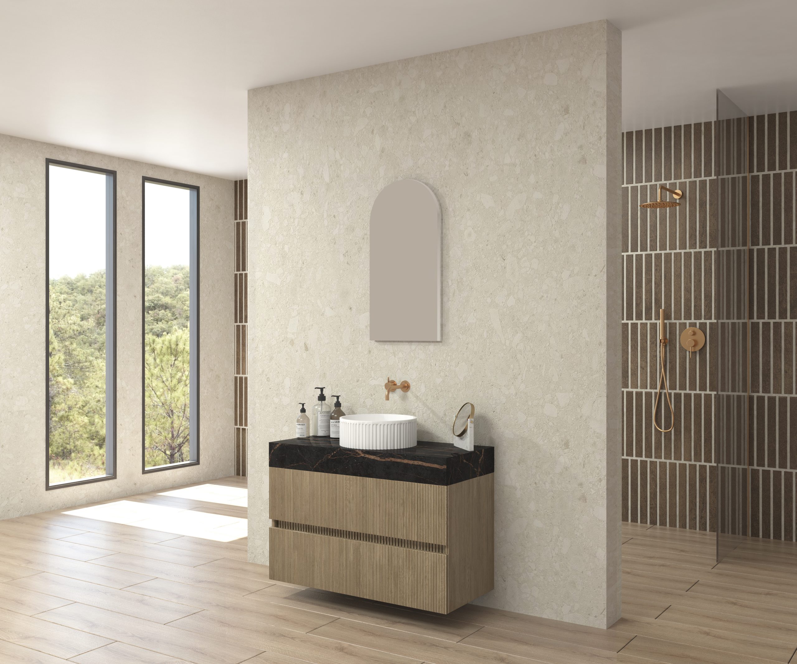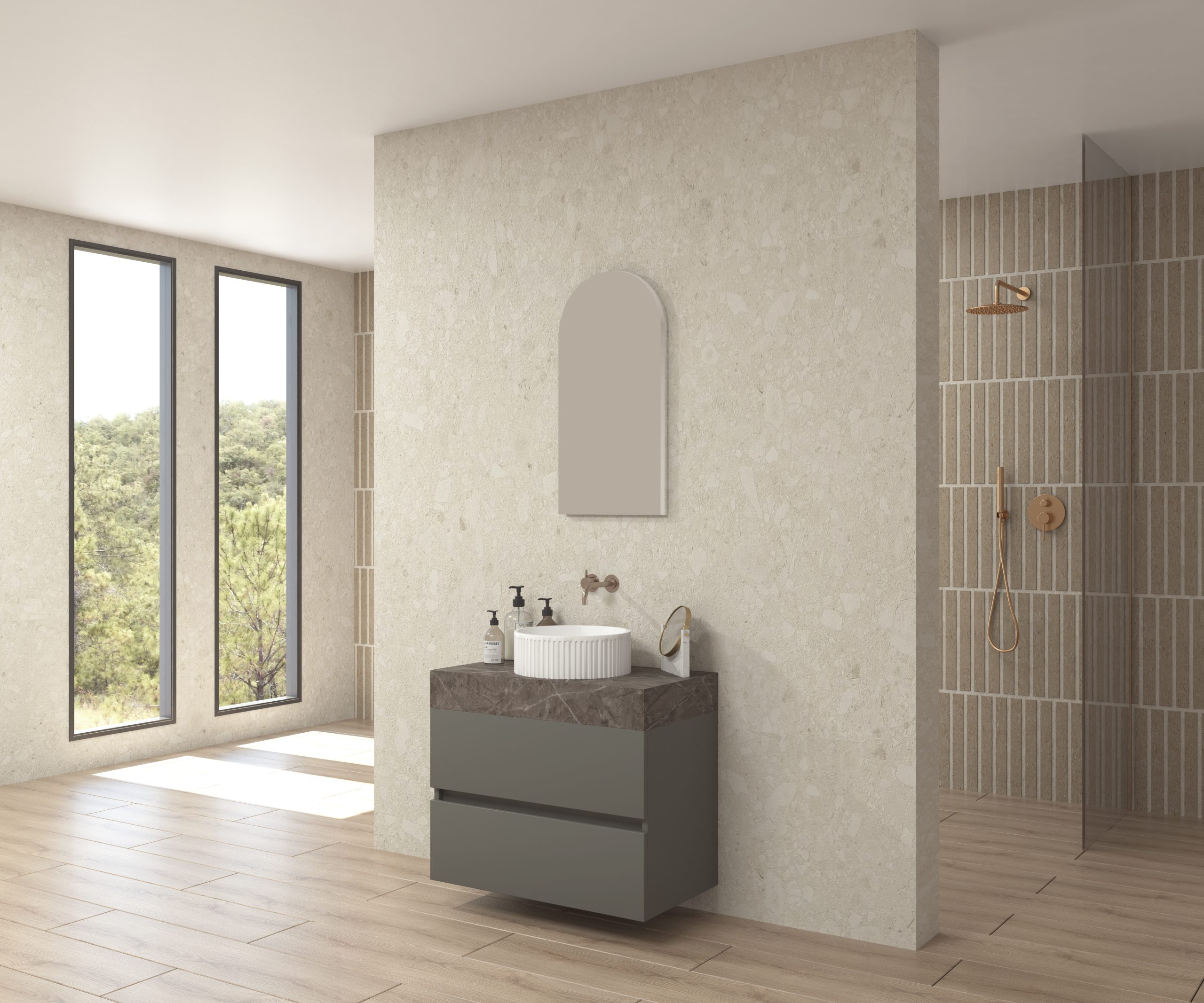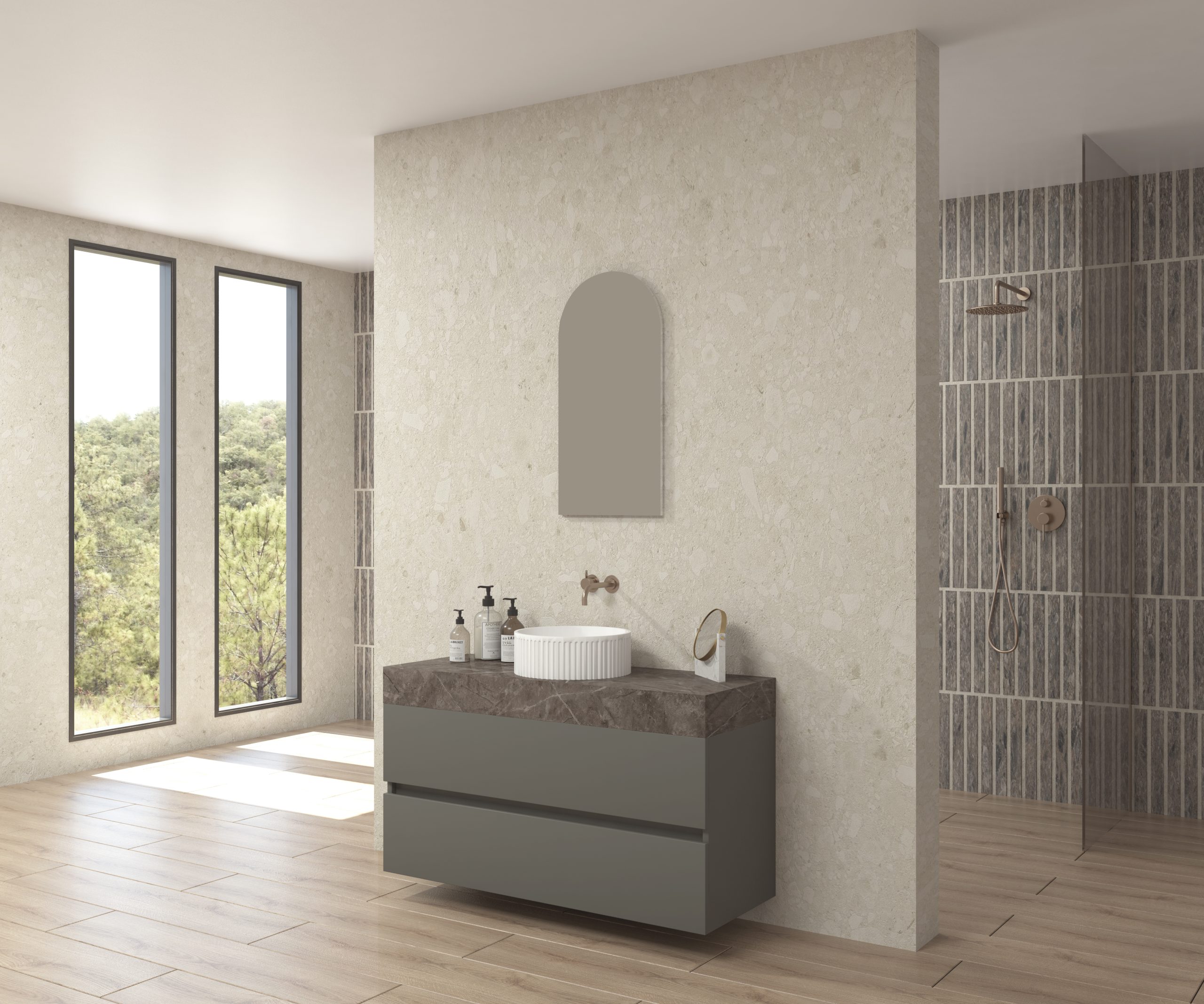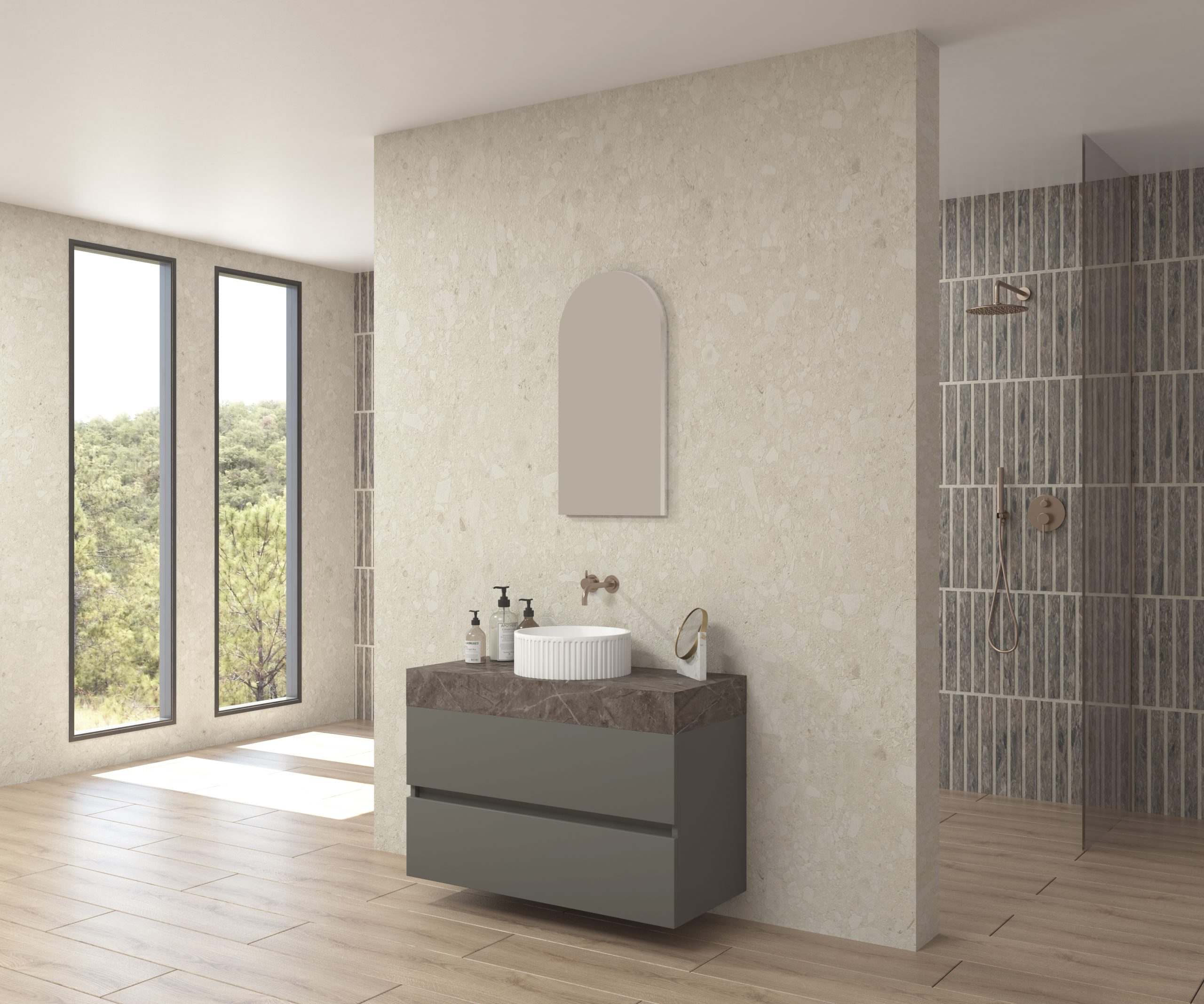 Pack composé d’un plan de travail en Dekton de Cosentino, d’un meuble suspendu, d’une vasque design strié et d’un miroir alma.