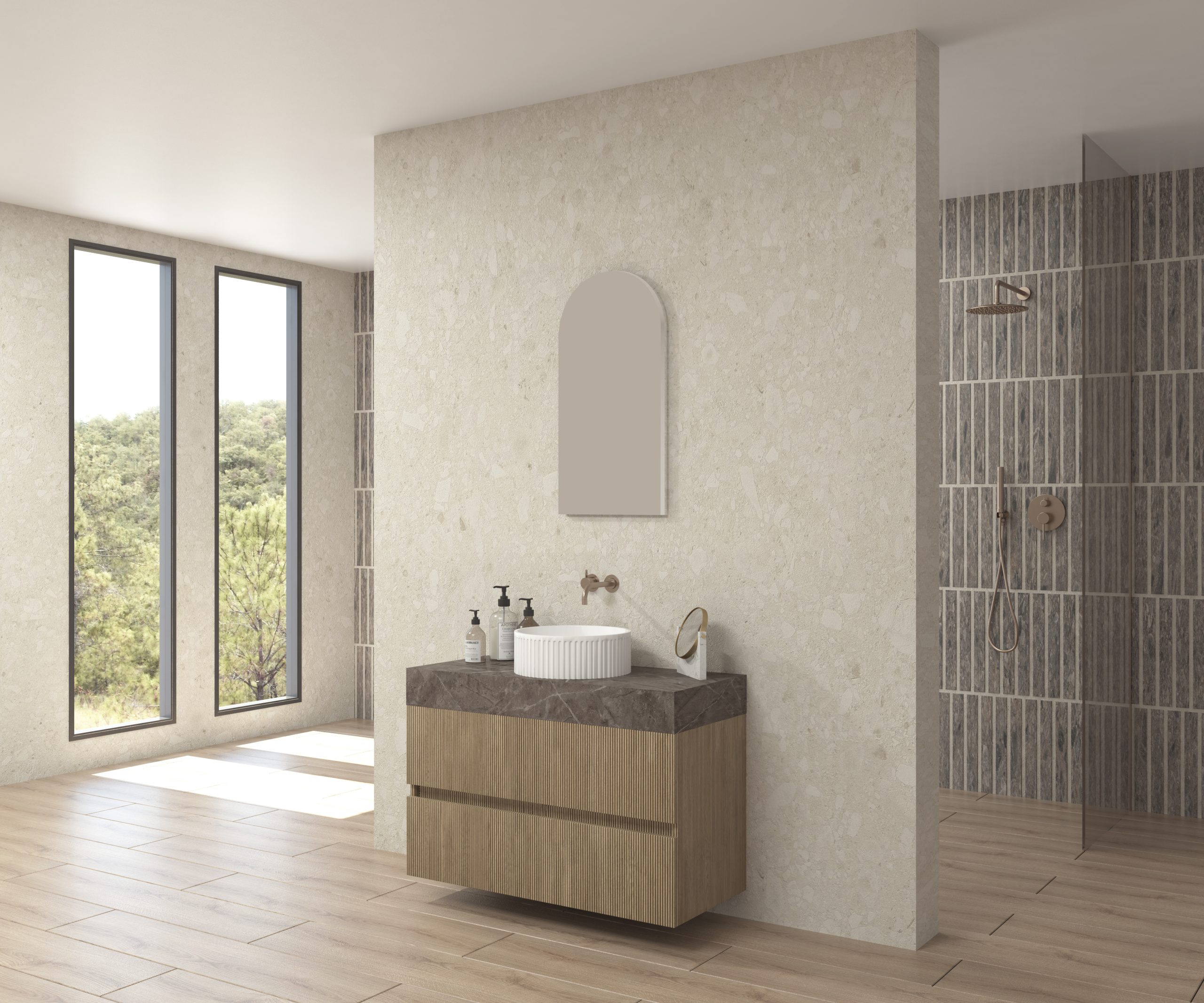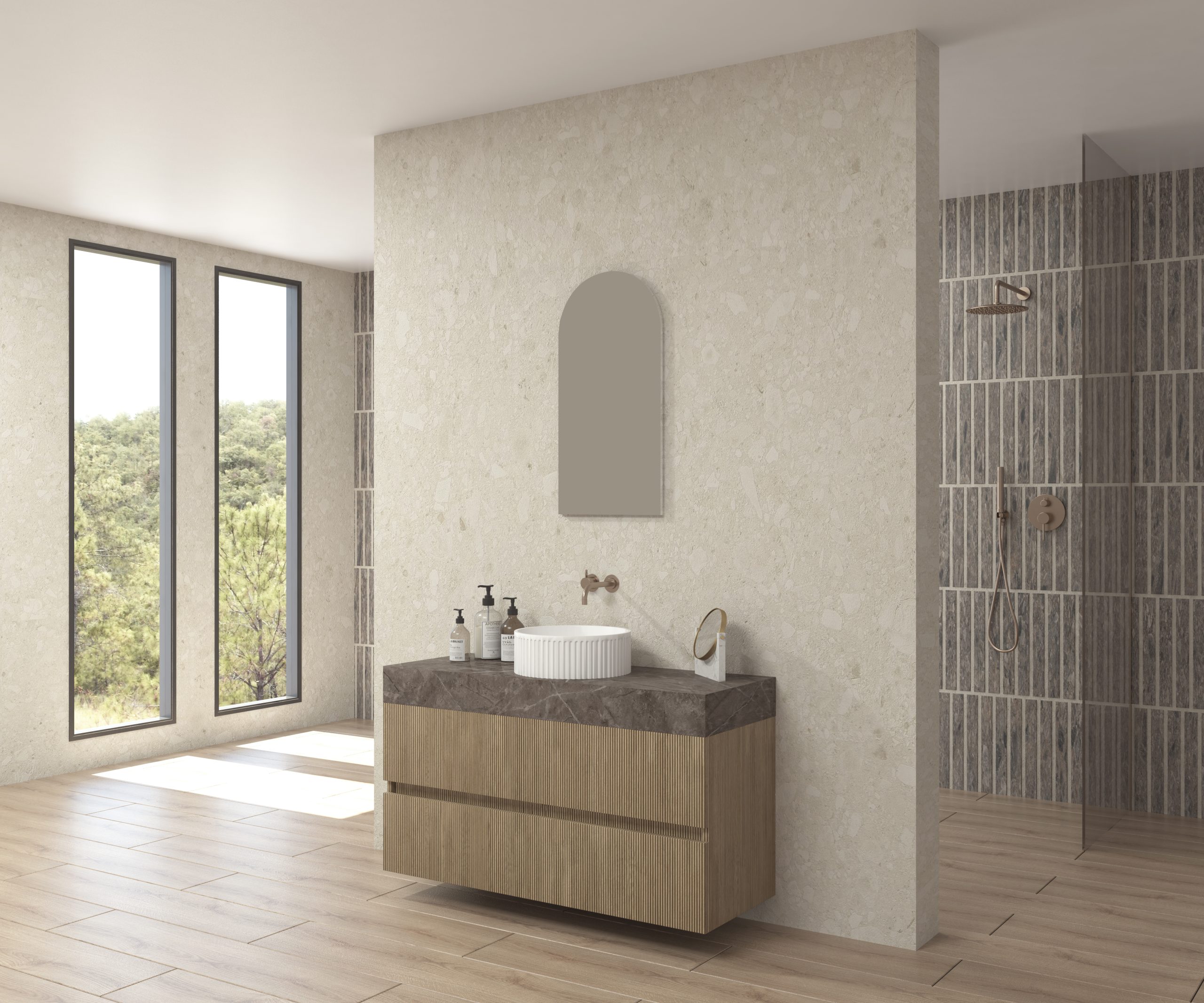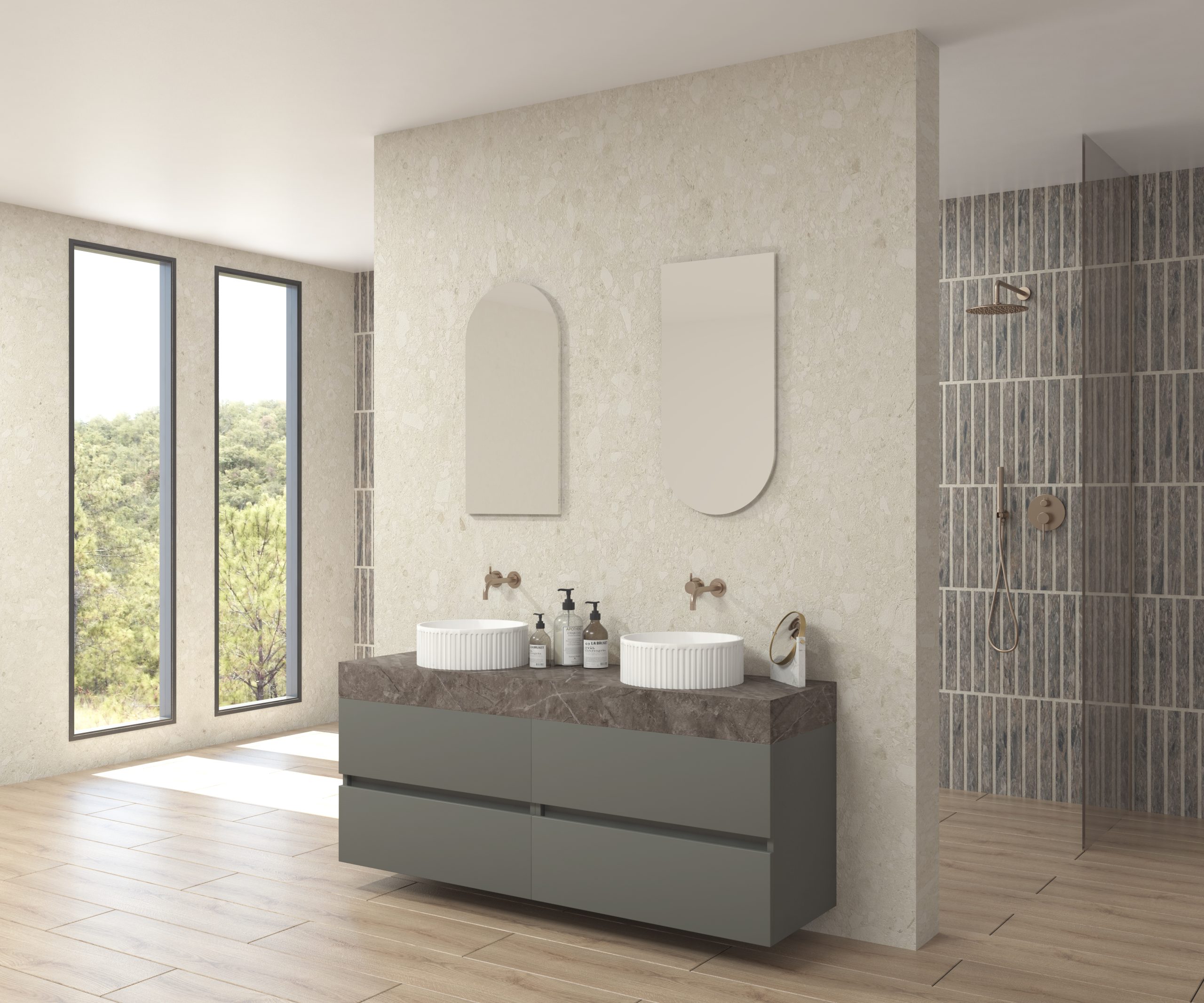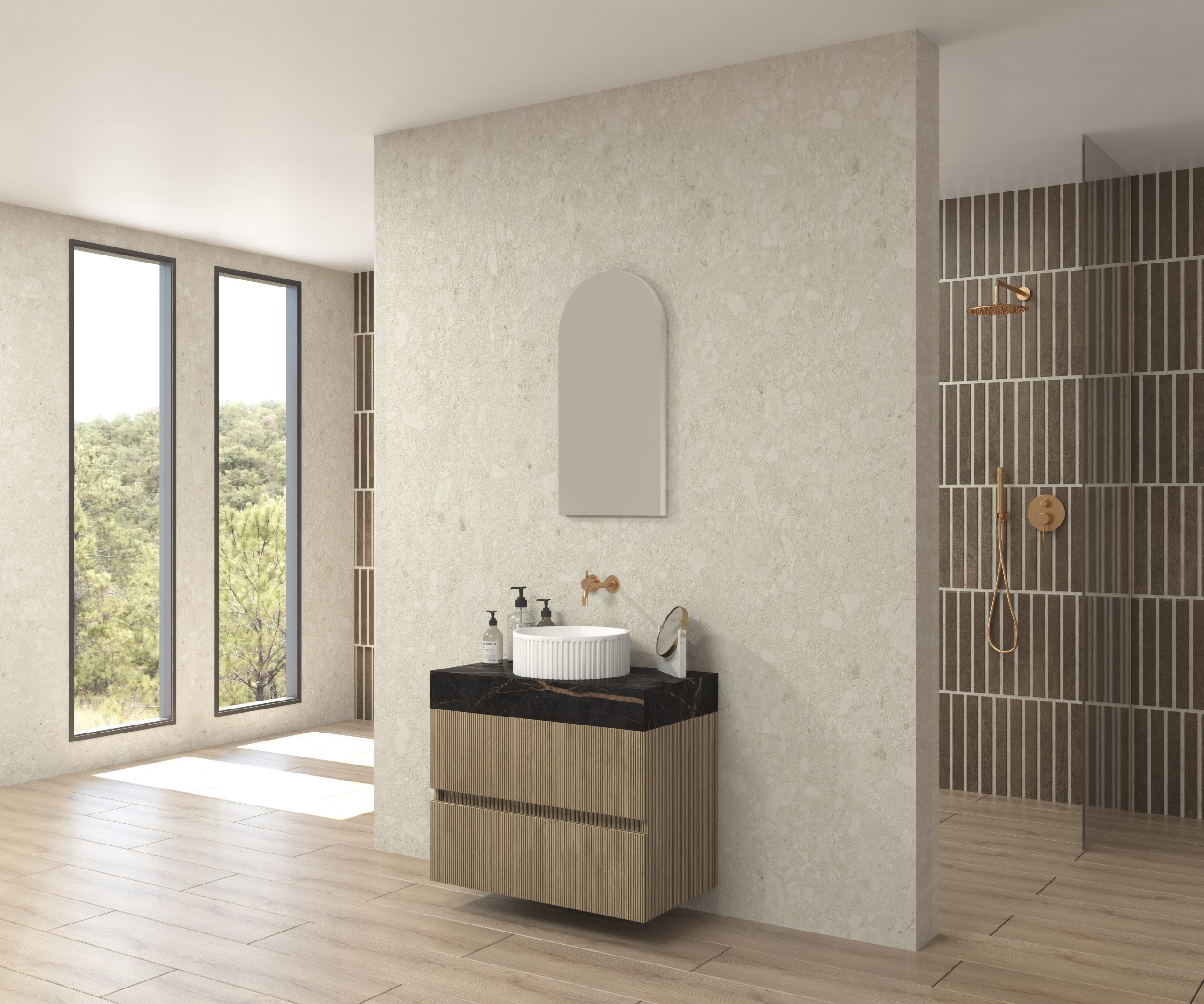 Pack composé d’un plan de travail en Dekton de Cosentino, d’un meuble suspendu, d’une vasque design strié et d’un miroir alma.
