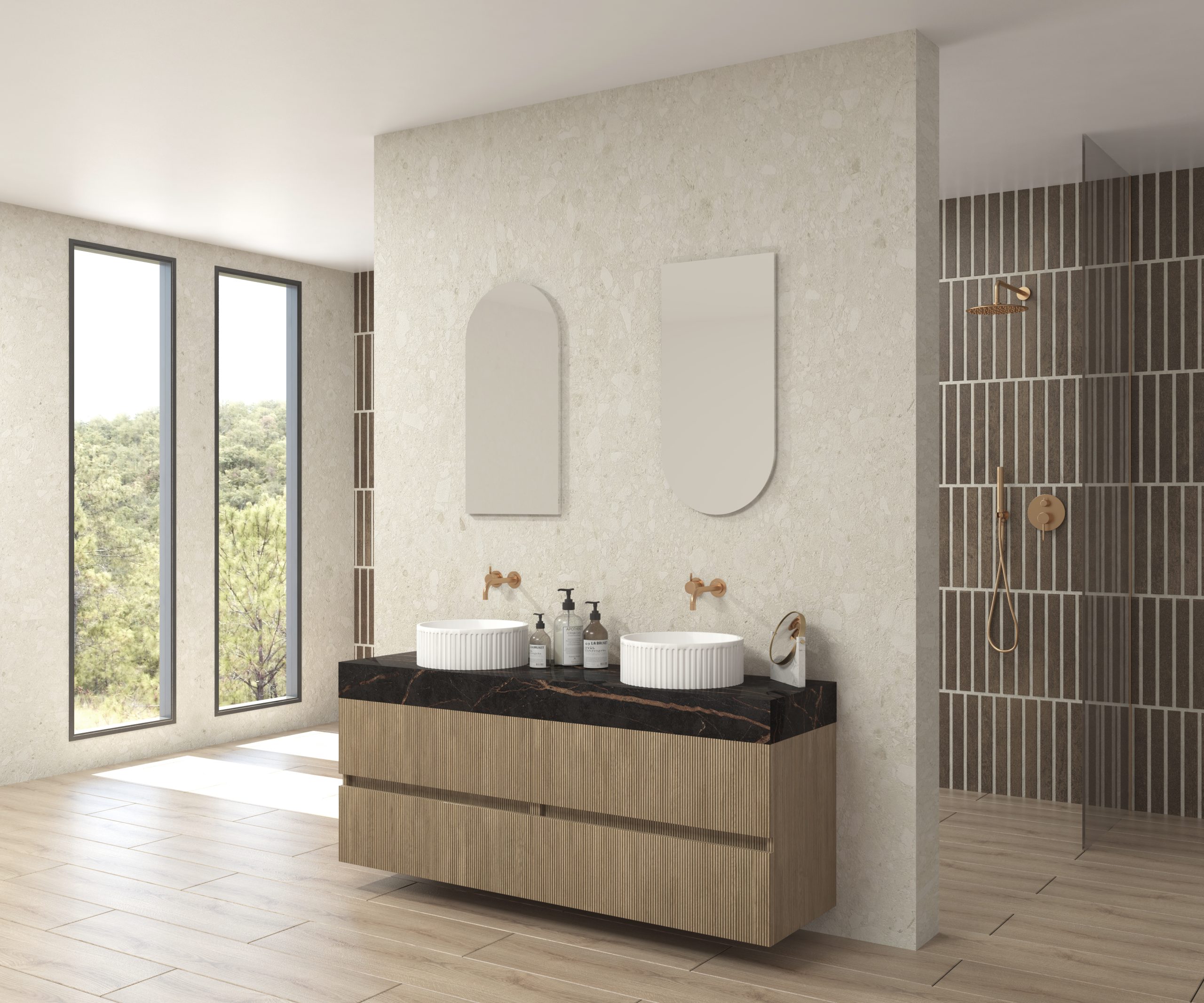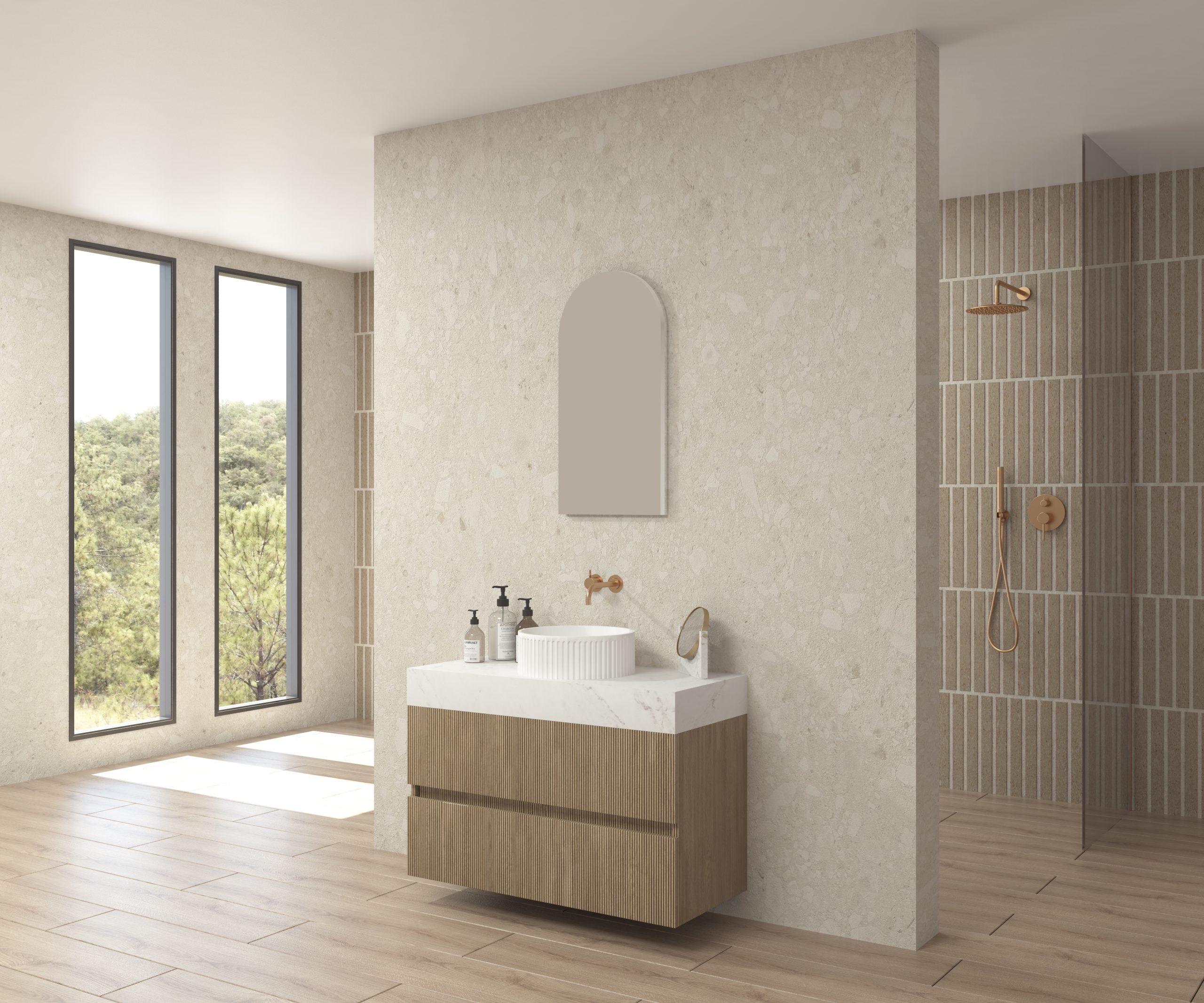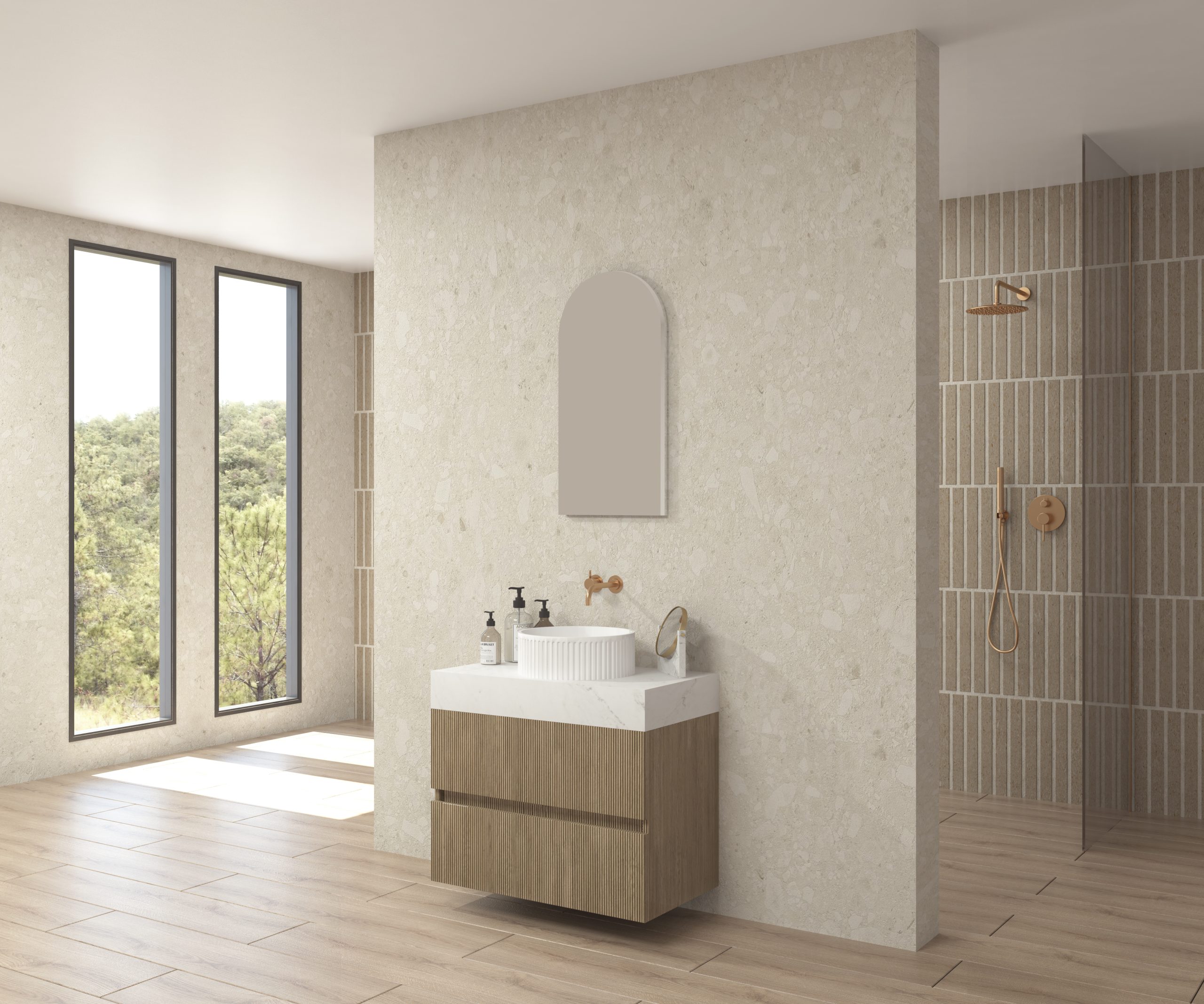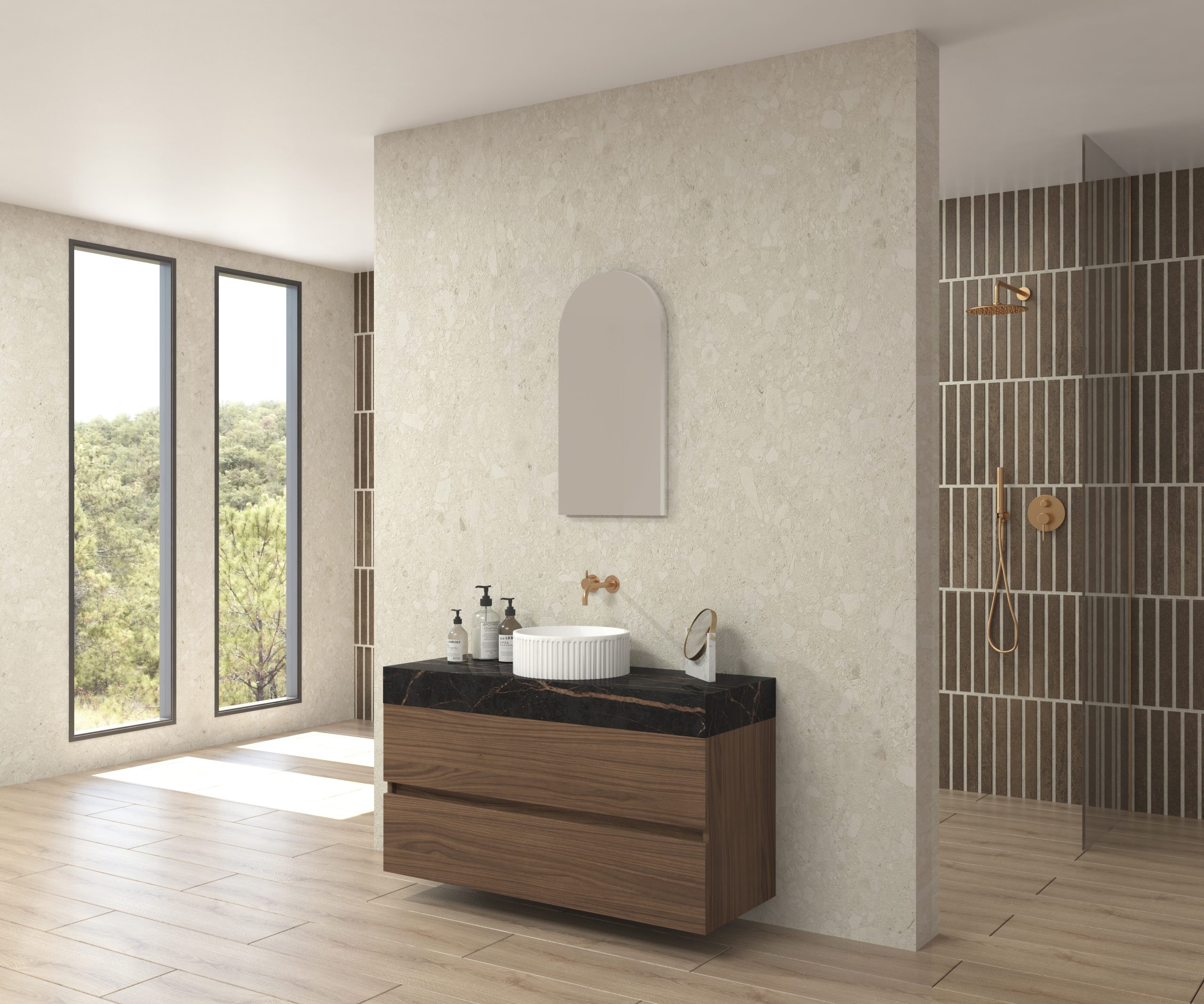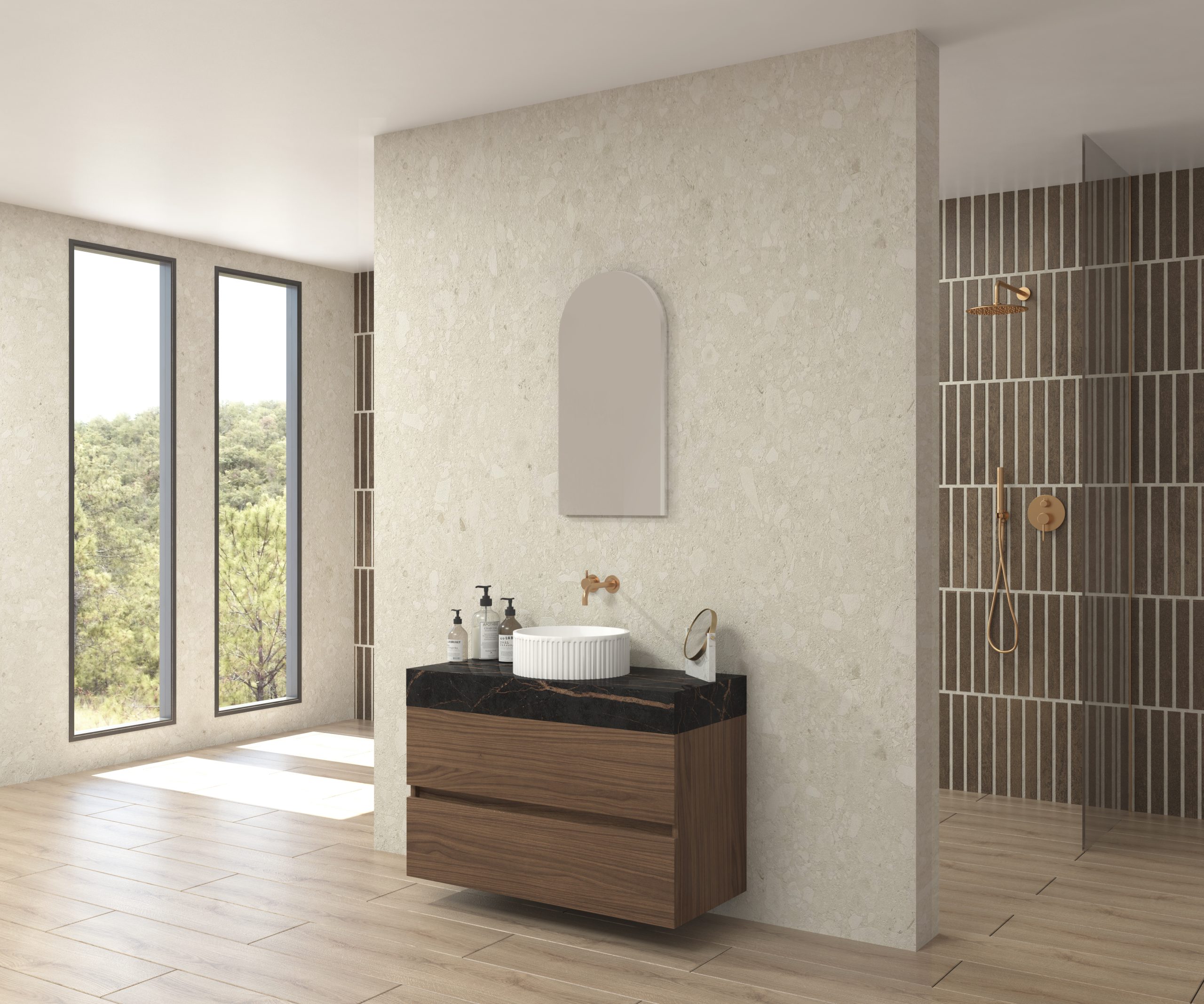 Pack composé d’un plan de travail en Dekton de Cosentino, d’un meuble suspendu, d’une vasque design strié et d’un miroir alma.