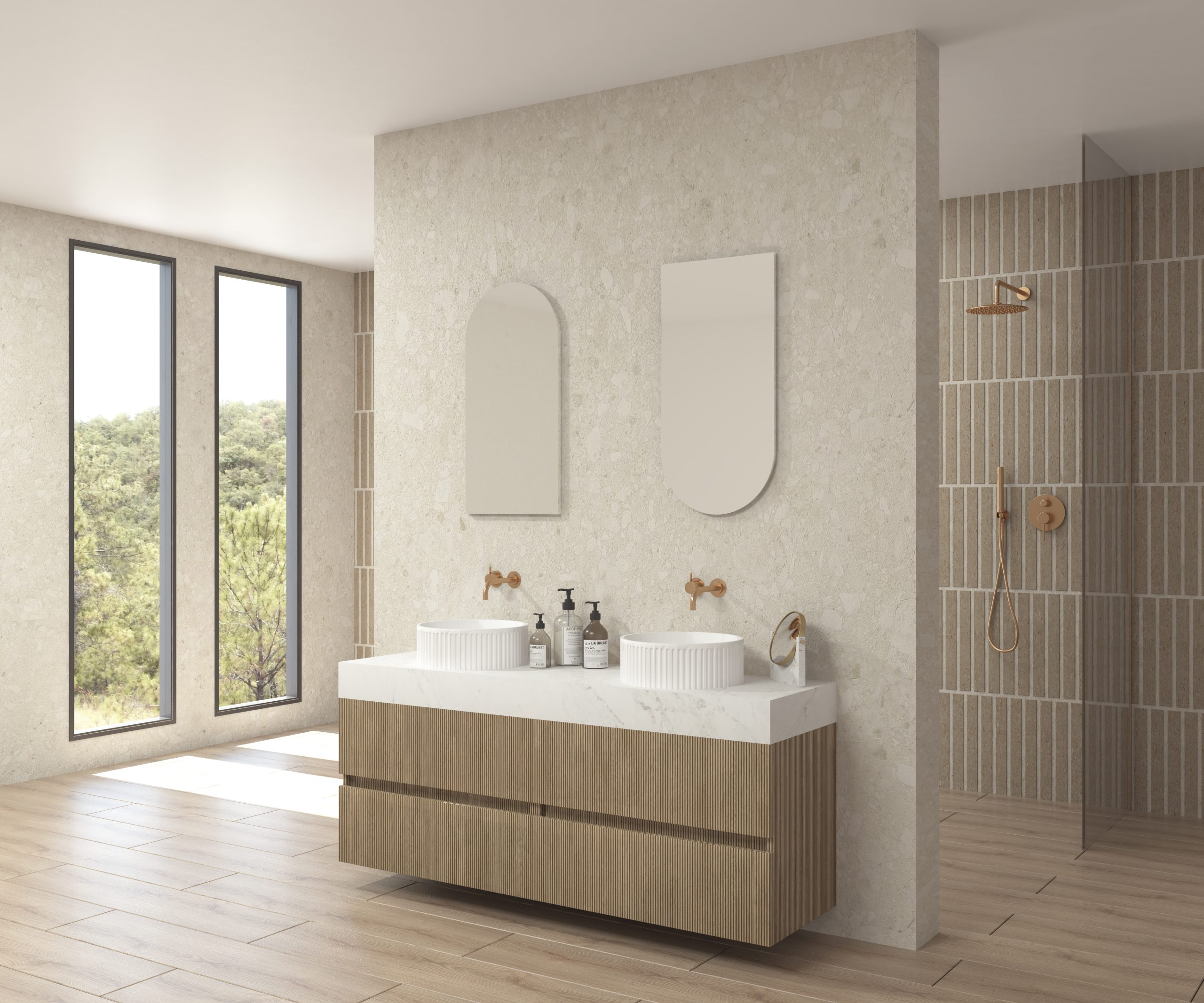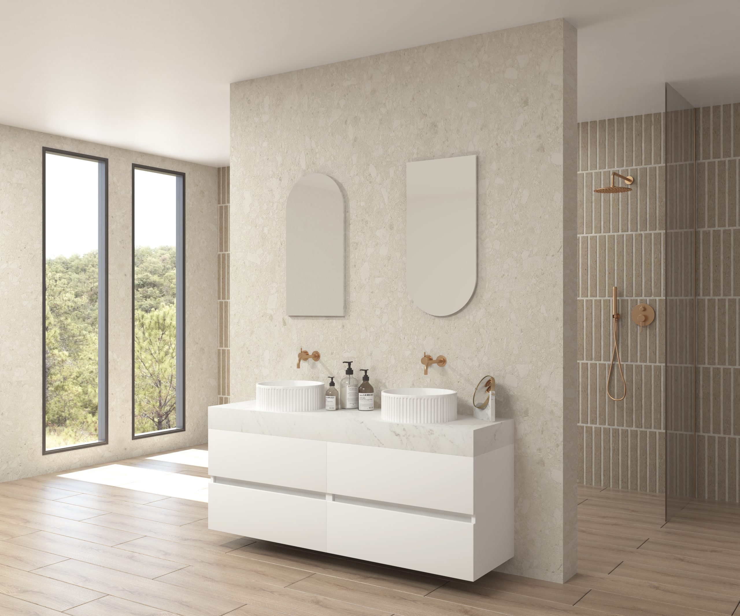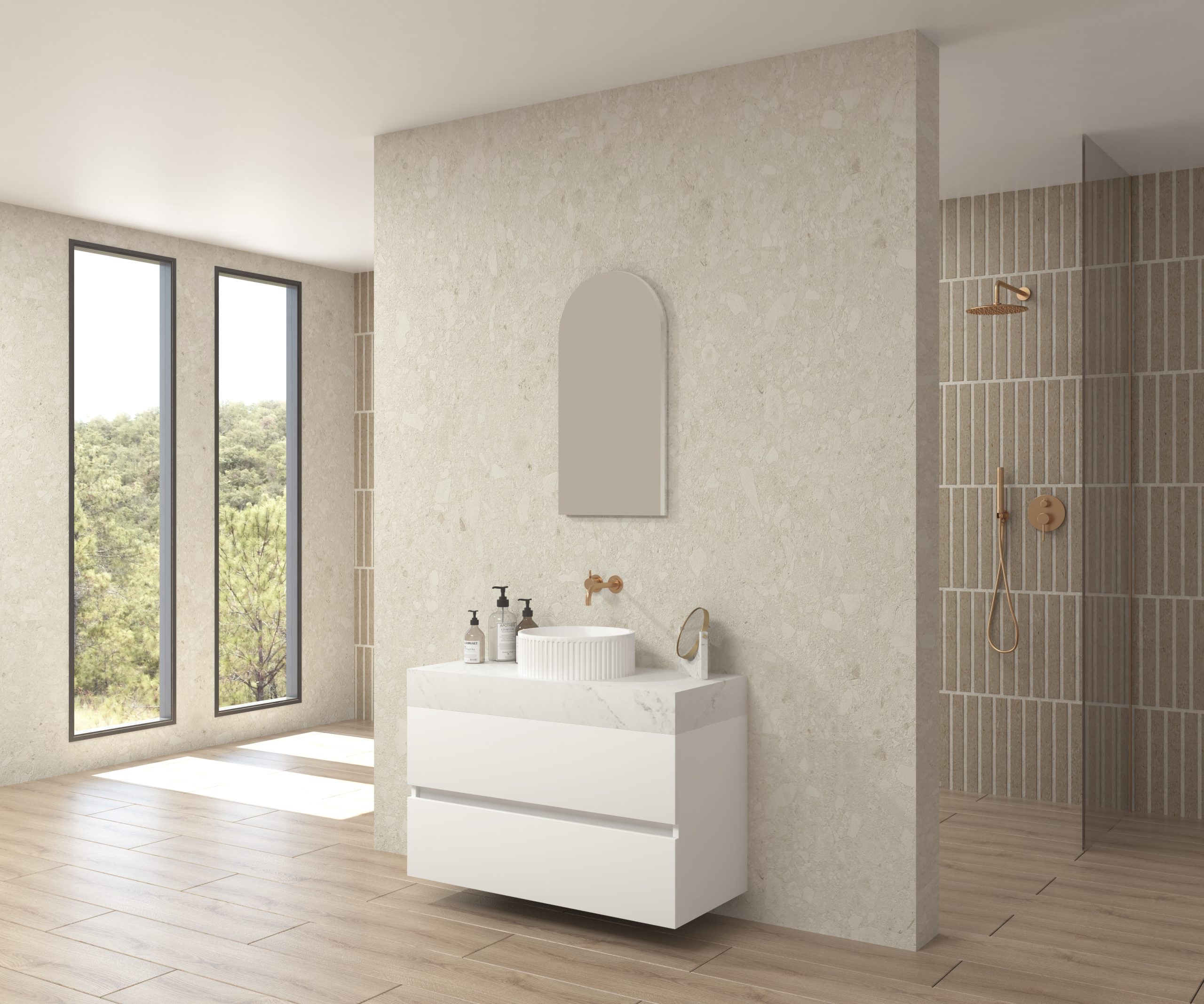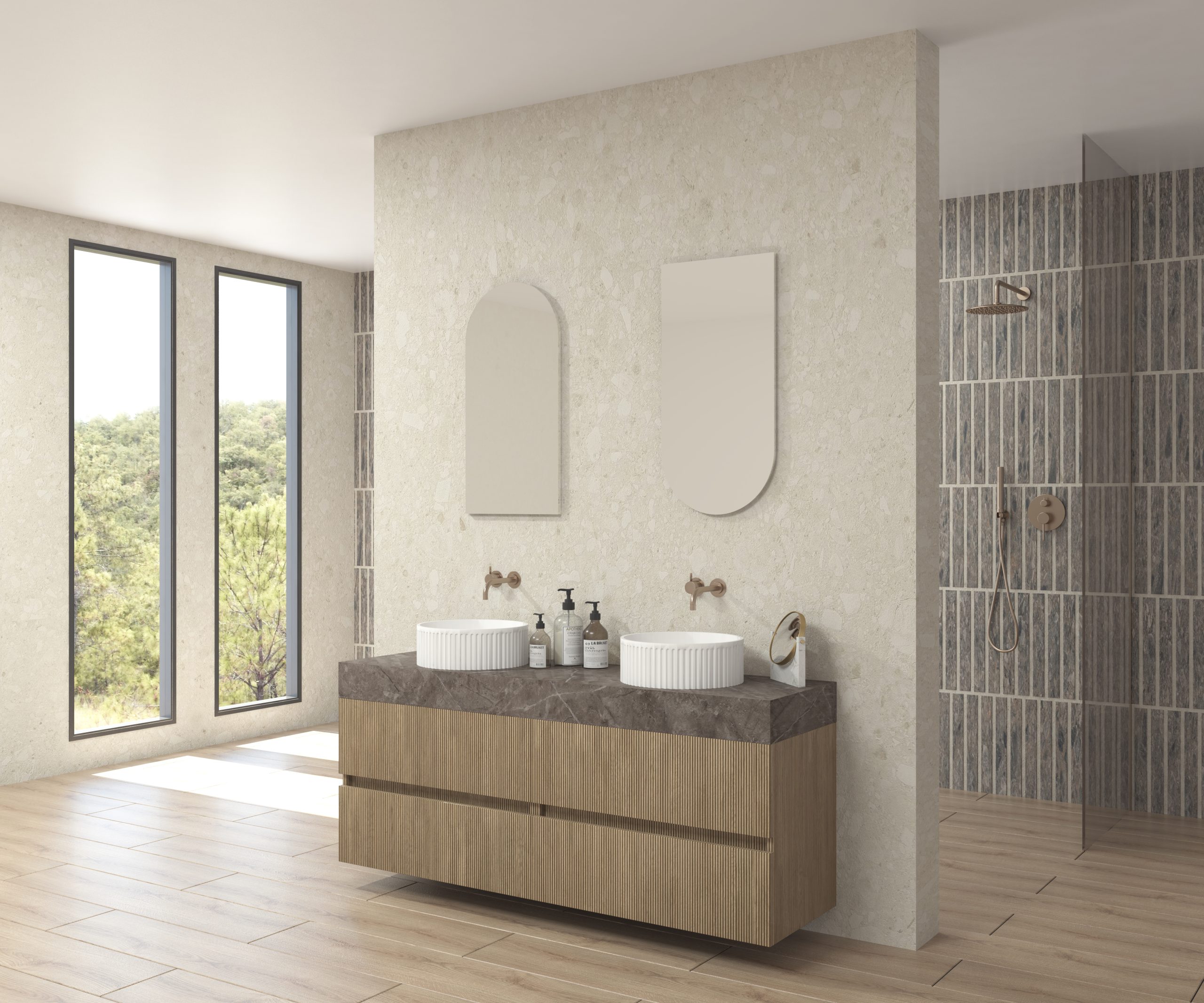 Pack composé d’un plan de travail en Dekton de Cosentino, d’un meuble suspendu, d’une vasque design strié et d’un miroir alma.