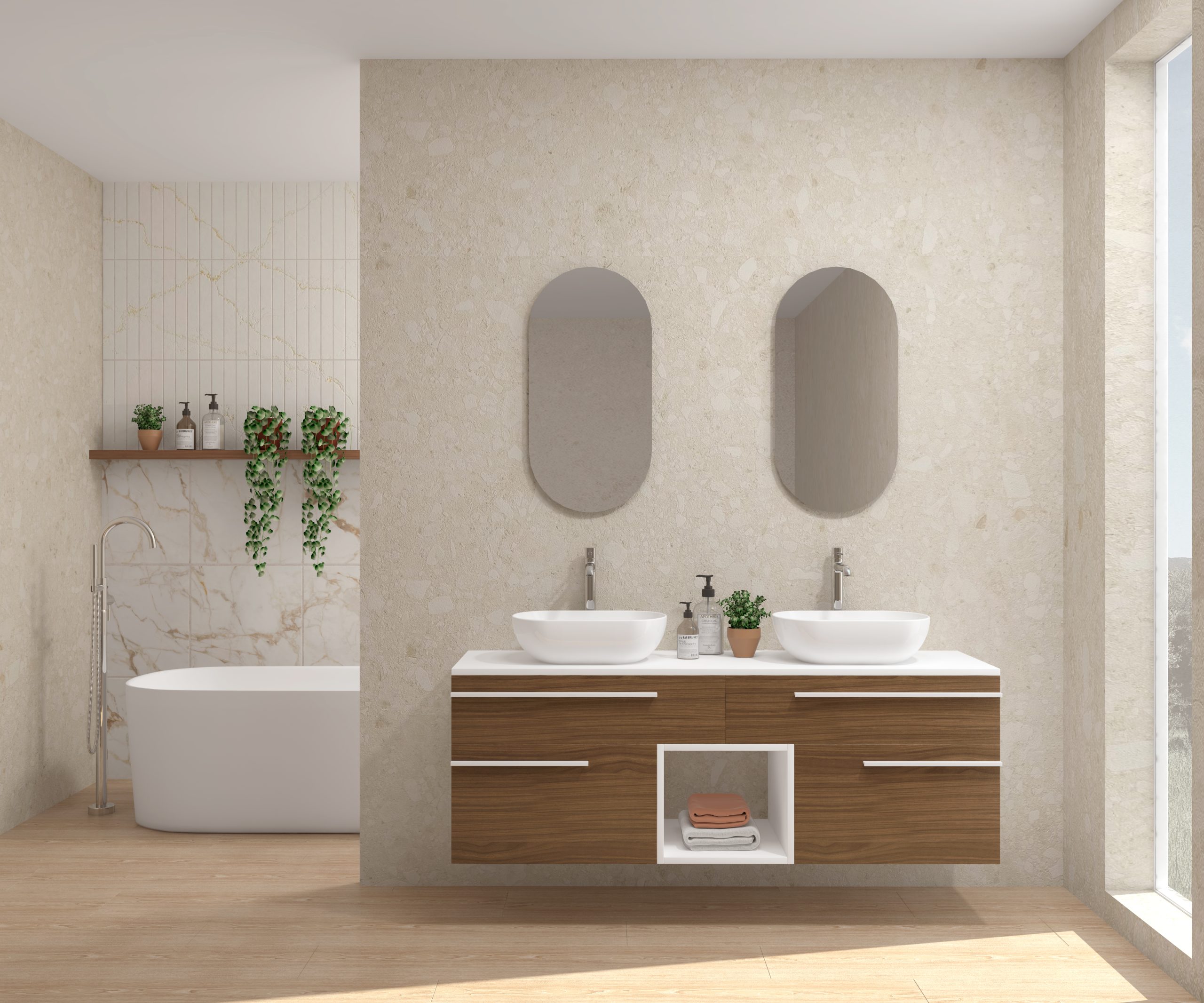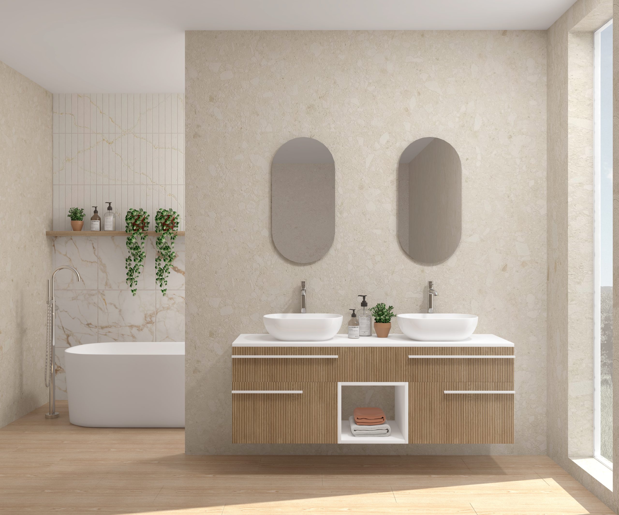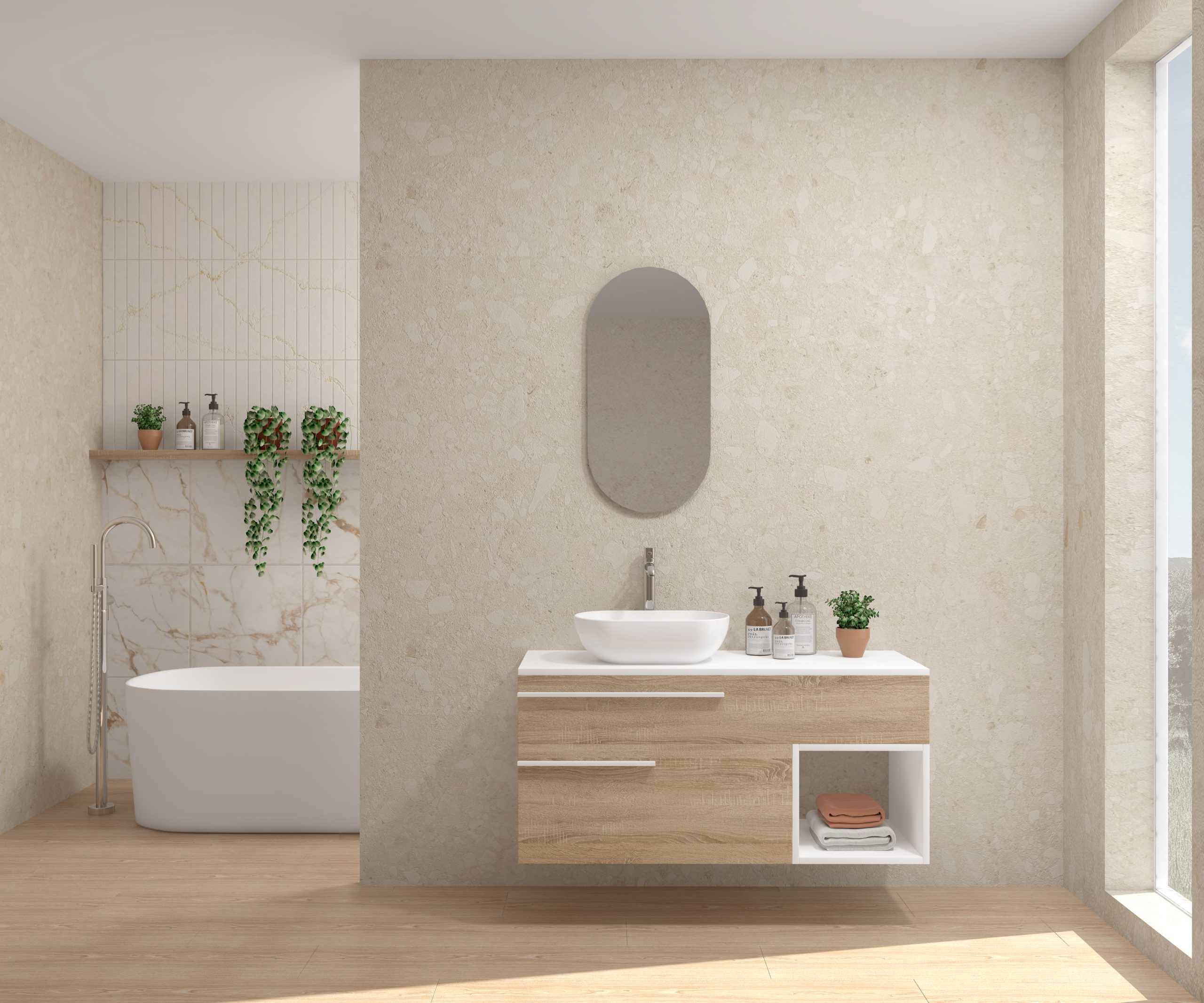 Ensemble composé d’un meuble sous-vasque suspendu, d’une vasque et d’un miroir design capsule.